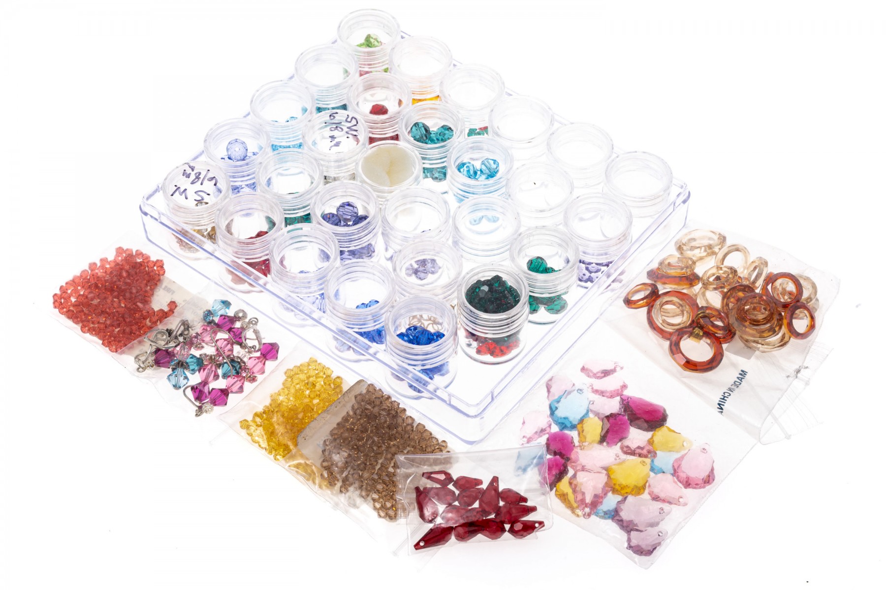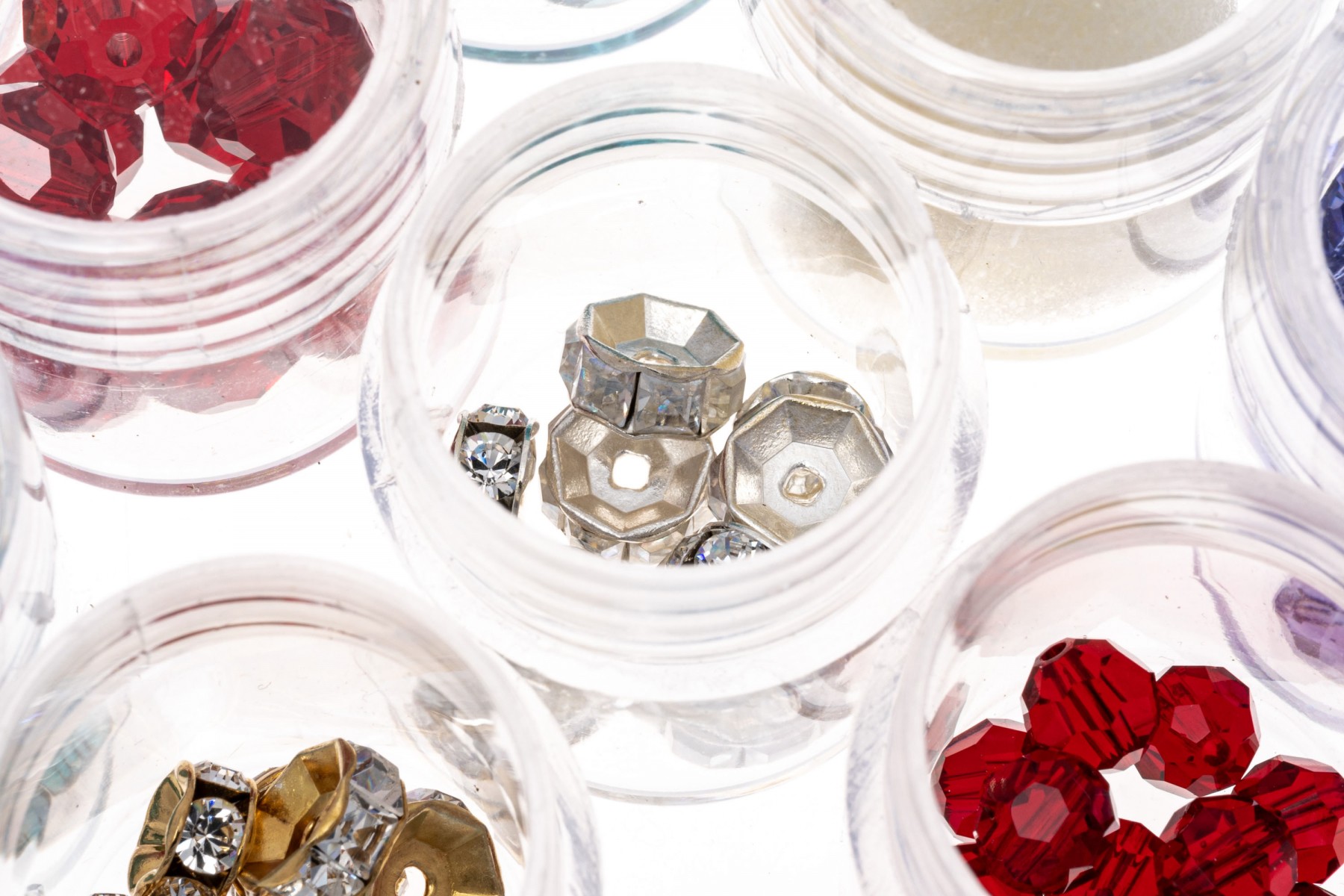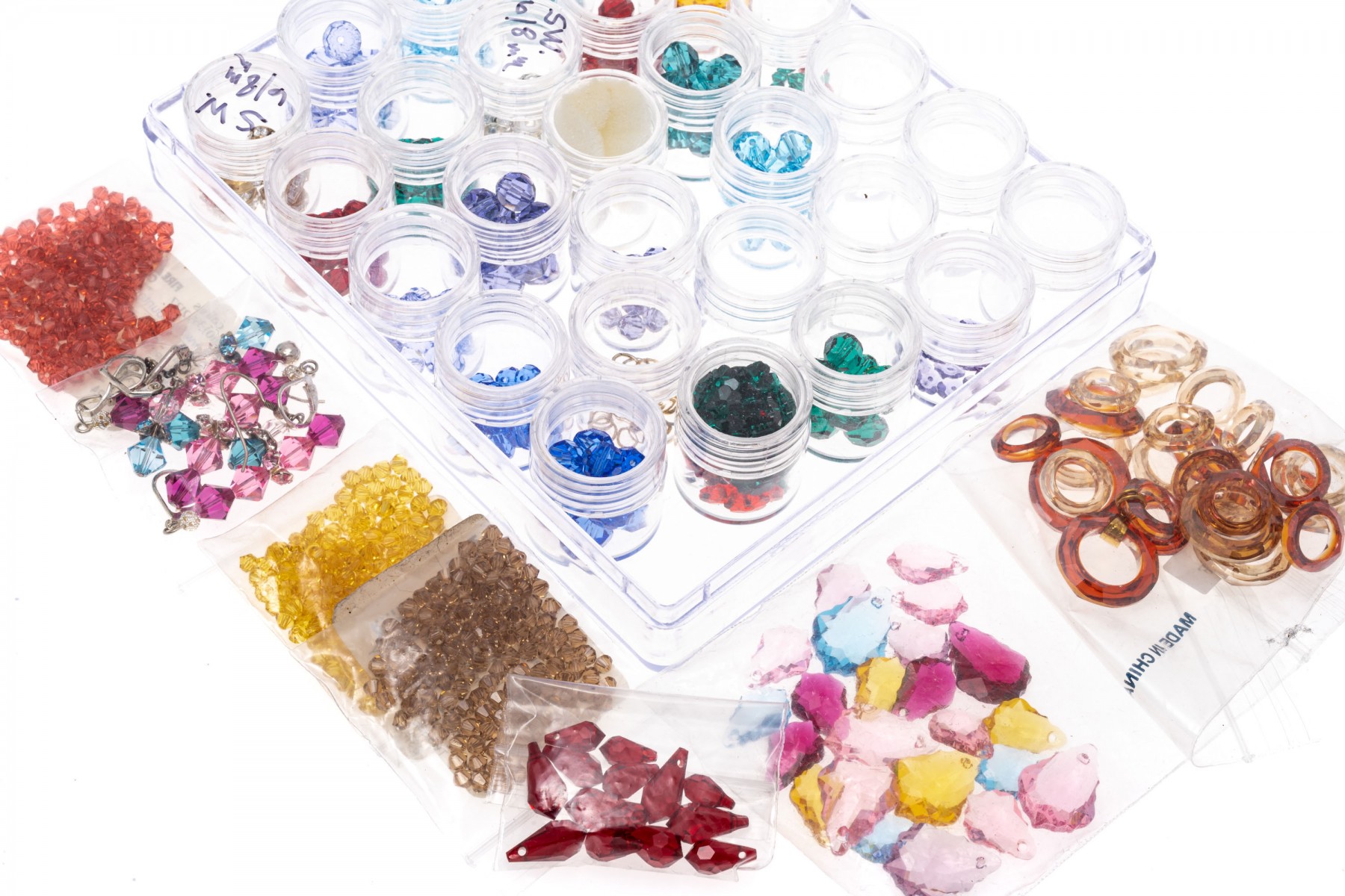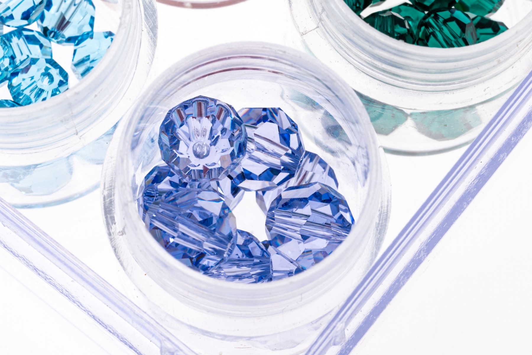Collection of colorful costume beads. These beads have a faceted design with a variety of shapes.