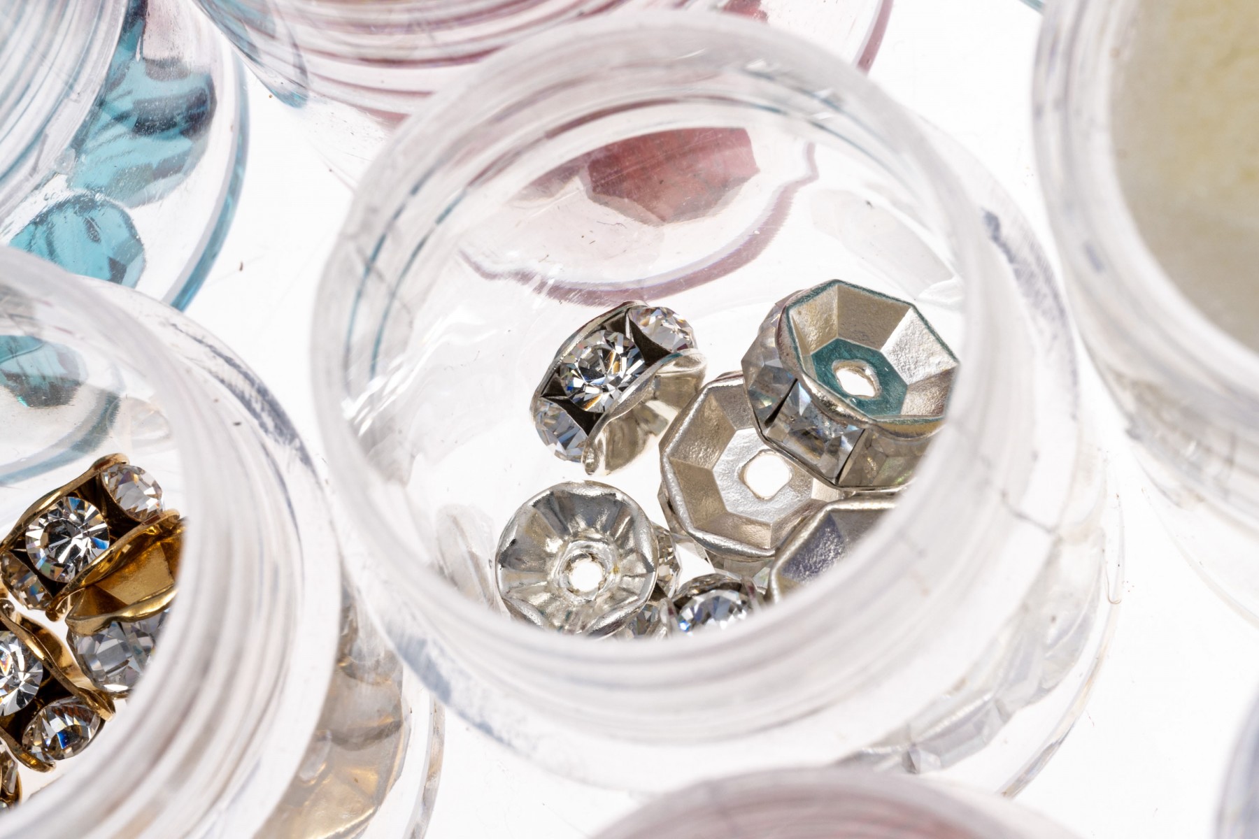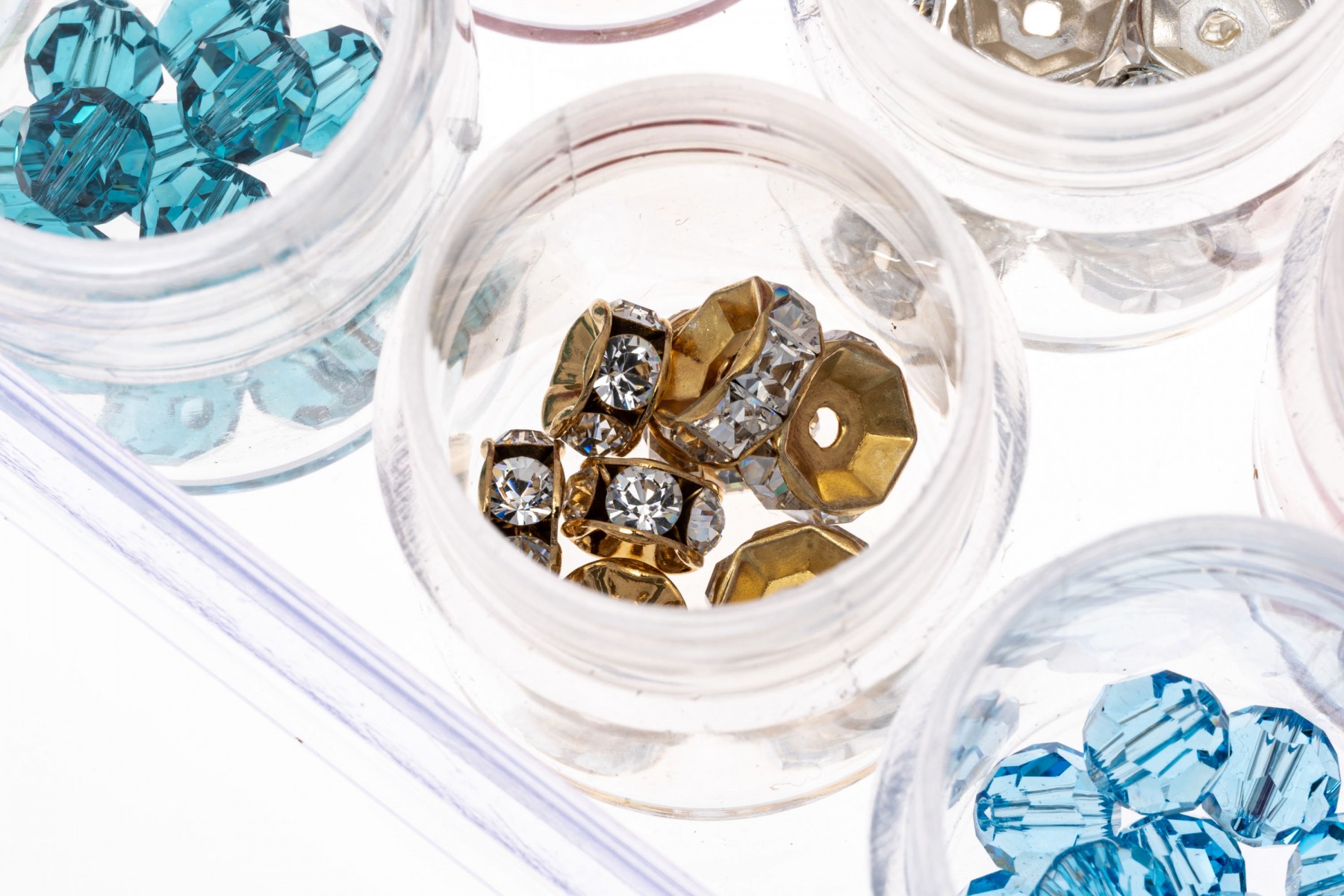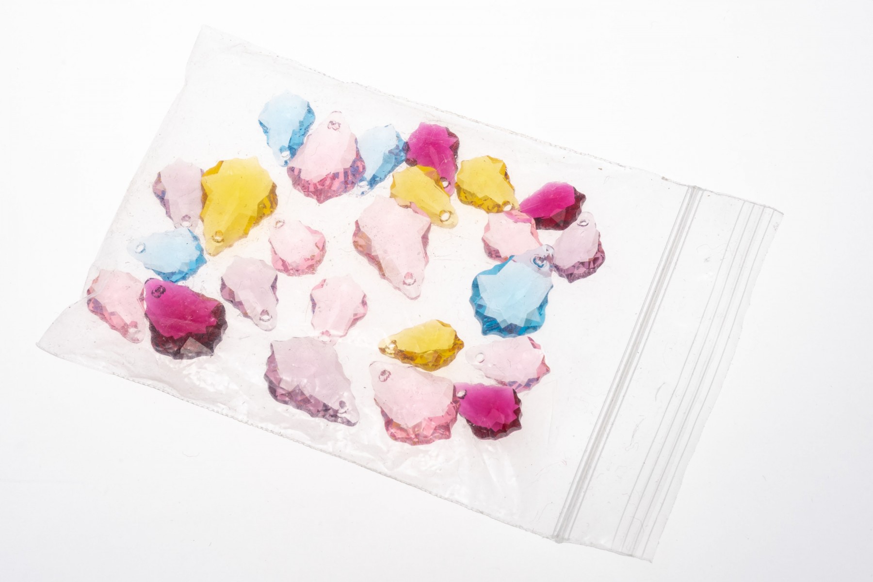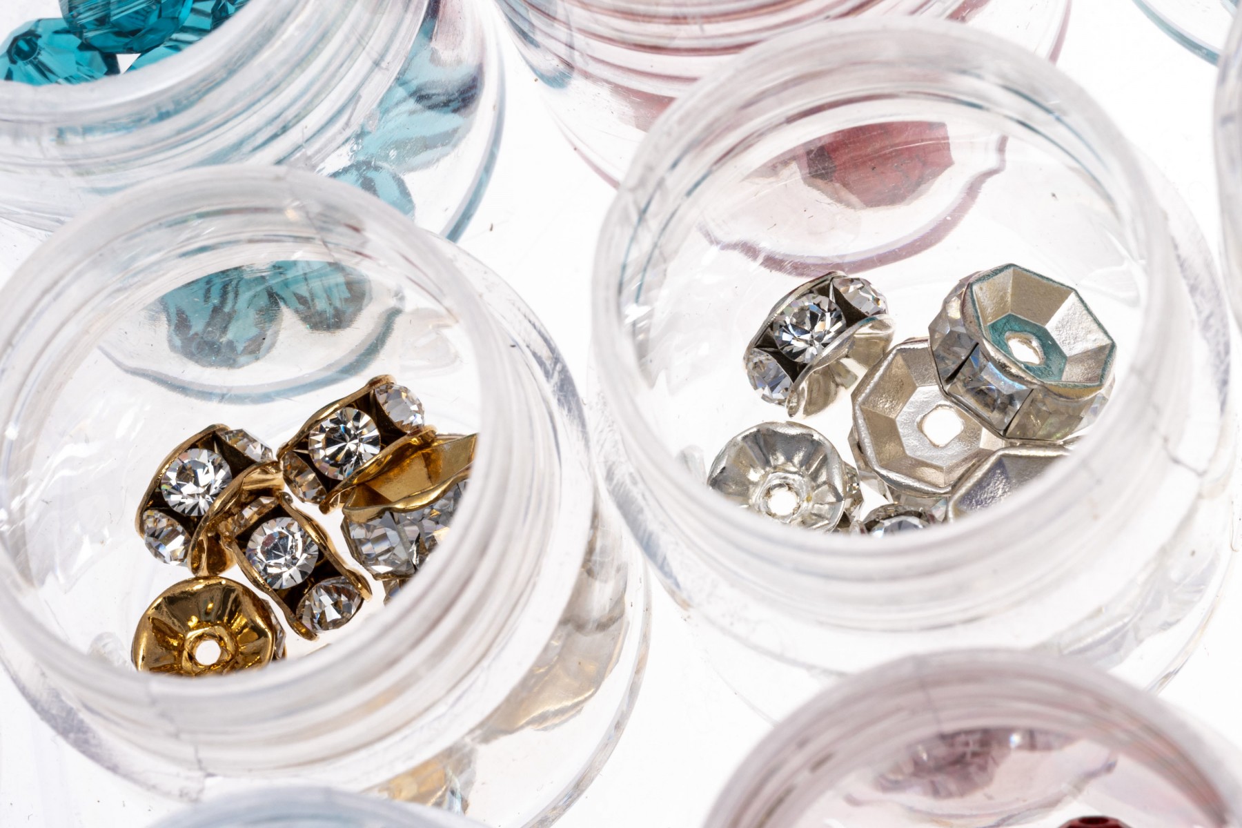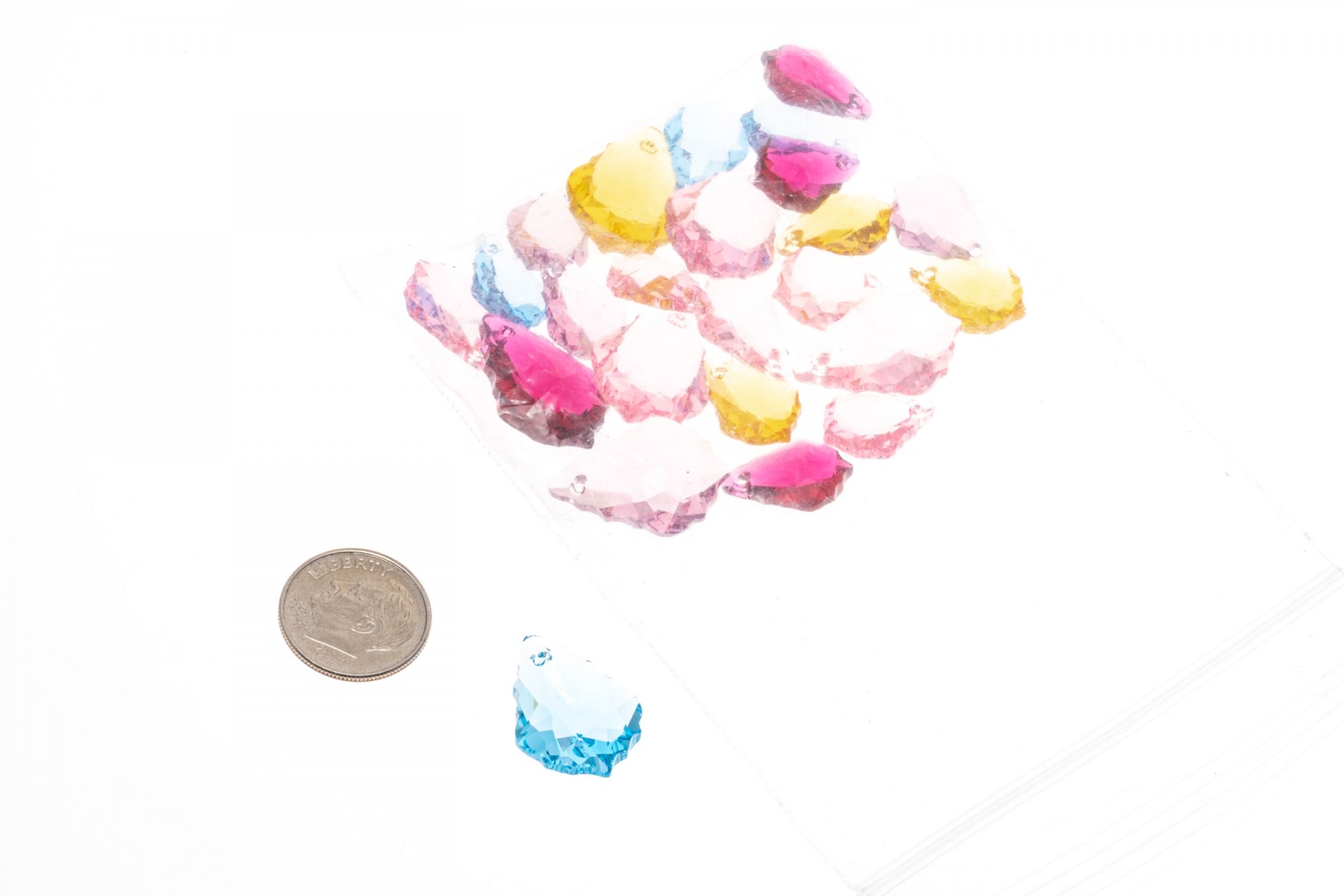 Collection of colorful costume beads. These beads have a faceted design with a variety of shapes.