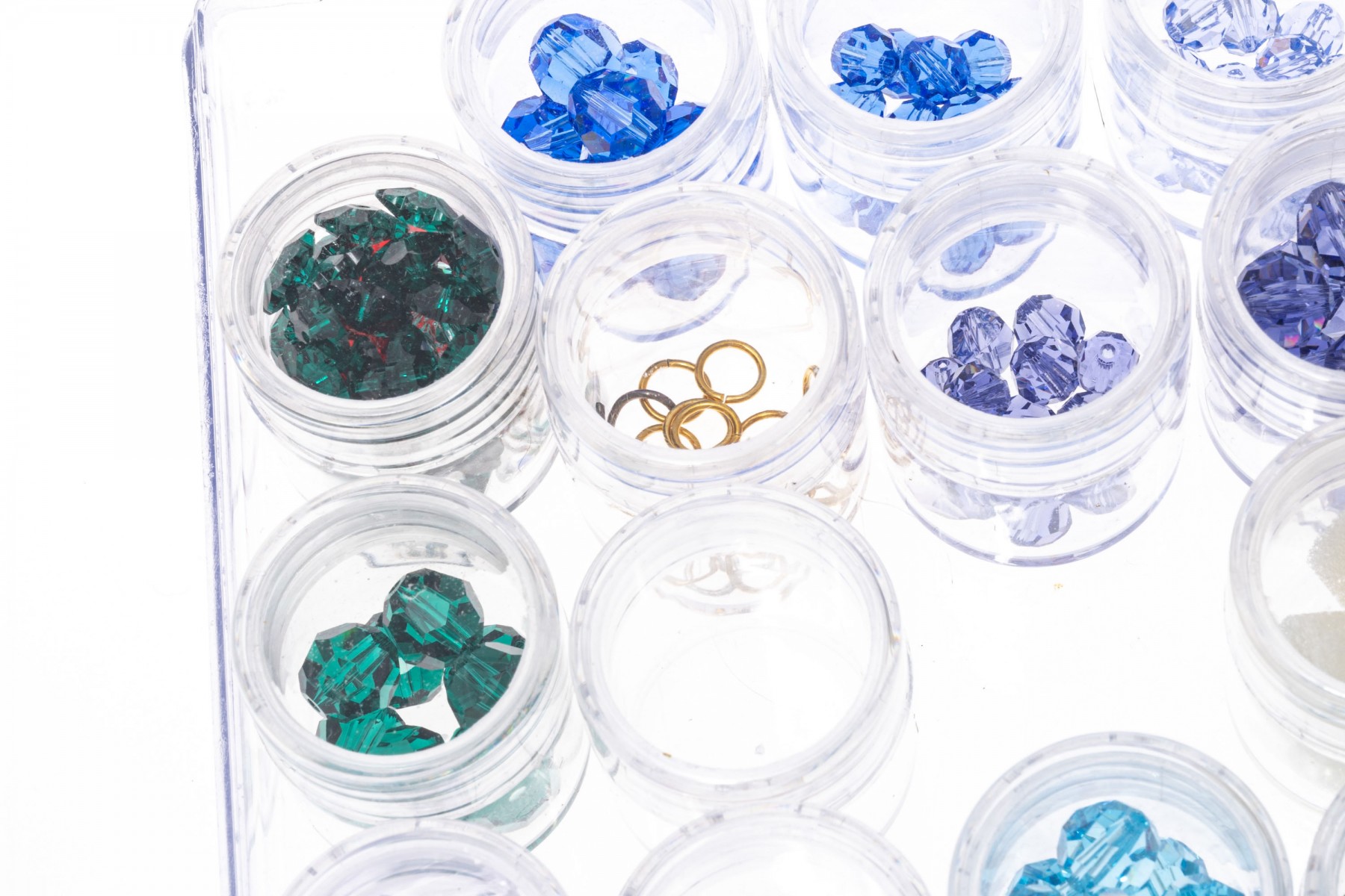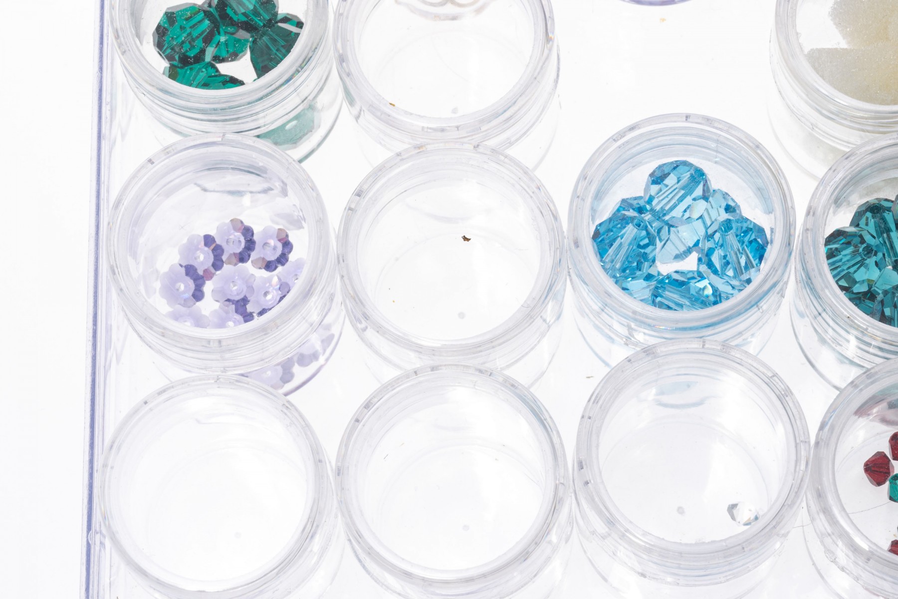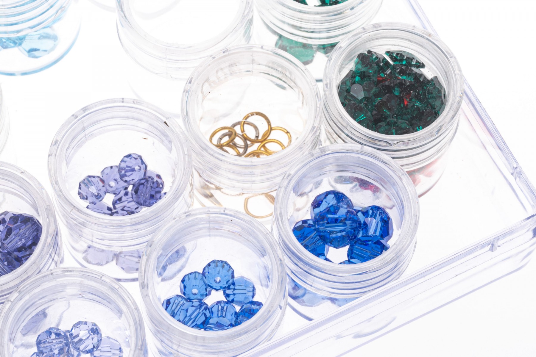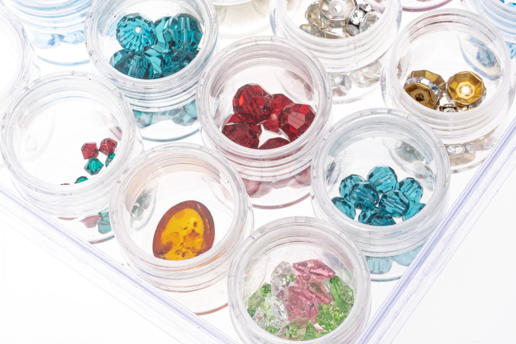 Collection of colorful costume beads. These beads have a faceted design with a variety of shapes.