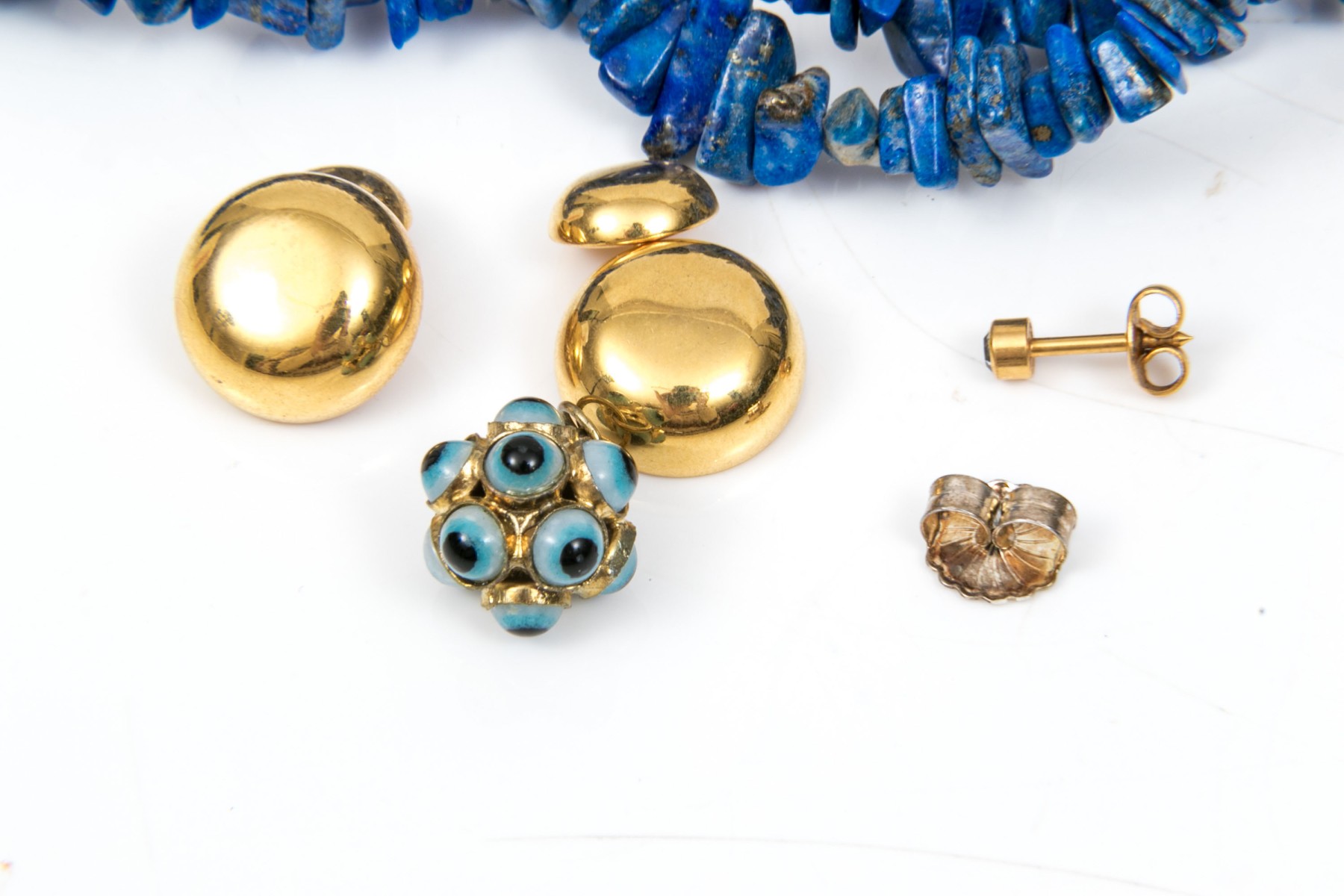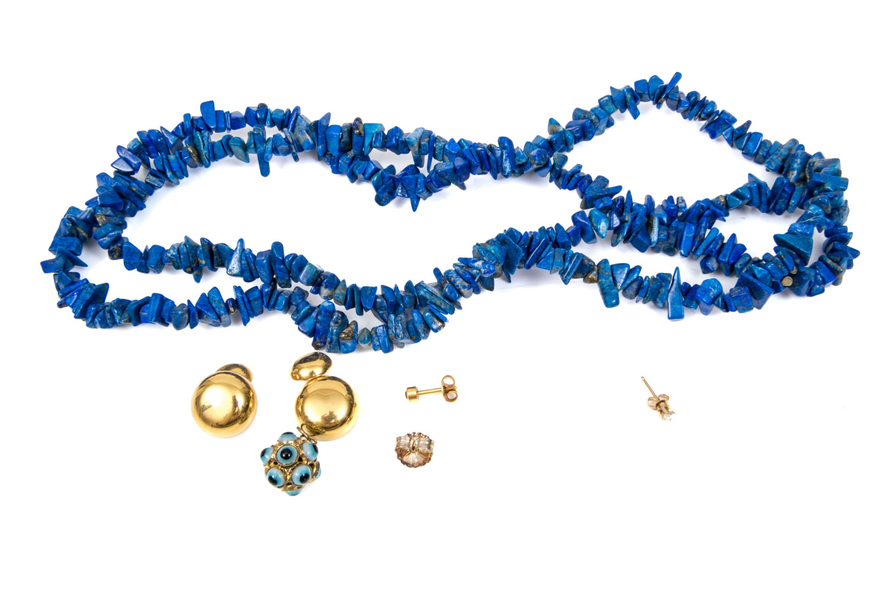 A collection of jewelry. Lapis stone beaded strung necklace. Fashion cuff links and pendant with single earring back. A single 14K yellow gold diamond stud earring with clutch backing, diamond is approximately 0.08 cts.