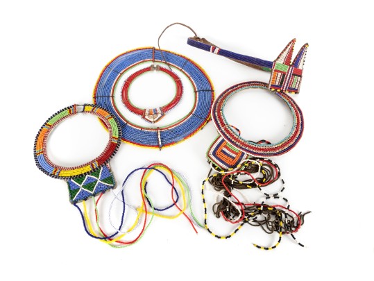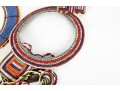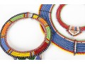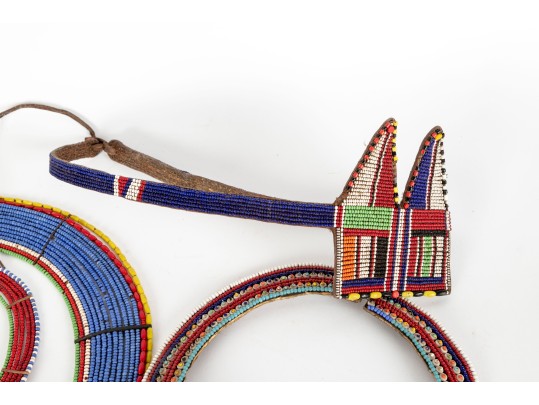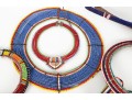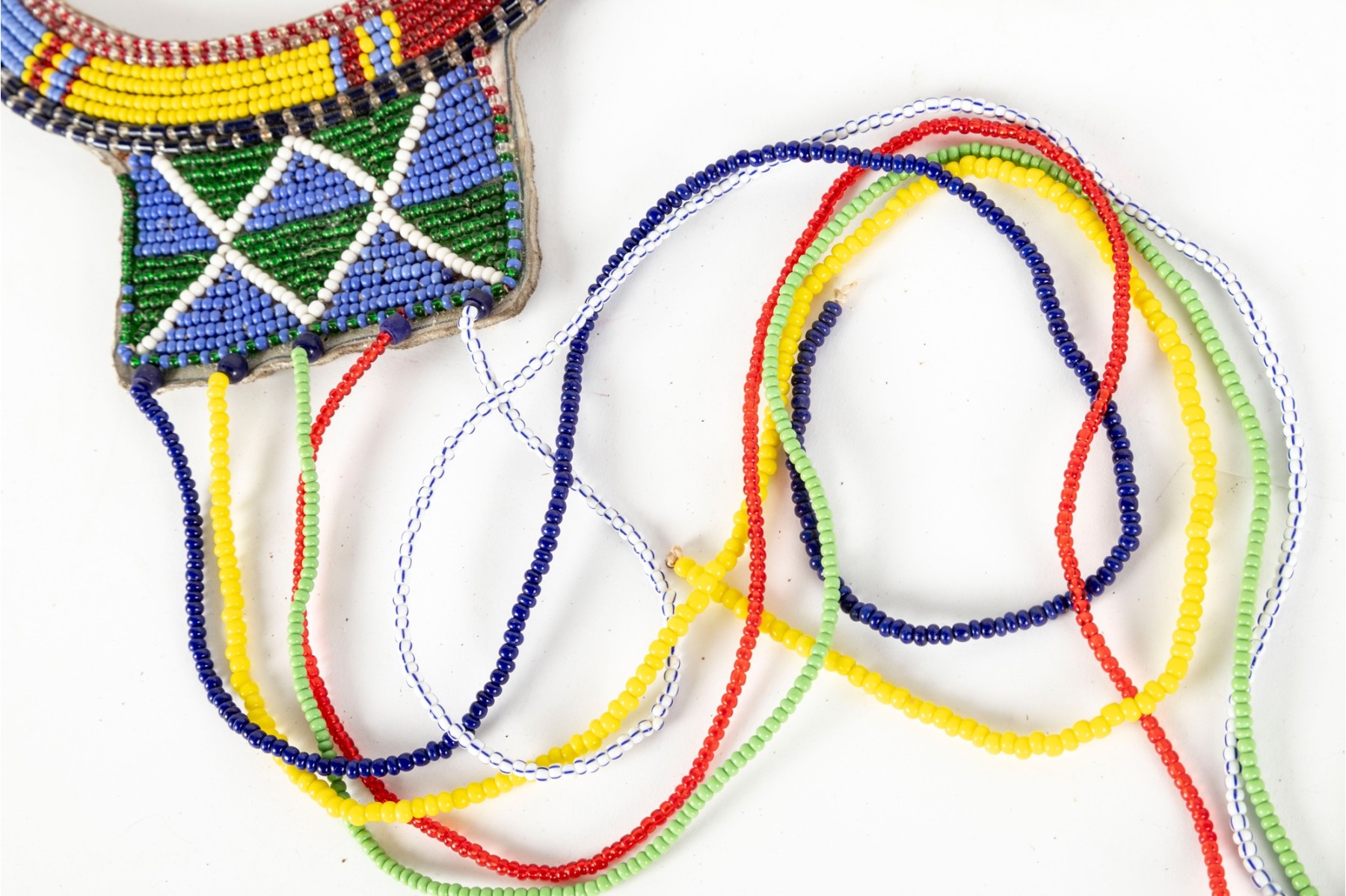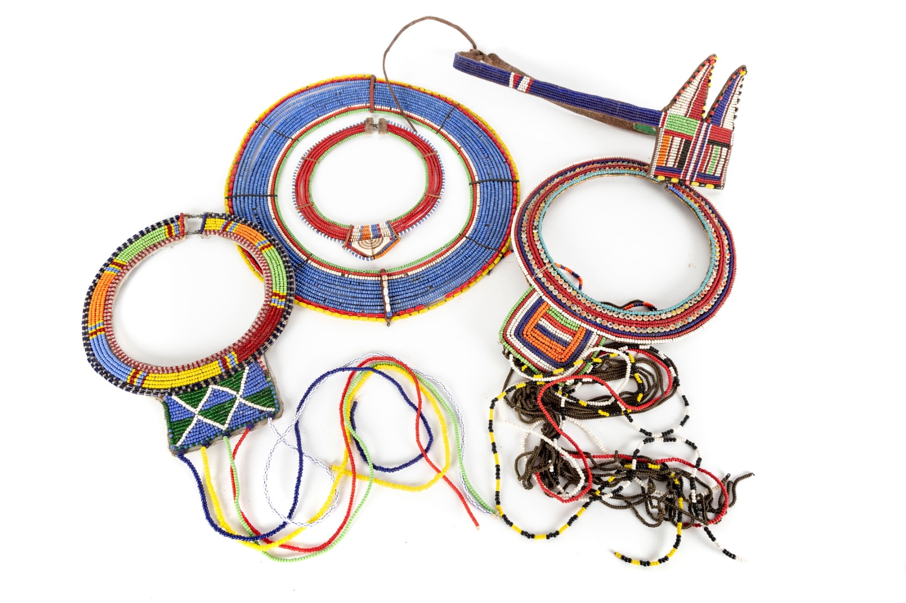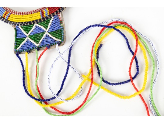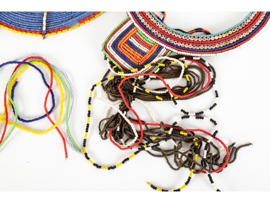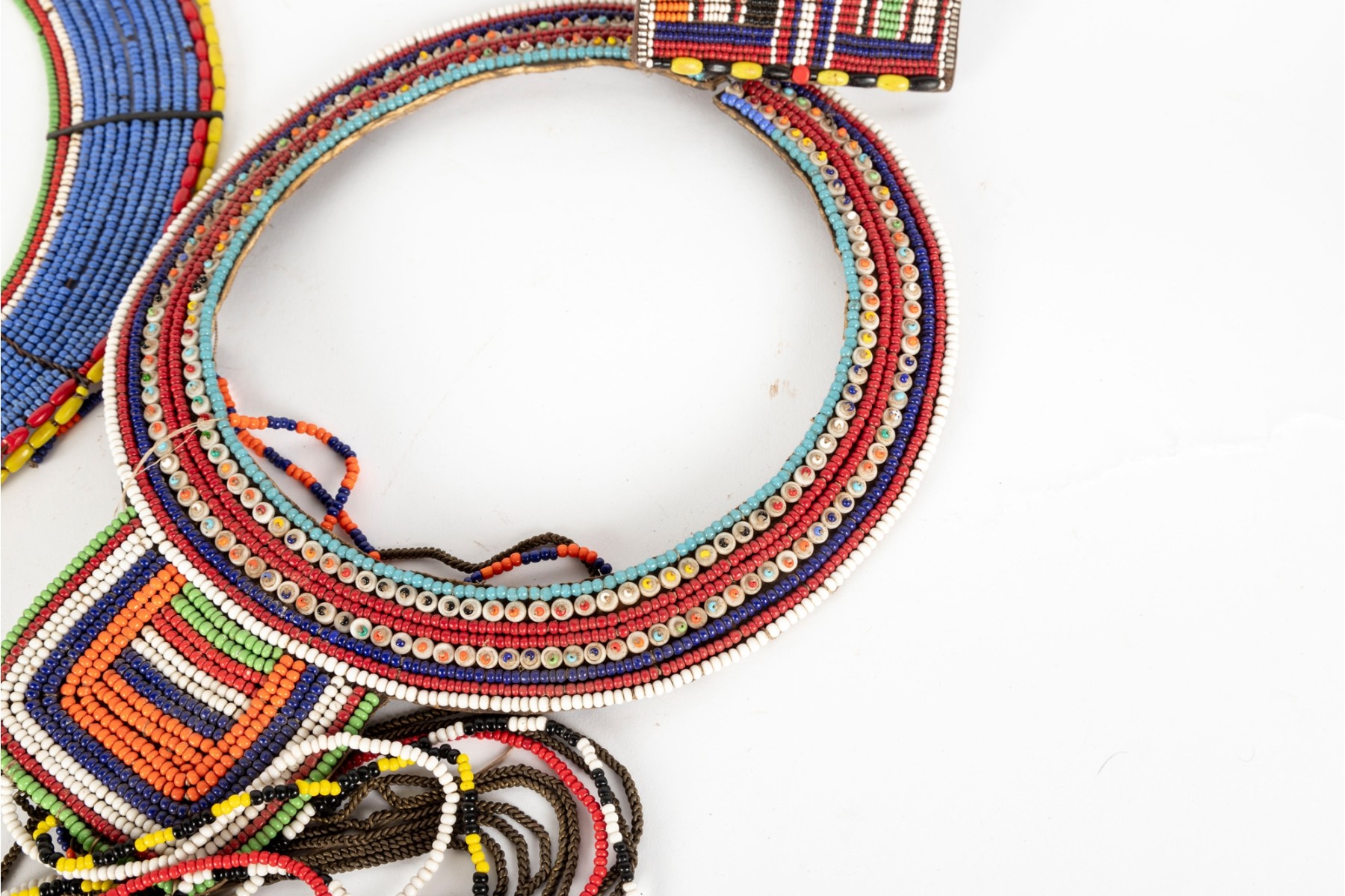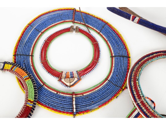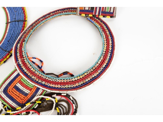 A beautiful collection of finely beaded tribal necklaces in colorful polychrome with geometric striped and tassel designs.