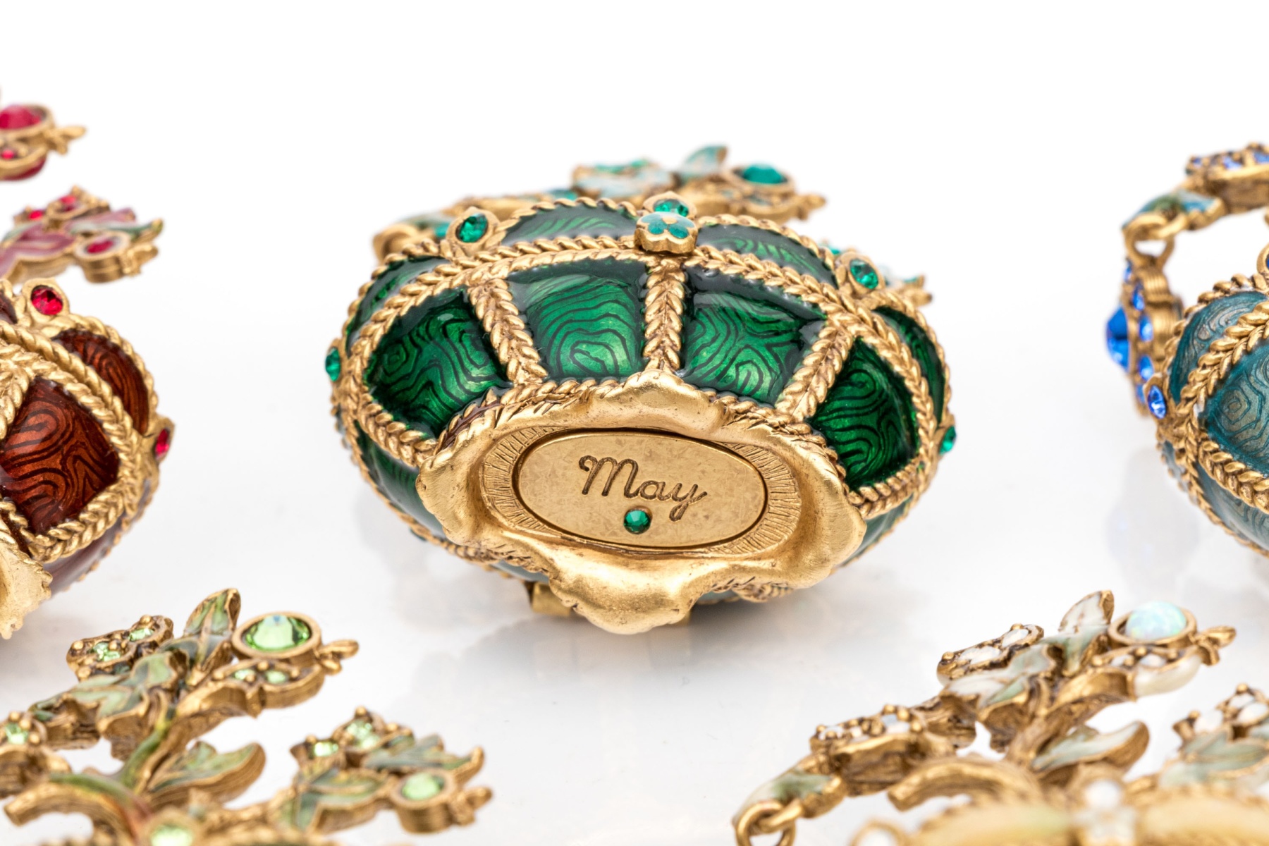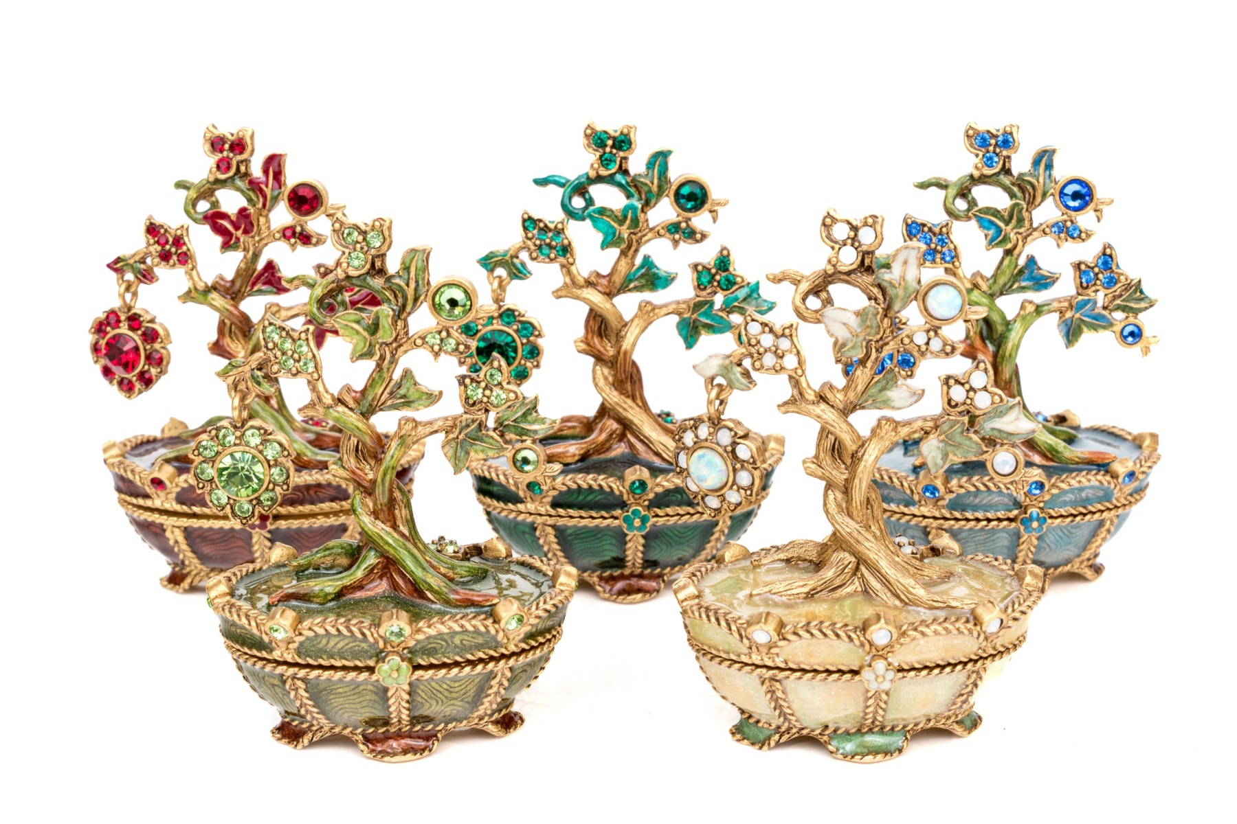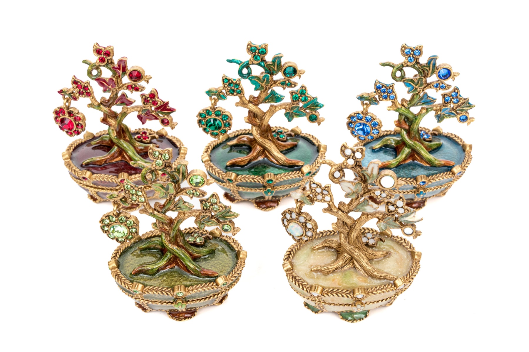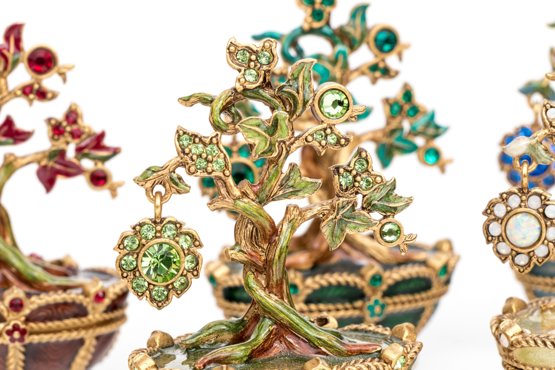 Lovely enameled trees set with colored stones in enameled baskets, each a different color with a different flower pendant set with a colored stone. Each labeled with a month on the base.