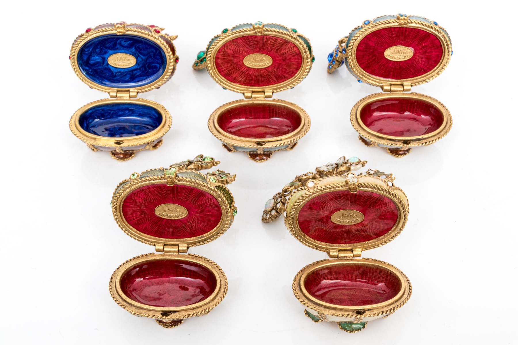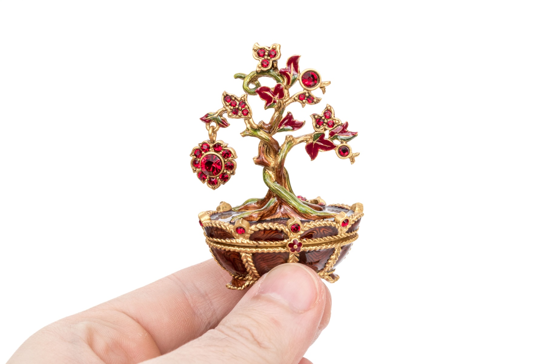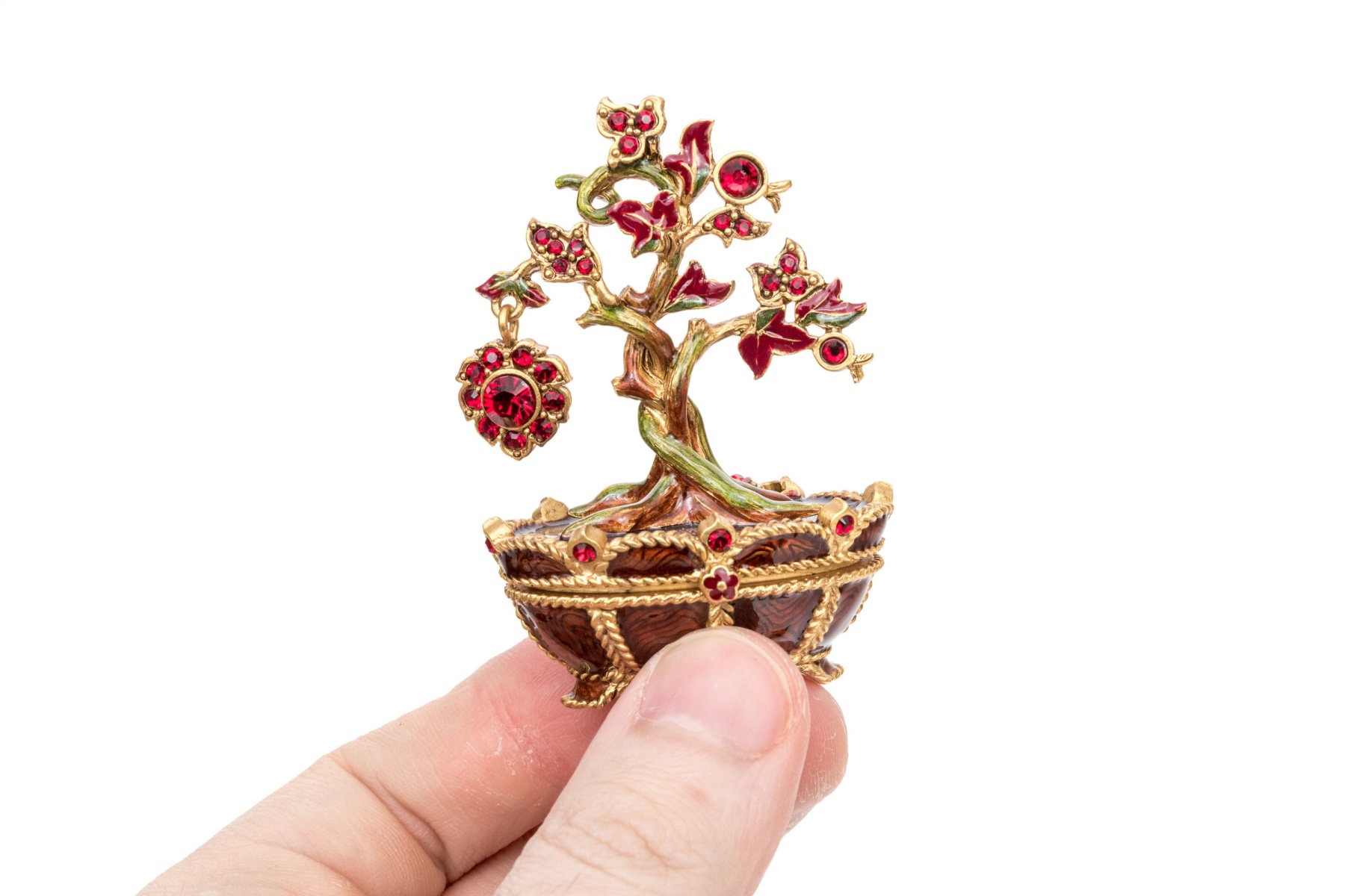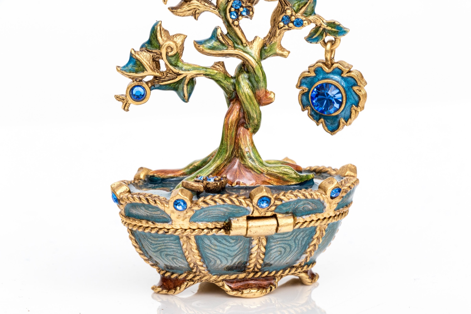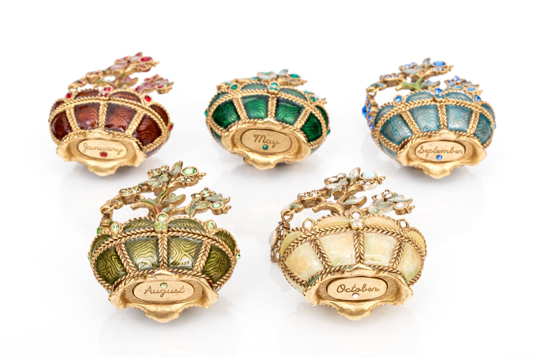 Lovely enameled trees set with colored stones in enameled baskets, each a different color with a different flower pendant set with a colored stone. Each labeled with a month on the base.
