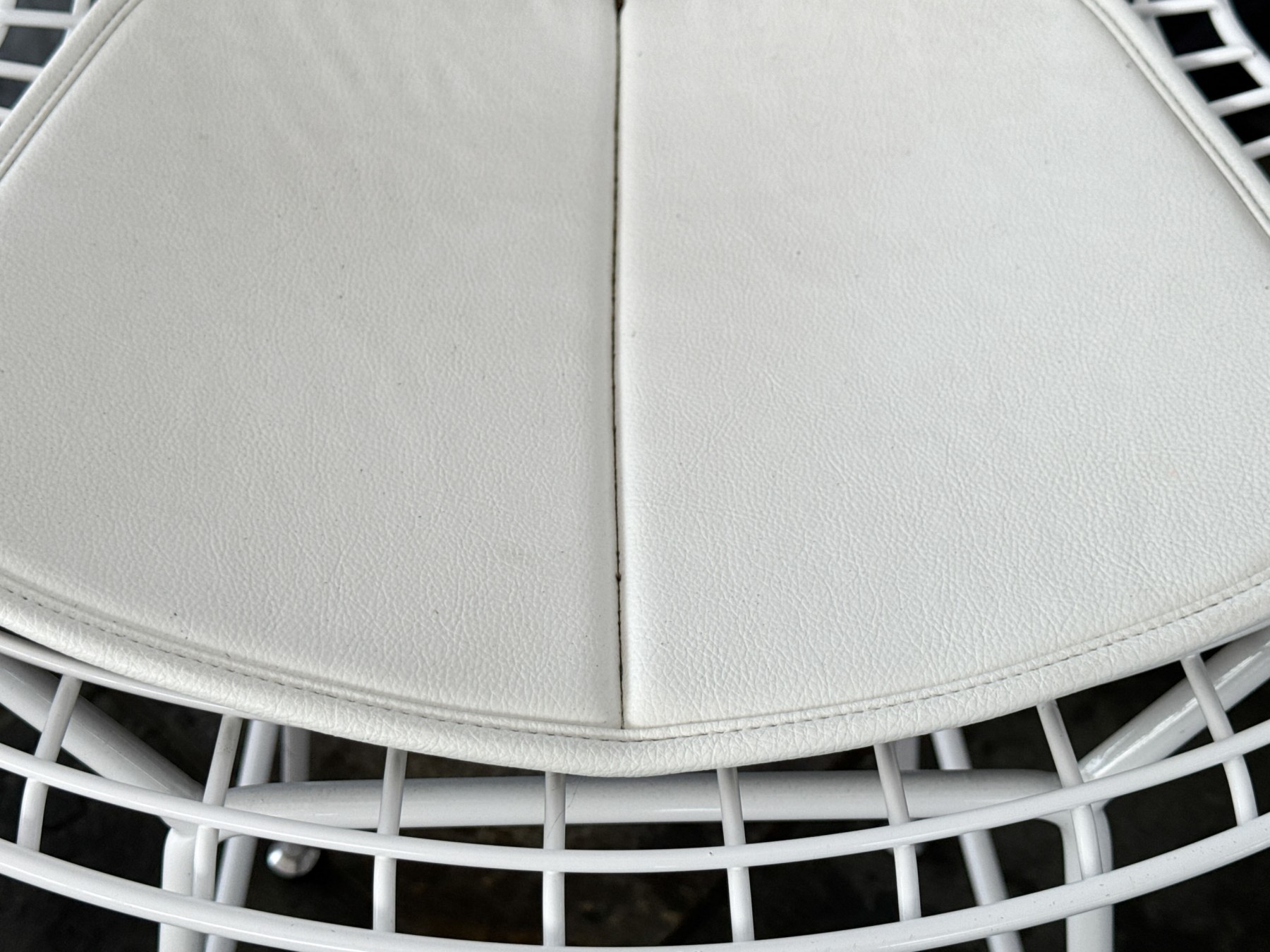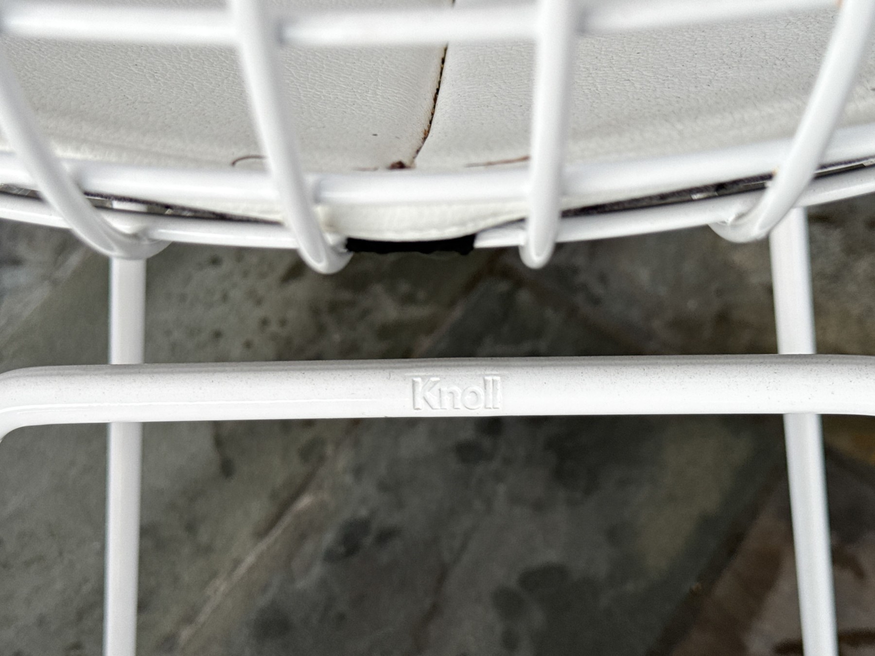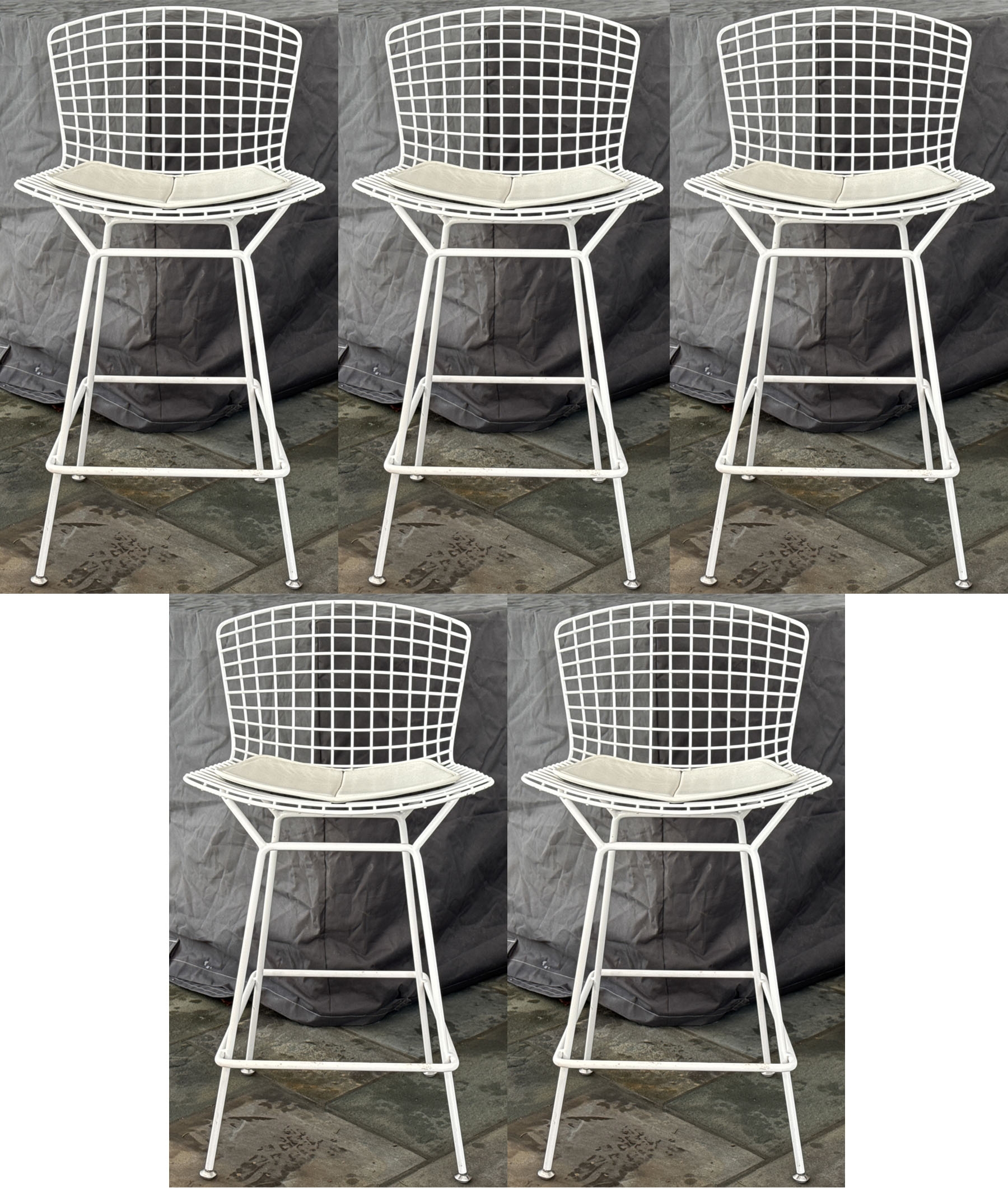 A fabulous collection of five Knoll Bertoia bar stools with stylish white wire frames on shapely curved rectangular seats and backs with thin white cushions raised over airy rod legs with box stretchers. Marked Knoll along the backs.