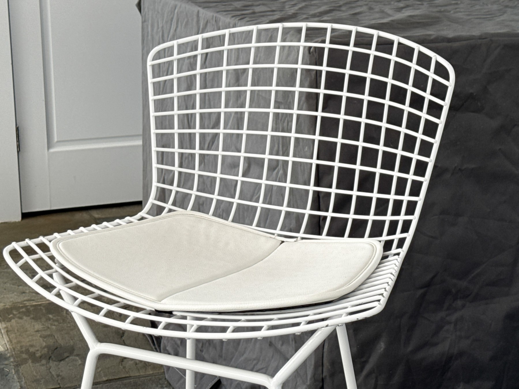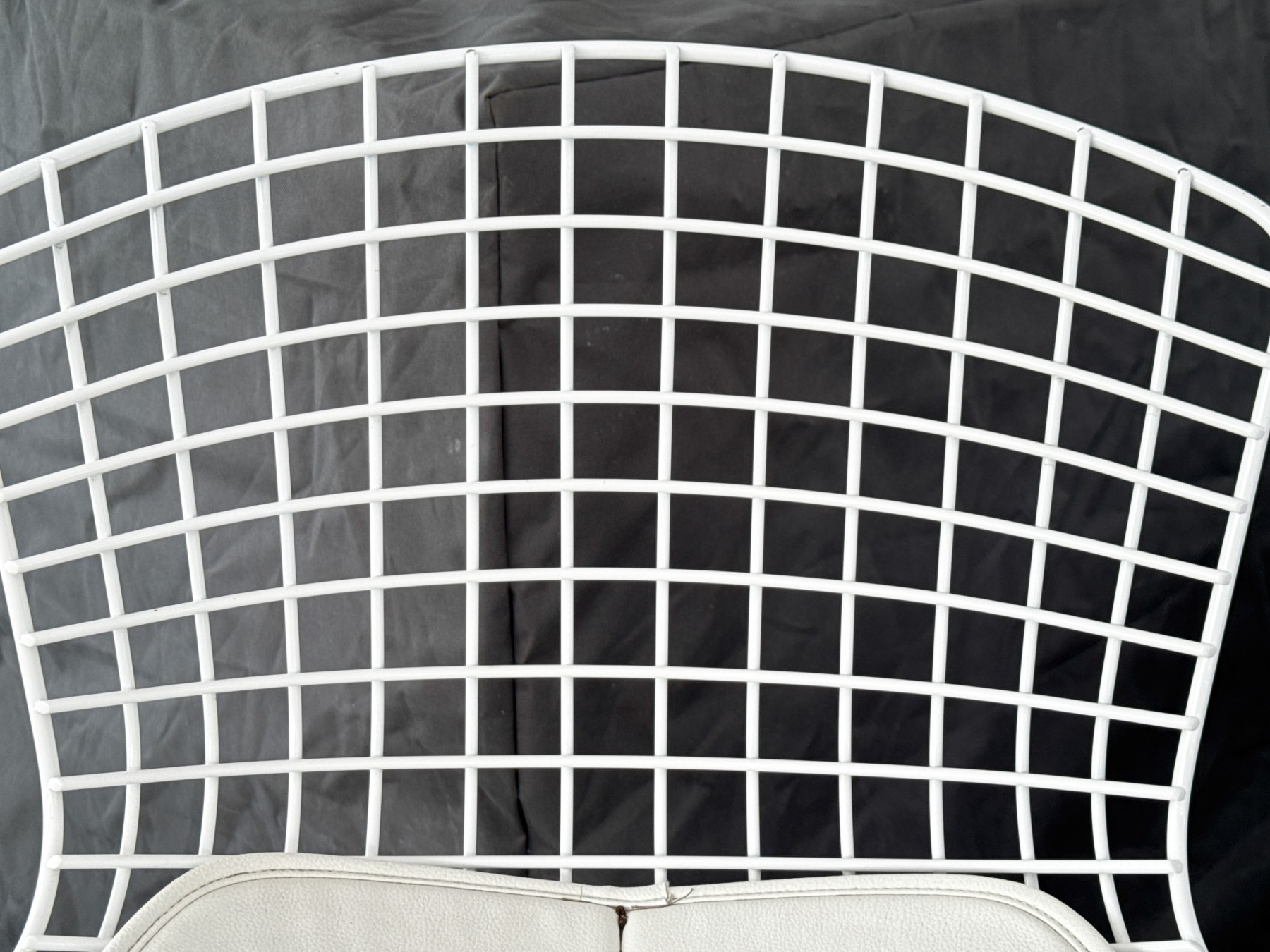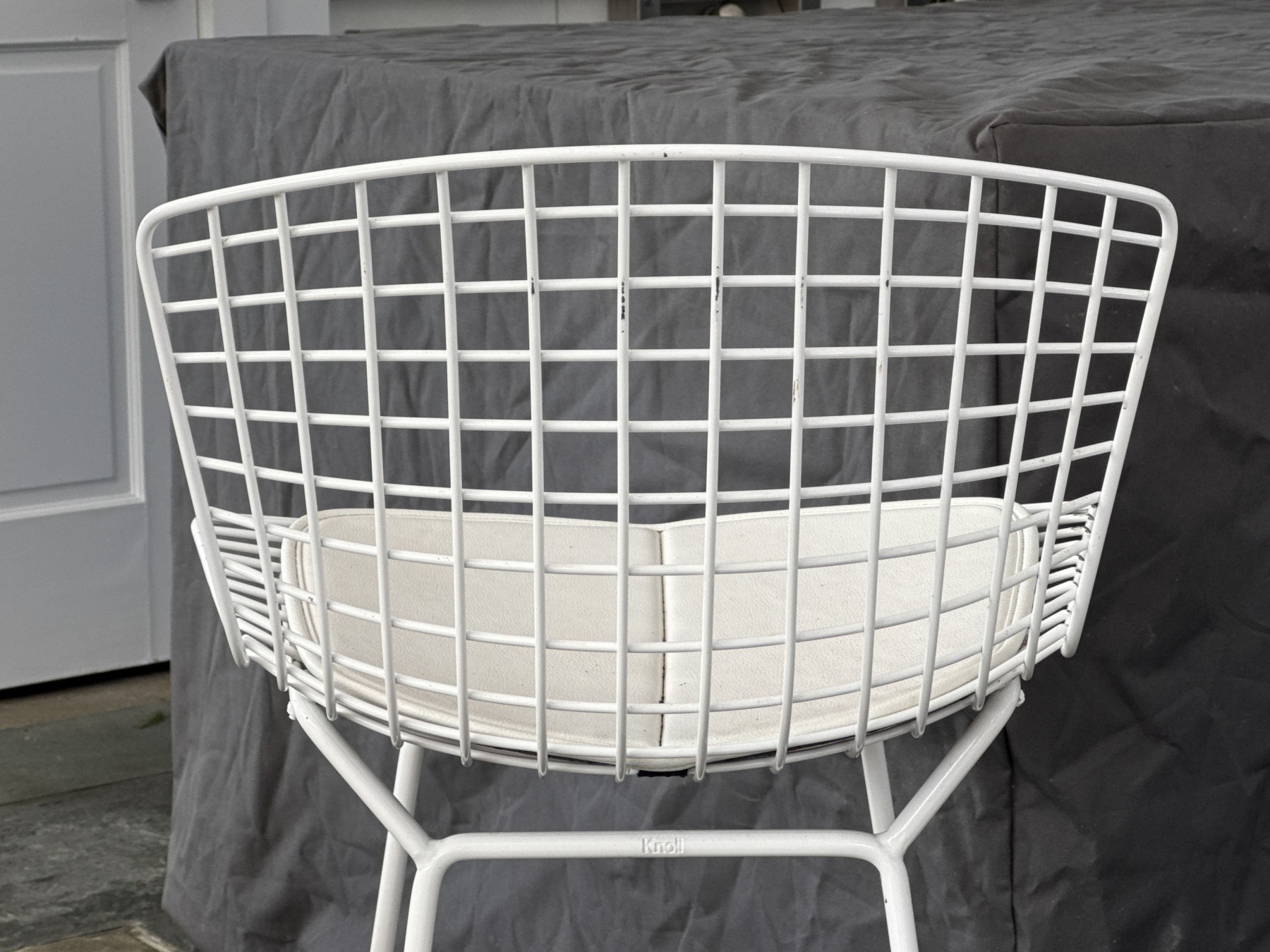 A fabulous collection of five Knoll Bertoia bar stools with stylish white wire frames on shapely curved rectangular seats and backs with thin white cushions raised over airy rod legs with box stretchers. Marked Knoll along the backs.