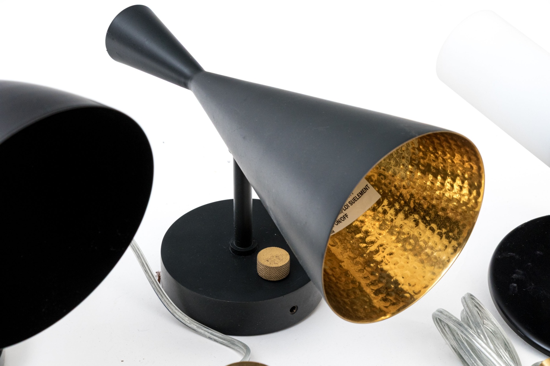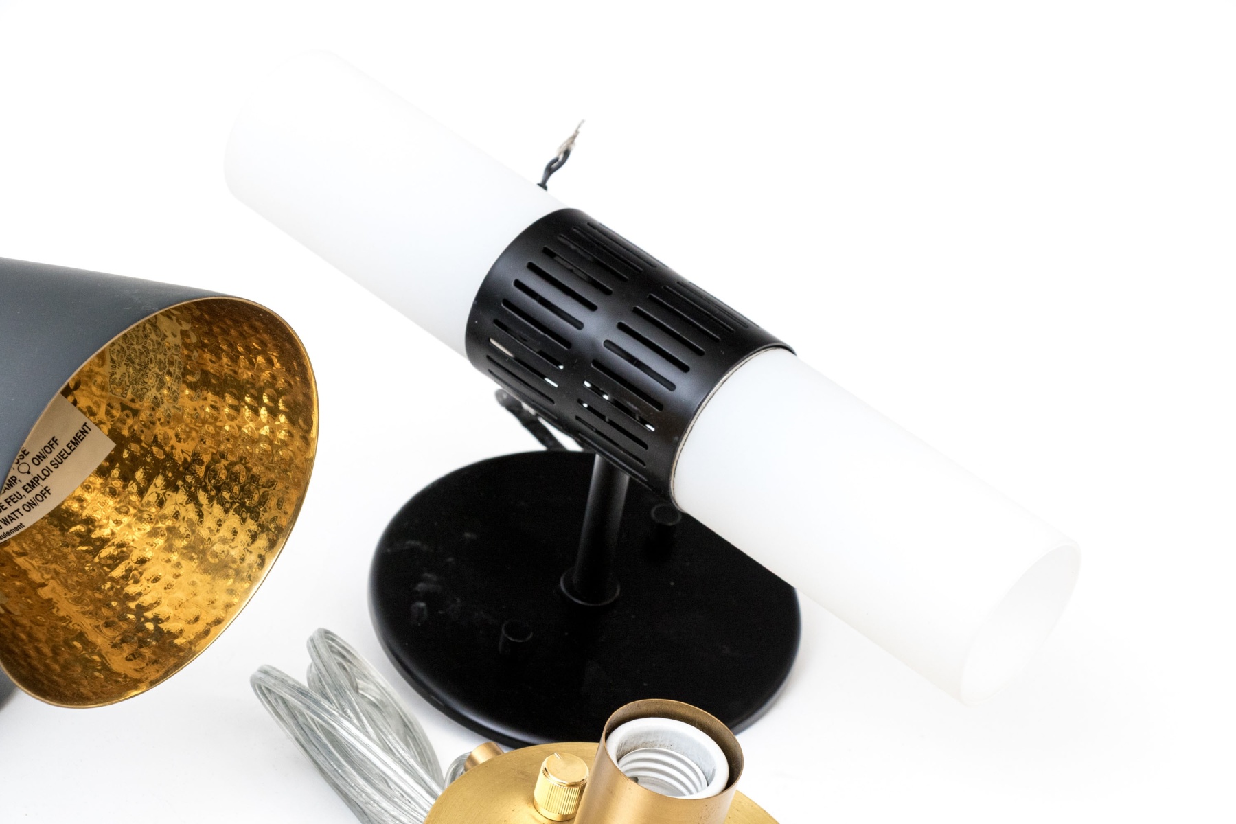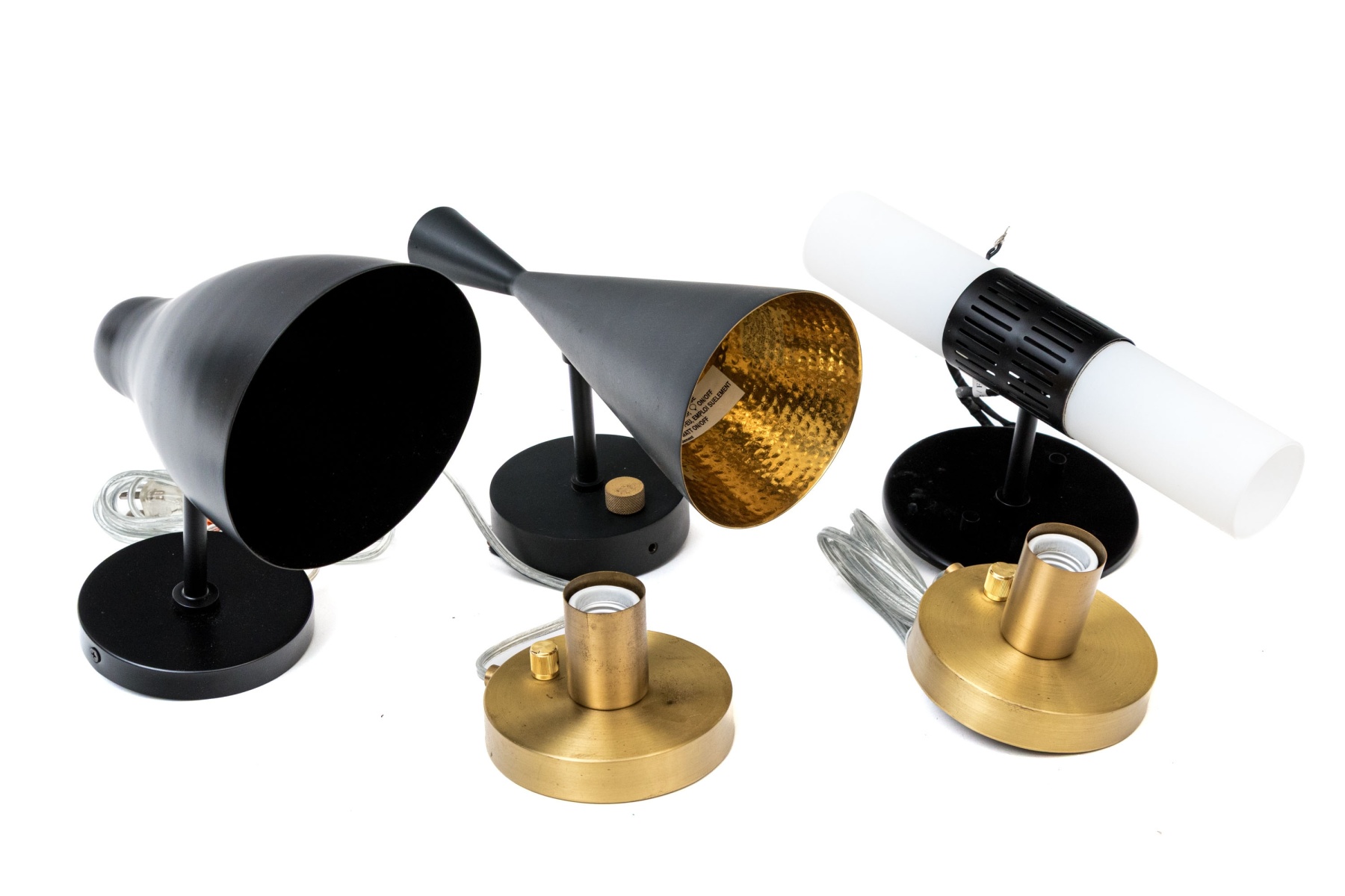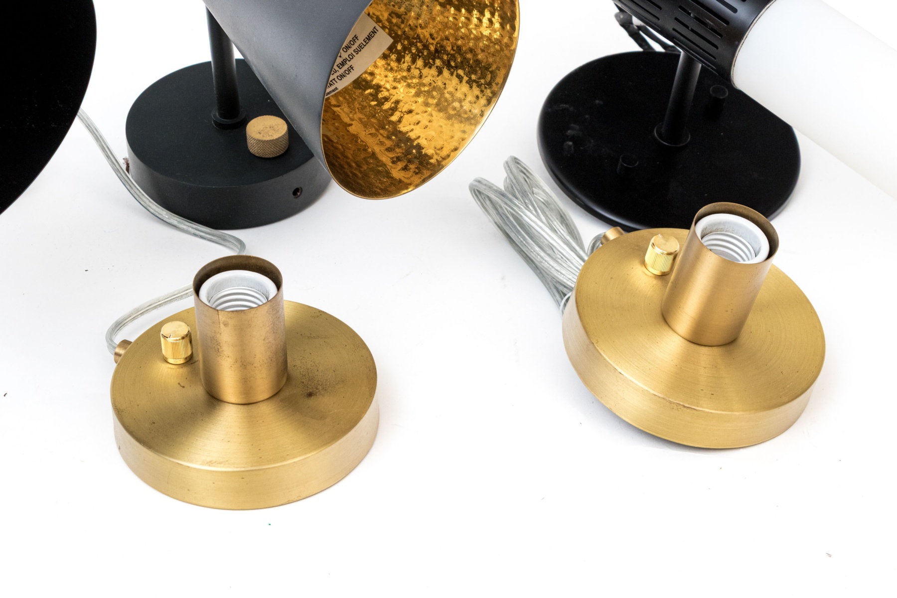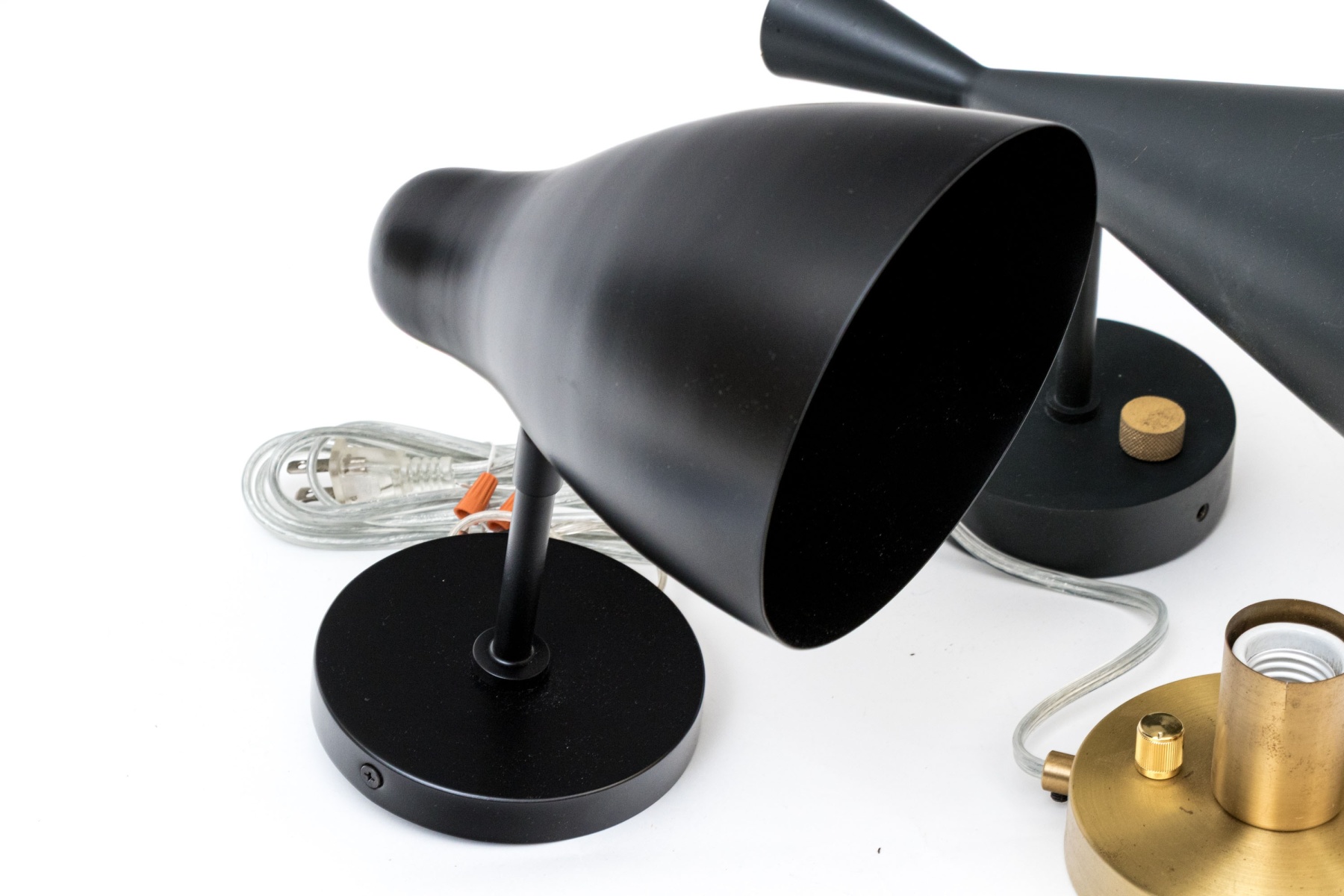 Comprised of a pair of brass finished ceiling mounted pendant lights. A single black scone with black conical shade, a second black scone with hourglass form shade, and a shade with white shades flanking a black central element.
