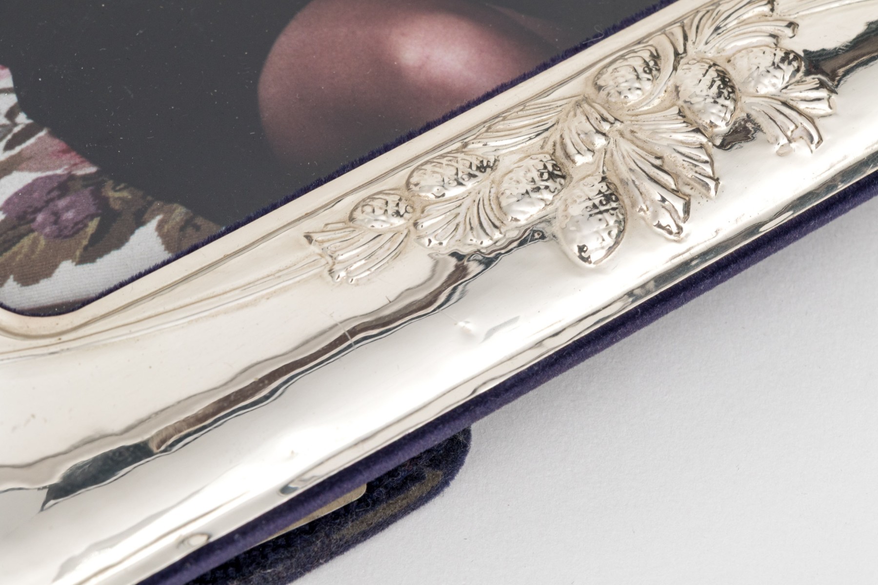 a large scalloped sterling frame with medallions on the gadrooned surround. Suede like backing.