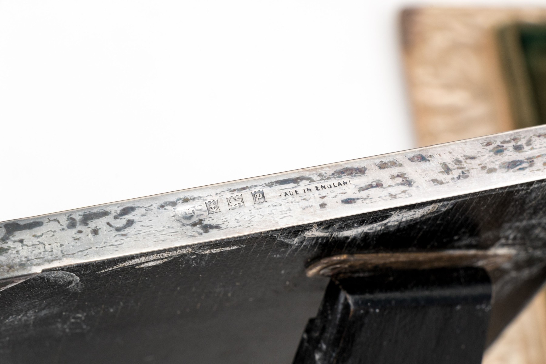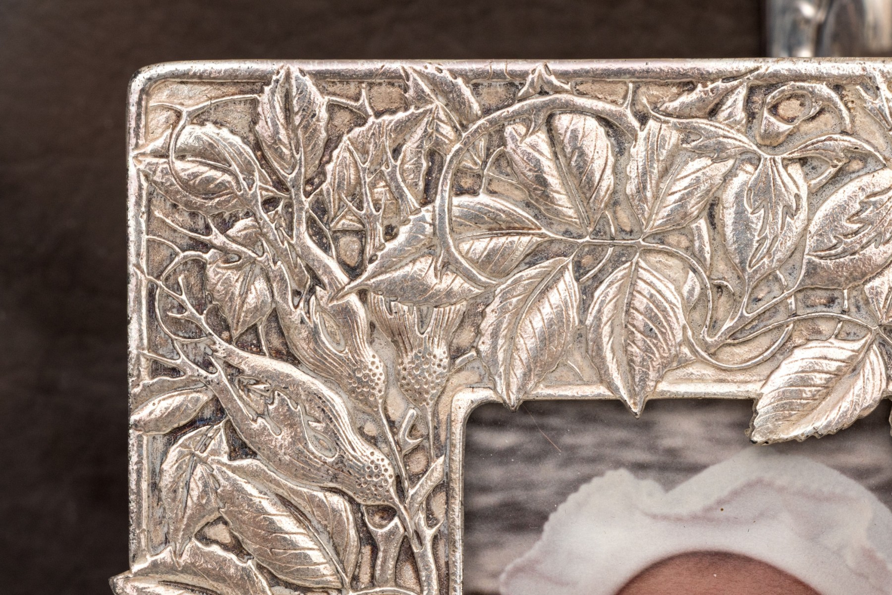 a sterling frame with embossed pine comb motifs. Suede like backing.