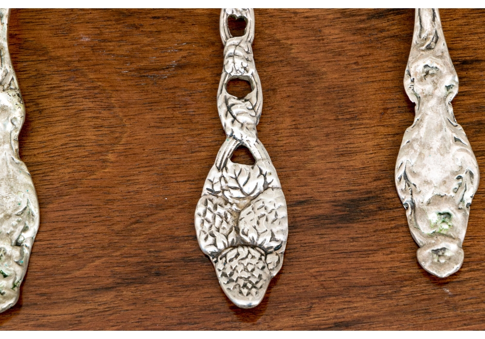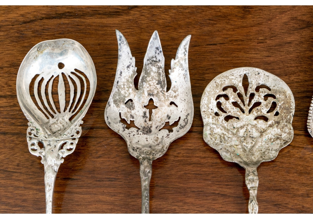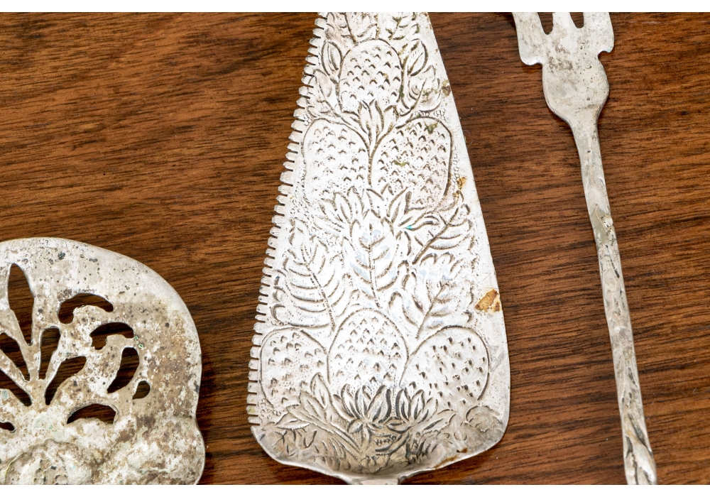 All are fabulously ornate in decoration and form. Including a sesational pie slice, with strawberry decoration to the serrated slice and handle, with pierced and slotted serving spoons and a wonderful serving fork.