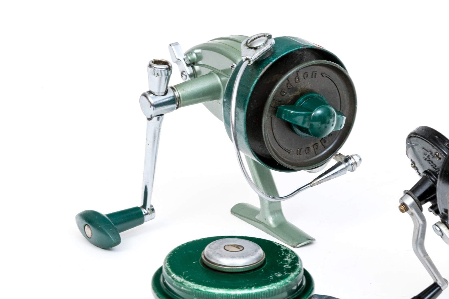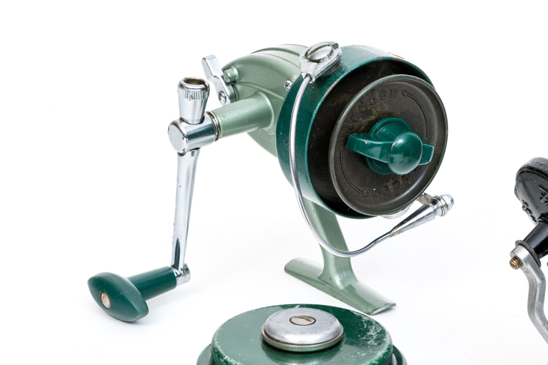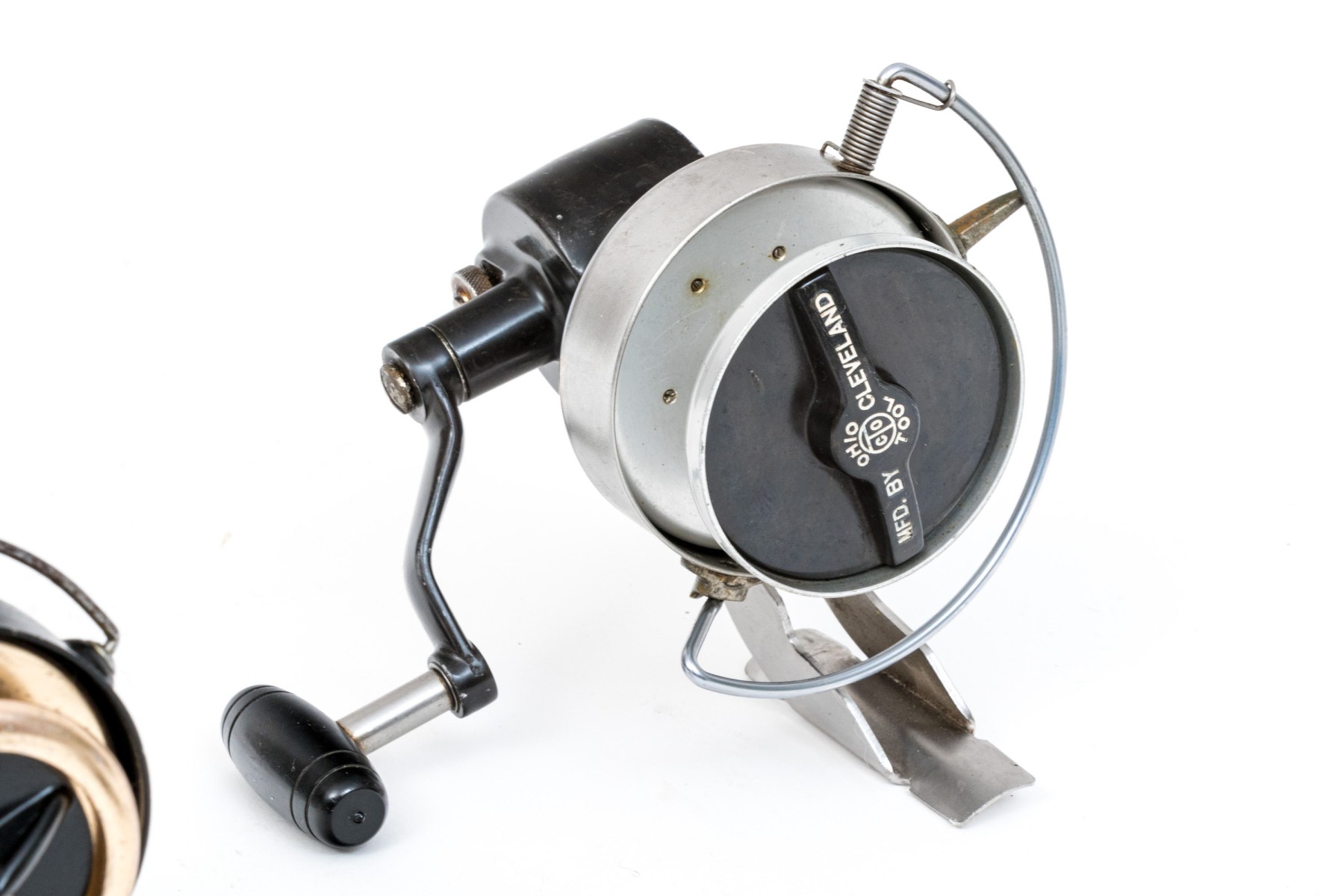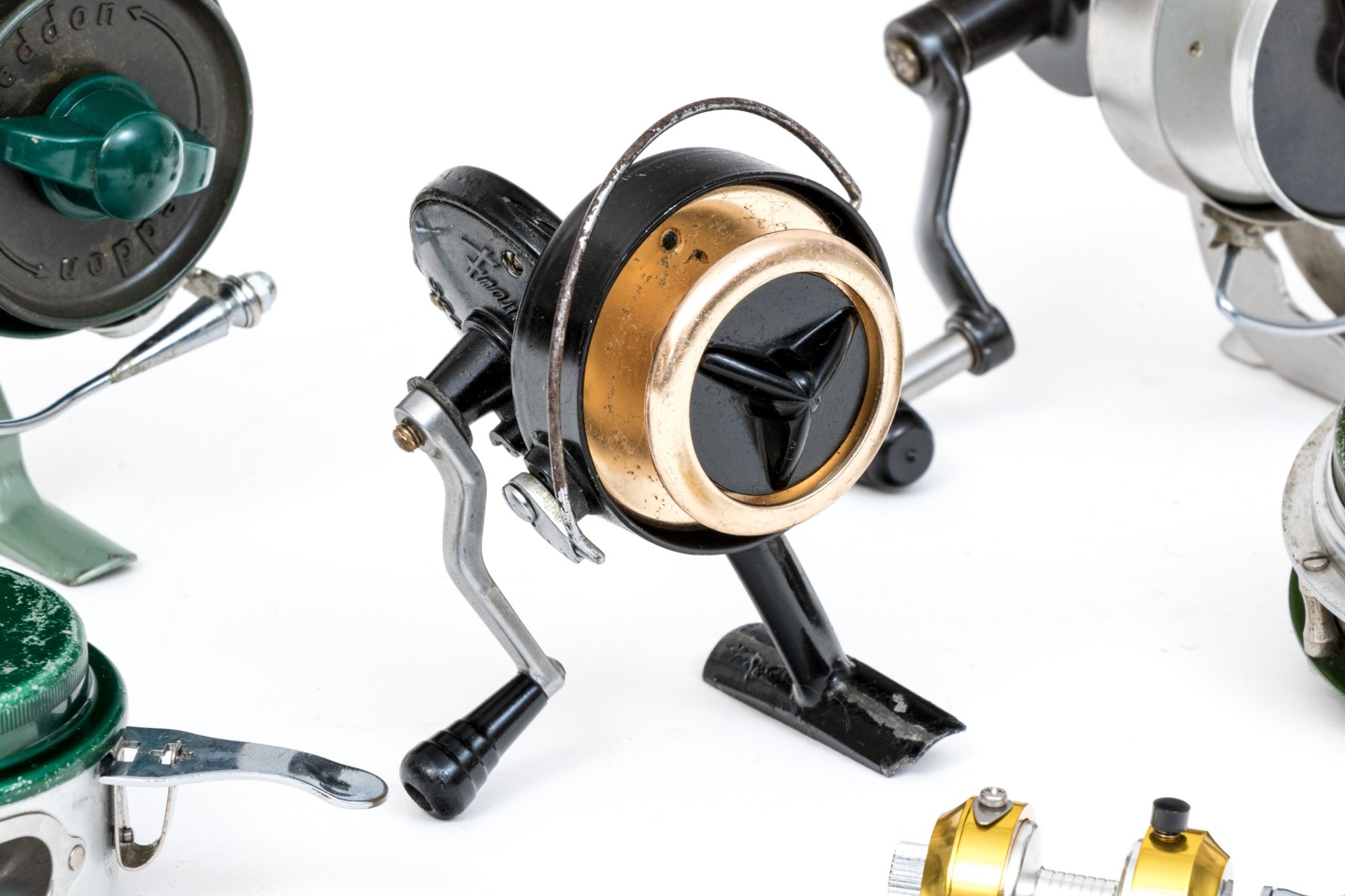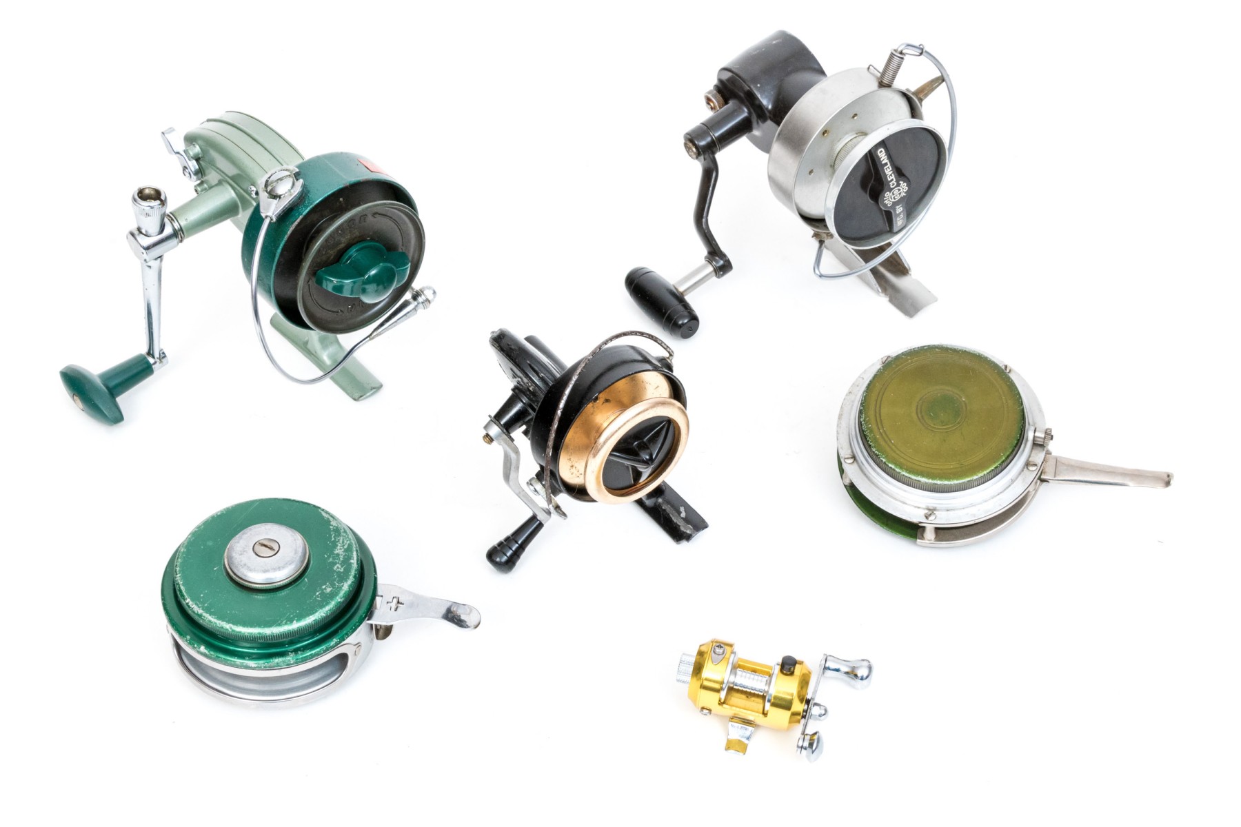 Collection of vintage fly and spin fishing reels. Two fly reels, Shakespeare and J.C. Higgins. Three spinning reels, Otco Surf Slip Caster, Frank Hacking Spinmaster and a Hidden 210-R (with box). The last is a miniature travel reel.