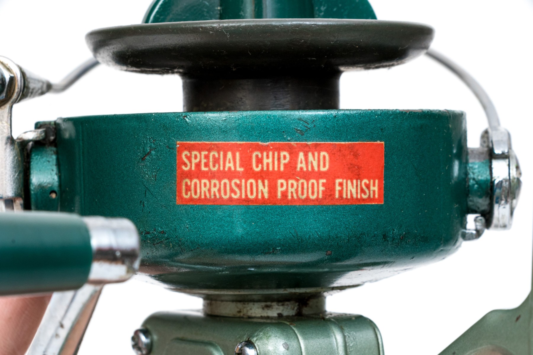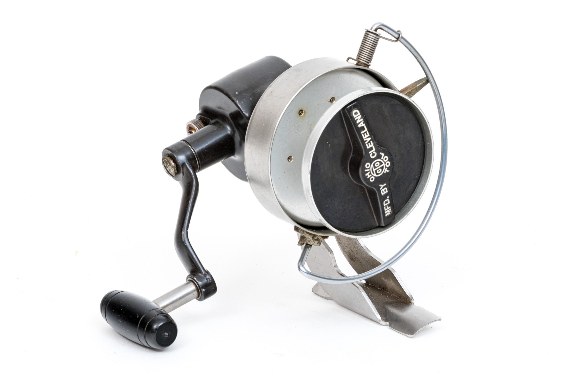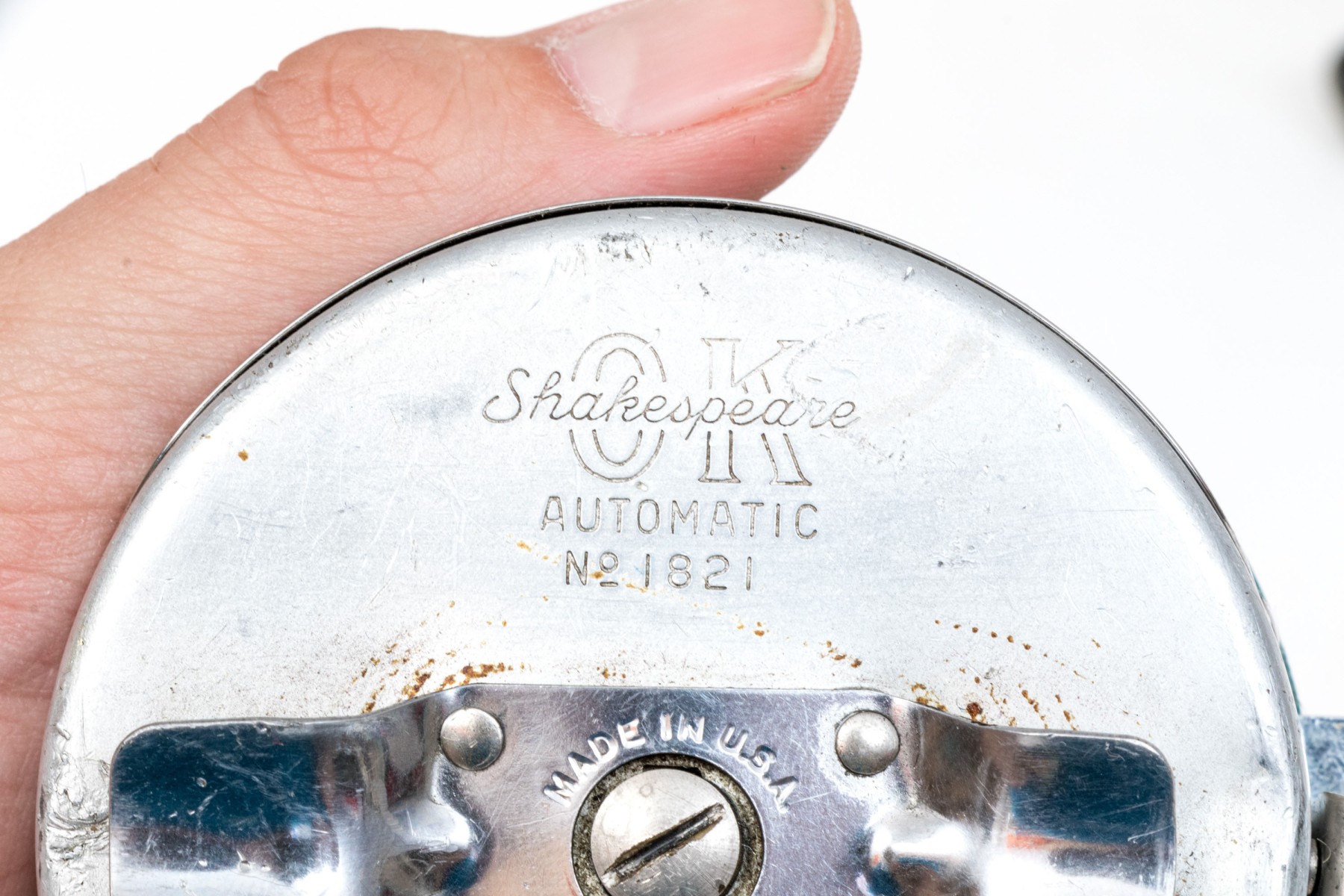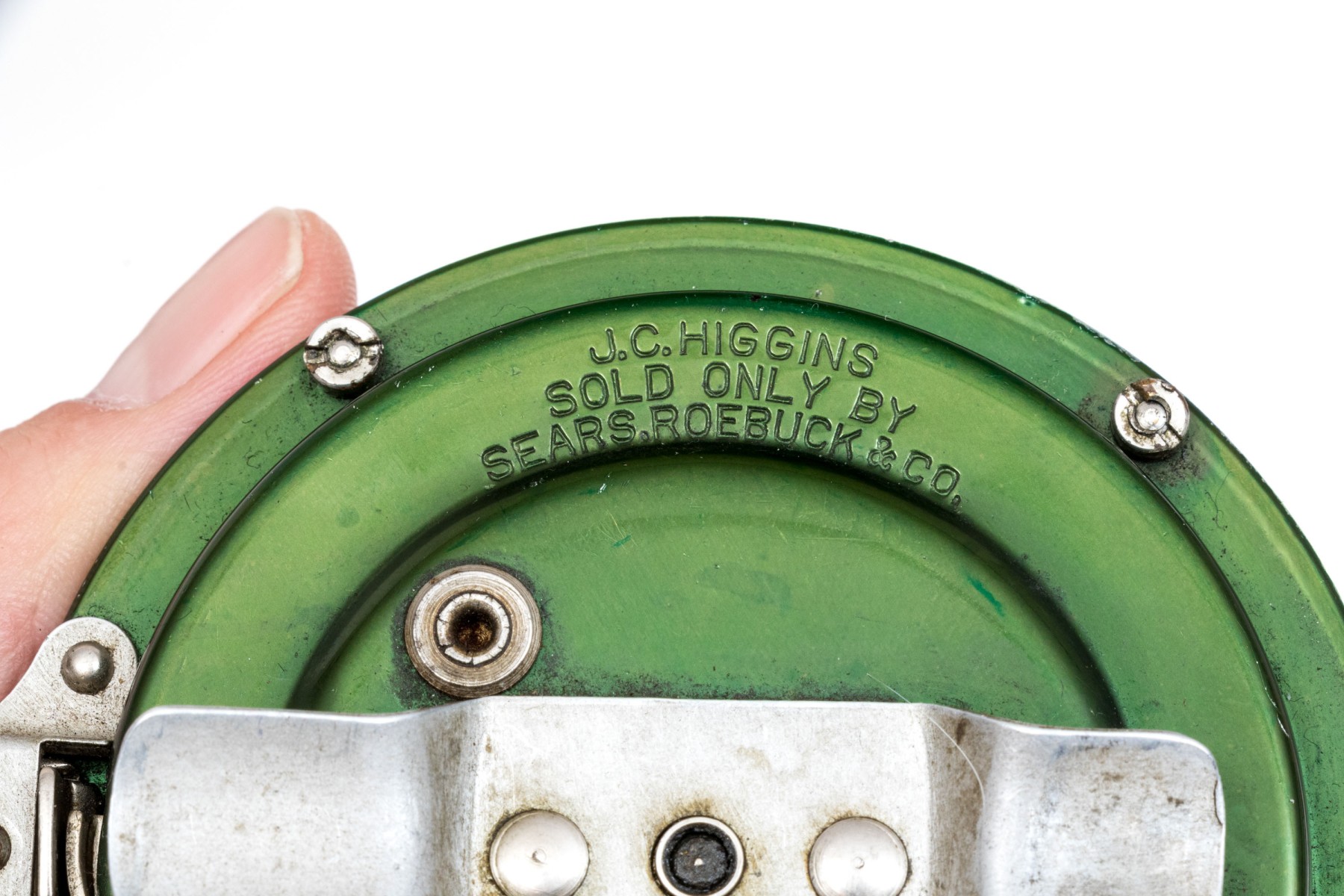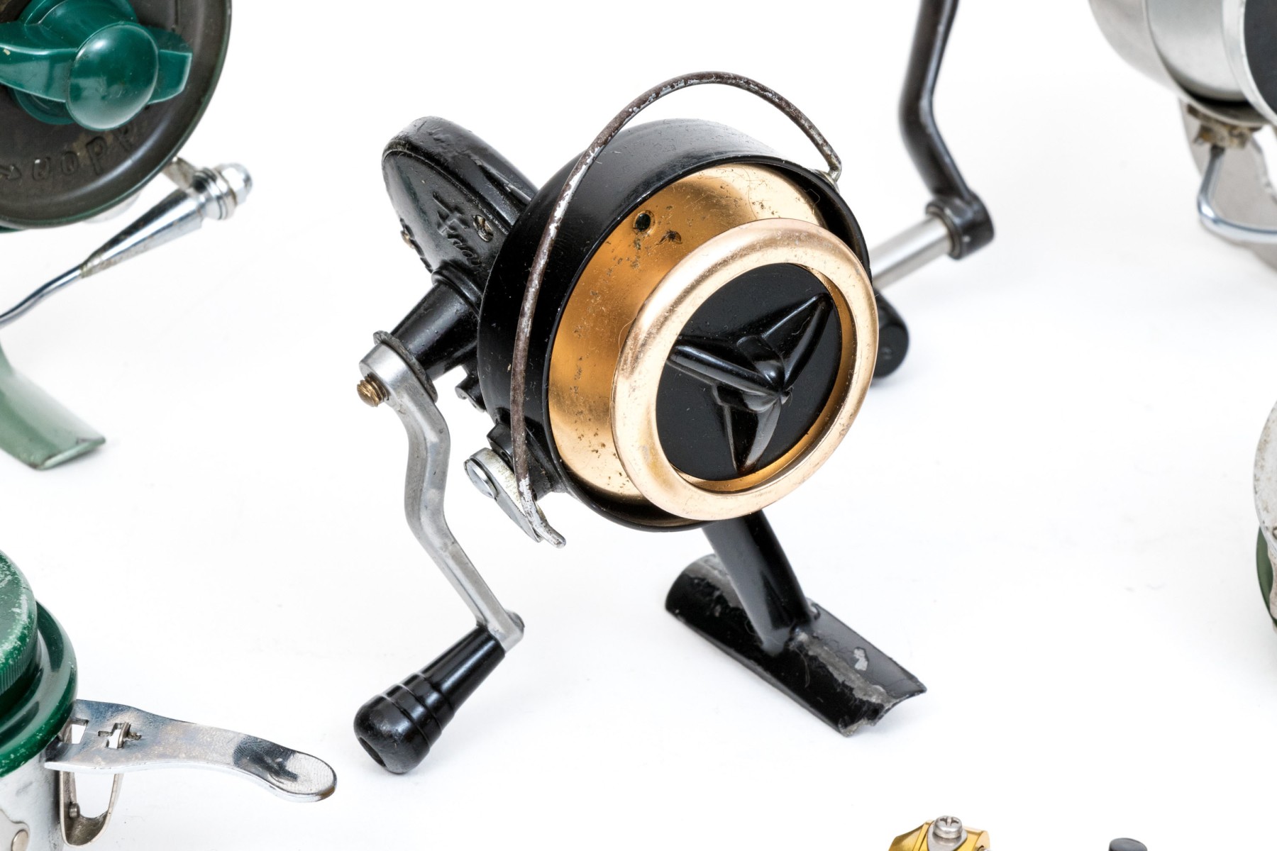 Collection of vintage fly and spin fishing reels. Two fly reels, Shakespeare and J.C. Higgins. Three spinning reels, Otco Surf Slip Caster, Frank Hacking Spinmaster and a Hidden 210-R (with box). The last is a miniature travel reel.