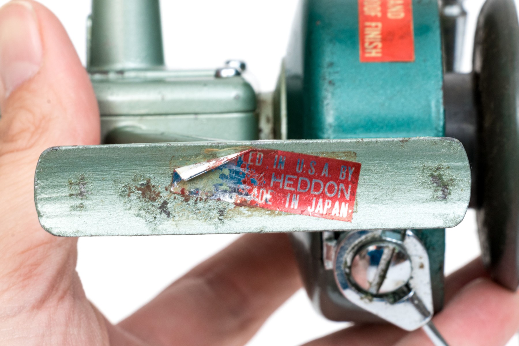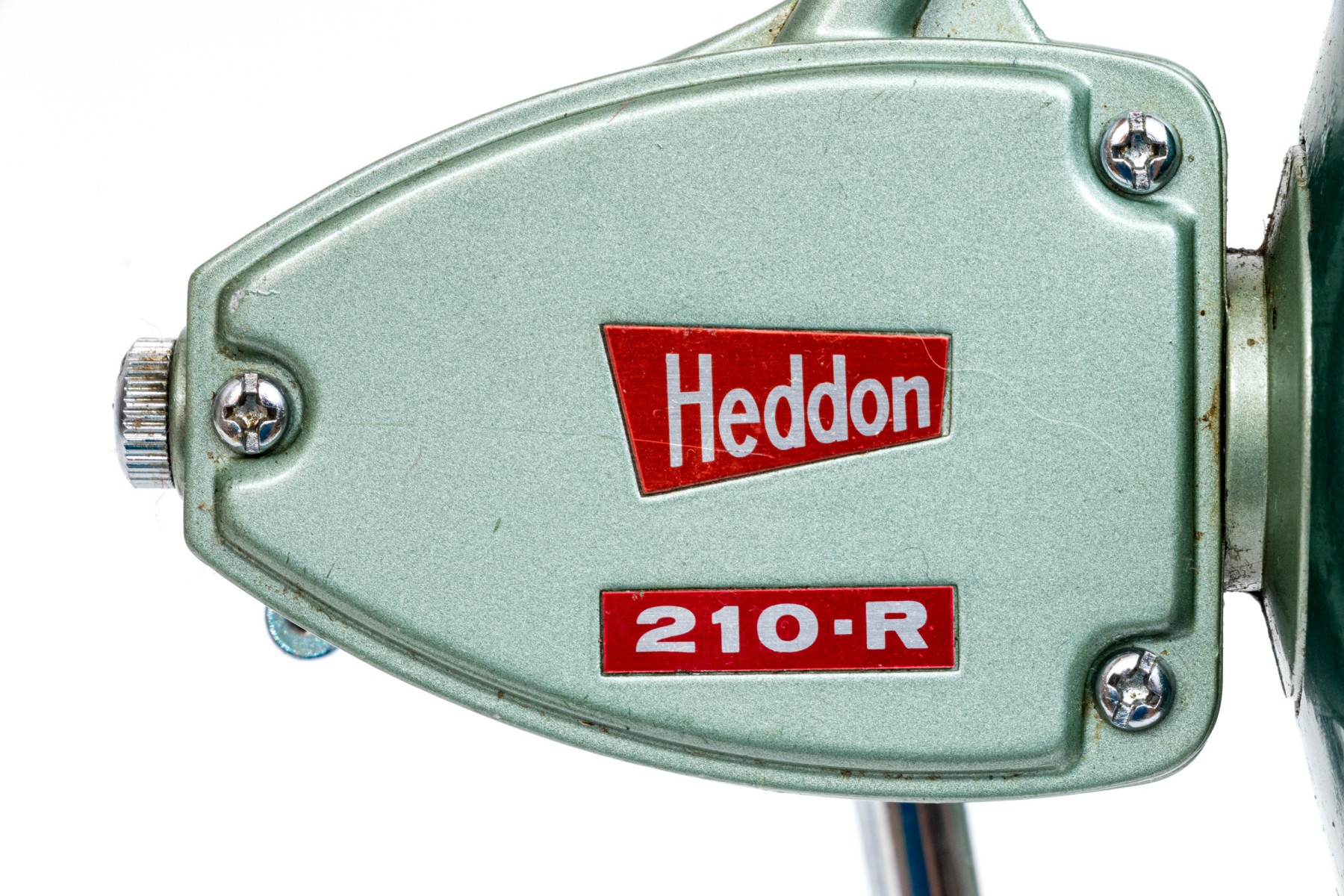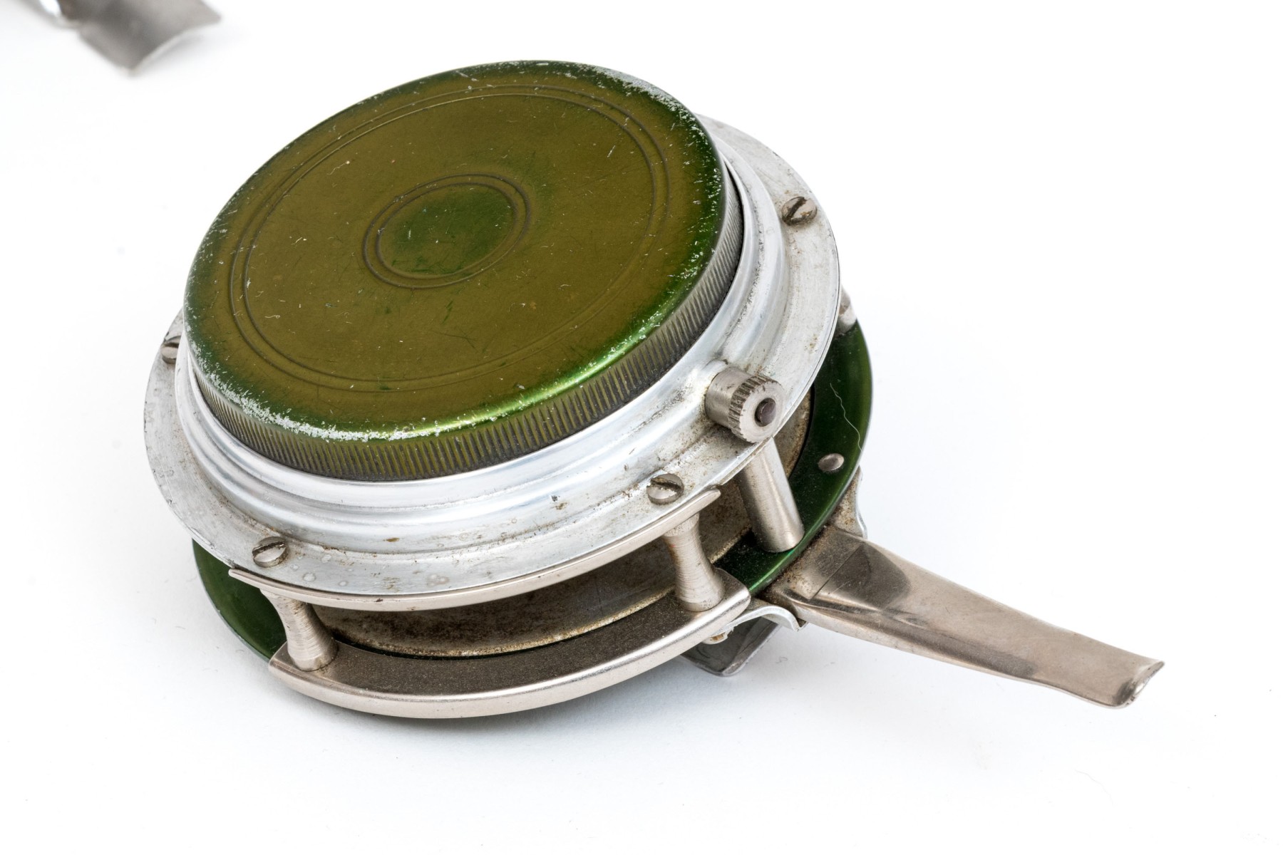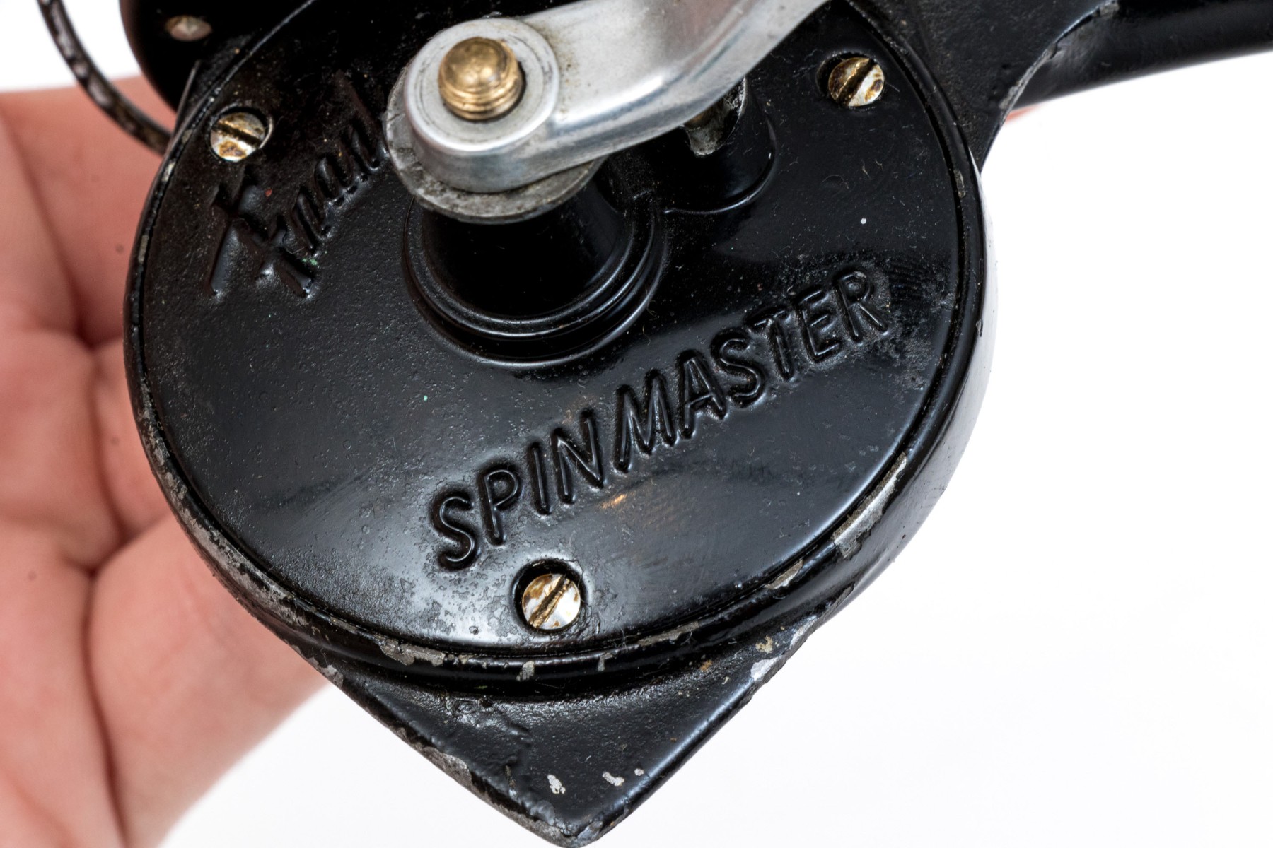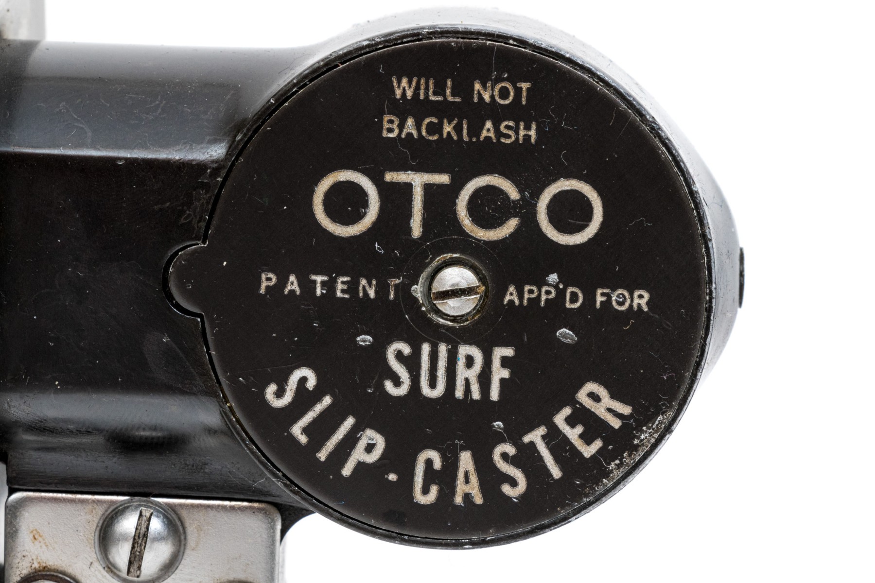 Collection of vintage fly and spin fishing reels. Two fly reels, Shakespeare and J.C. Higgins. Three spinning reels, Otco Surf Slip Caster, Frank Hacking Spinmaster and a Hidden 210-R (with box). The last is a miniature travel reel.