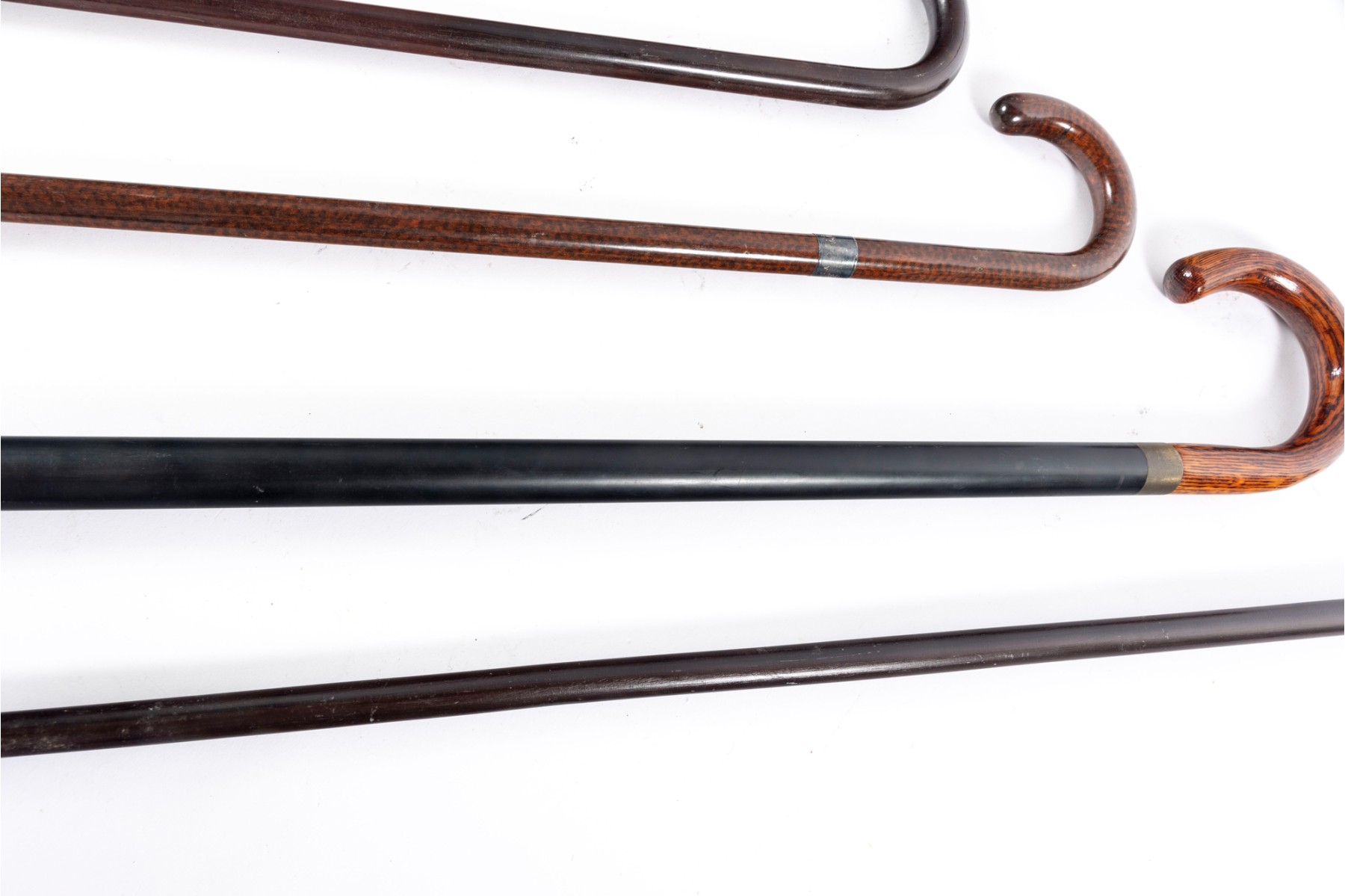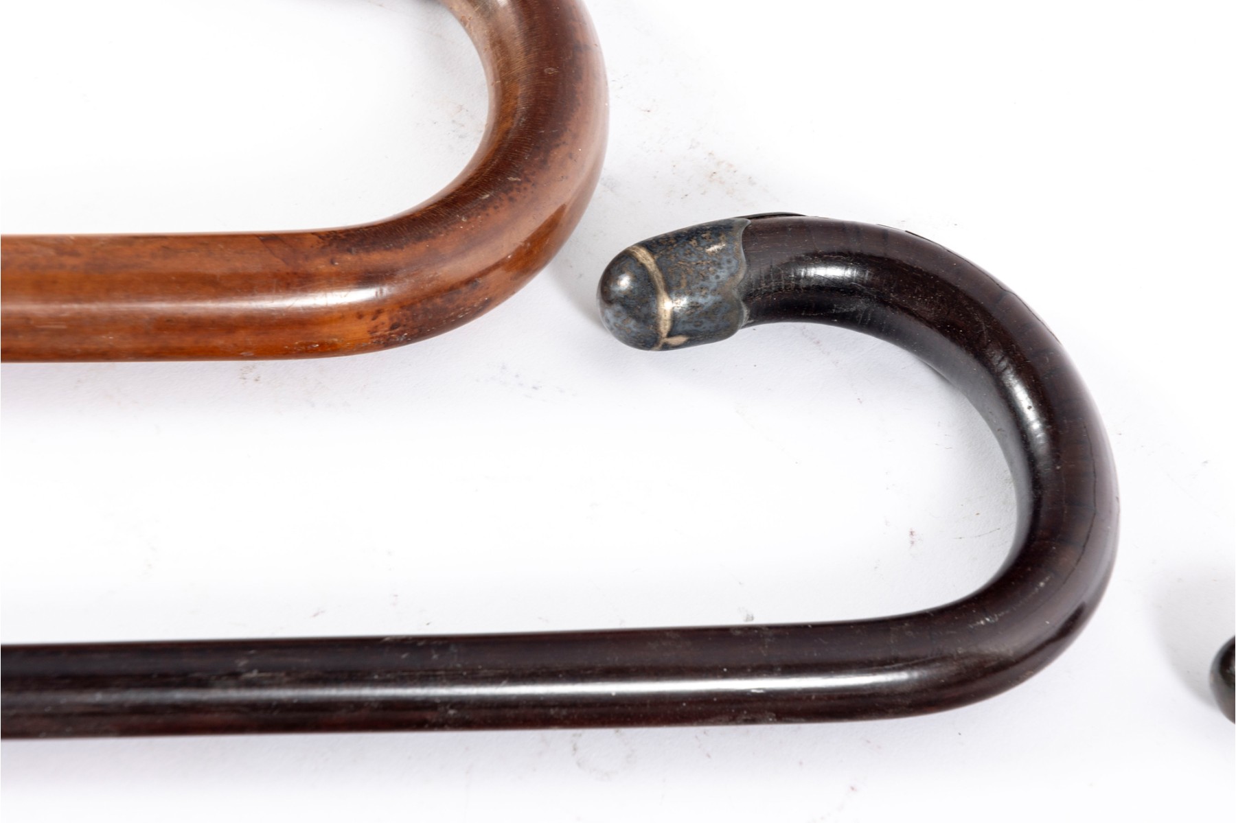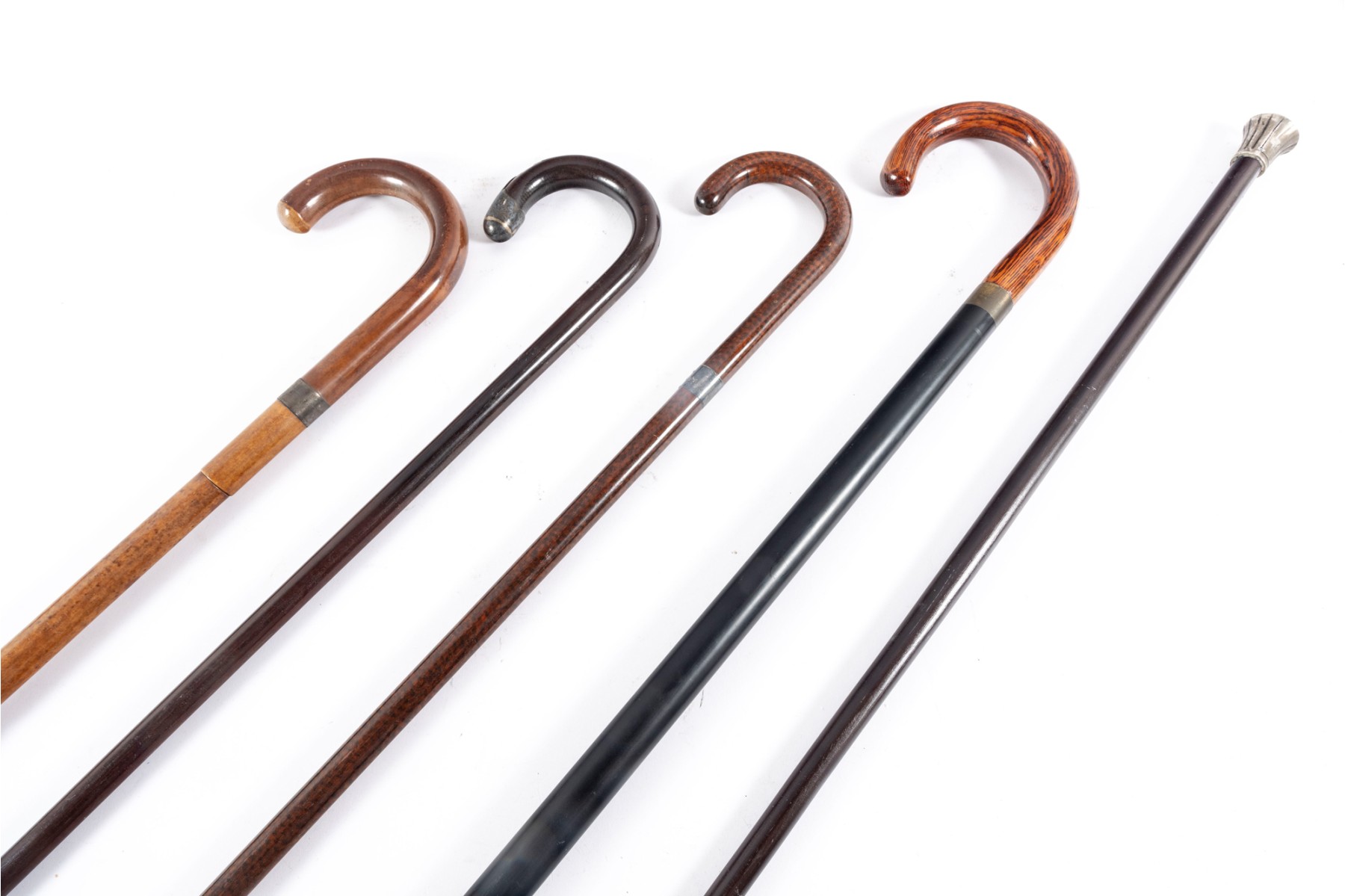 A set of five vintage walking canes -- each one unique and showcasing arched handles and one pommel handle cane. Contents as shown, see photos for details.