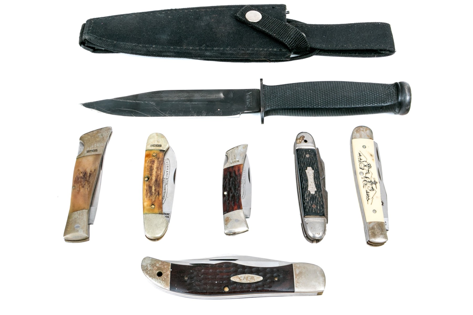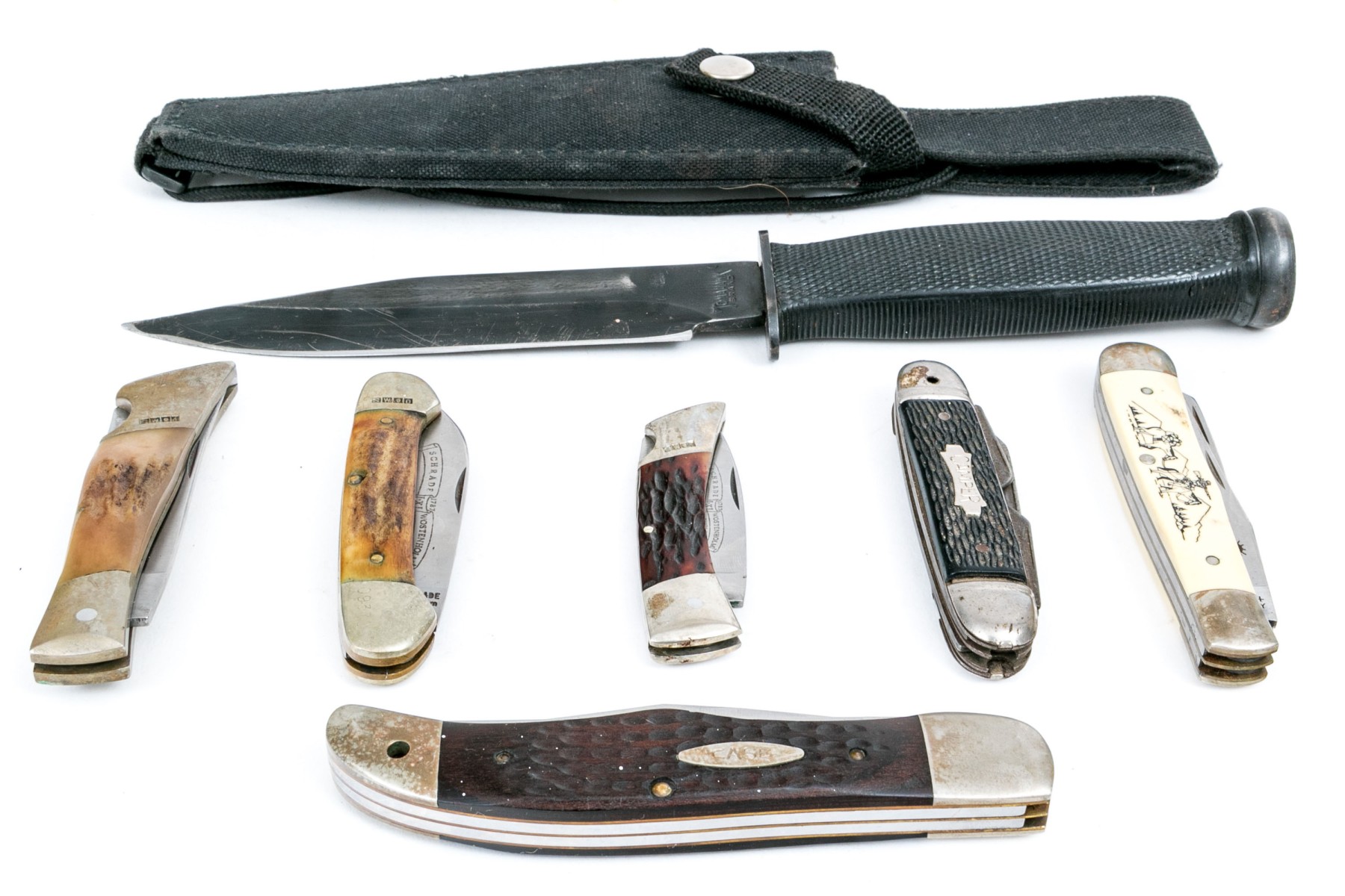 Collection of seven knives. Six various folding knives and one fixed blade Tomahawk brand knife with case.