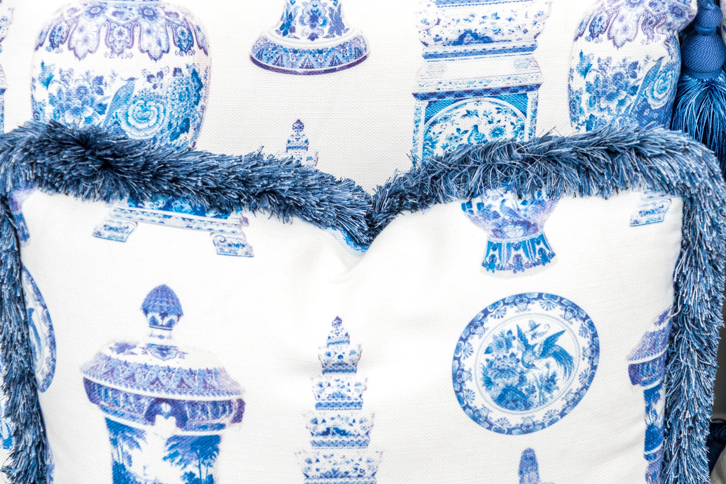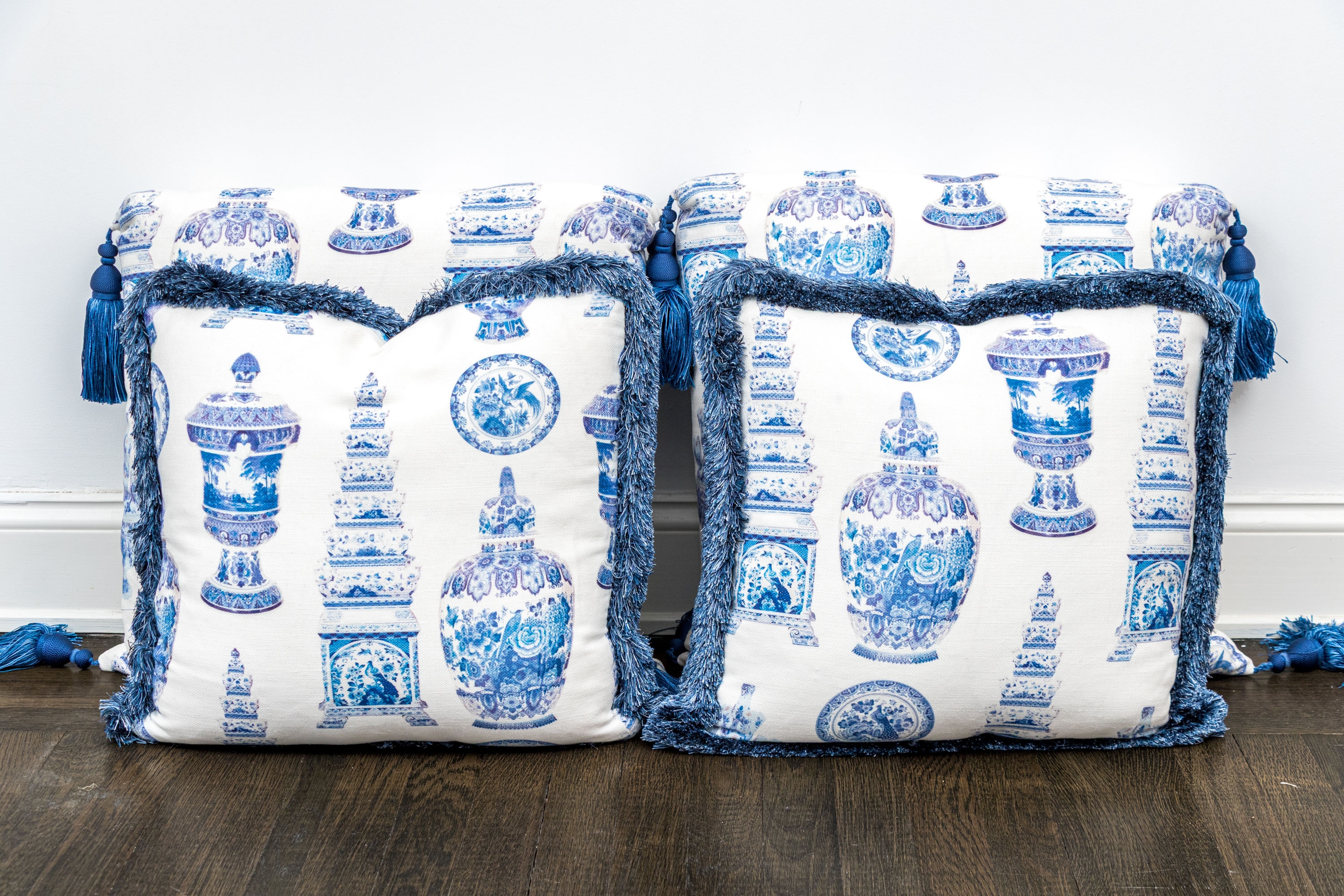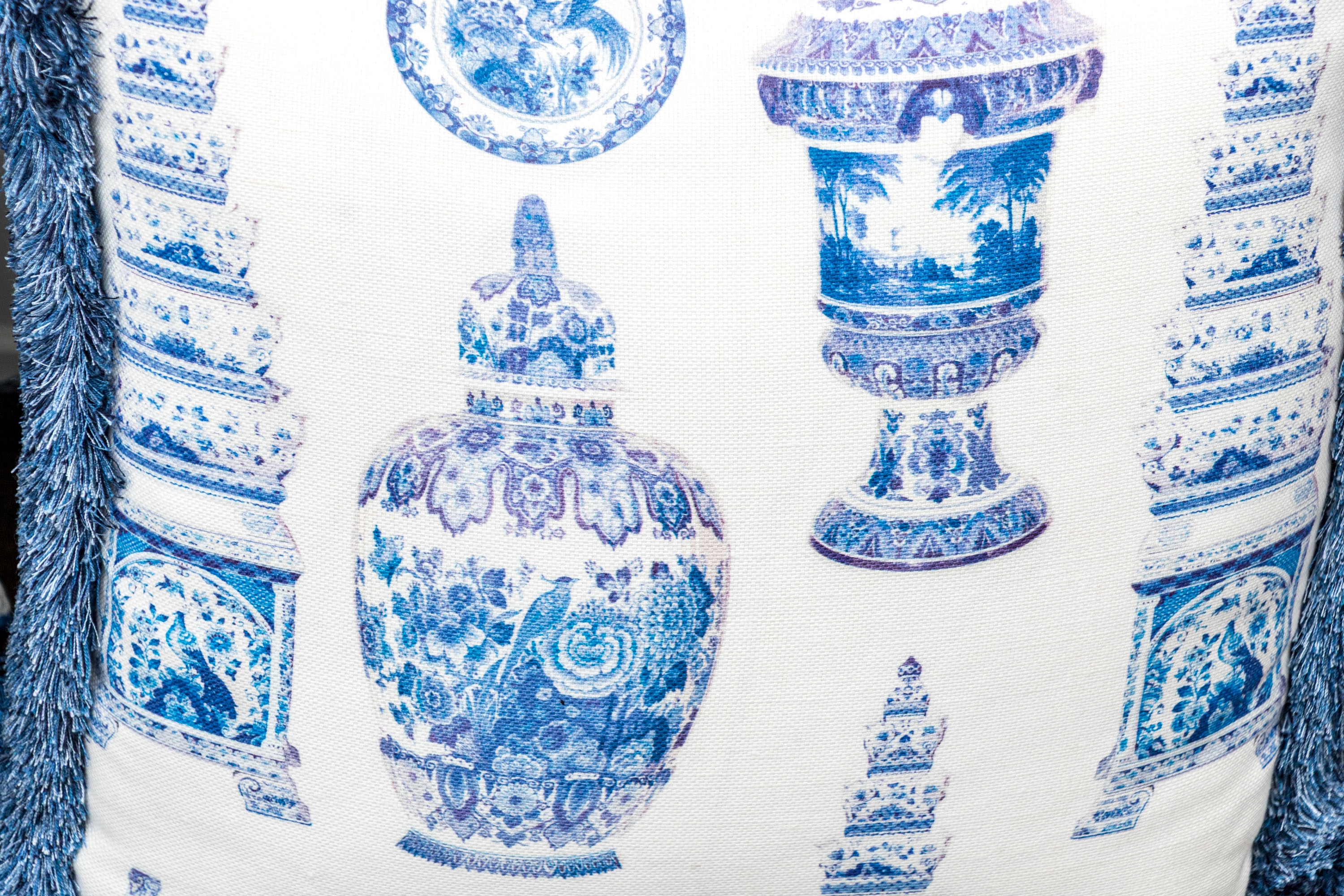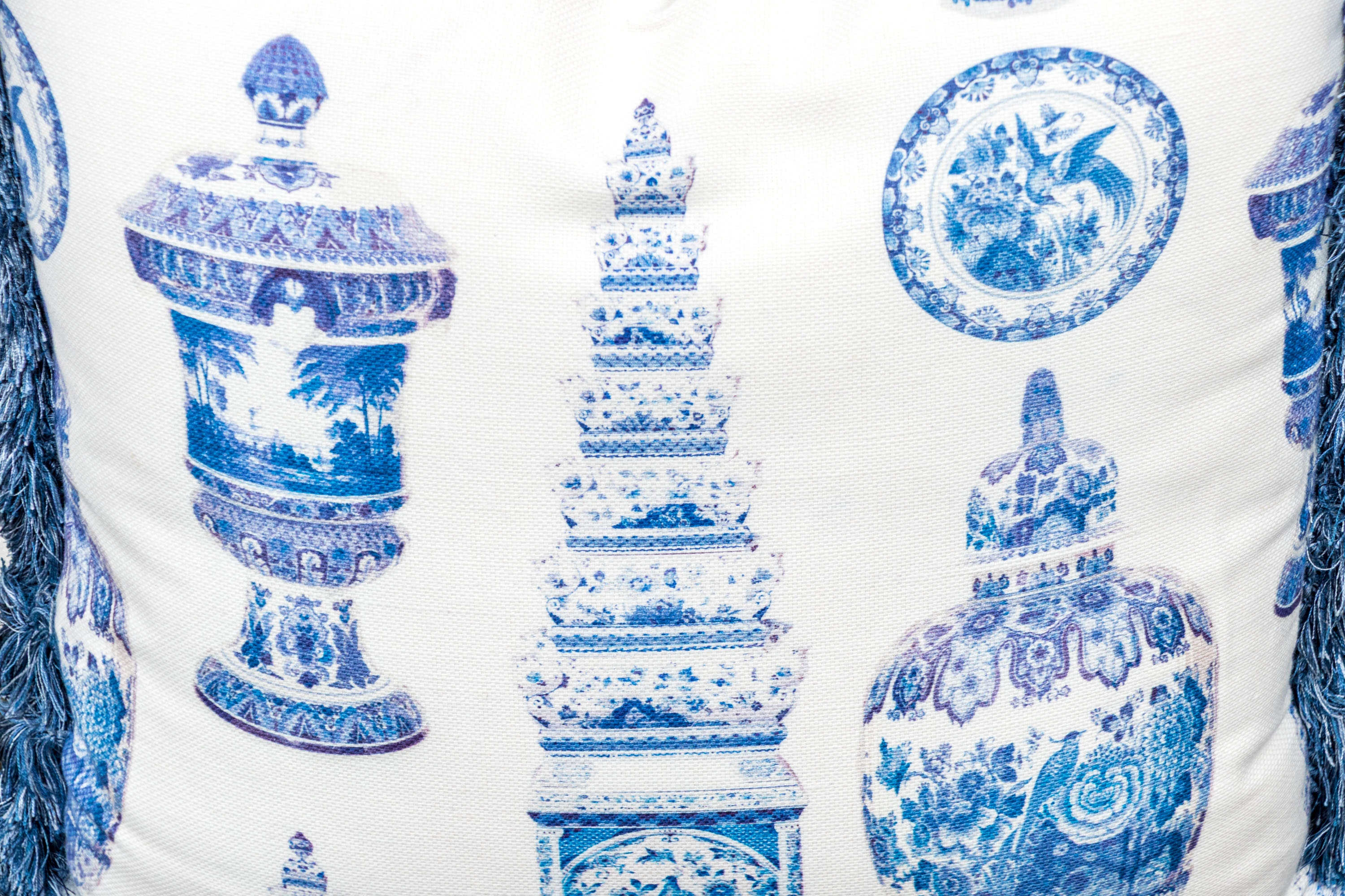 Comprised of two larger and two smaller. All with decoration of Chinese blue and white porcelain motifs against the white grounds. Smaller pillows with fringe around all four sides, the larger with tassels to the corners.