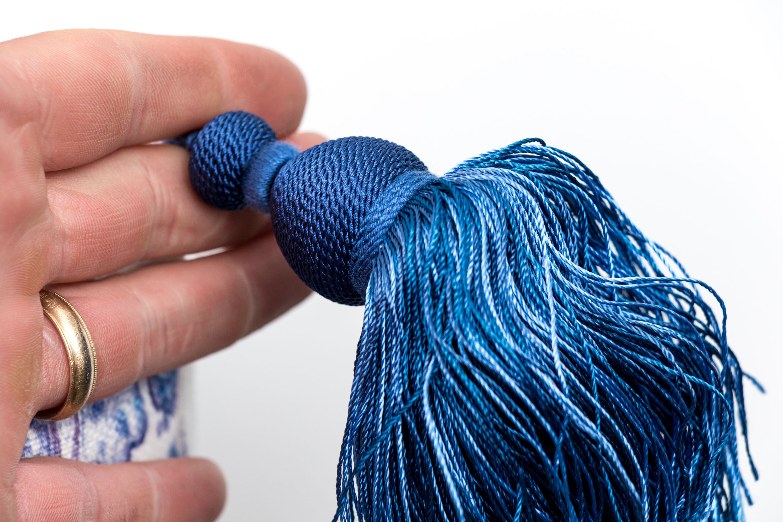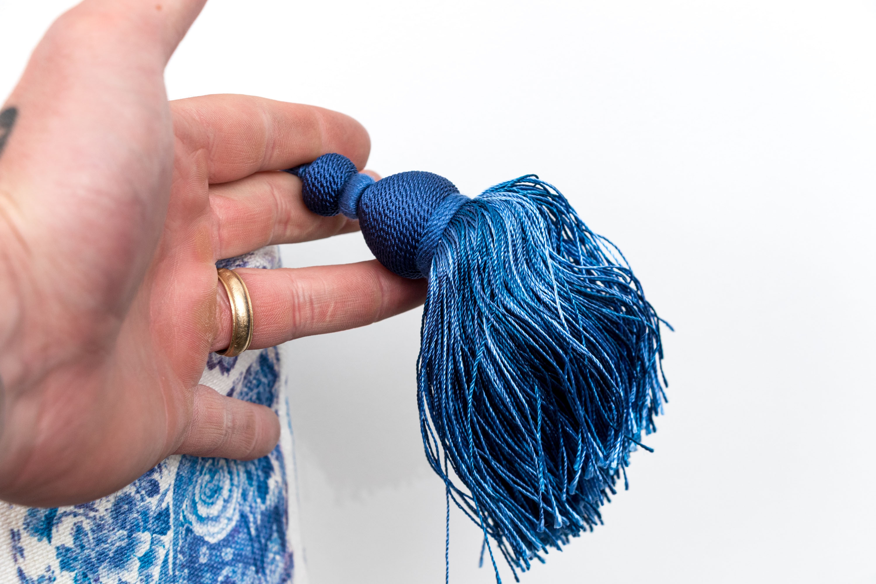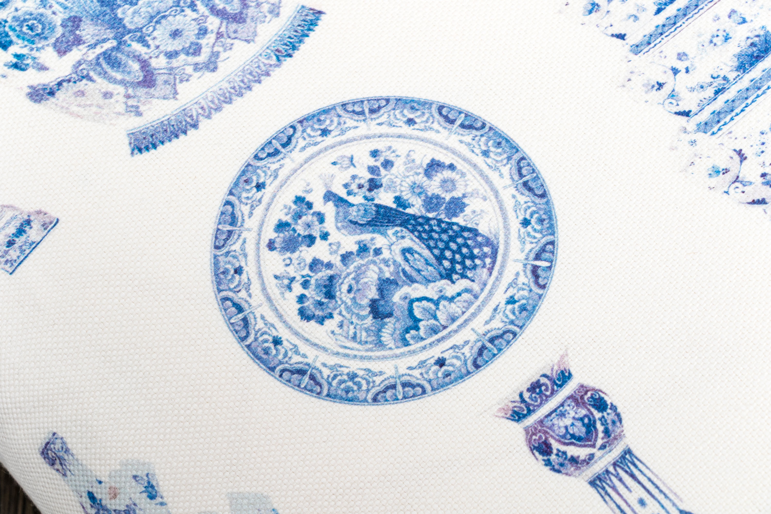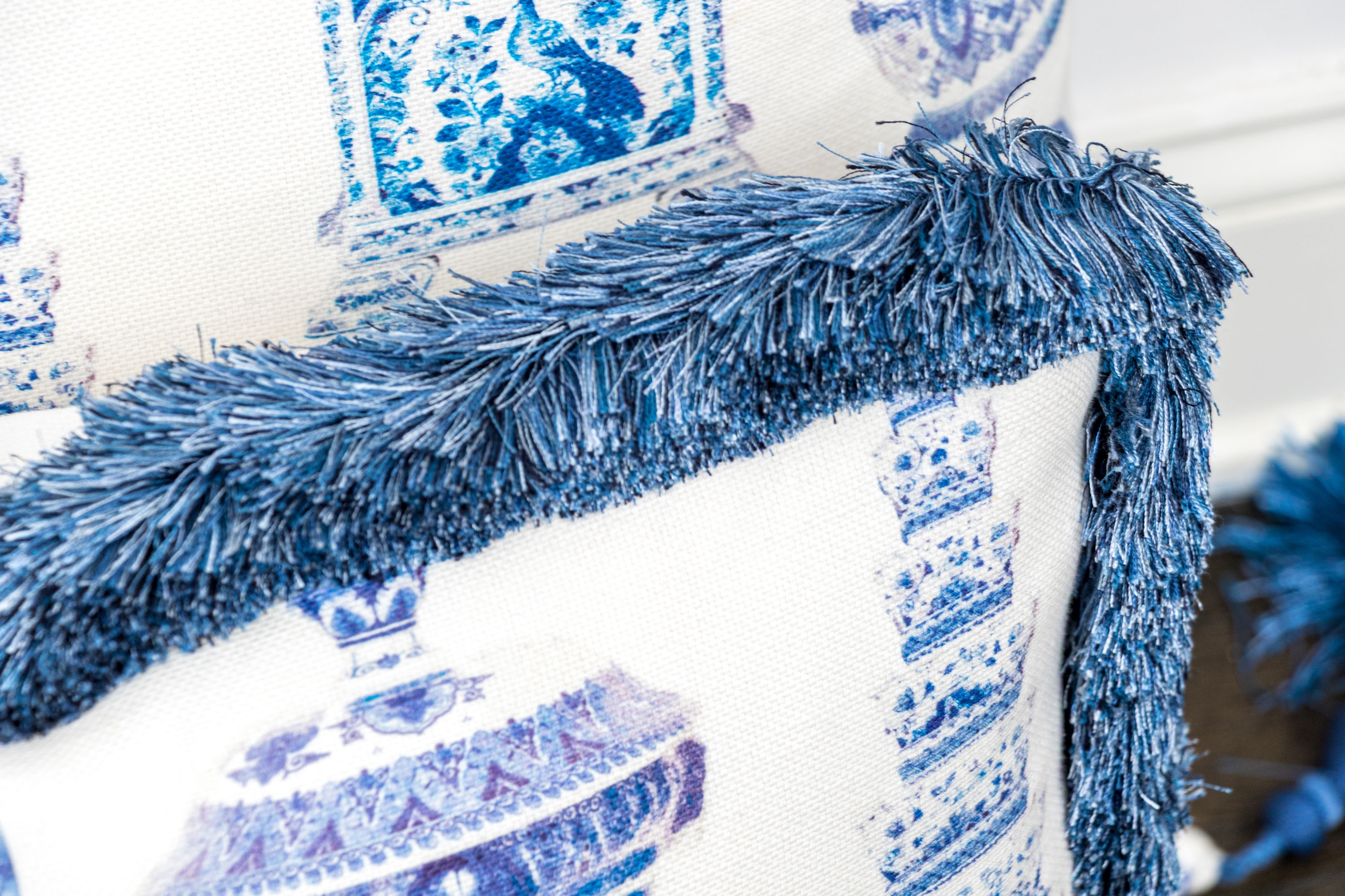 Comprised of two larger and two smaller. All with decoration of Chinese blue and white porcelain motifs against the white grounds. Smaller pillows with fringe around all four sides, the larger with tassels to the corners.