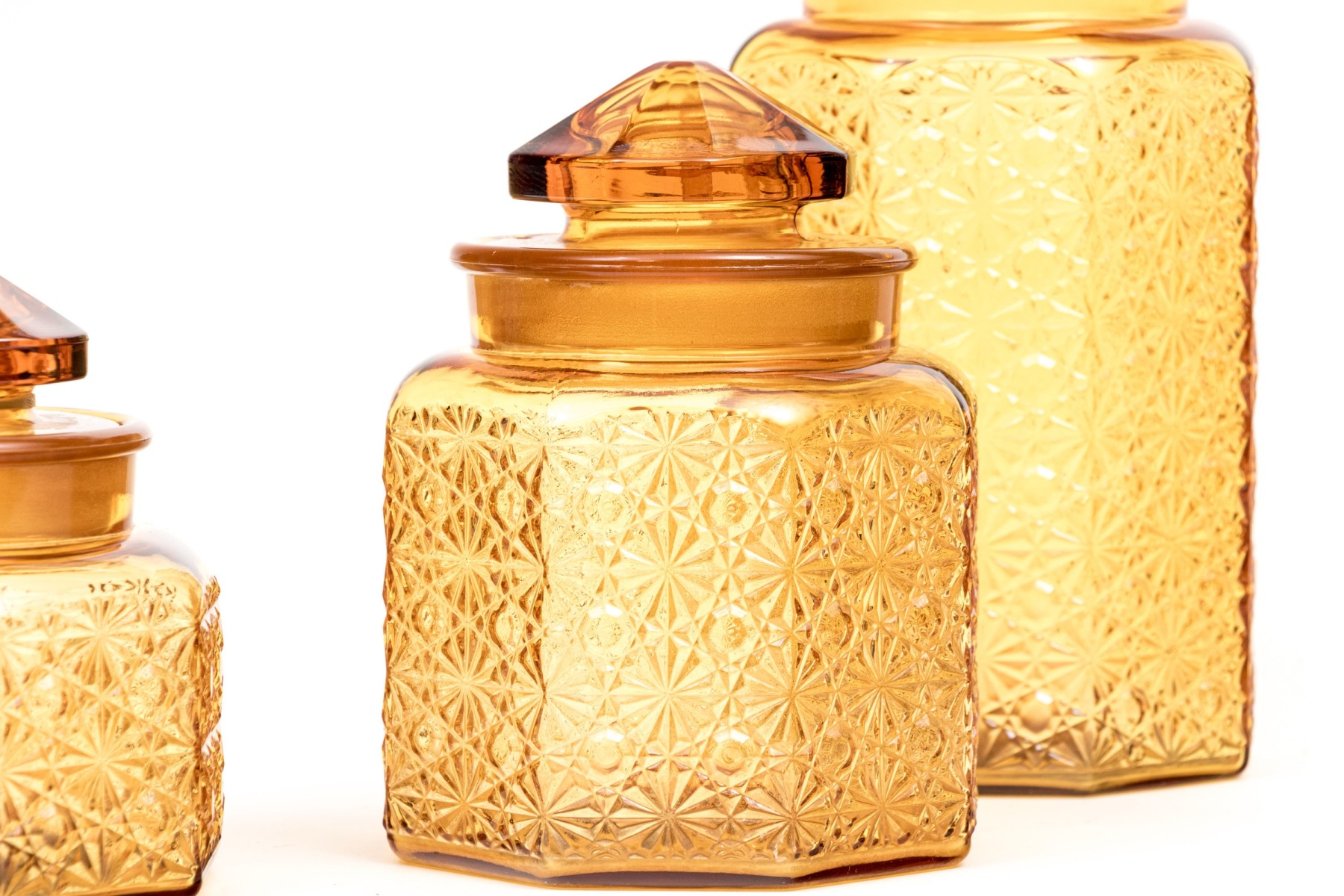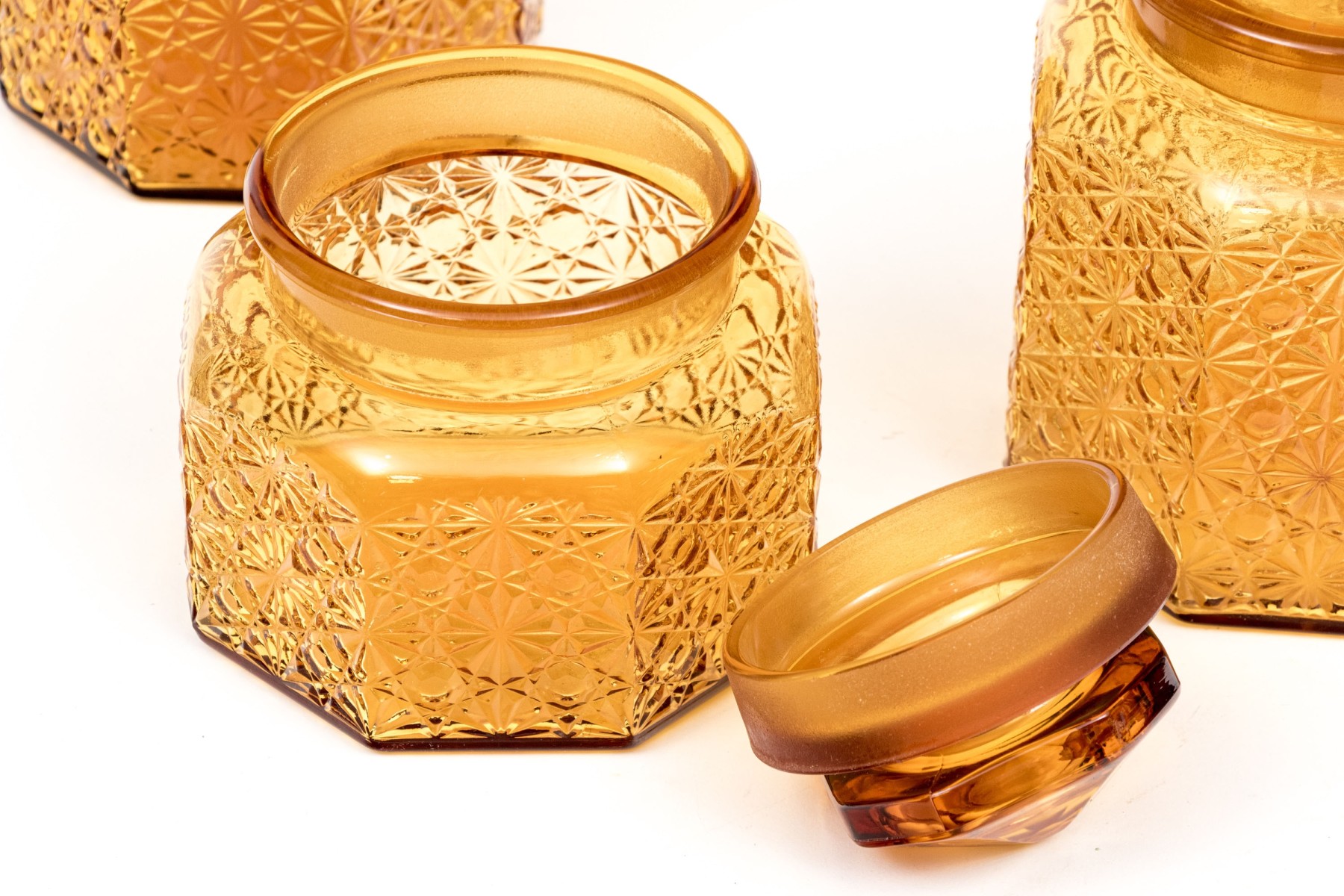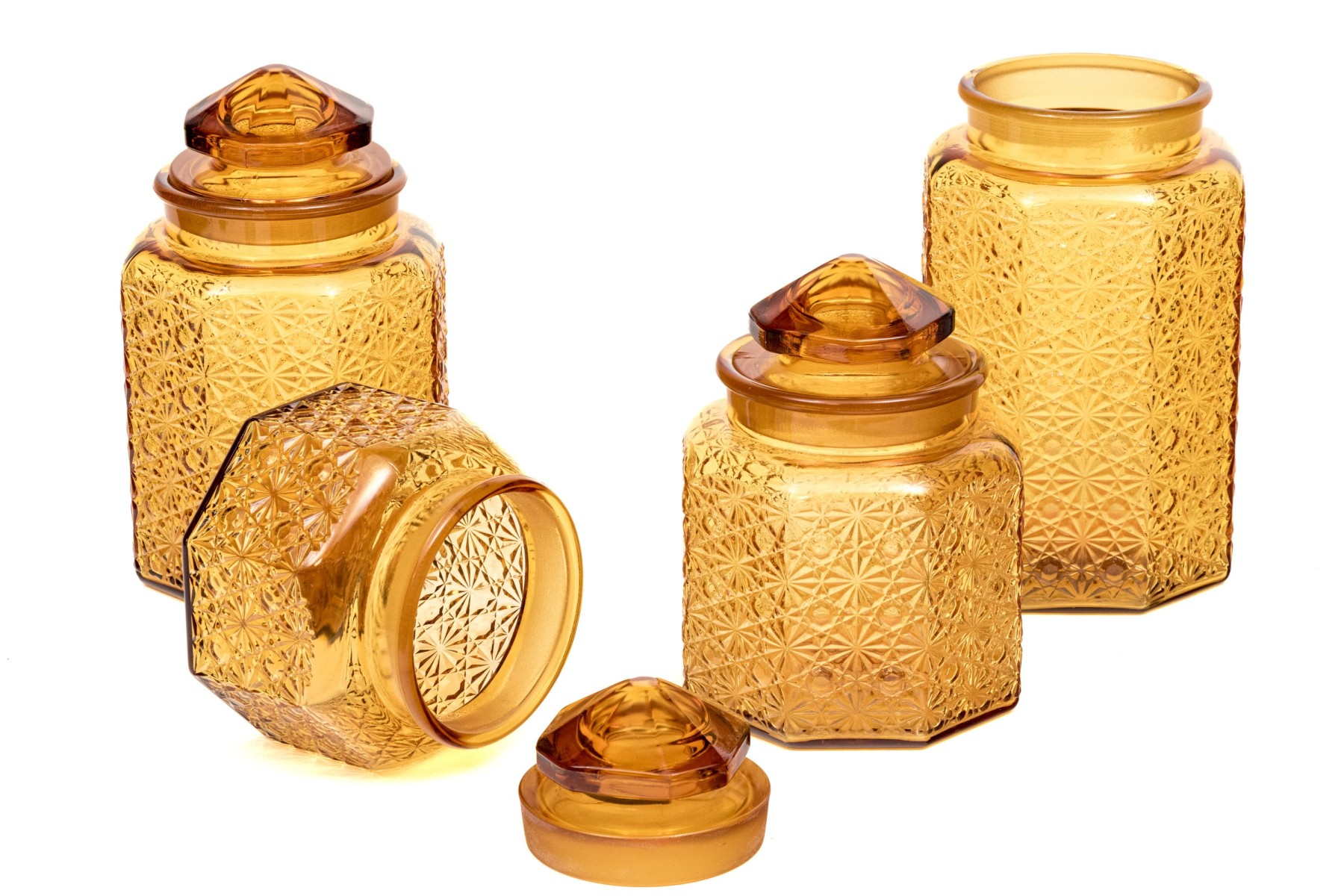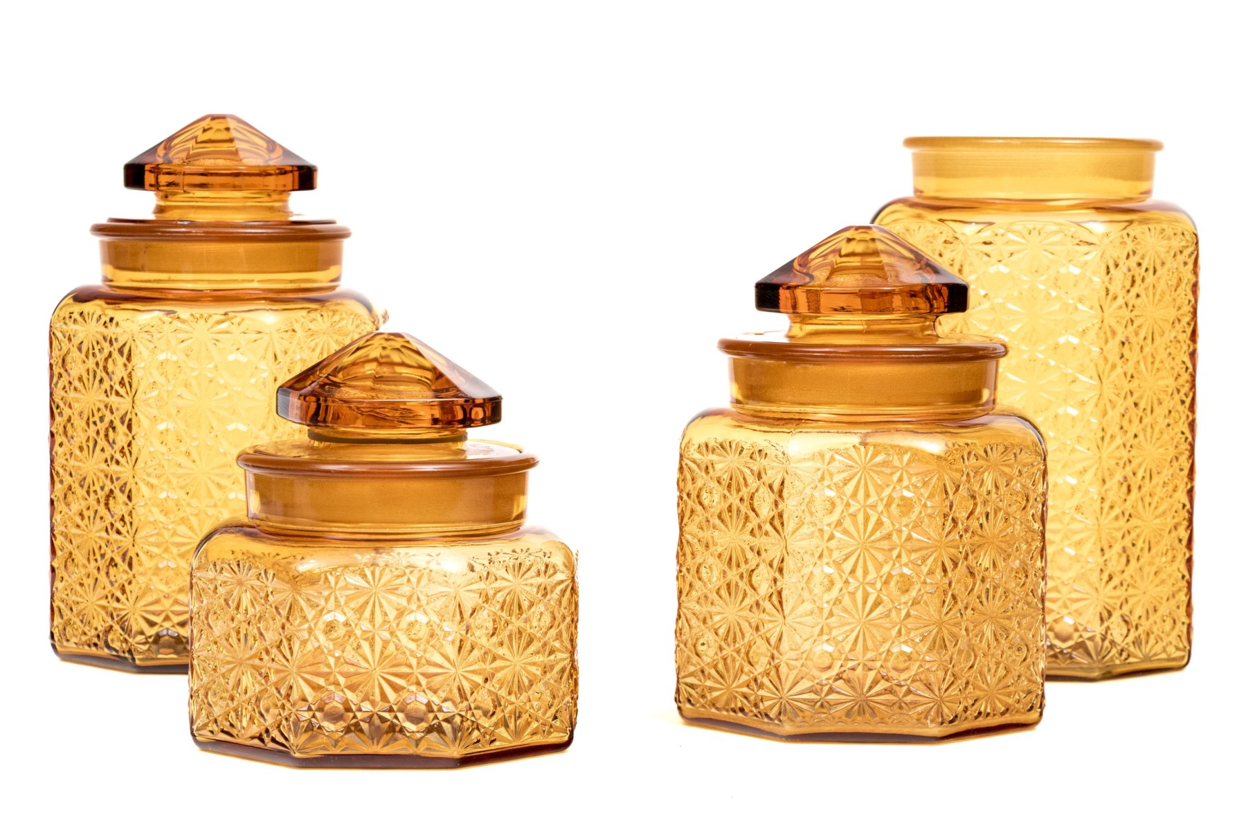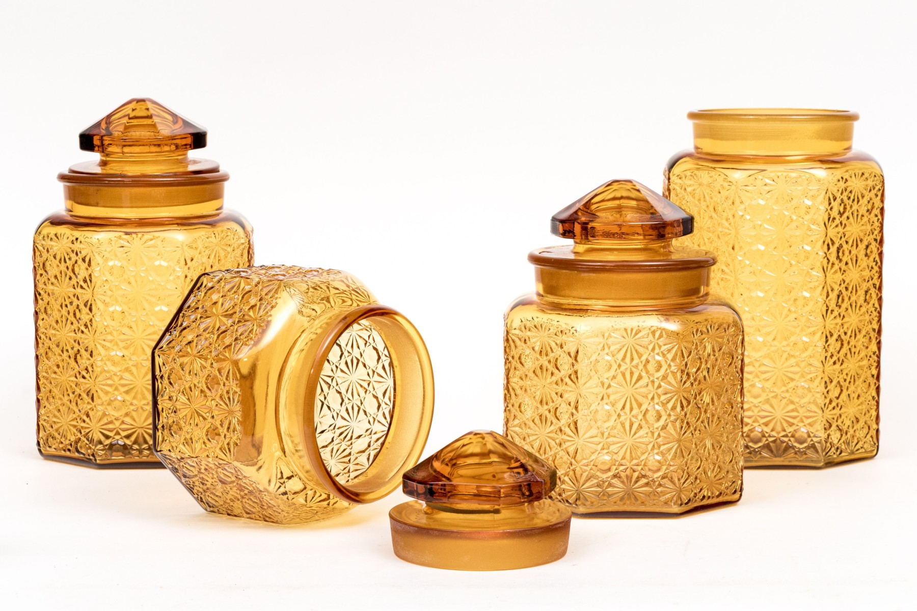 A fabulous collection of four octagonal amber glass jars, three with lids. Lids feature octagonal pyramidal finials fitting into wide cylindrical necks. Bodies are beautifully textured with daisy and button motifs.