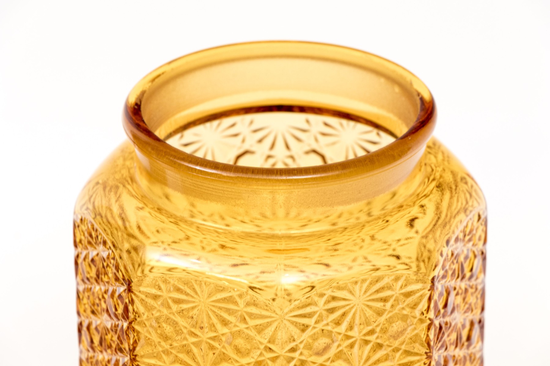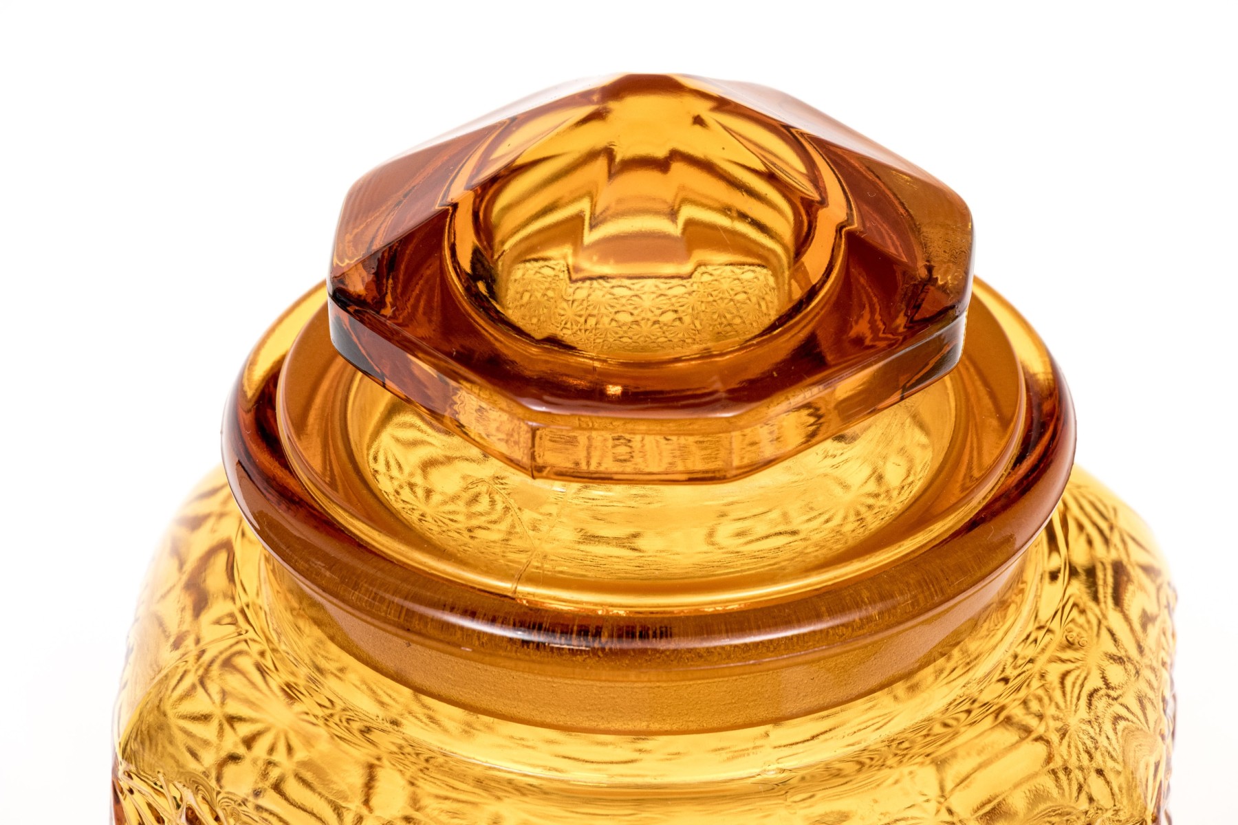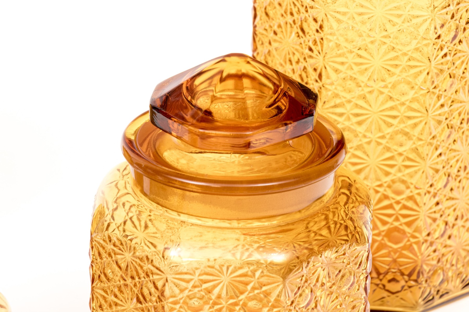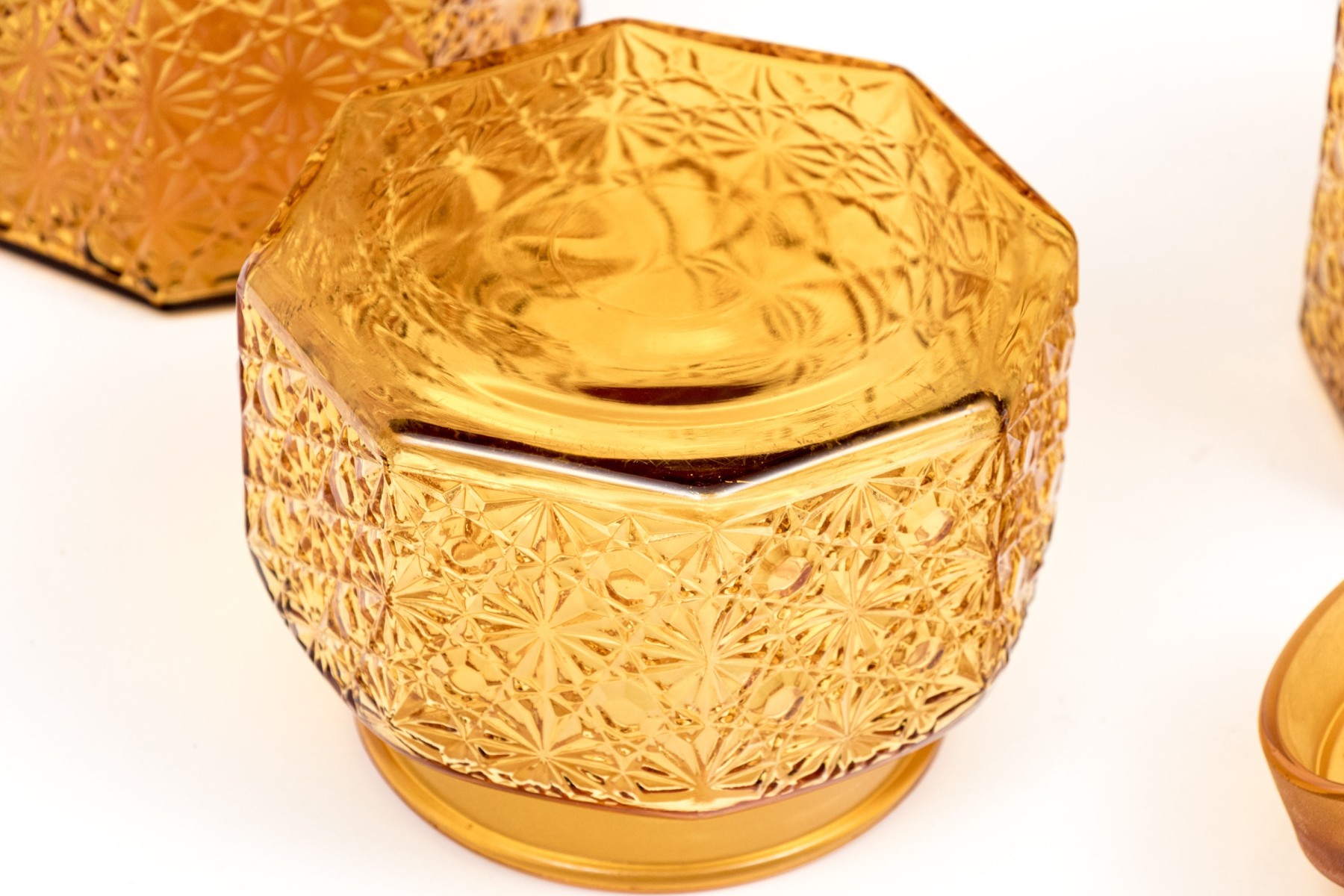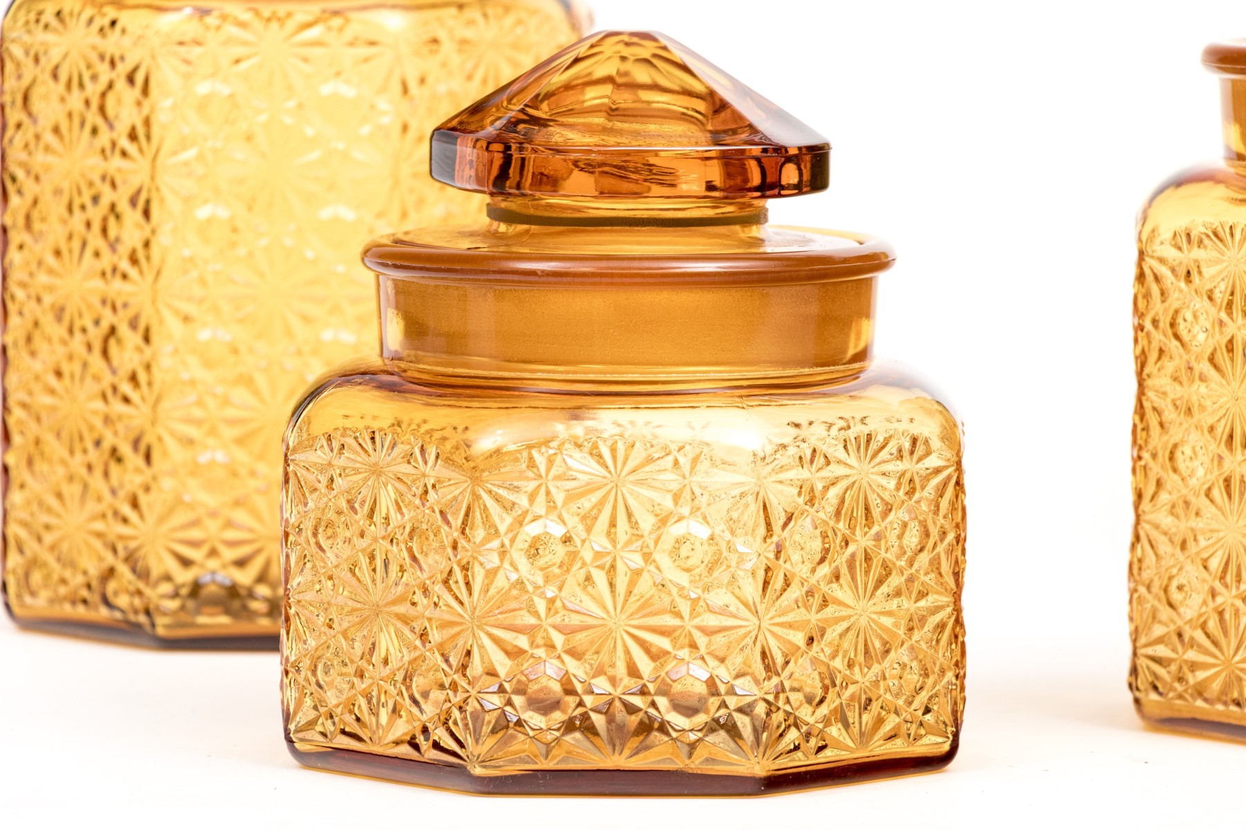 A fabulous collection of four octagonal amber glass jars, three with lids. Lids feature octagonal pyramidal finials fitting into wide cylindrical necks. Bodies are beautifully textured with daisy and button motifs.