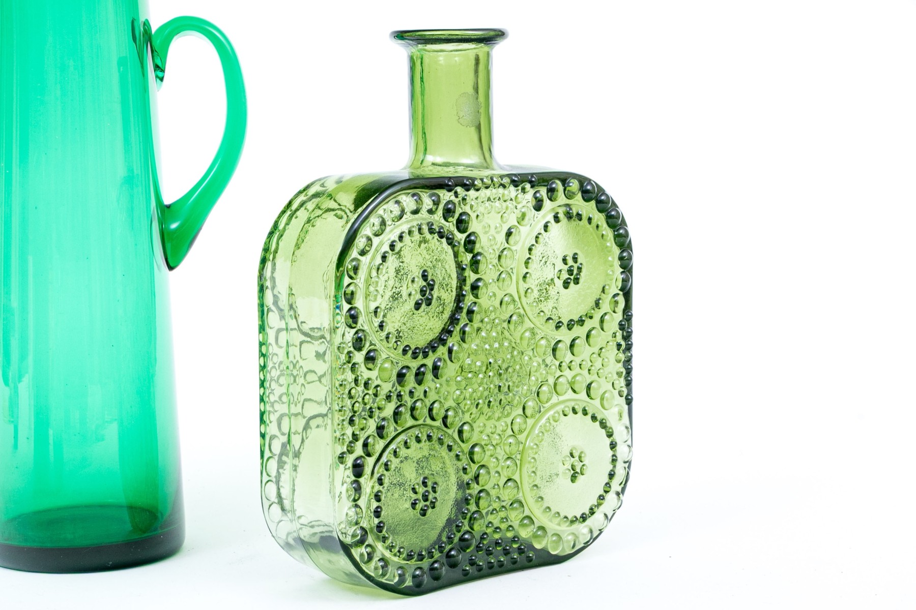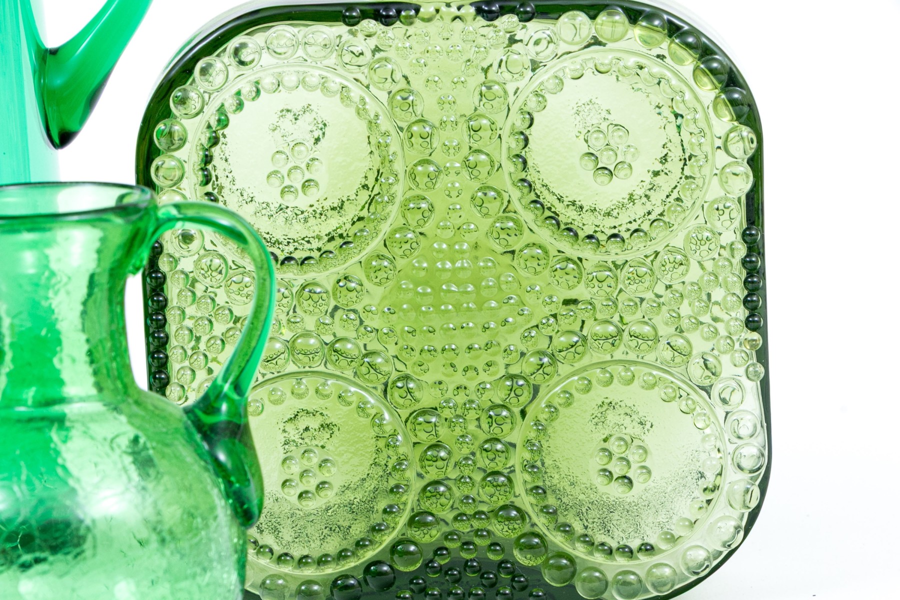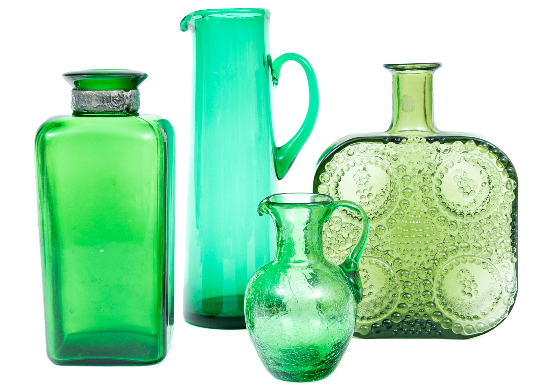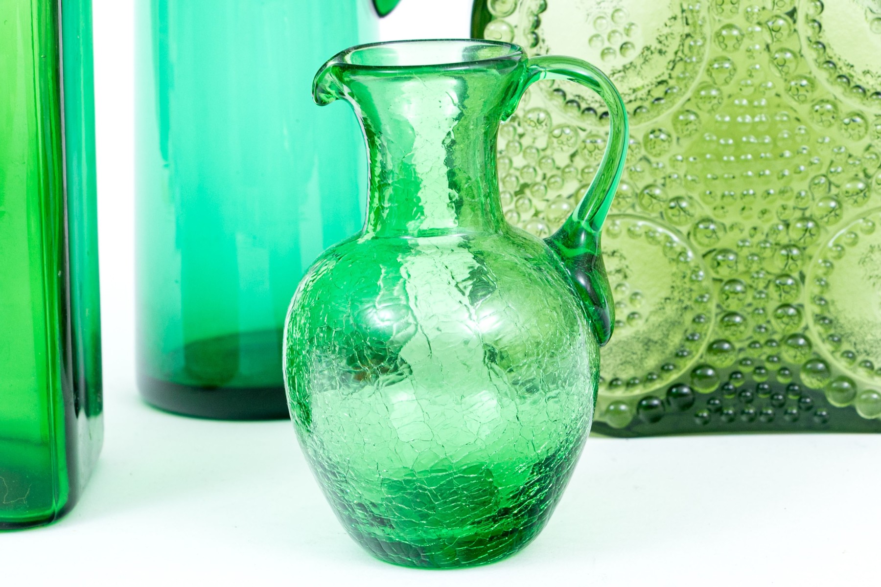 A delightful collection of decorative green glass comprised of bottles, vases and a pitcher.