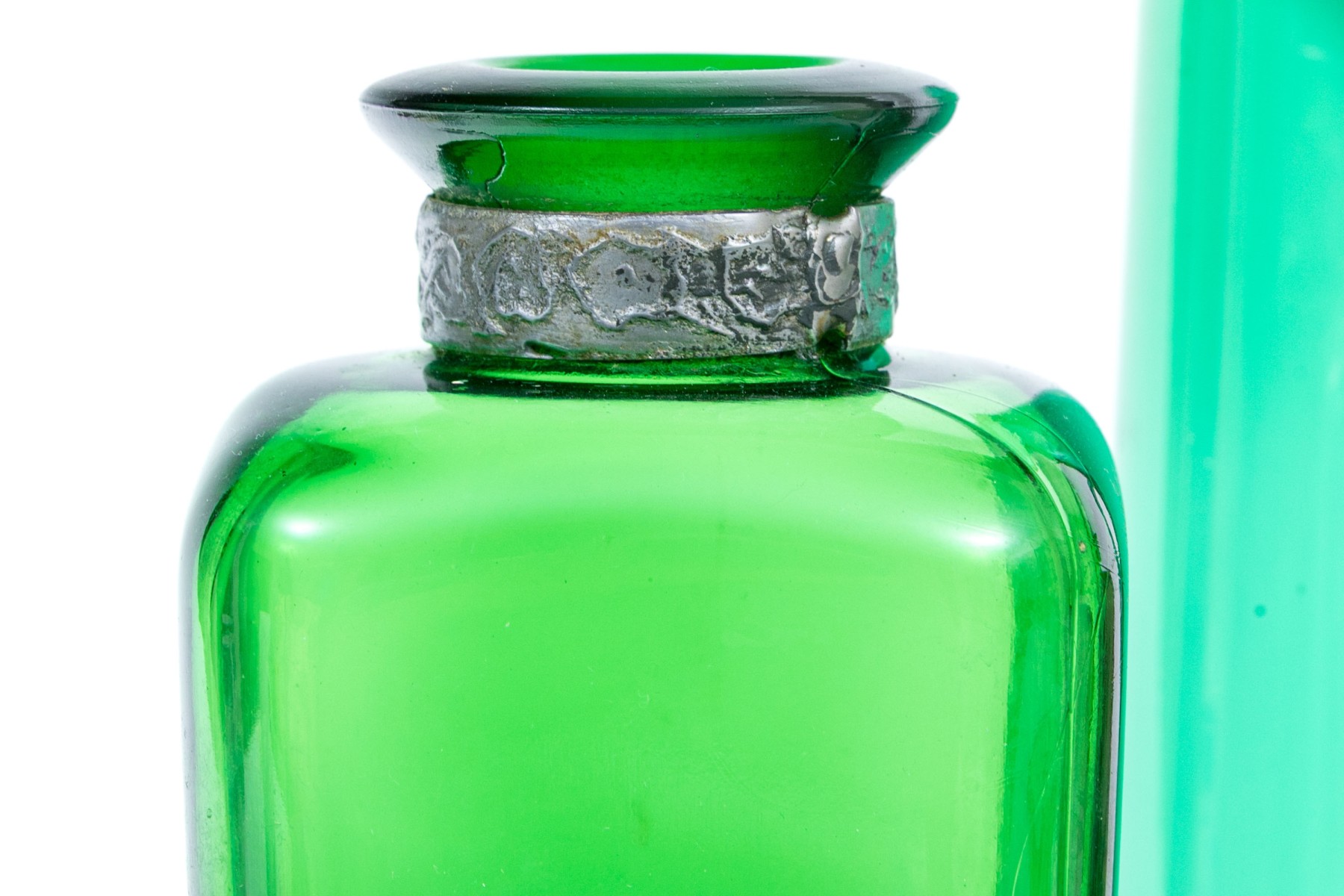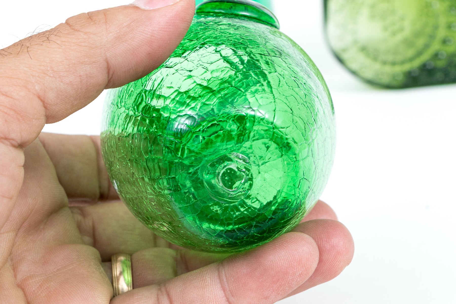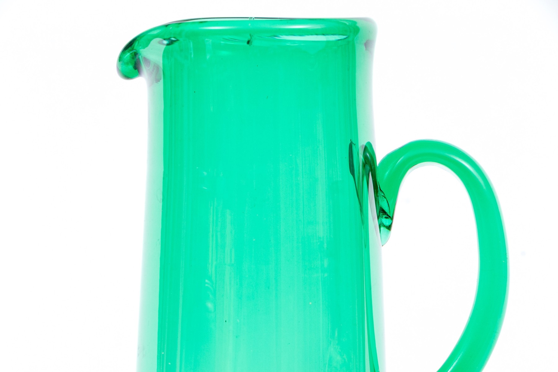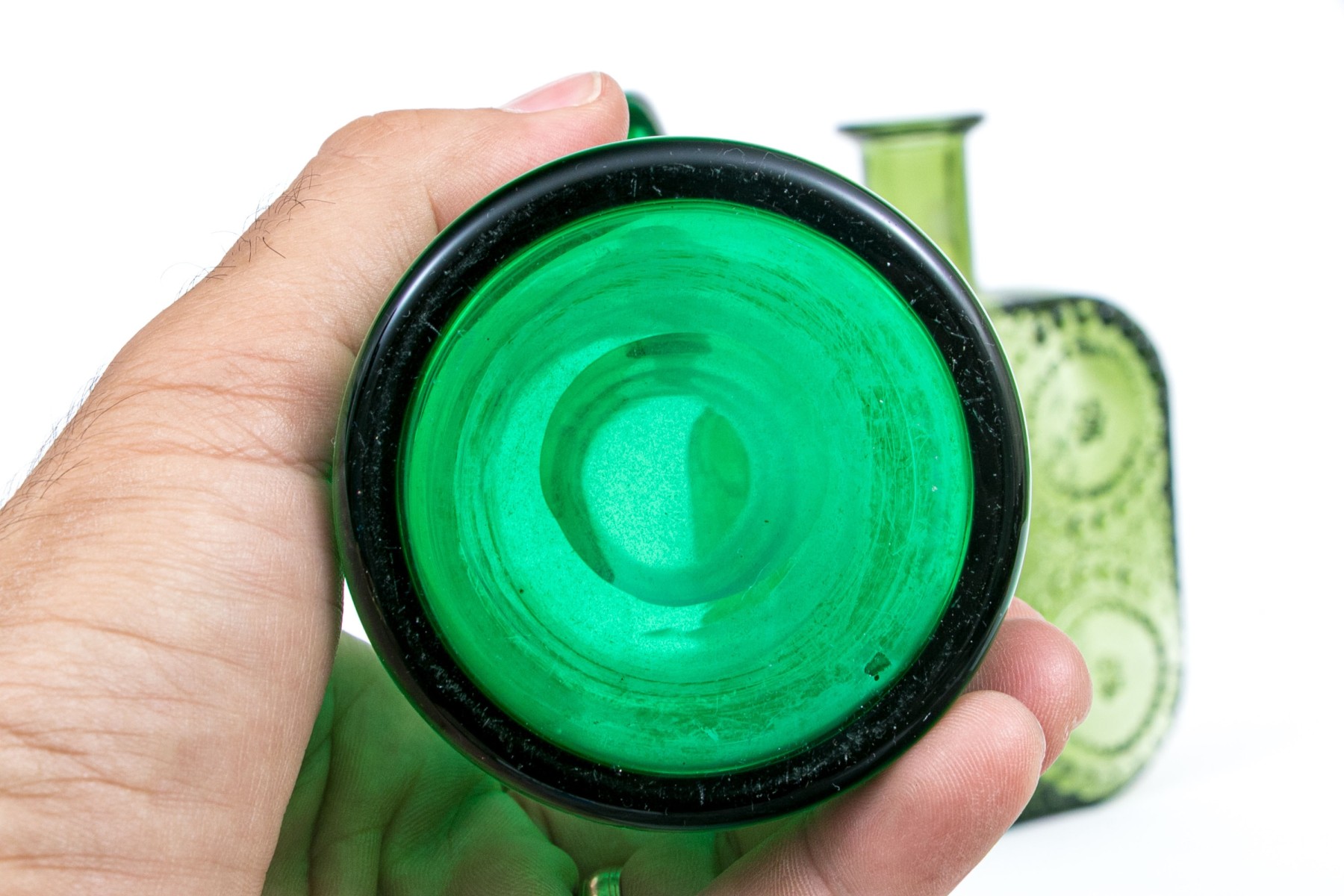 A delightful collection of decorative green glass comprised of bottles, vases and a pitcher.