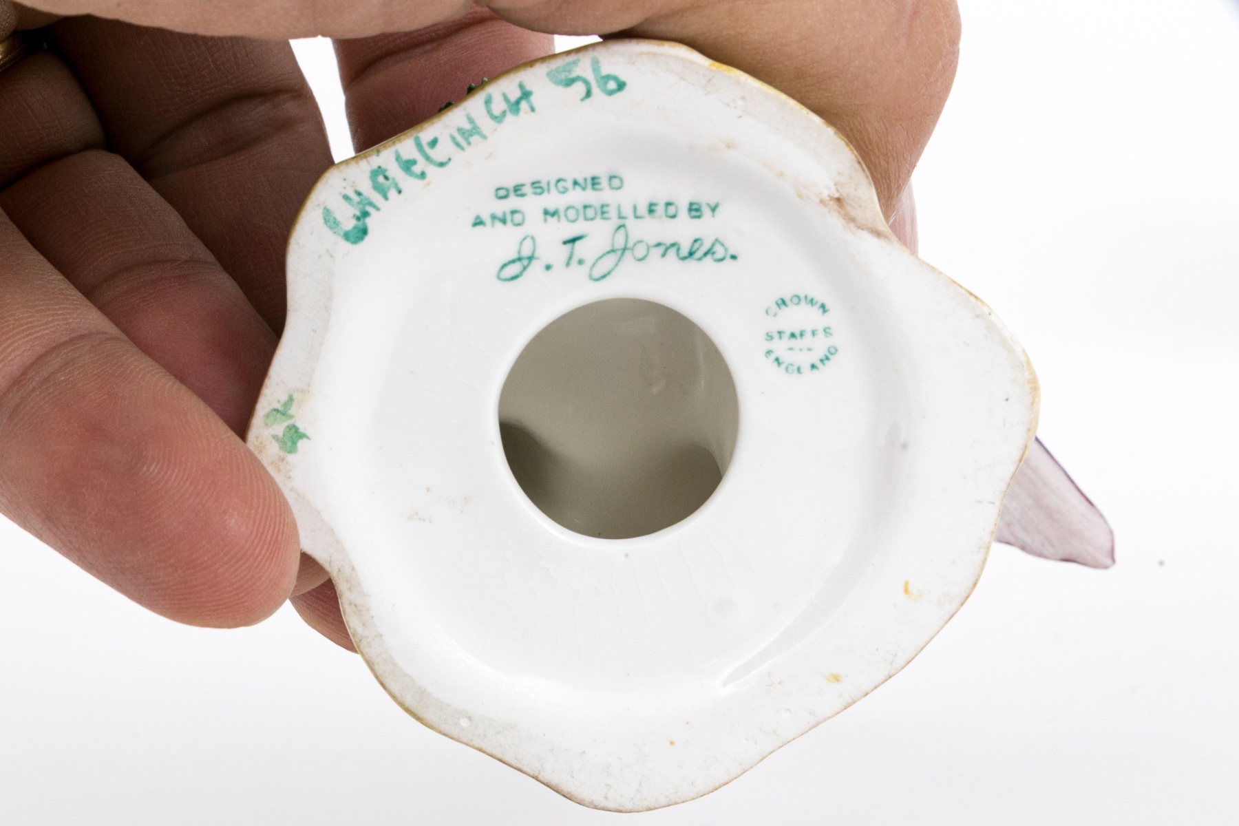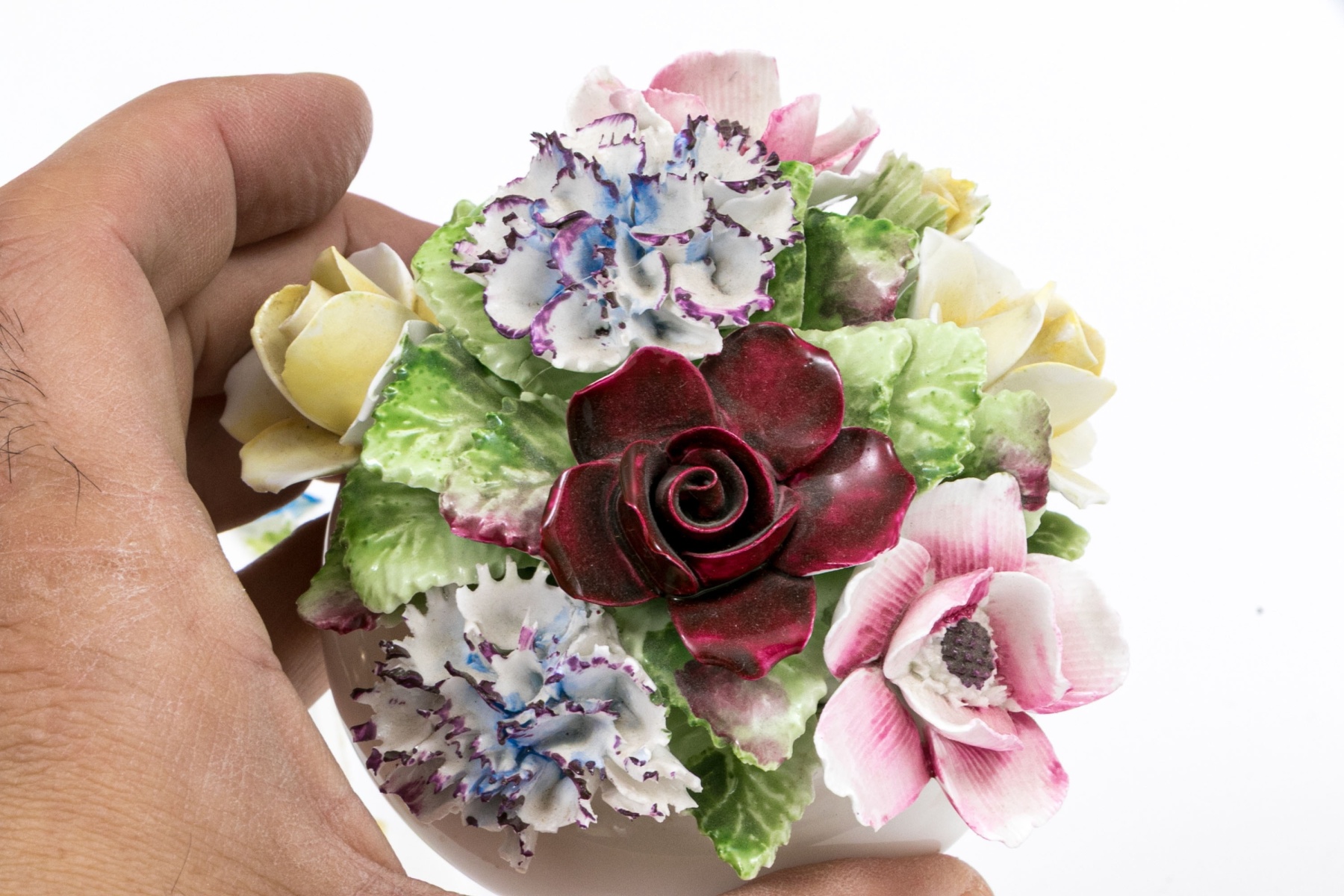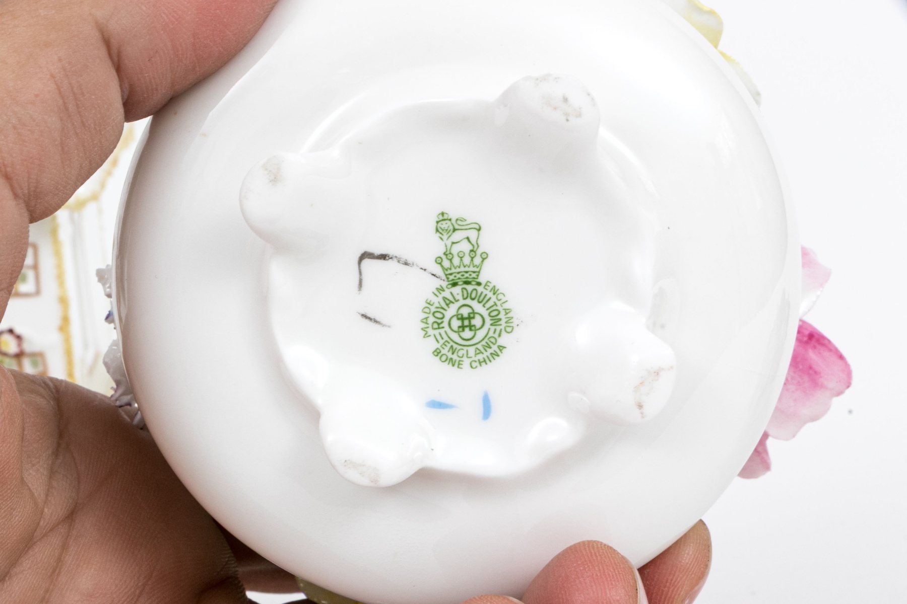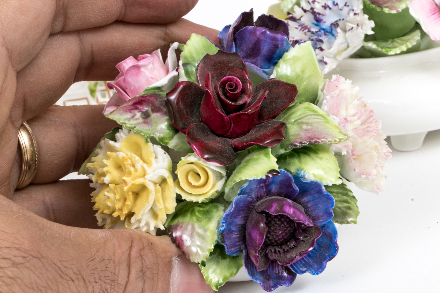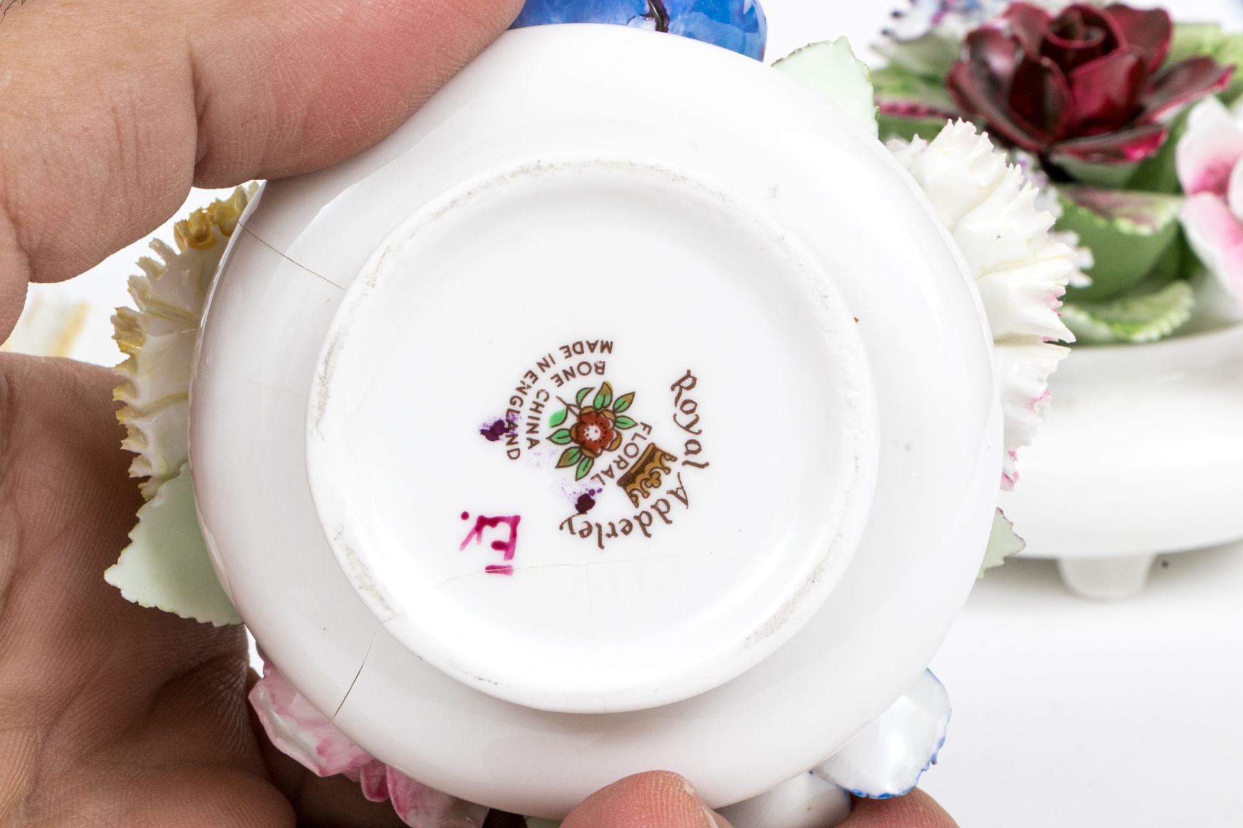 he Royal Adderley floral bouquet in vase has cracks to the vase form base. Minute nics and wear to the finely potted flowers. Despite wear each still presents beautifully.