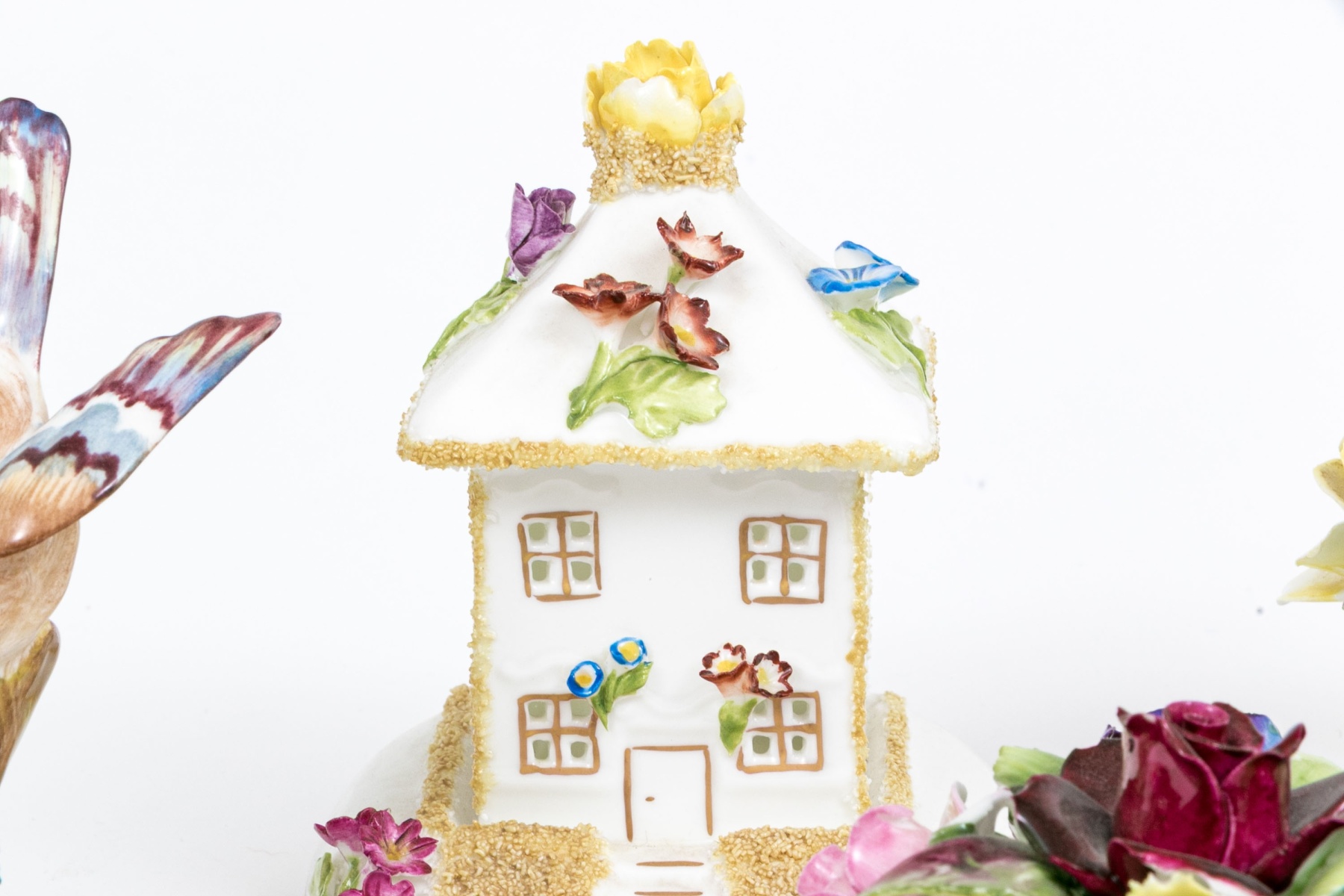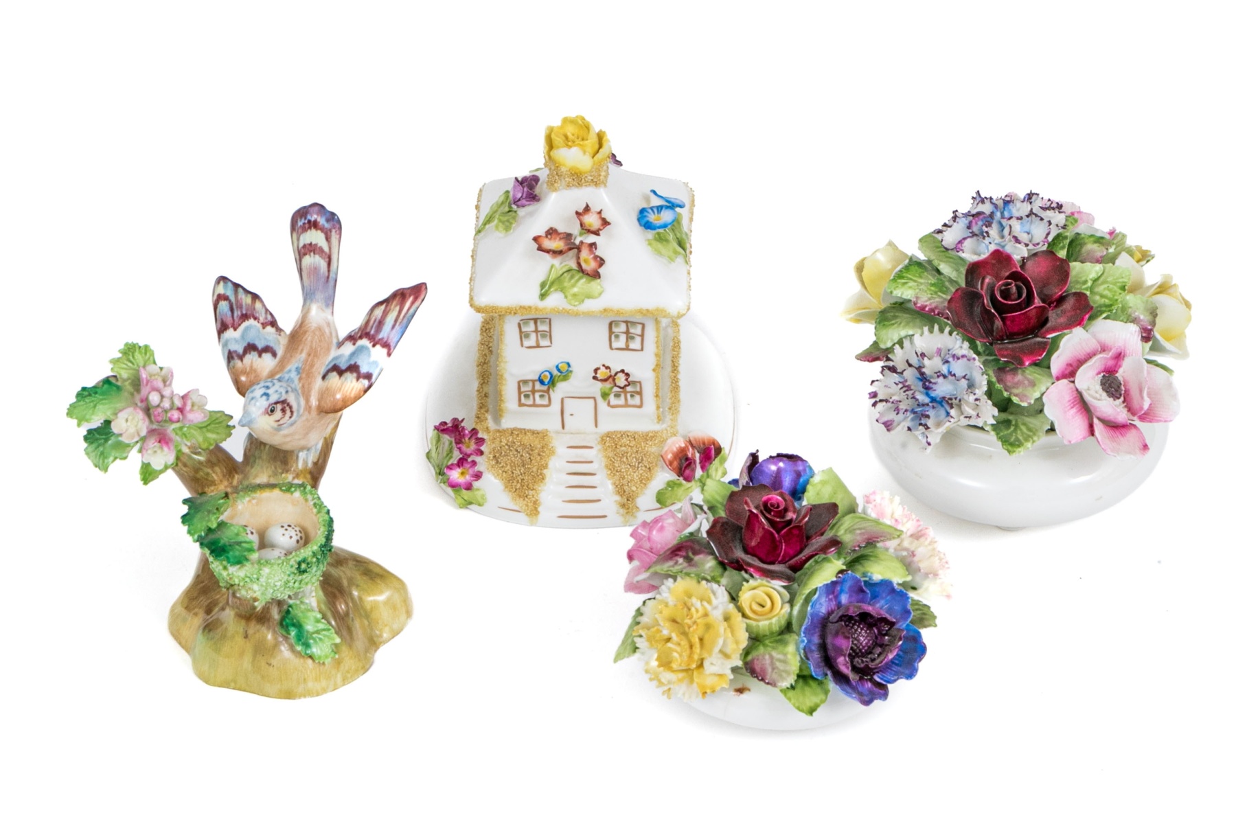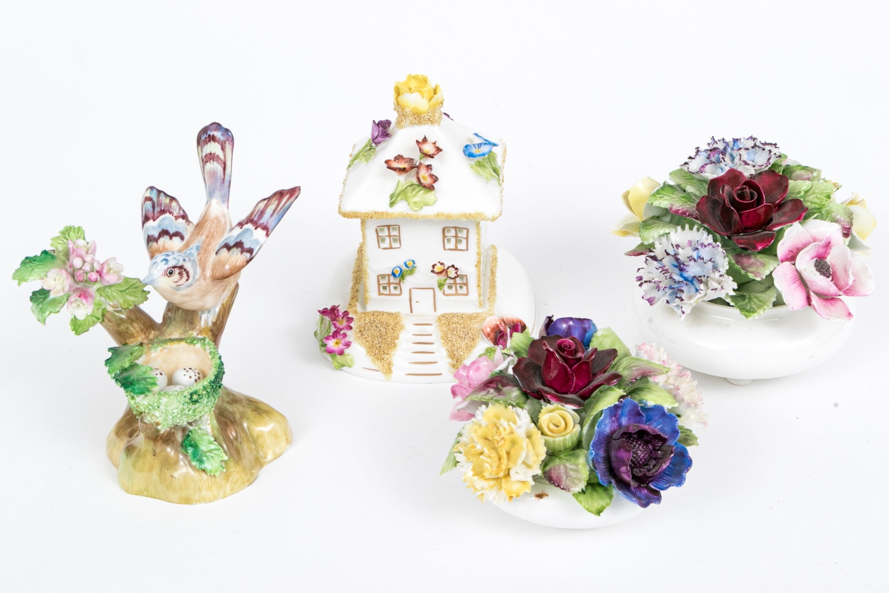 A fabulous group of four English ceramic fairings including Coalport, Royal Doulton, Royal Adderley, Crown Staffordshire. Pieces include two floral bouquets, a charming cottage, and a bird on branch with nest and foliage. Each marked underfoot.