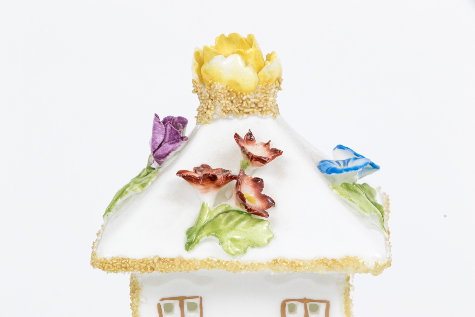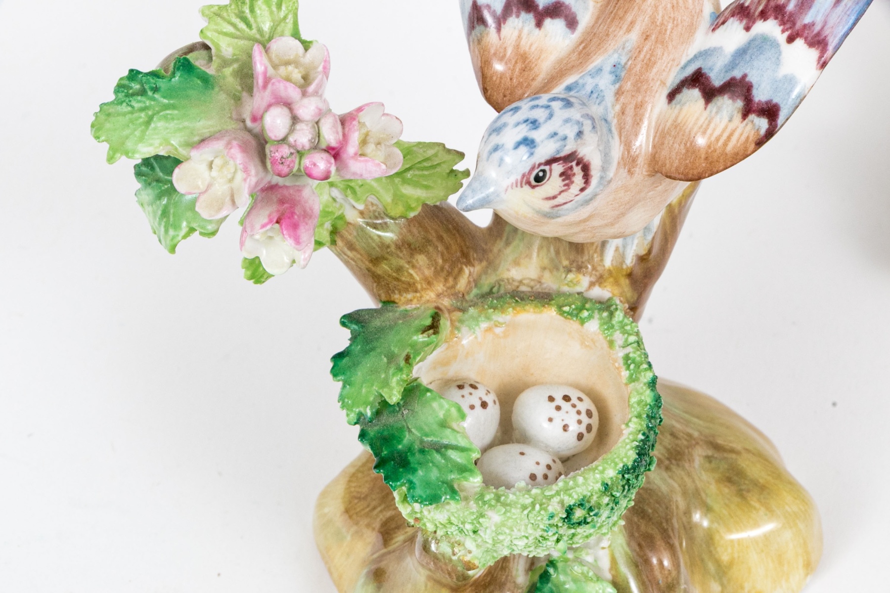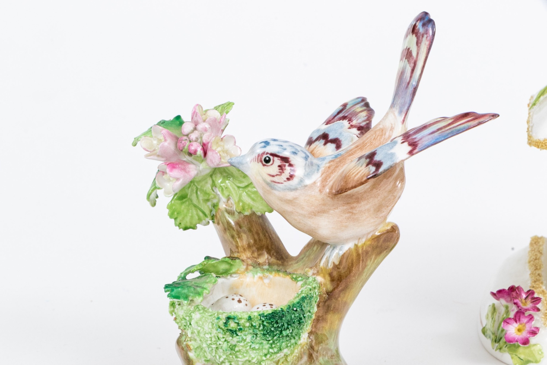 A fabulous group of four English ceramic fairings including Coalport, Royal Doulton, Royal Adderley, Crown Staffordshire. Pieces include two floral bouquets, a charming cottage, and a bird on branch with nest and foliage. Each marked underfoot.