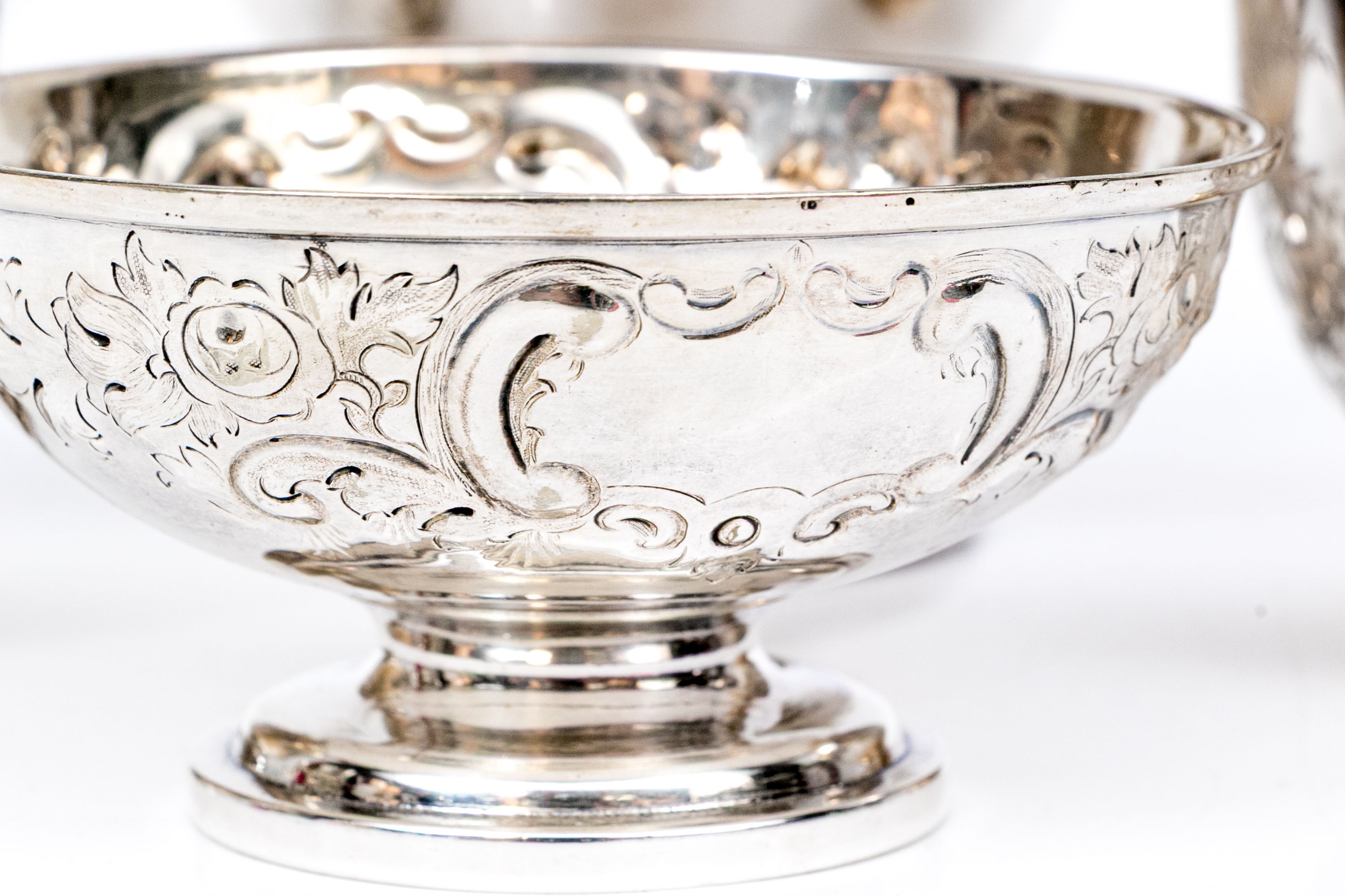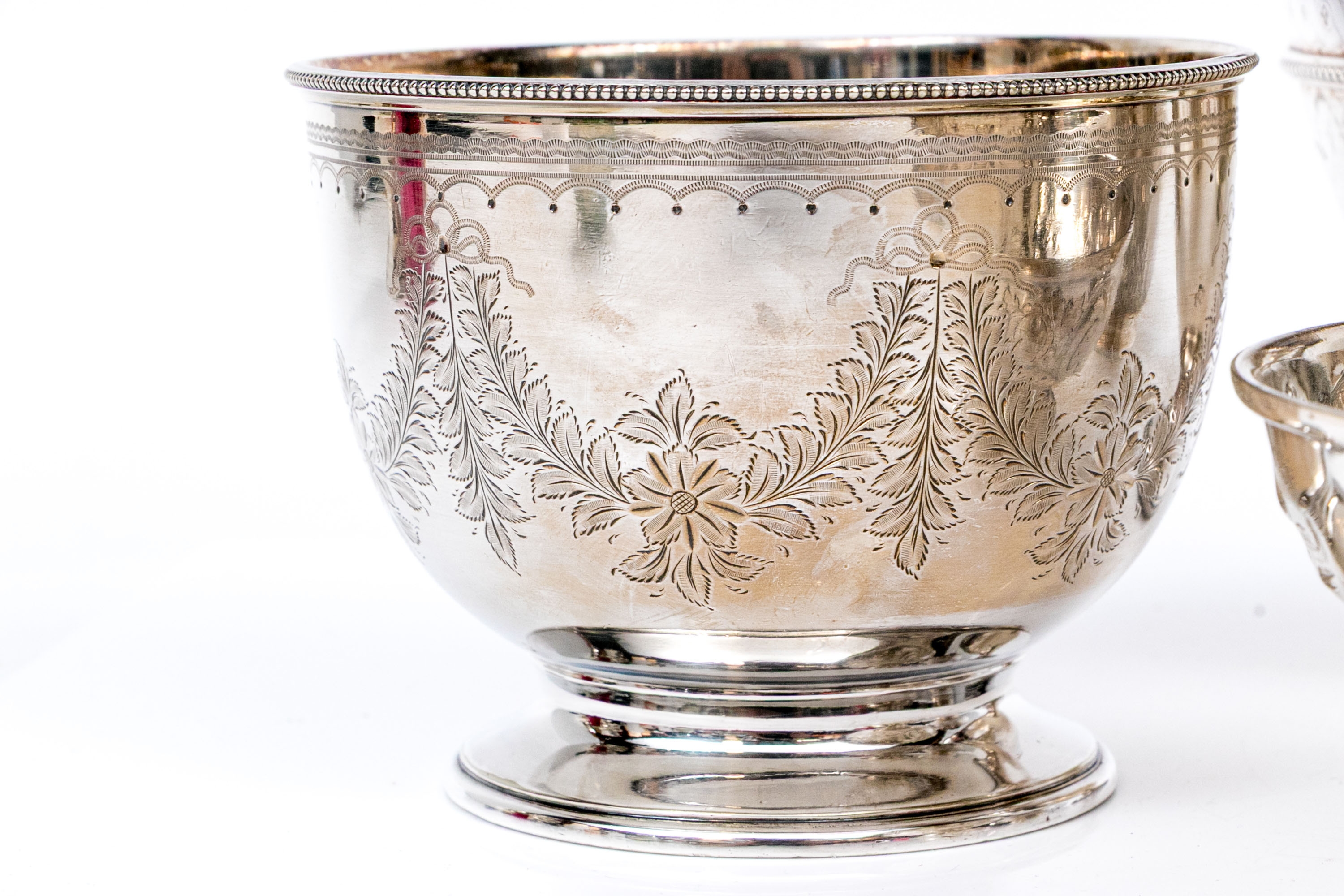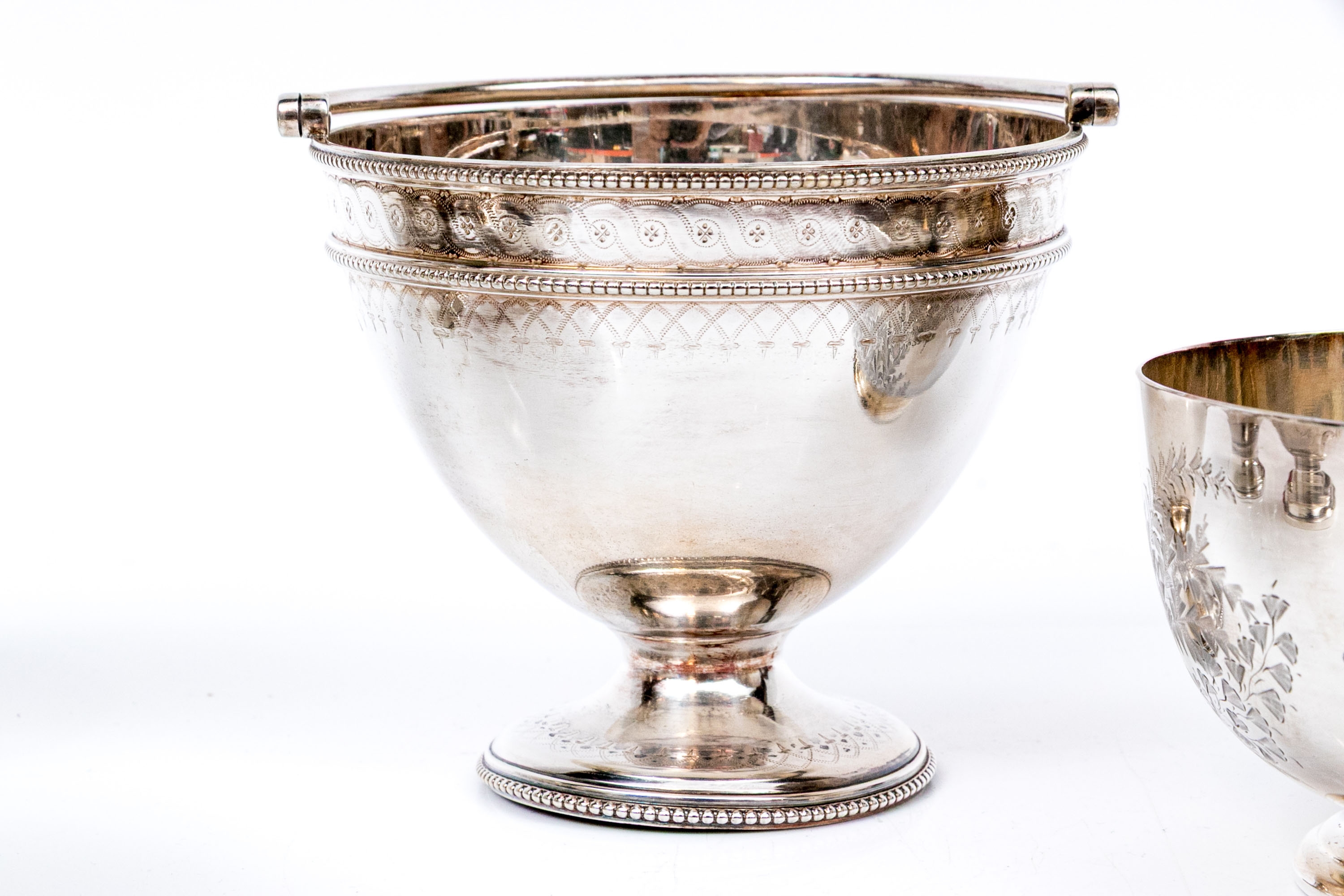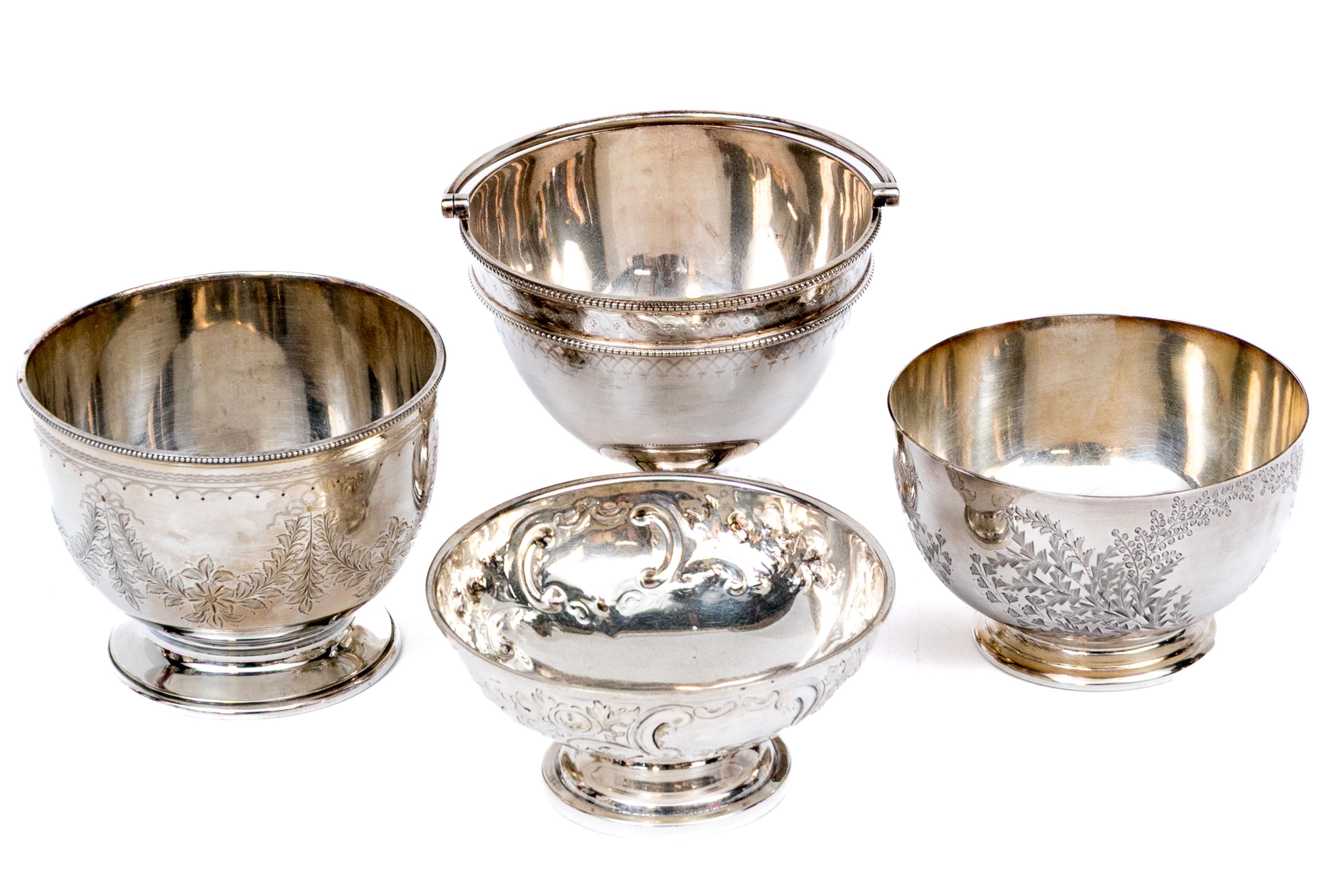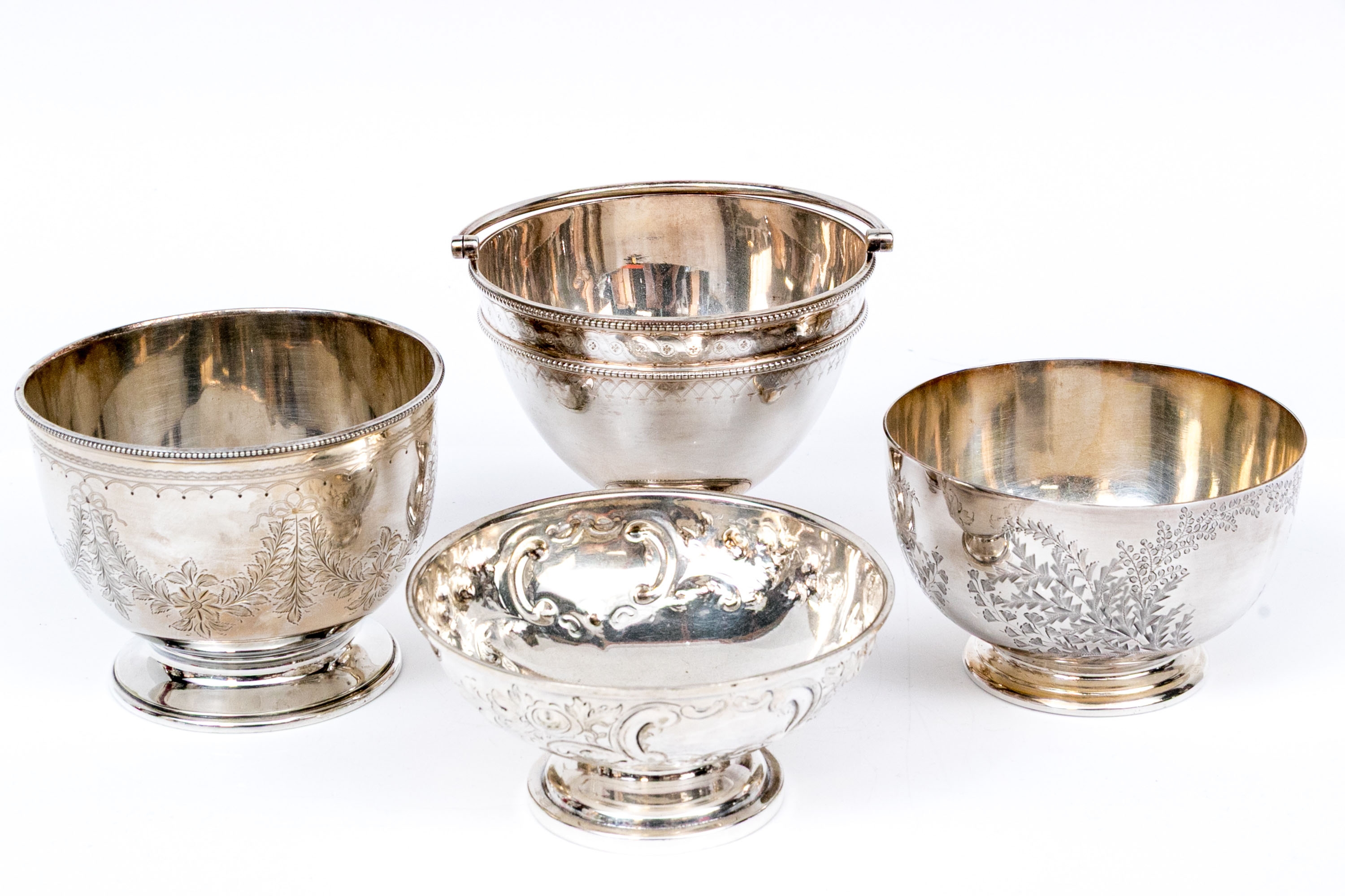 A collection of four silver plated and footed bowls. One with swing handle. Decoration includes repousse, and etched motifs, along with beaded trims.
