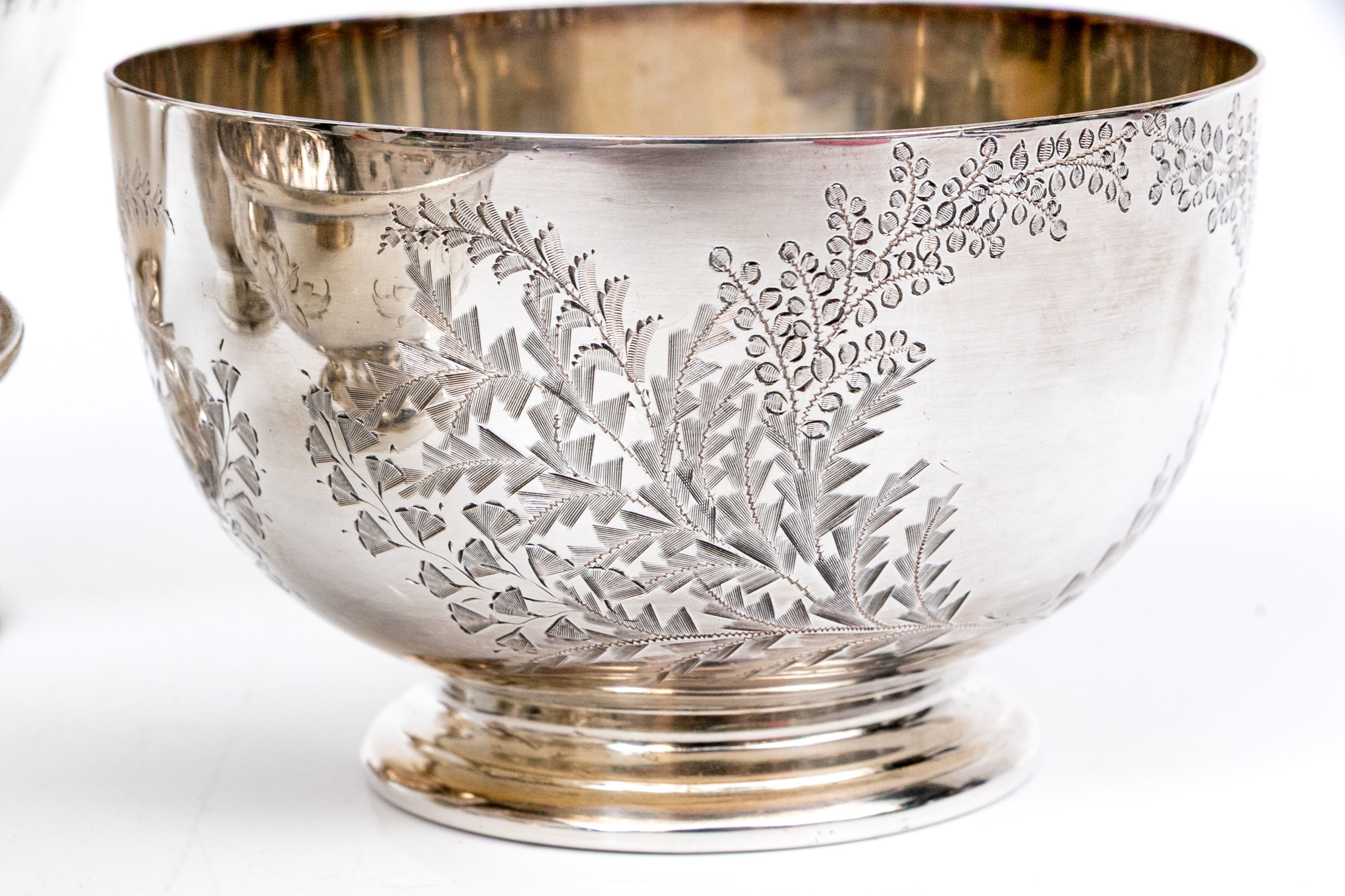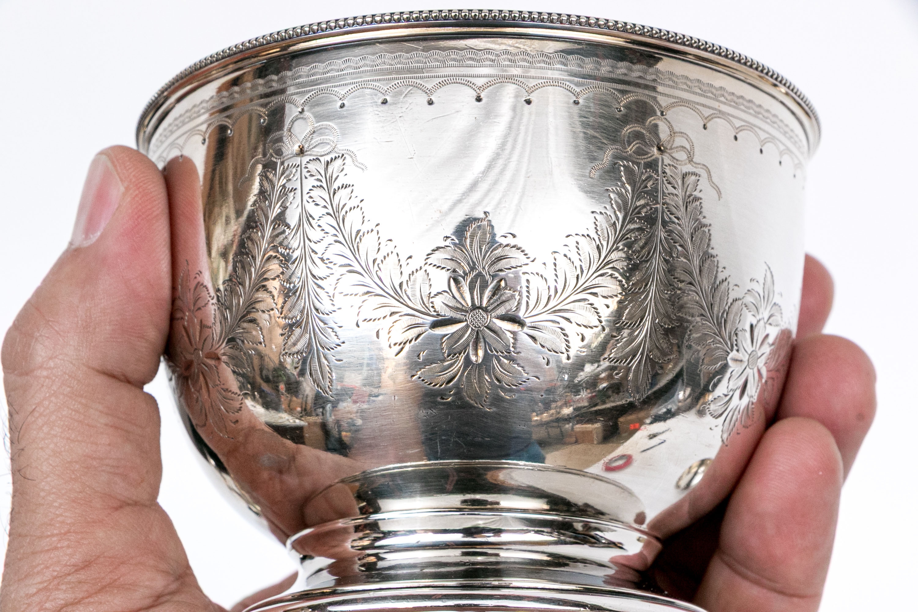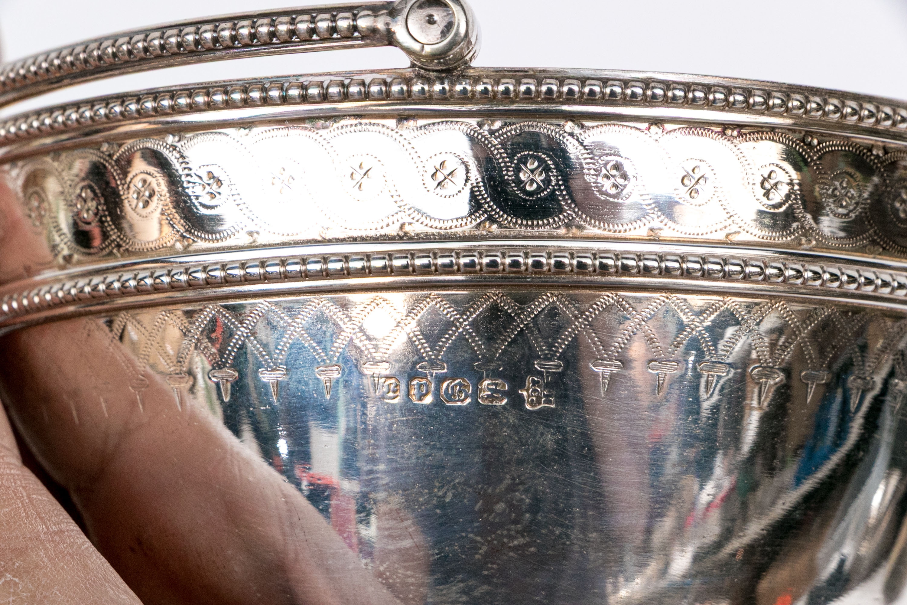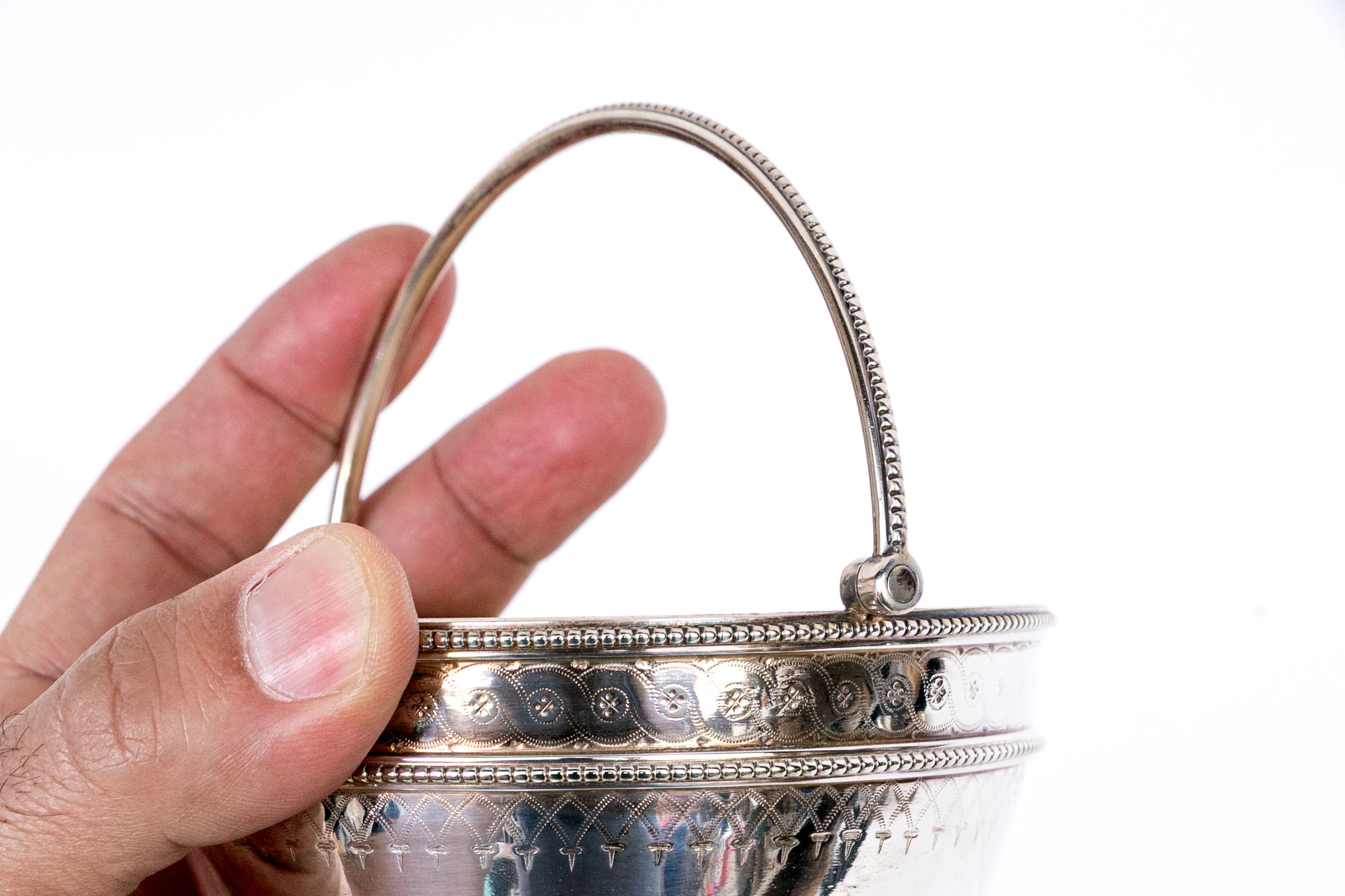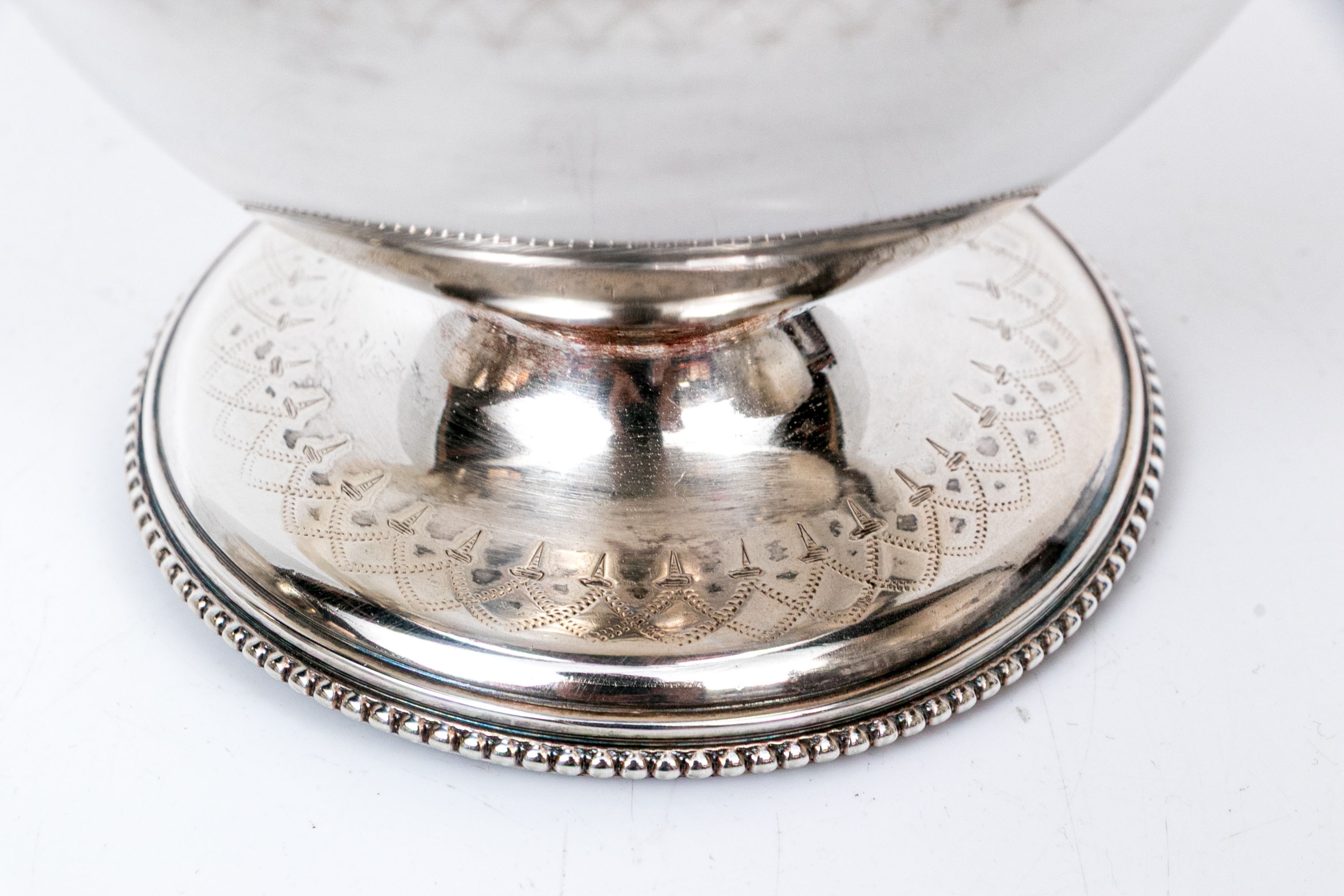 A collection of four silver plated and footed bowls. One with swing handle. Decoration includes repousse, and etched motifs, along with beaded trims.