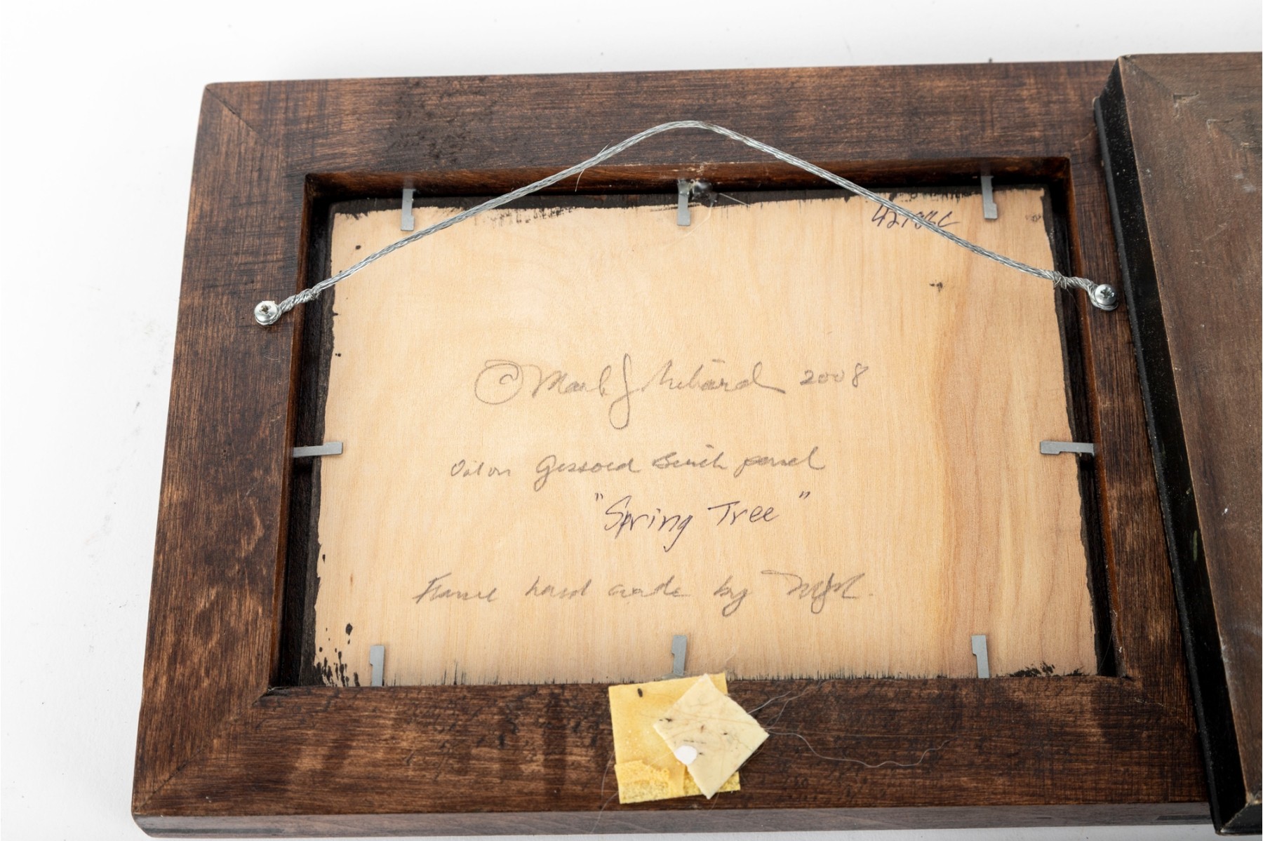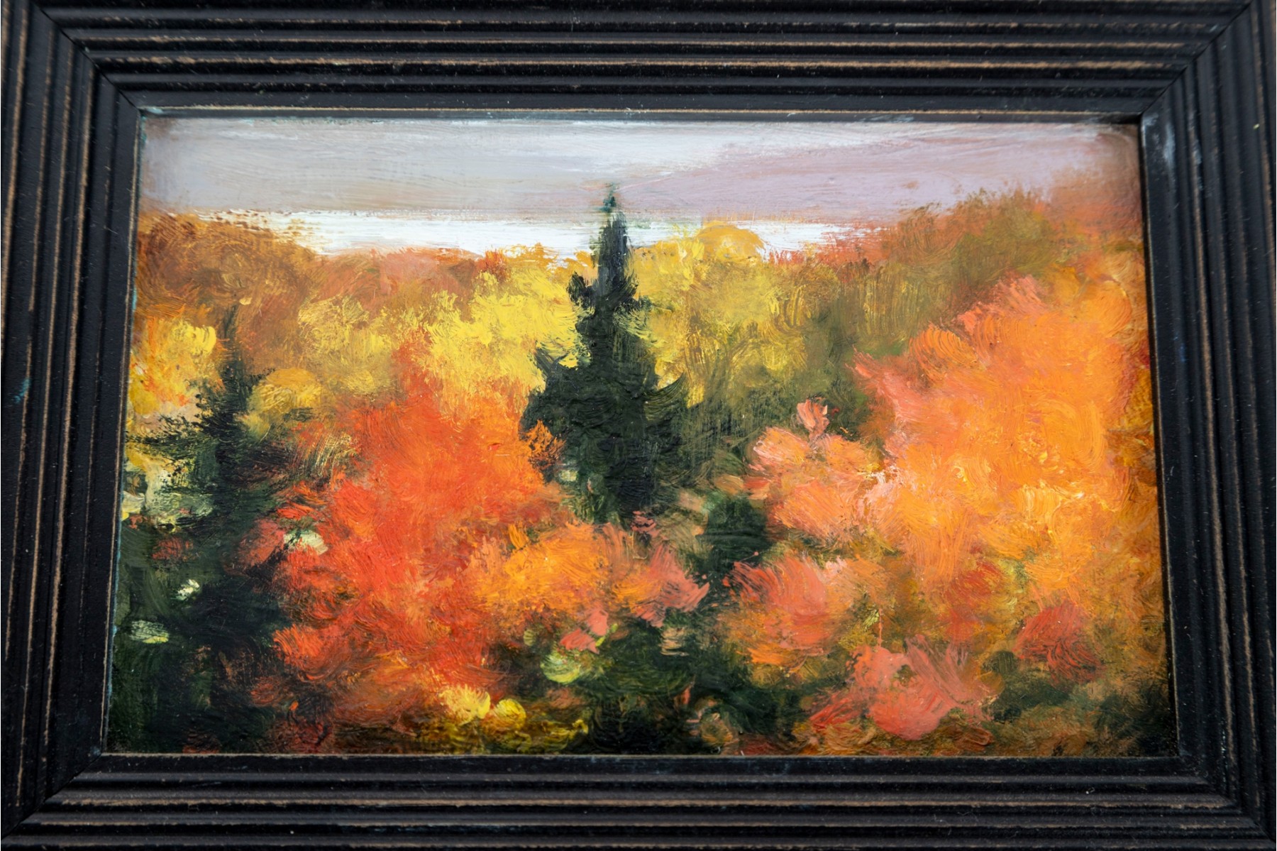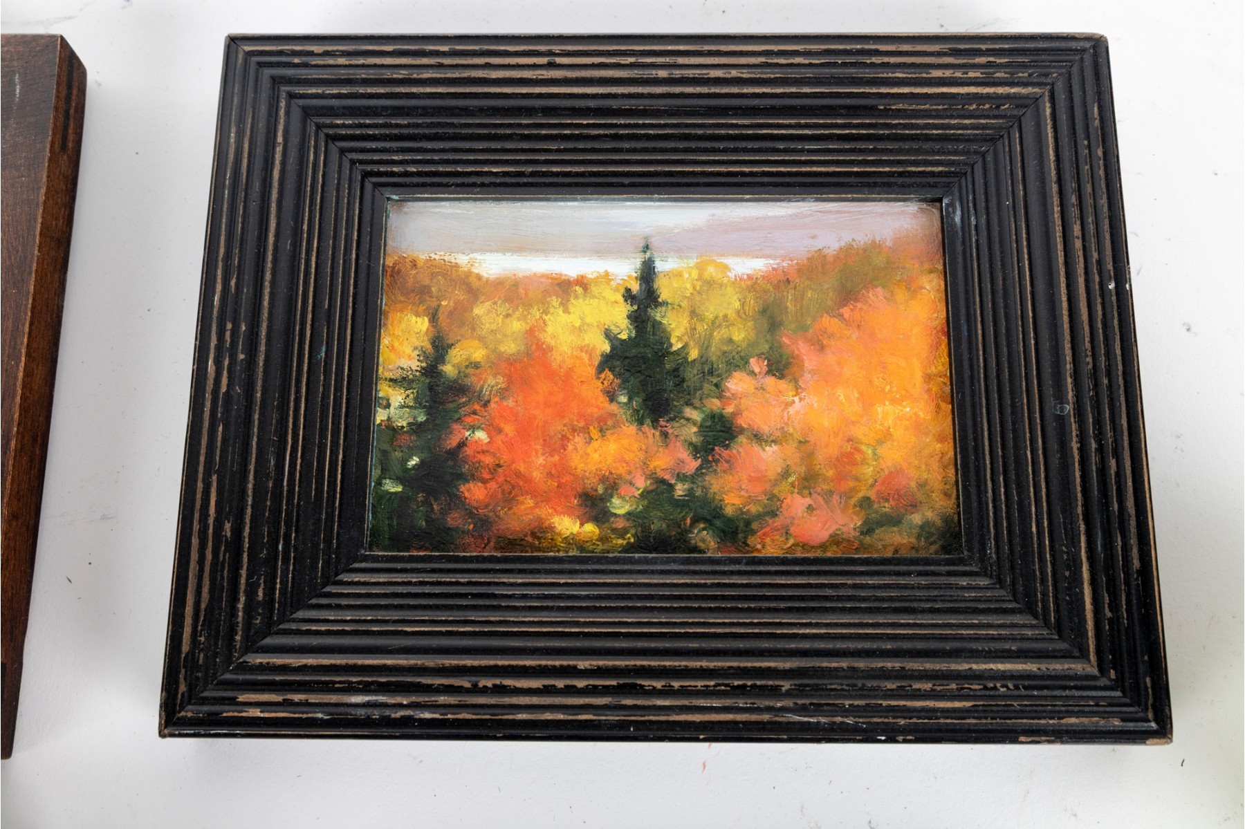 A charming collection of four abstract painted landscapes with lush green nature and vibrant pops of autumnal orange, some signed.