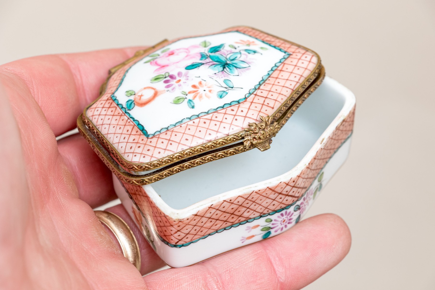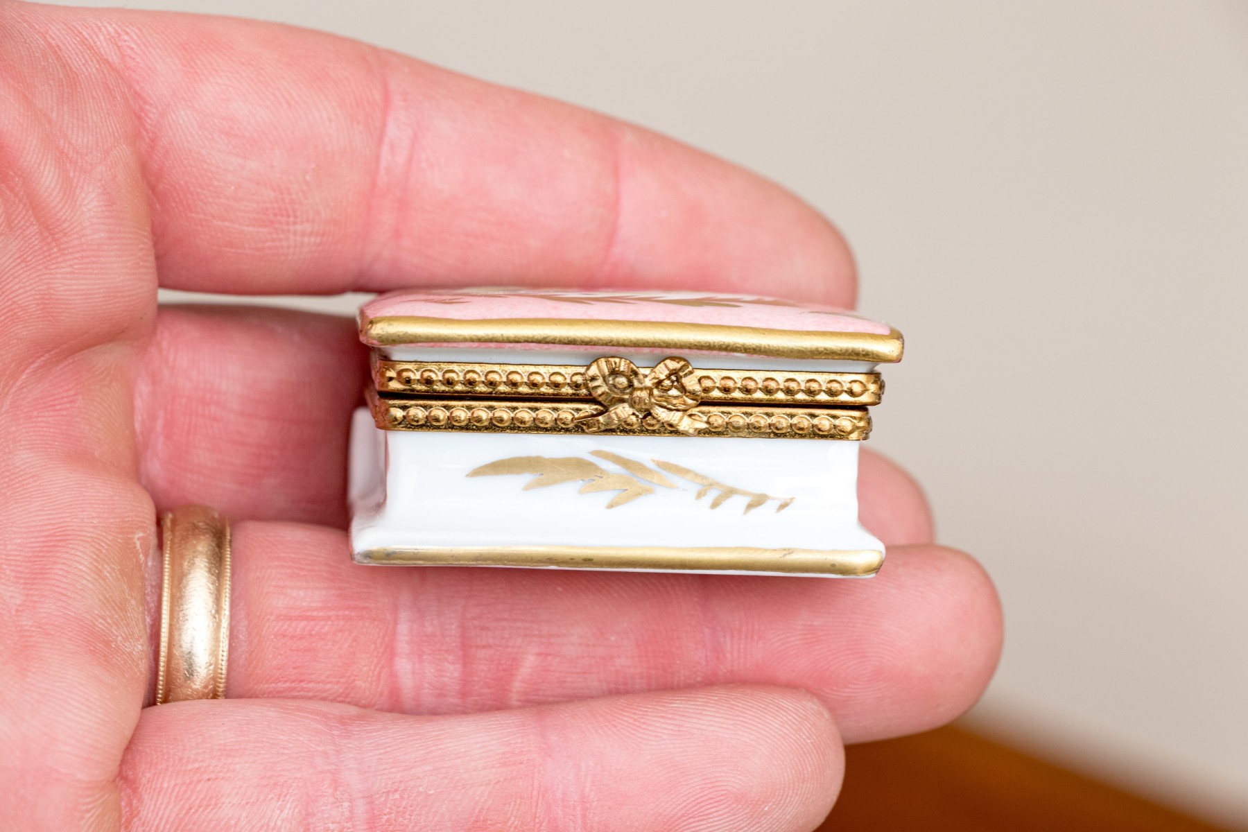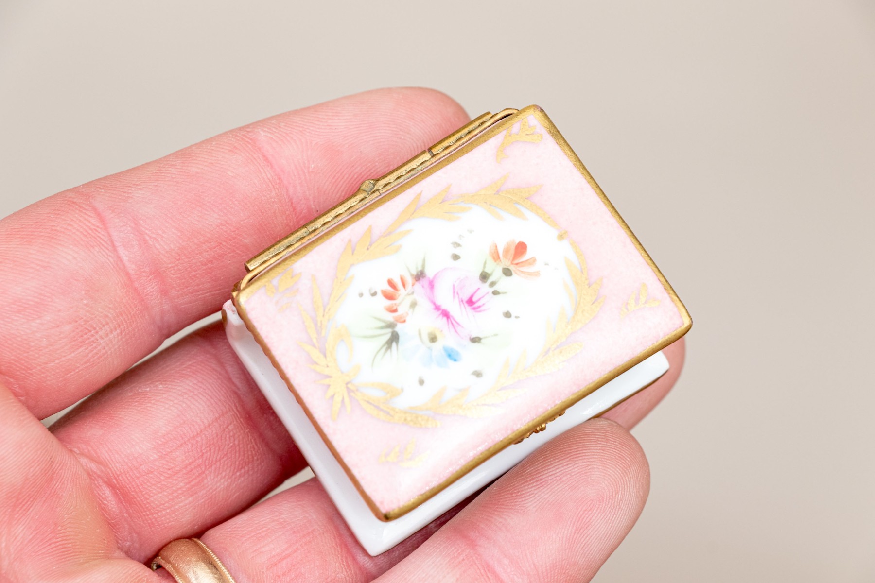 An antique Limoges shaped hand painted box in pink and white with flowers and hinged lid,