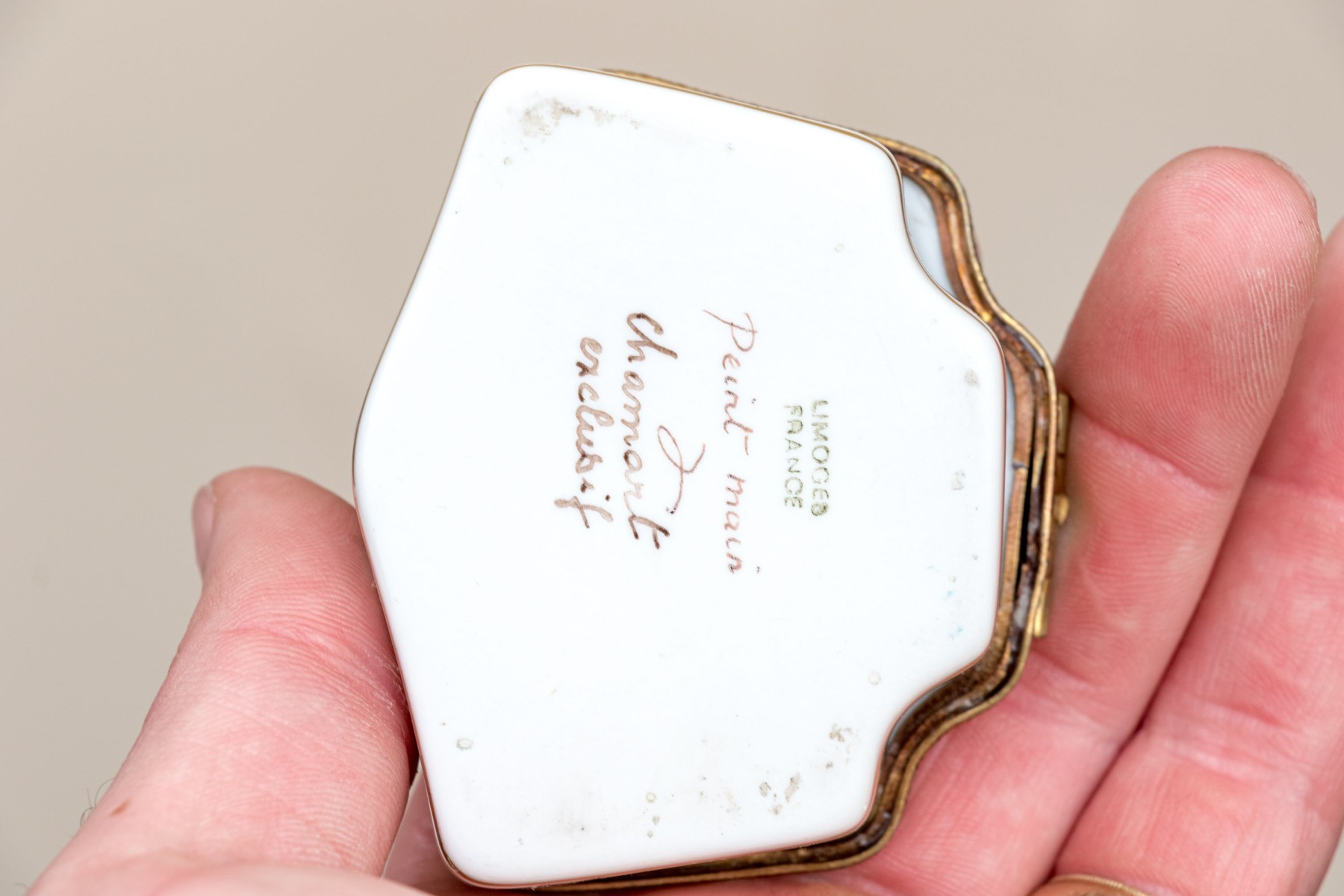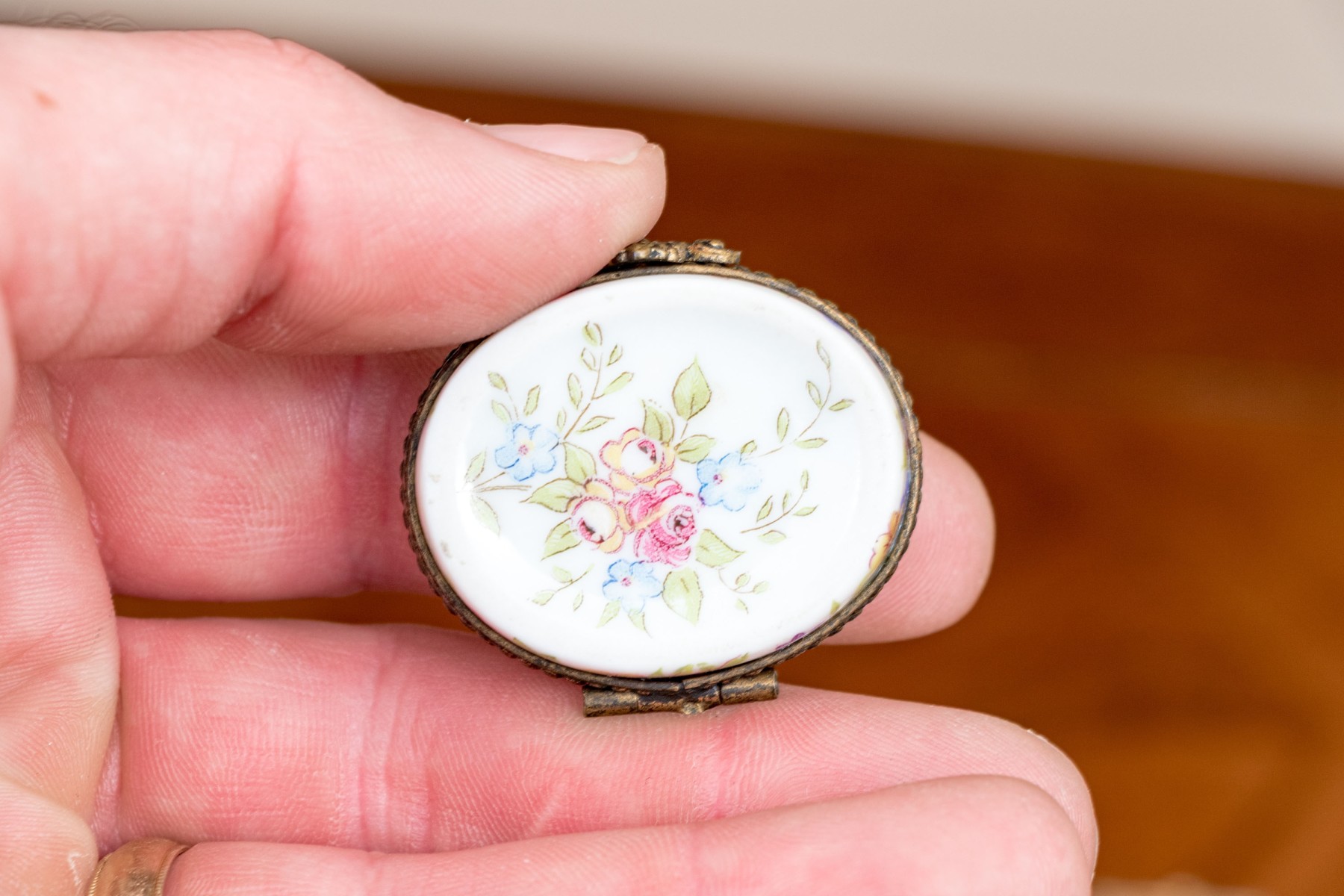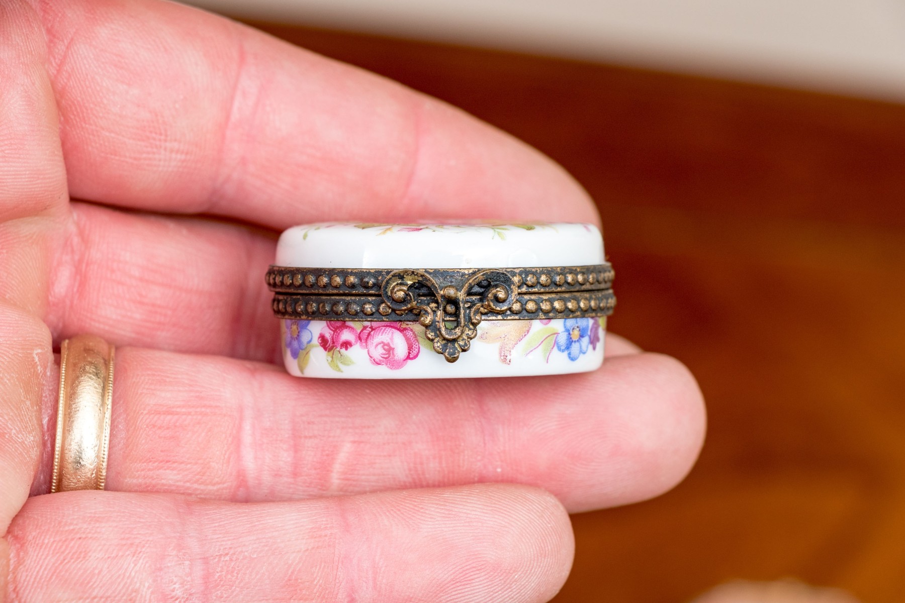 An antique Limoges shaped hand painted box in pink and white with flowers and hinged lid,