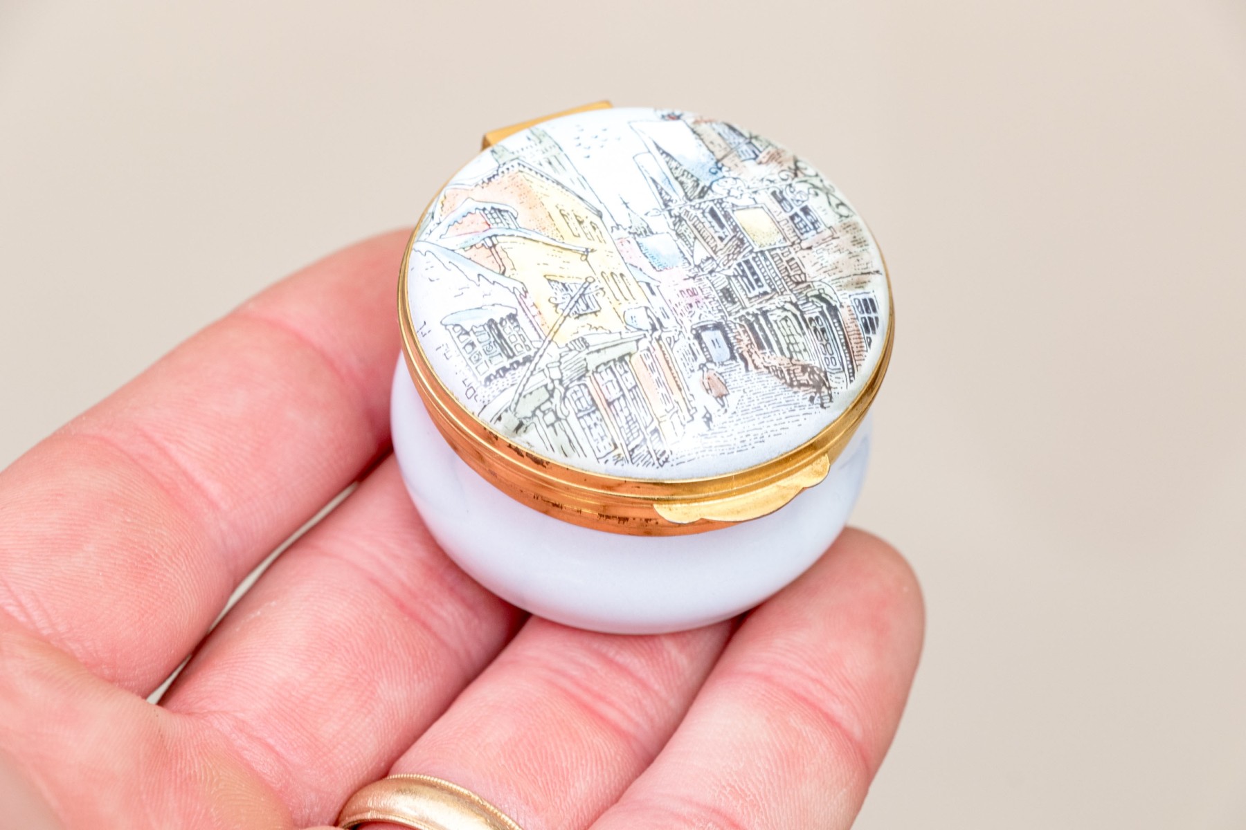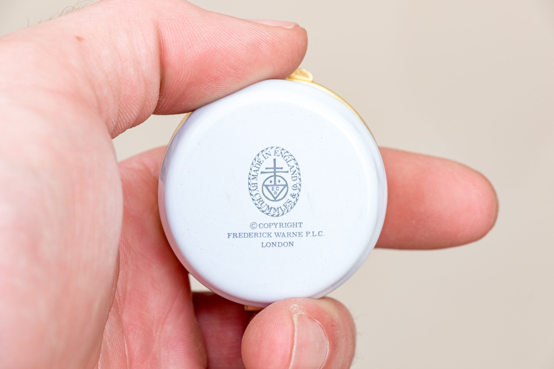 And an English round enamel box by Crummles & Co. by Frederick Warne with the image of an old English town street on the lid and a Beatrix Potter mouse inside the lid.
