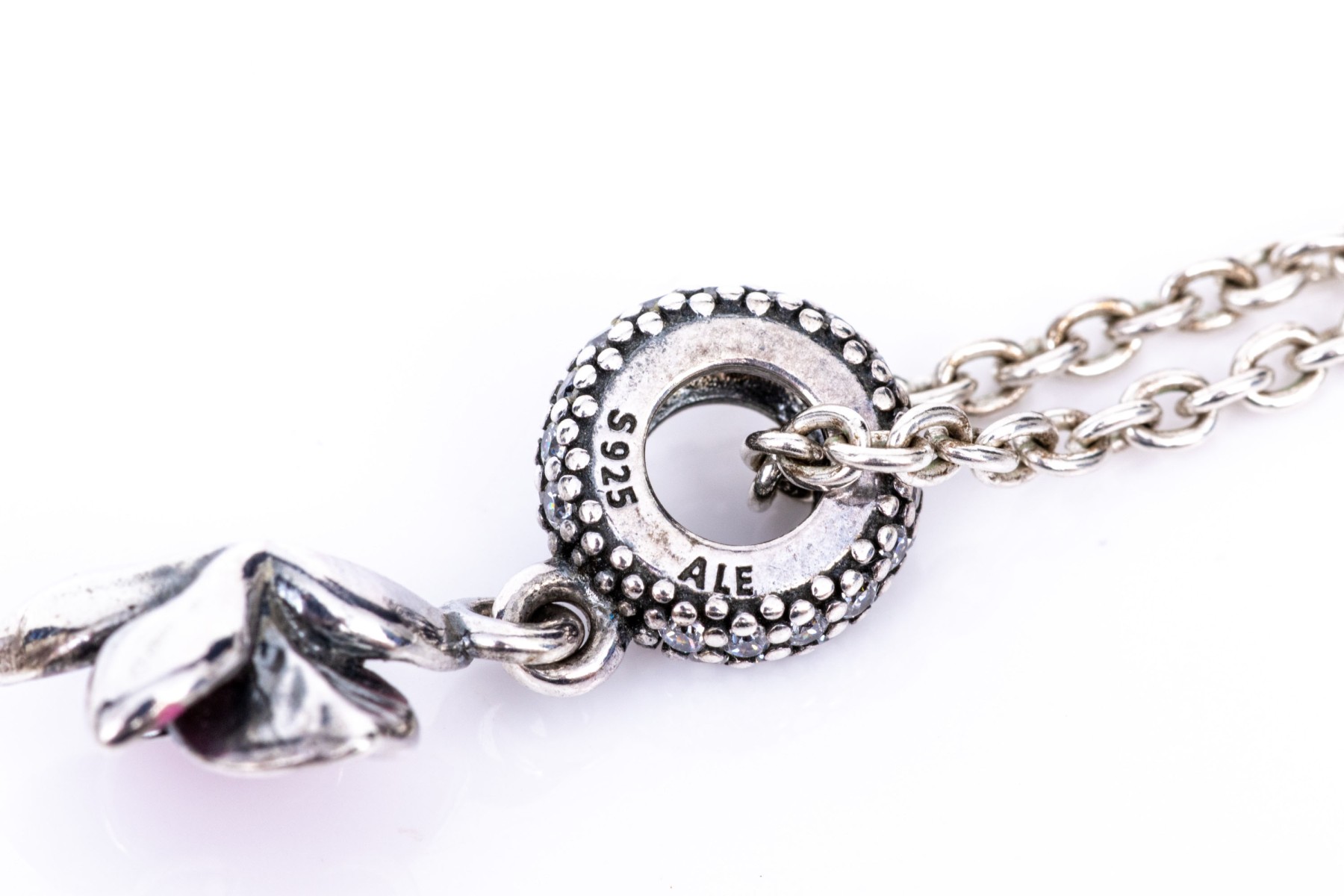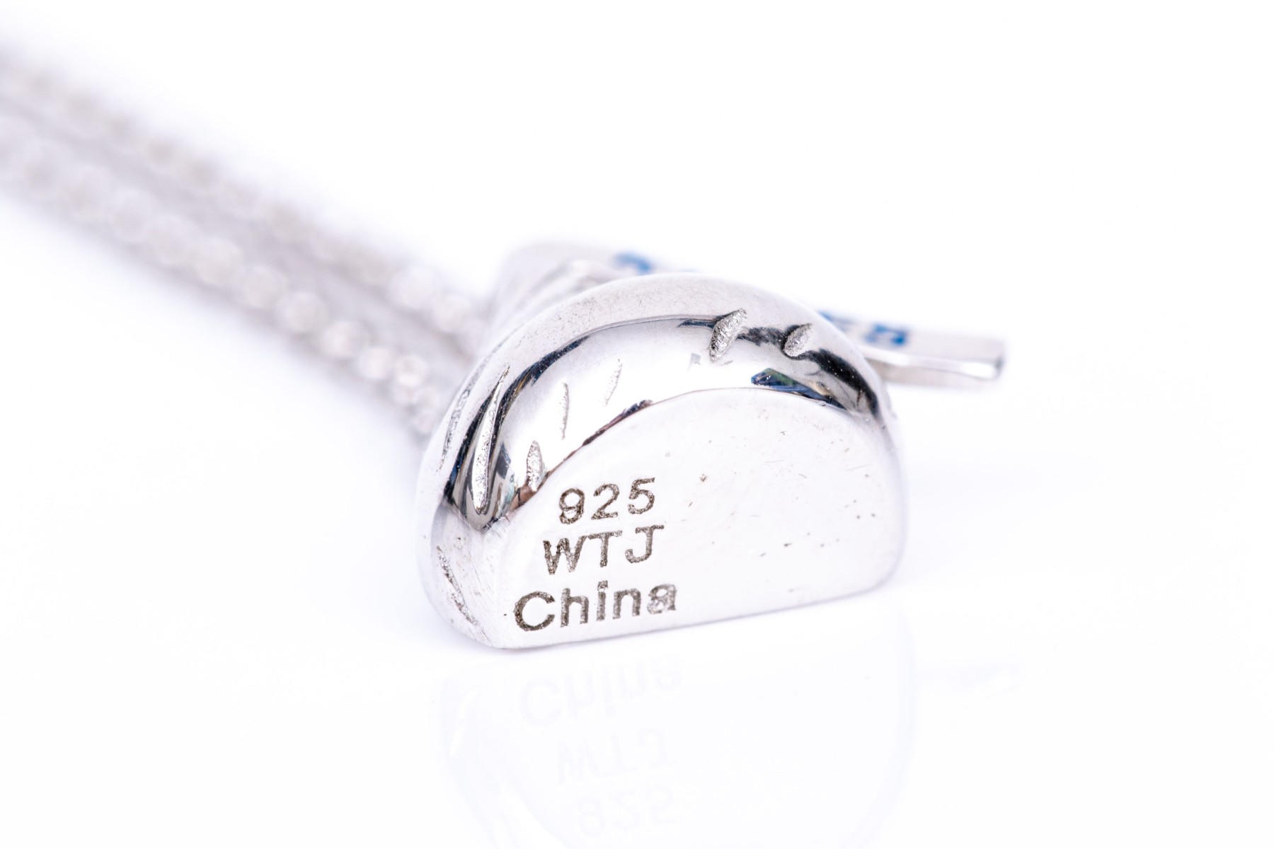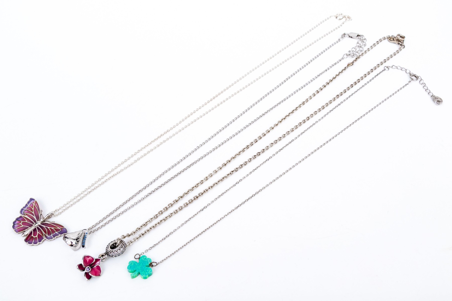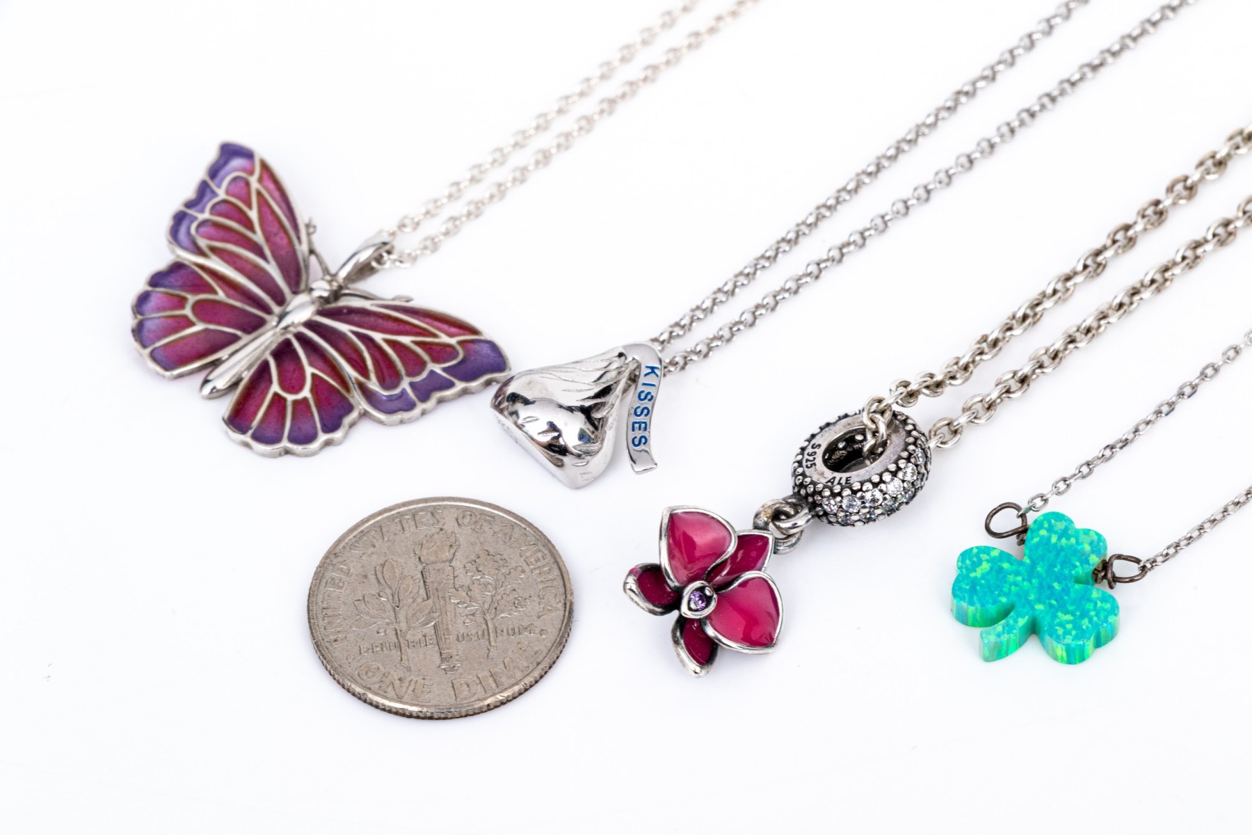 Collection of four sterling silver whimsical necklaces, including a shamrock, on chains, and finished with spring ring and lobster claw style clasps. The shamrock is composite.