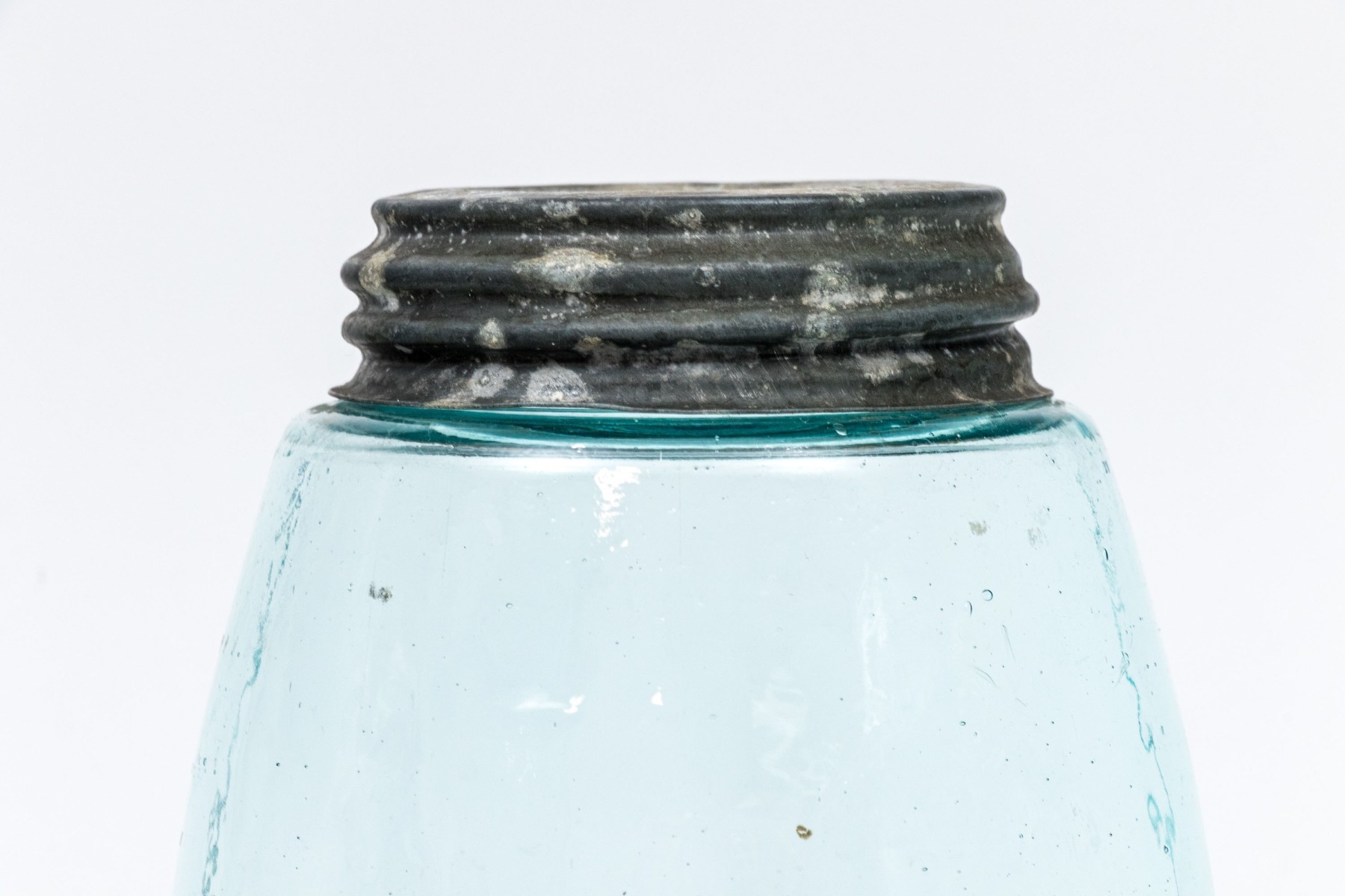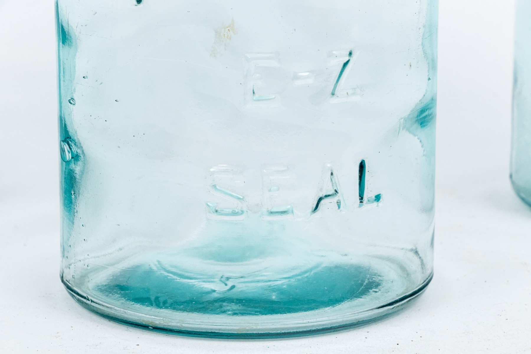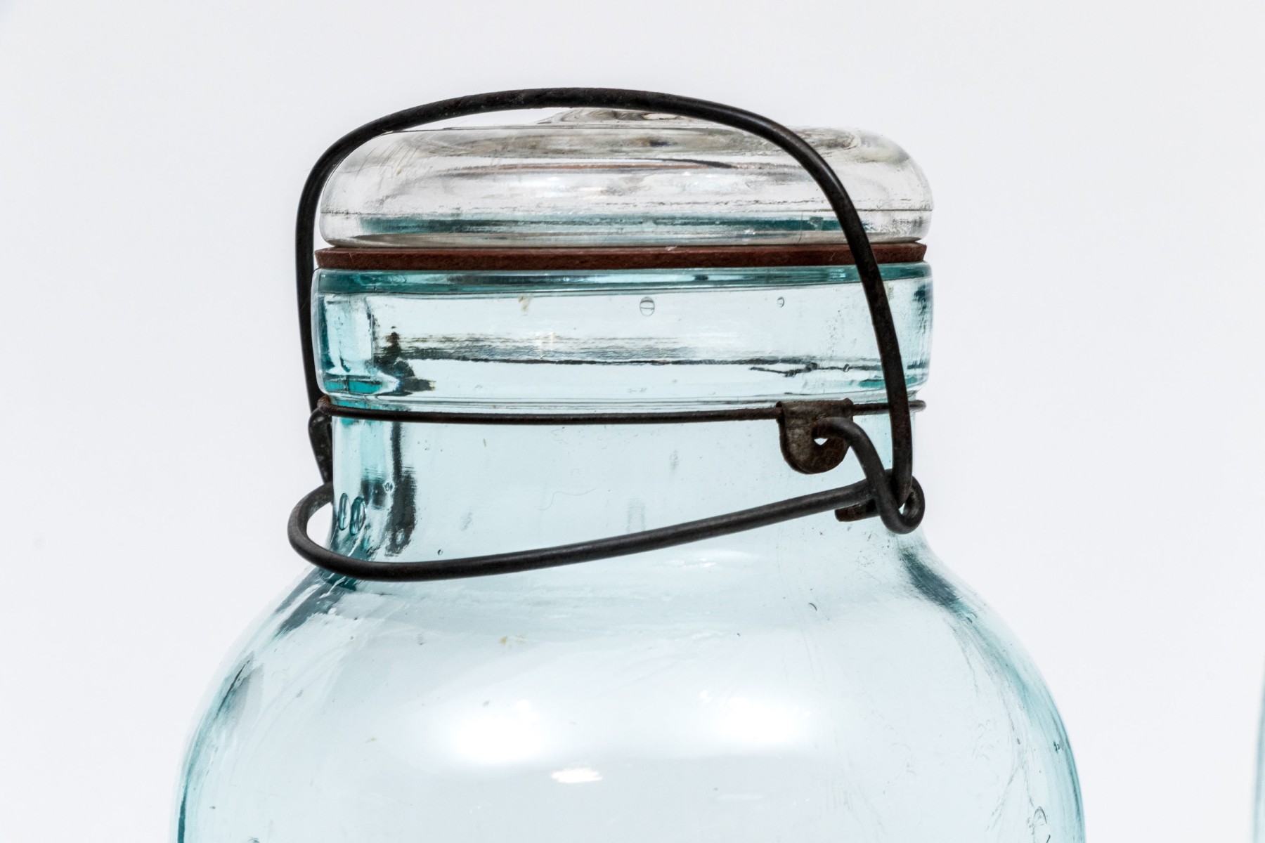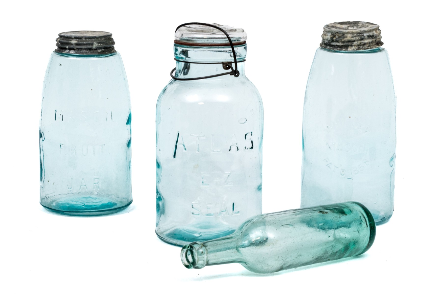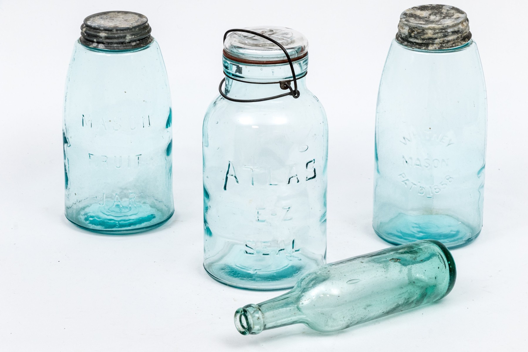 A wonderful group of blue glass vessels including two jars with metal lids, one jar with a glass lid and metal wire to secure the top, and one glass bottle.