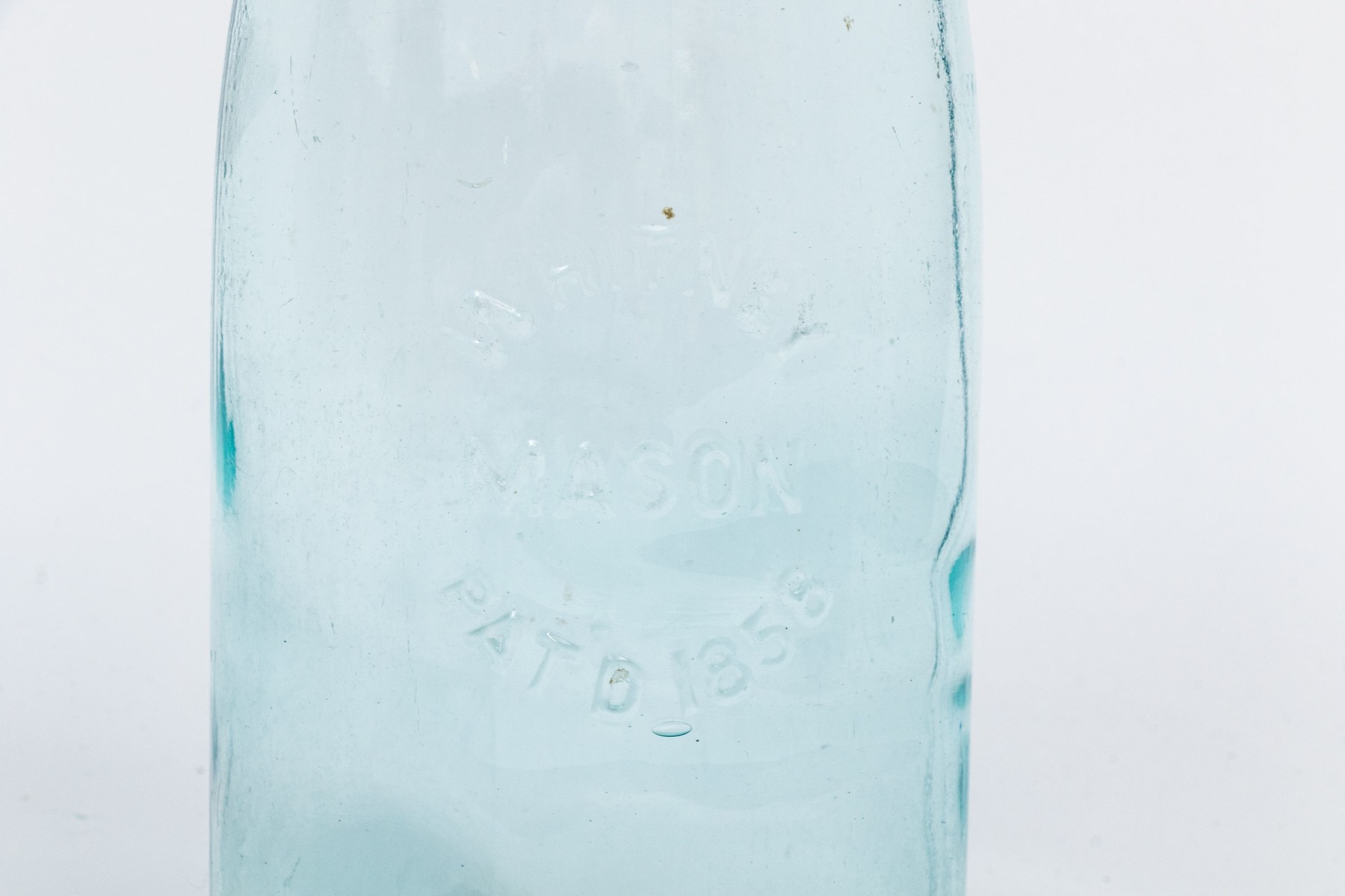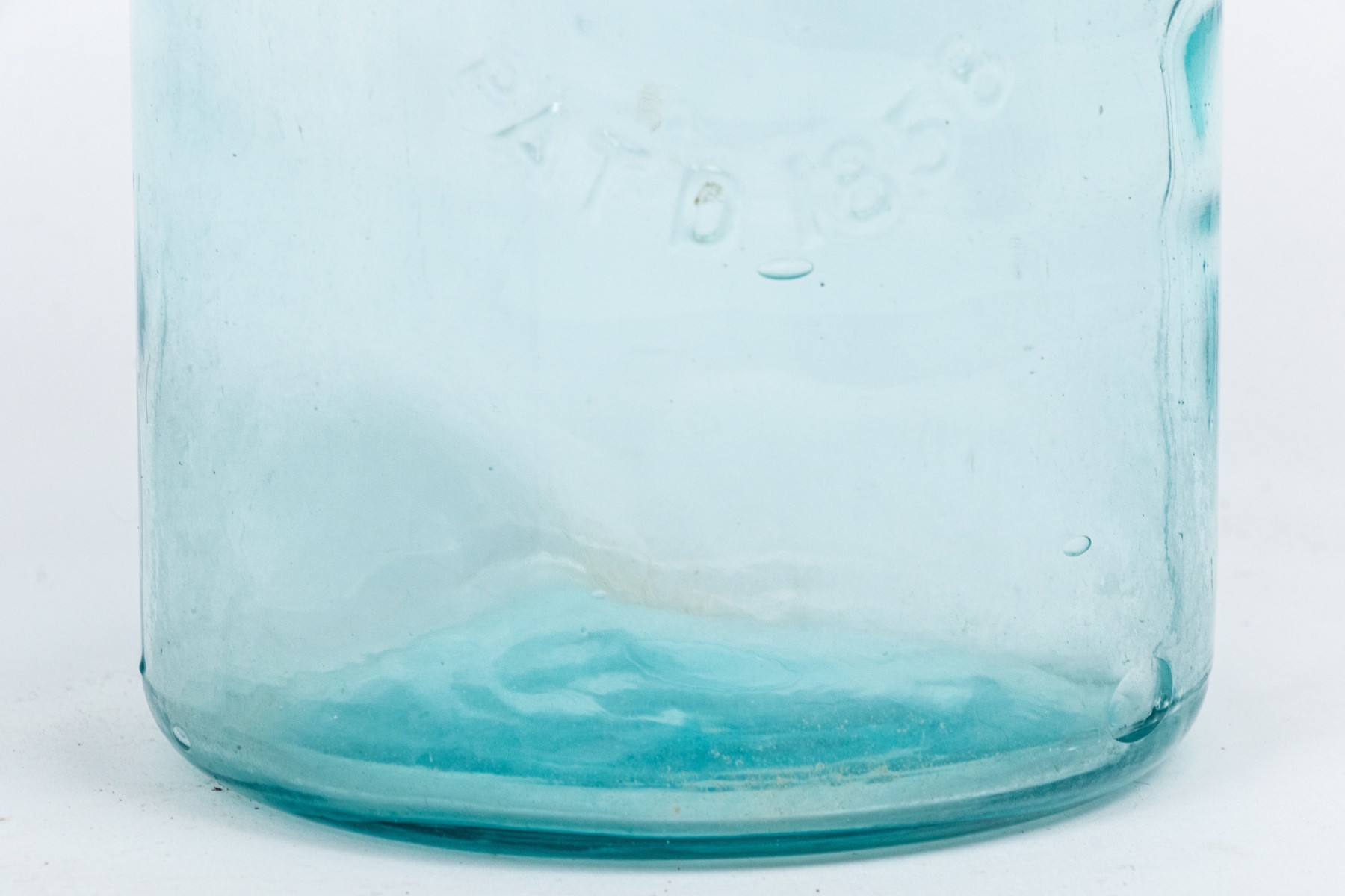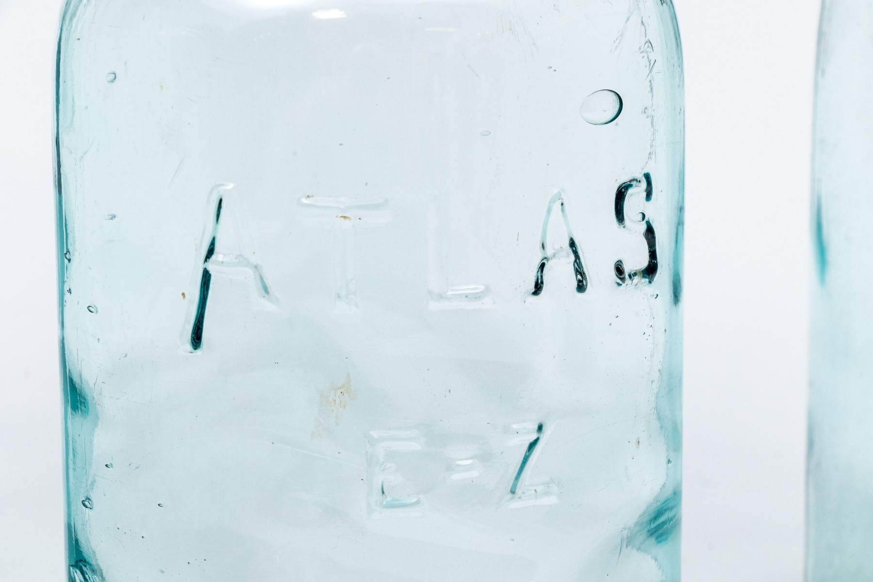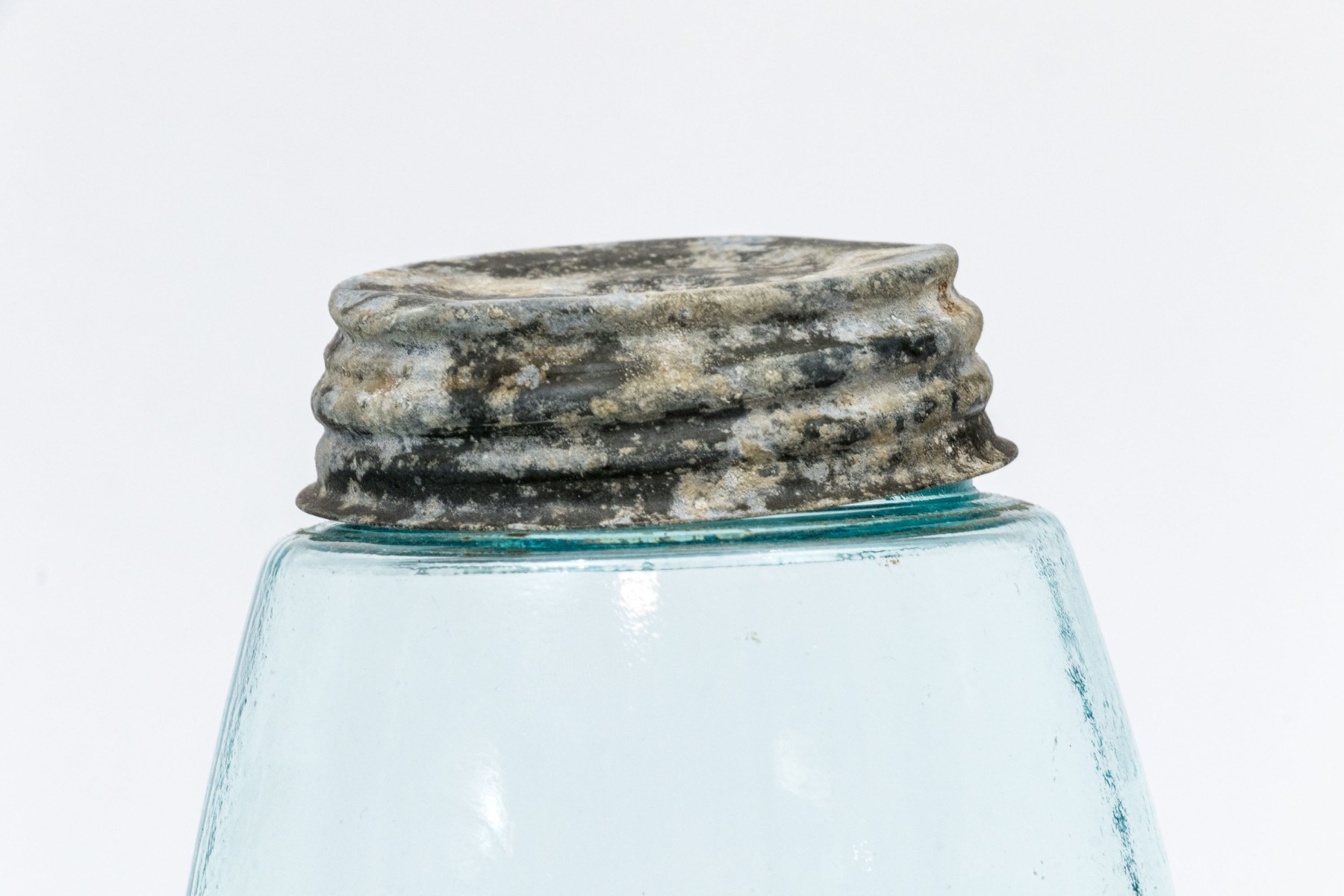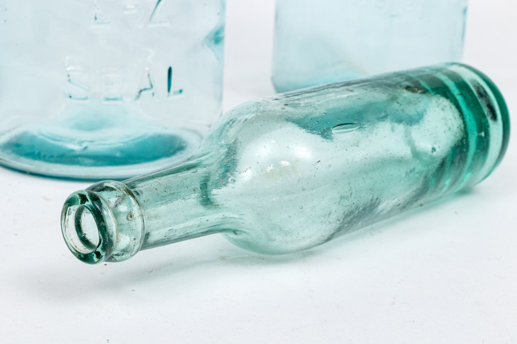 A wonderful group of blue glass vessels including two jars with metal lids, one jar with a glass lid and metal wire to secure the top, and one glass bottle.