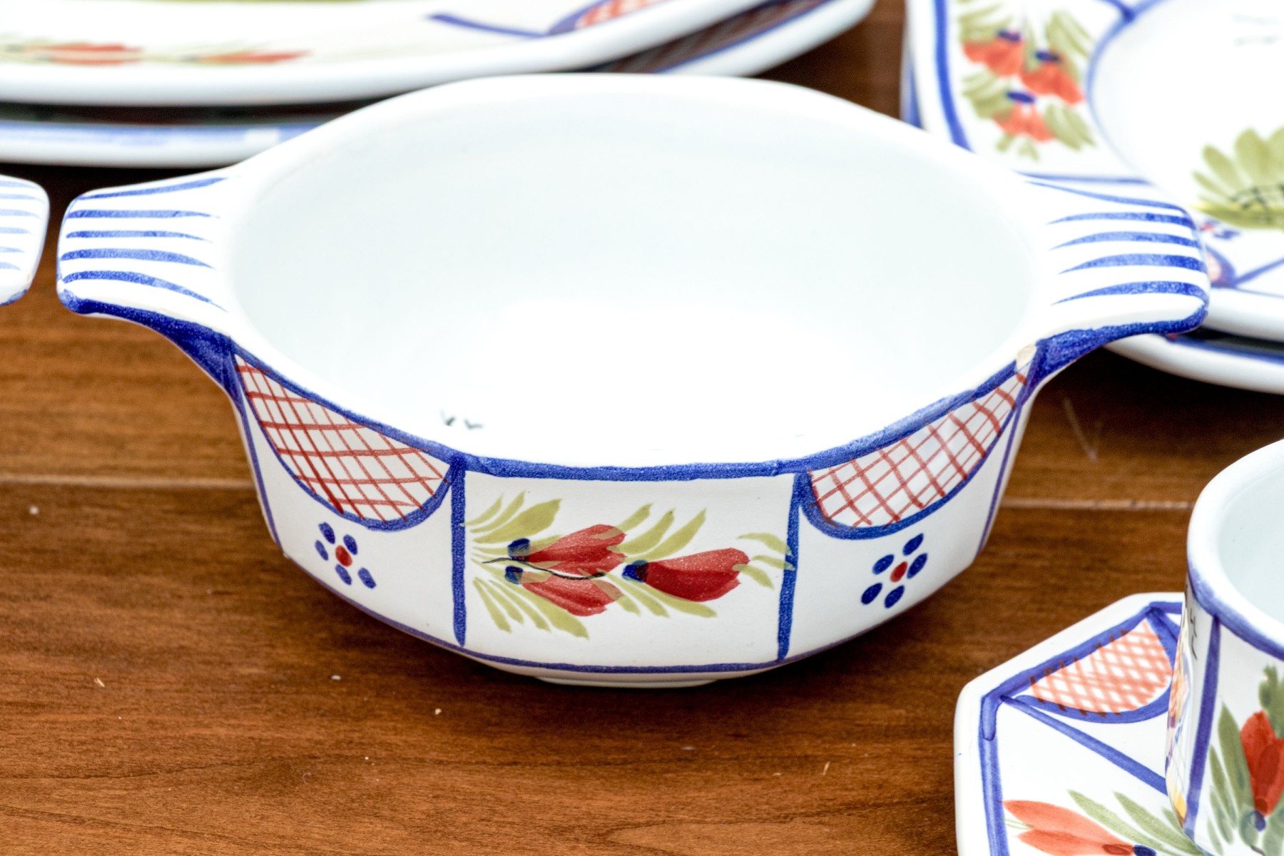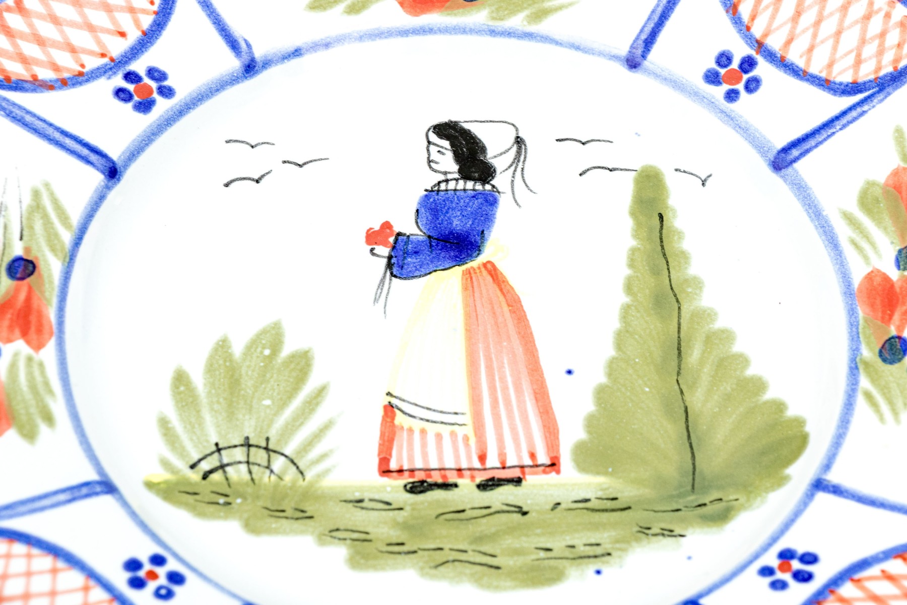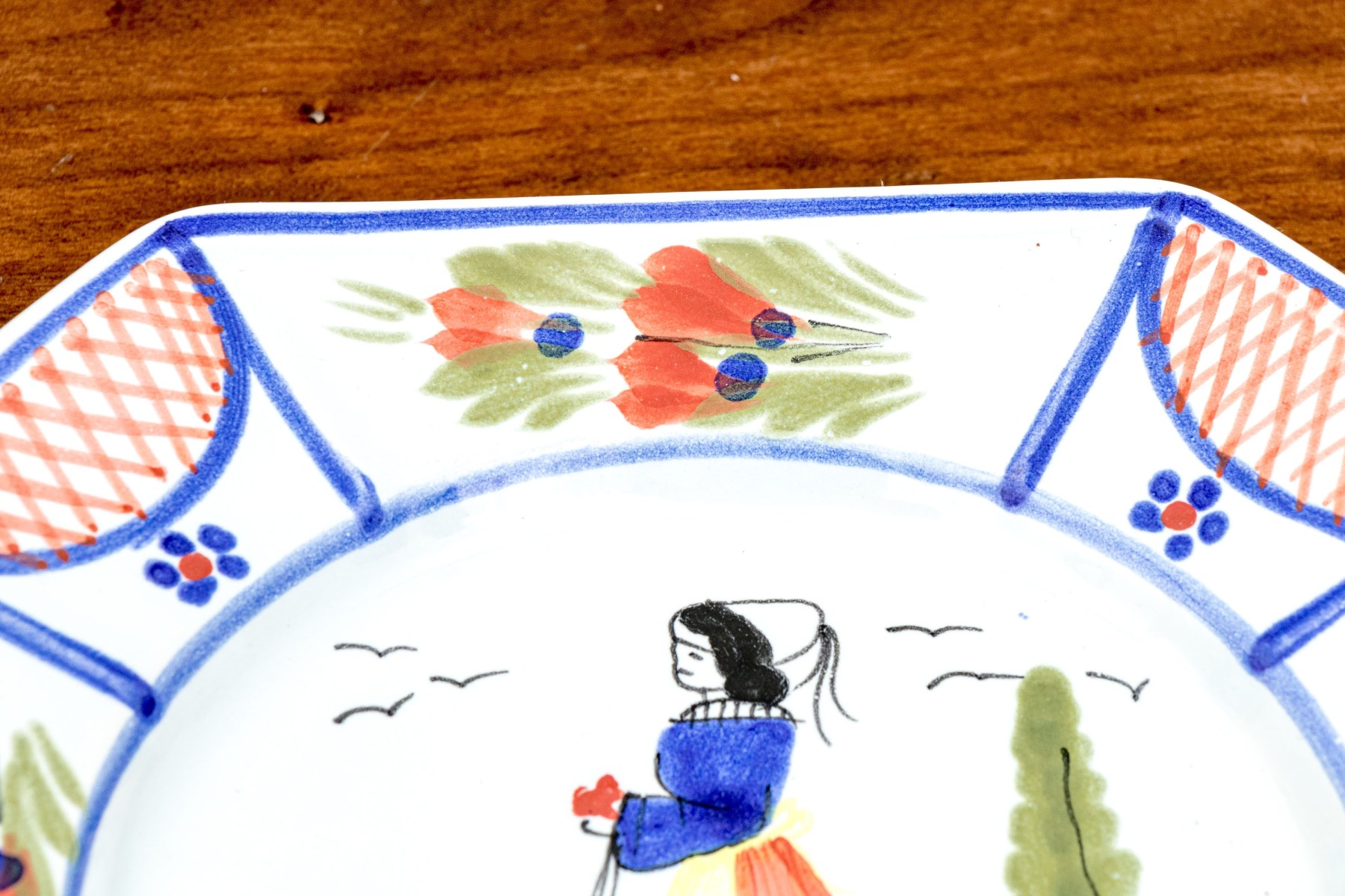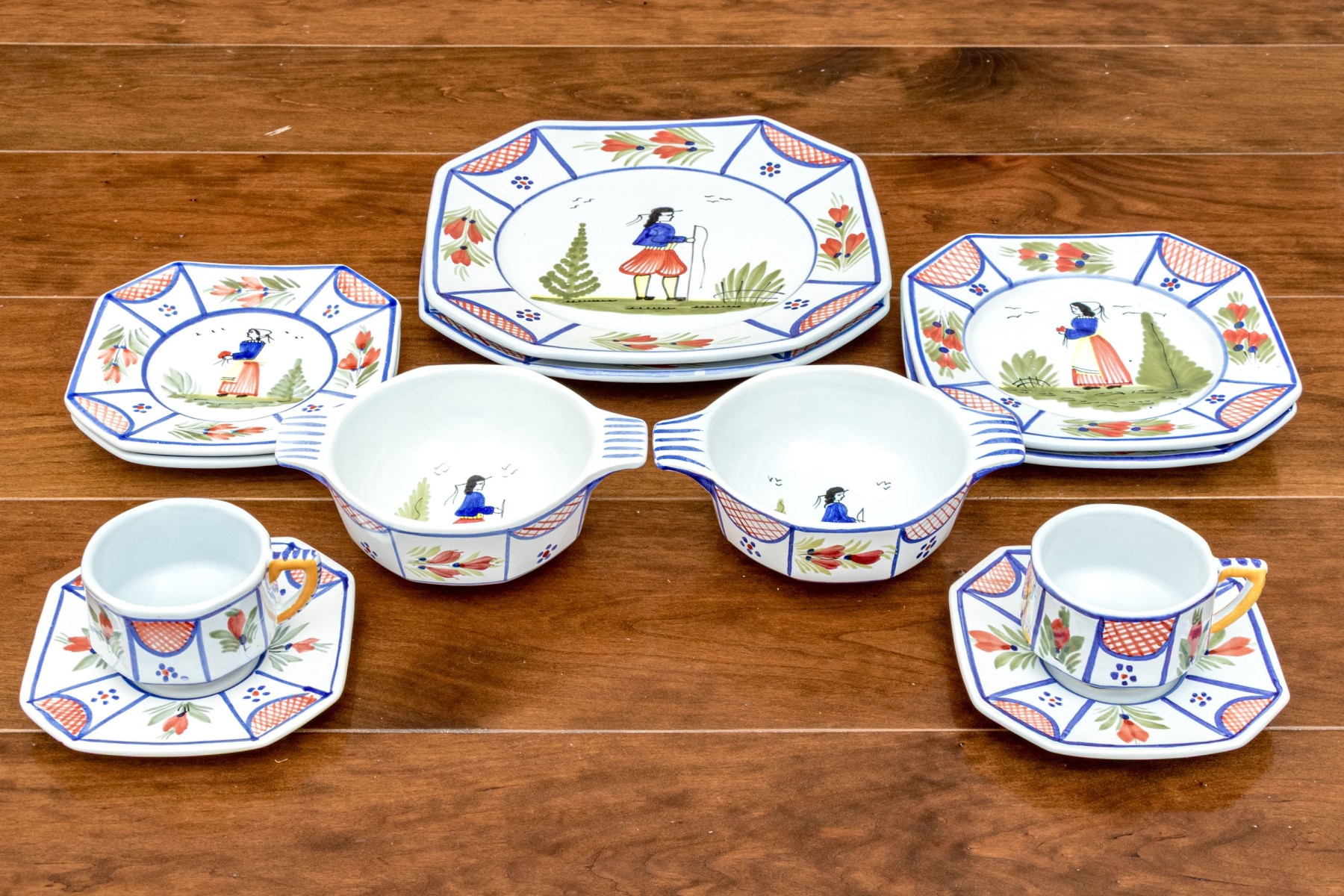 A fantastic collection of Henriot Quimper ceramics including two twin-handled soup bowls with octagonal underplates, two teacups with octagonal saucers, two salad plates, and two dinner plates. All beautifully hand-painted with folk figures in profile wearing blue and red, blue borders, and red floral sprays.