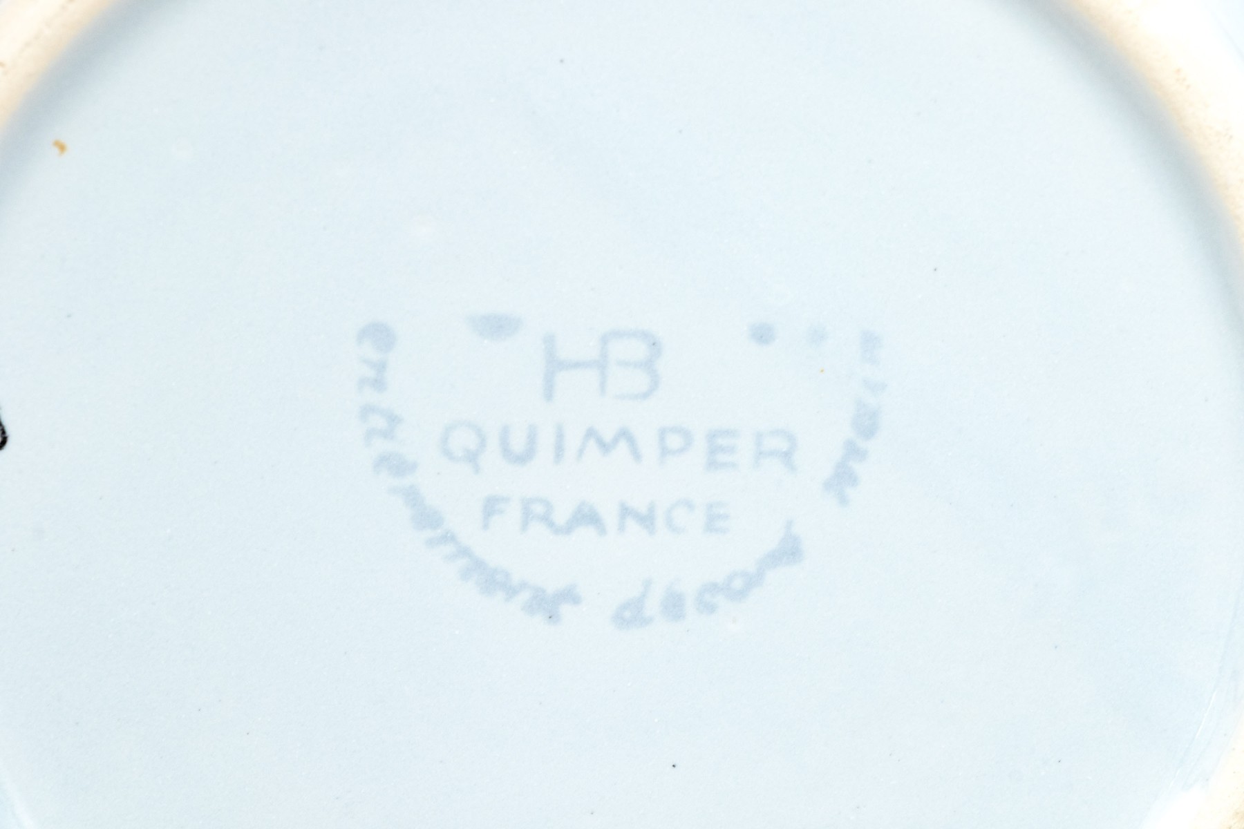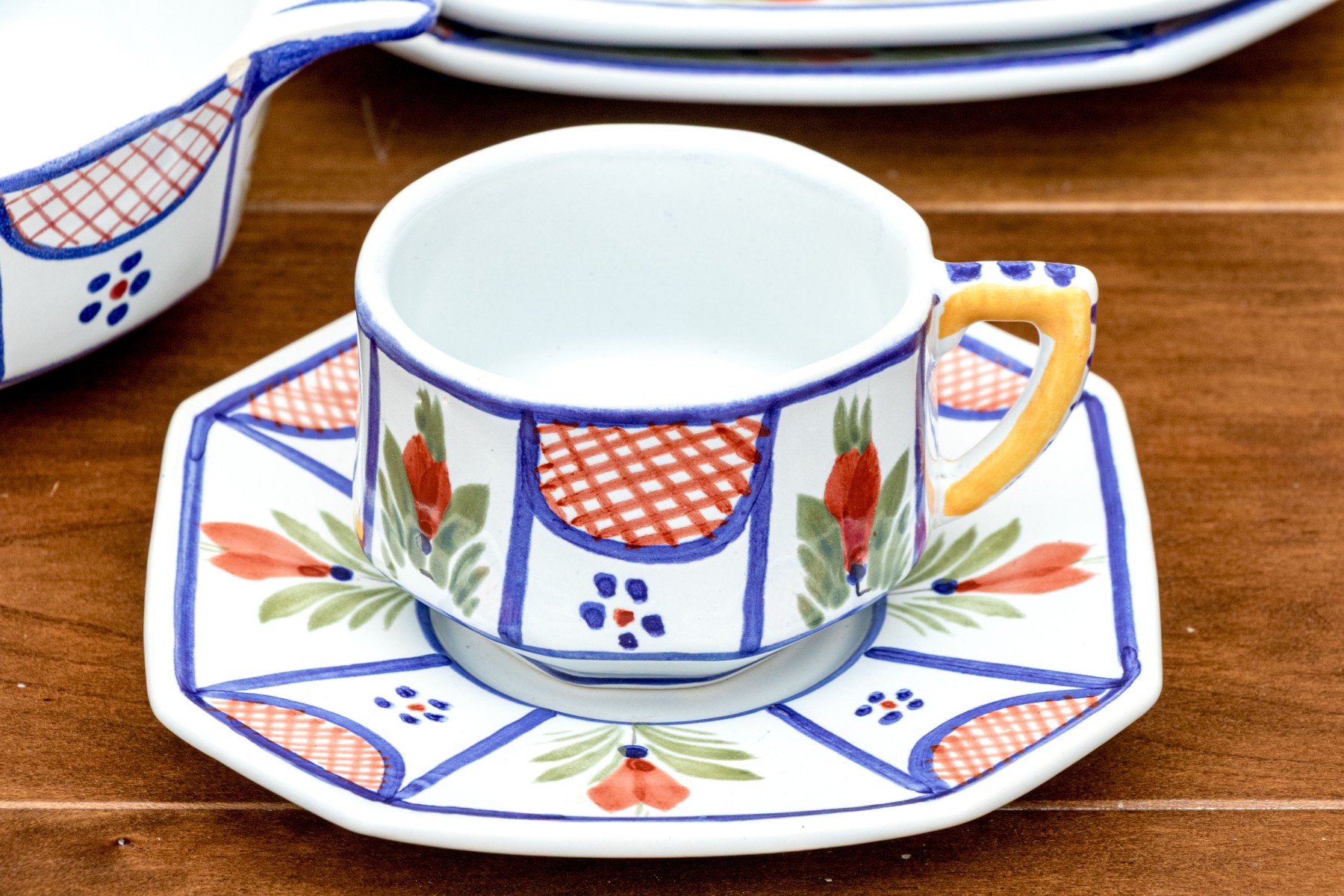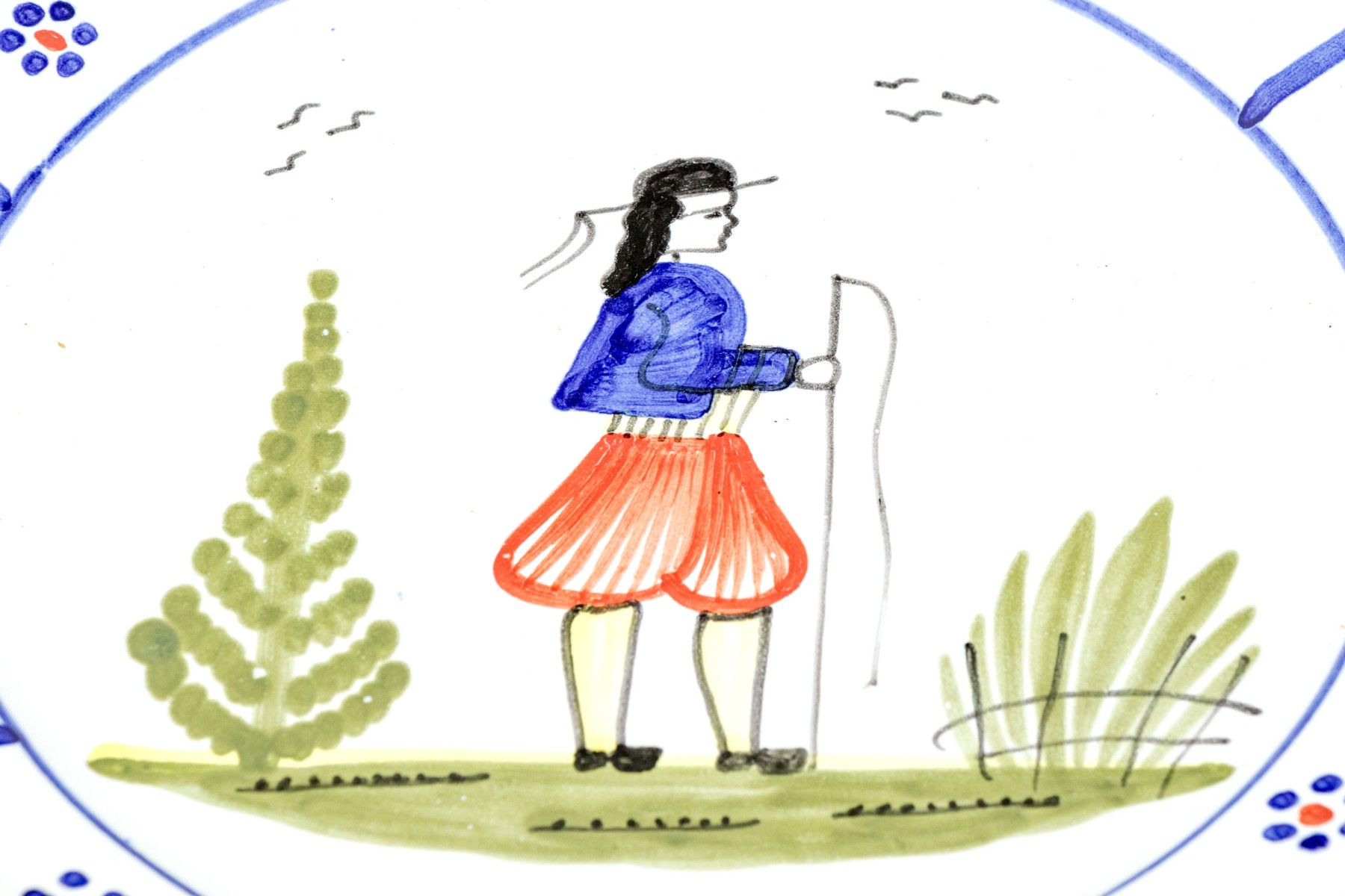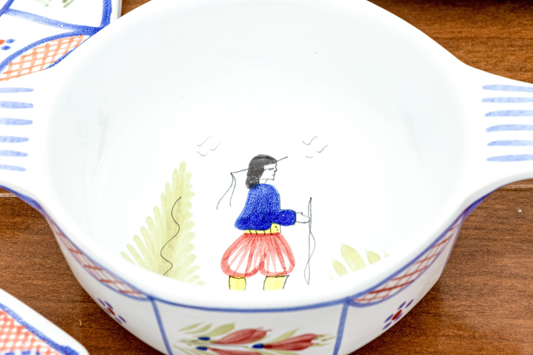 A fantastic collection of Henriot Quimper ceramics including two twin-handled soup bowls with octagonal underplates, two teacups with octagonal saucers, two salad plates, and two dinner plates. All beautifully hand-painted with folk figures in profile wearing blue and red, blue borders, and red floral sprays.