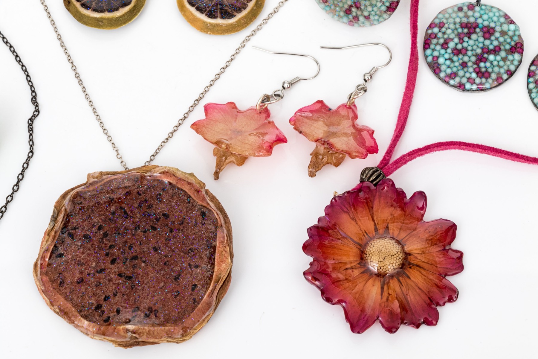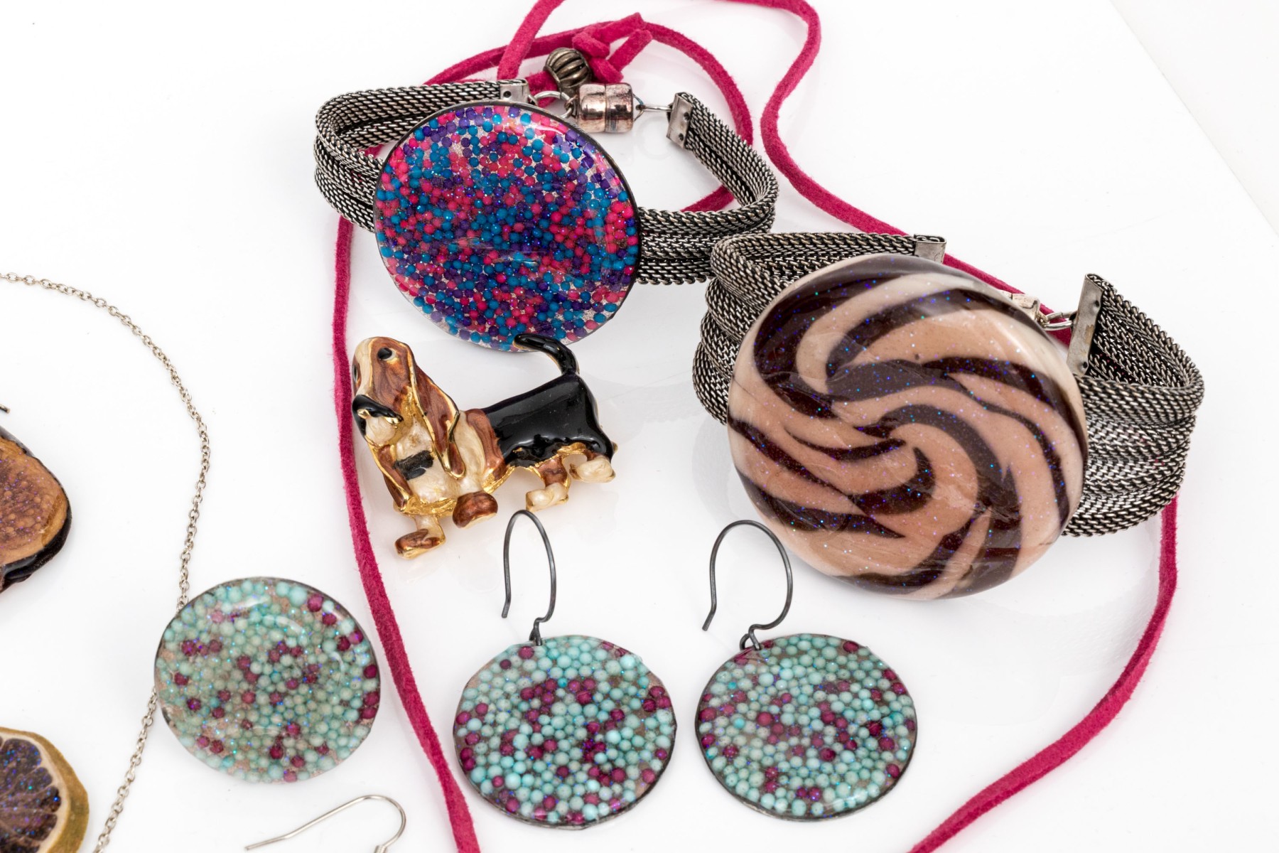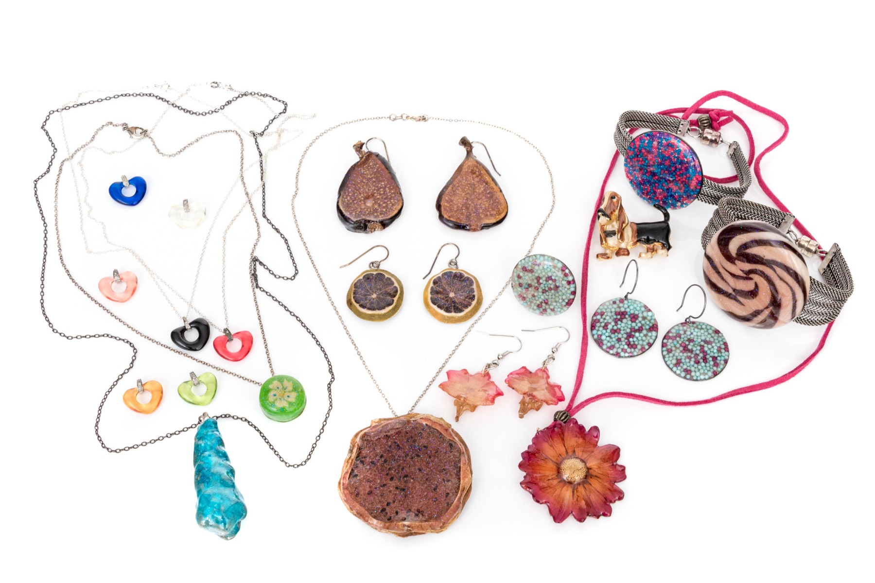 Collection of jewelry featuring dried fruits set in resin, including figs and key lime earrings and a kiwi pendant; dried flower earrings and pendant, also set in resin; non pareils earrings, ring and bracelet, also set in resin; and rock candy pendant, and hard candy pendant and bracelet, also set in resin. Accompanying this are two sterling silver chains with interchangeable multi color acrylic hearts, set in sterling, and a costume jewelry dog brooch