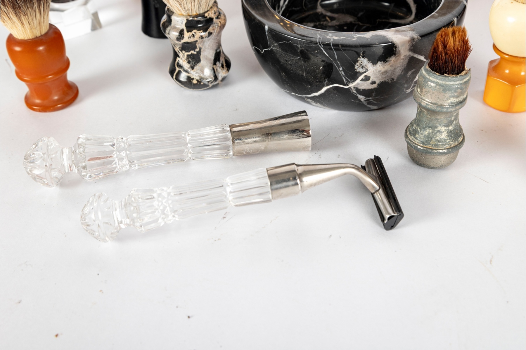 A large collection of badger fur shaving brushes from varied brands; Stag, Ever-Ready, Opal, etc — accompanied by a luxury marble shaving set.