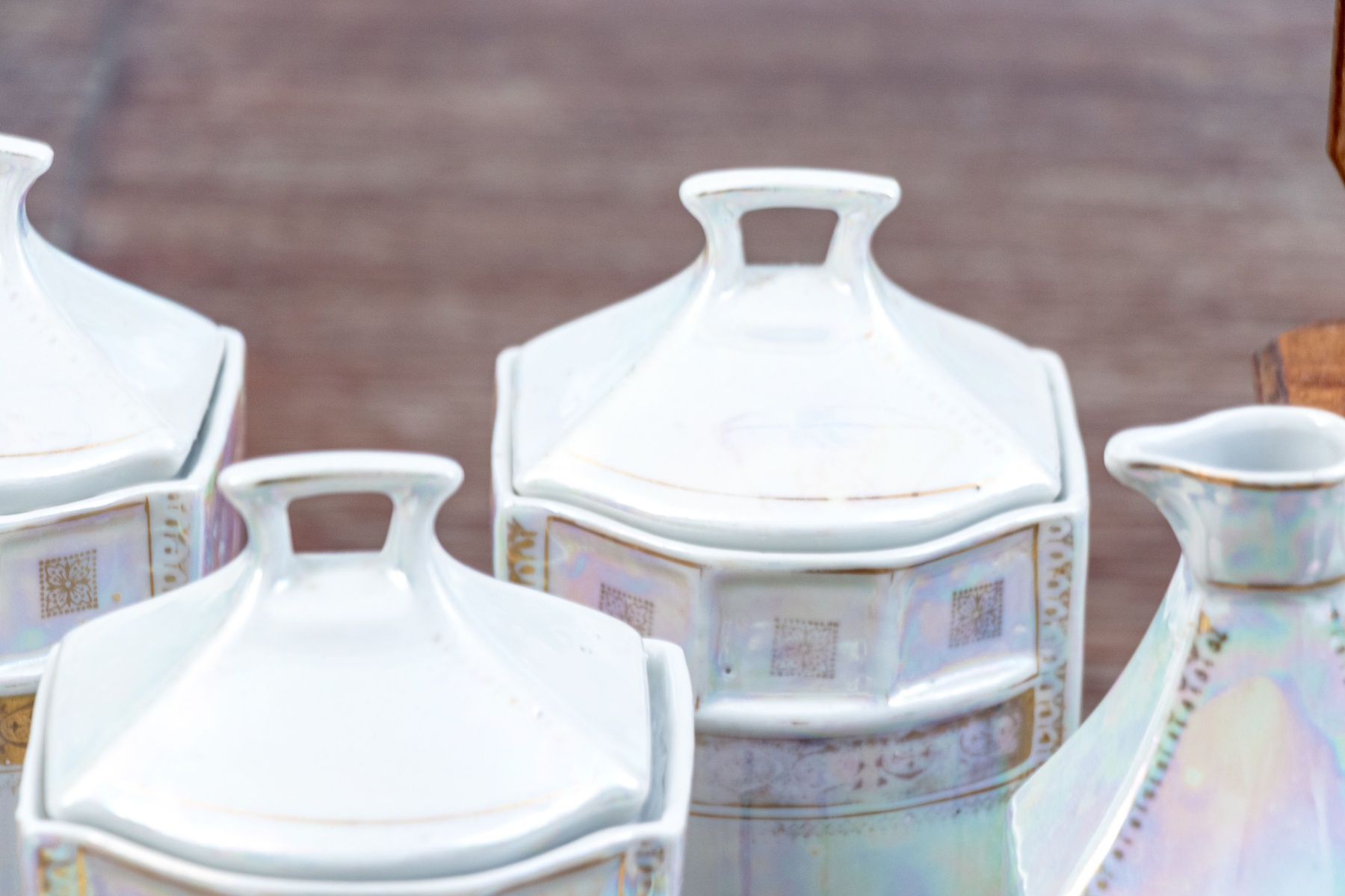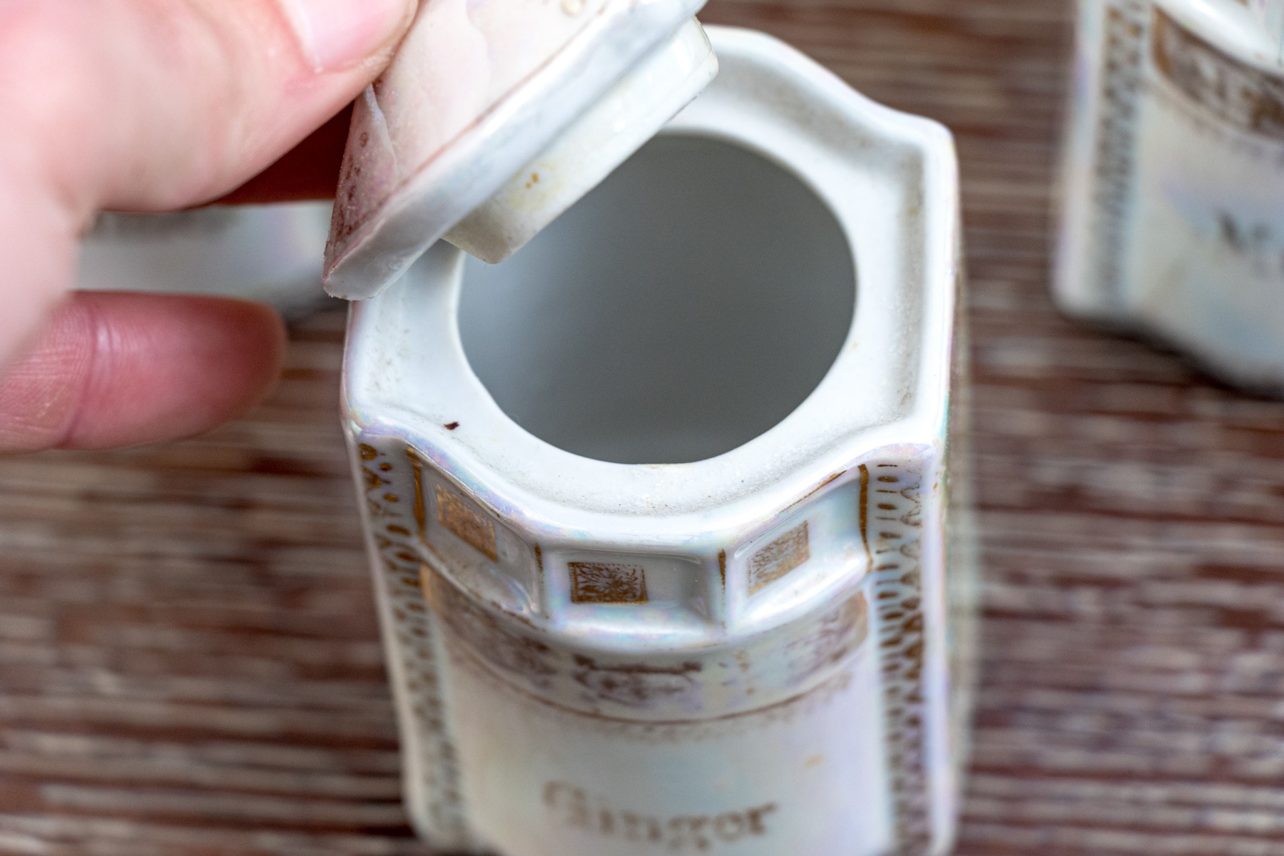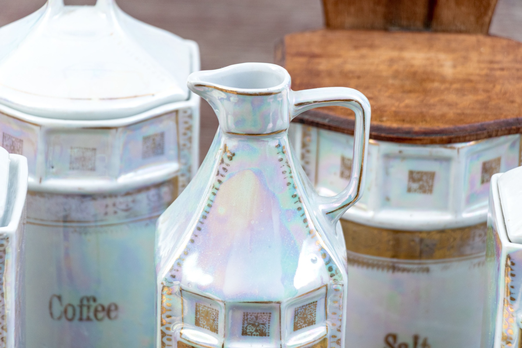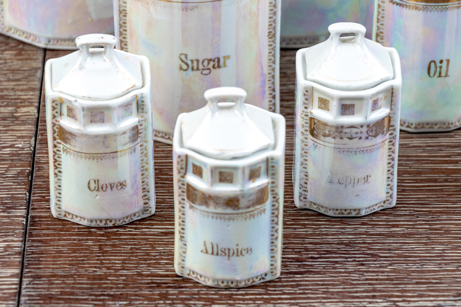 Some chipping to the trim of some canisters near where the lid fits on, some wear to the finish in gilt and the iridescent finish commensurate with age and usage.