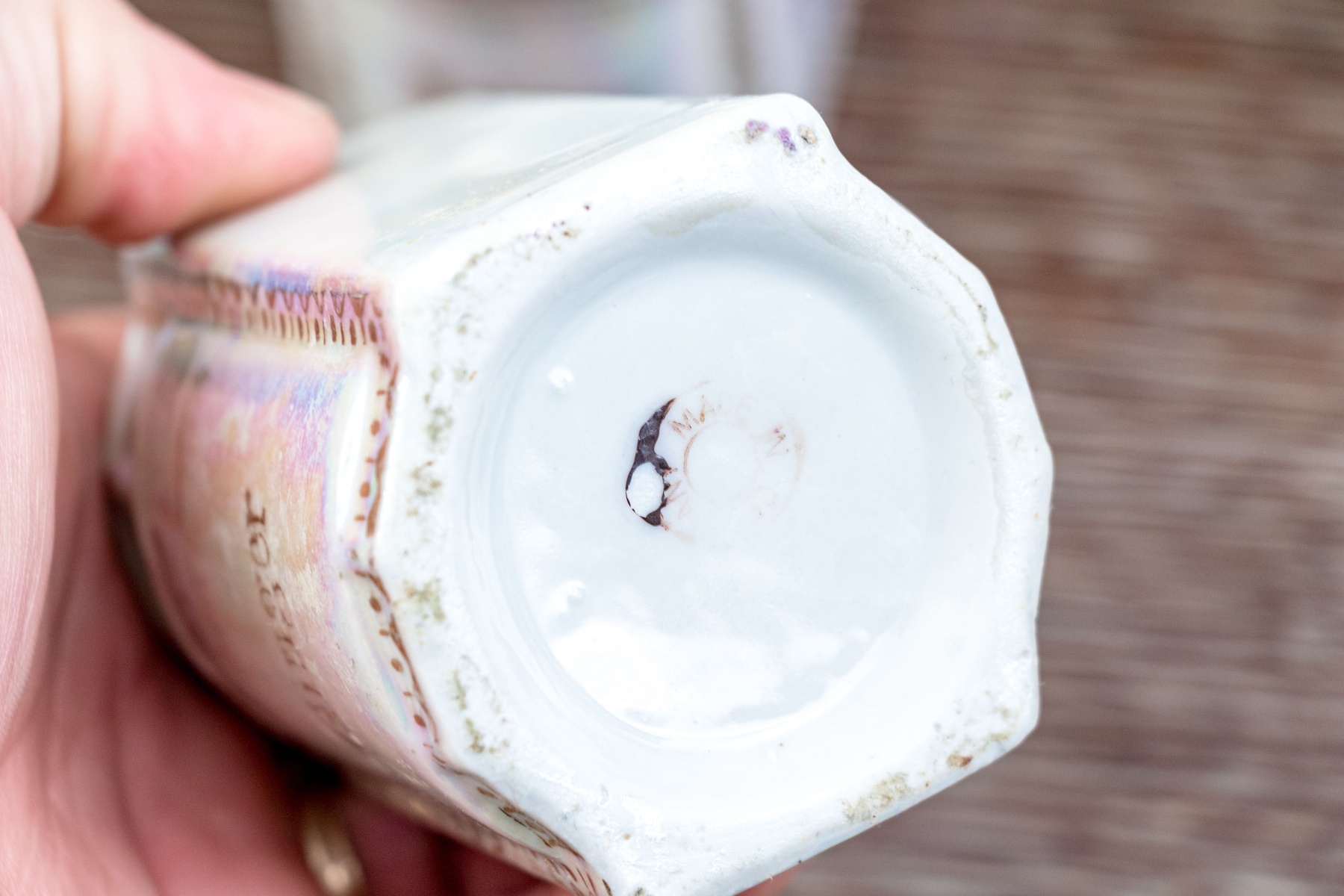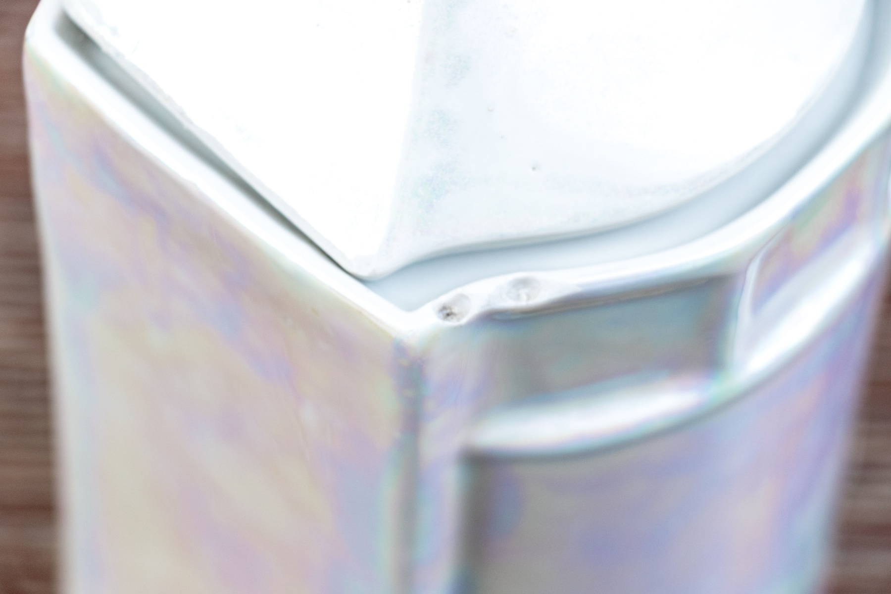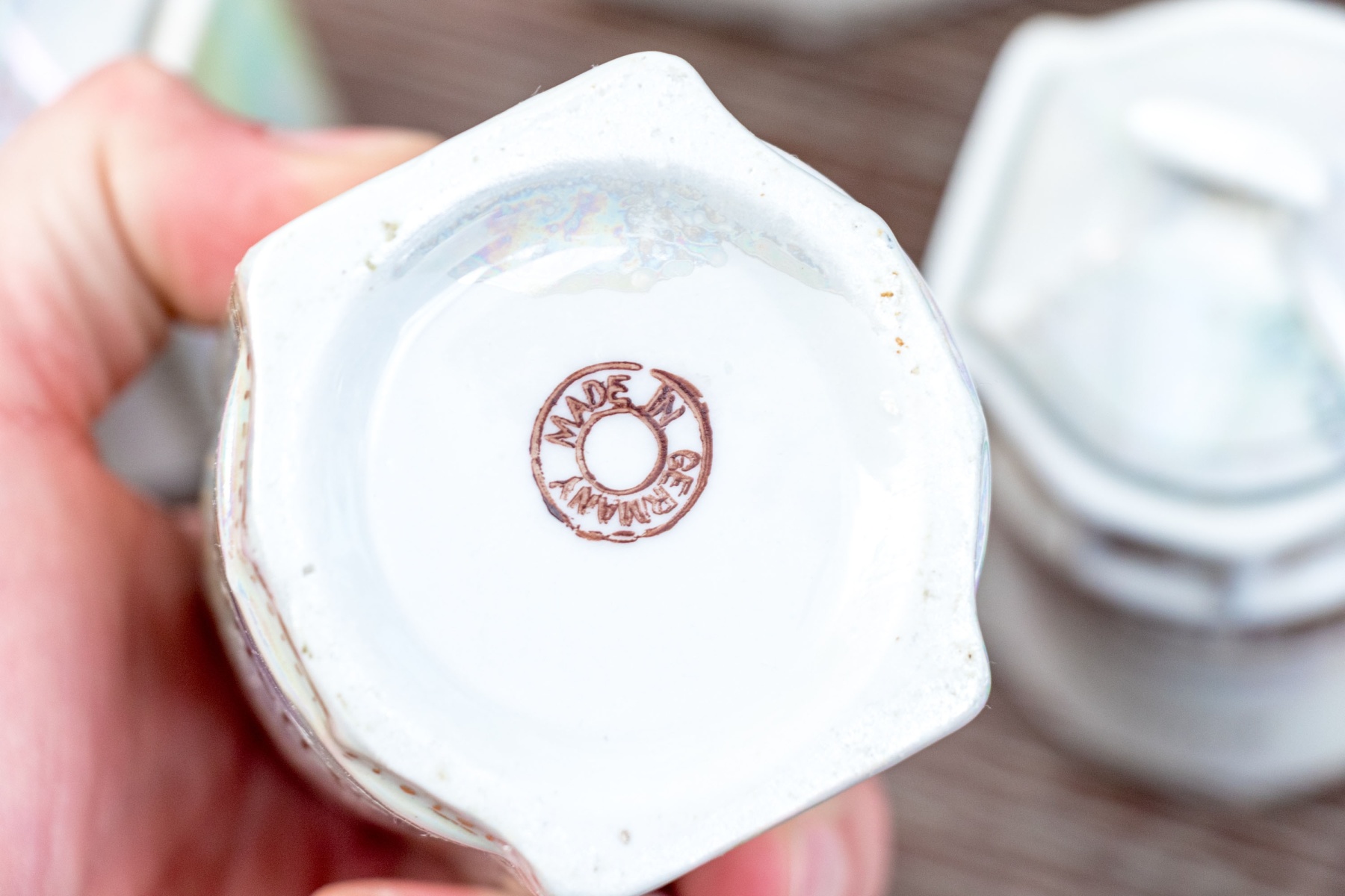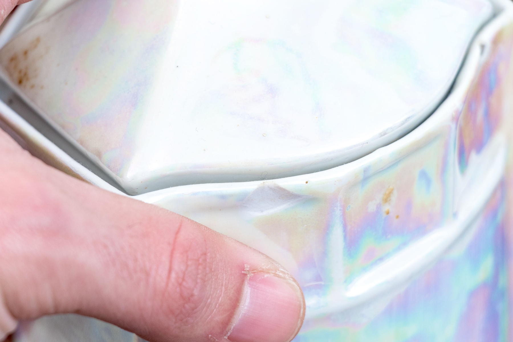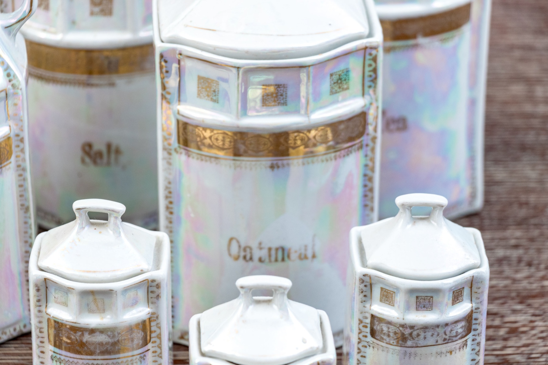 Some chipping to the trim of some canisters near where the lid fits on, some wear to the finish in gilt and the iridescent finish commensurate with age and usage.