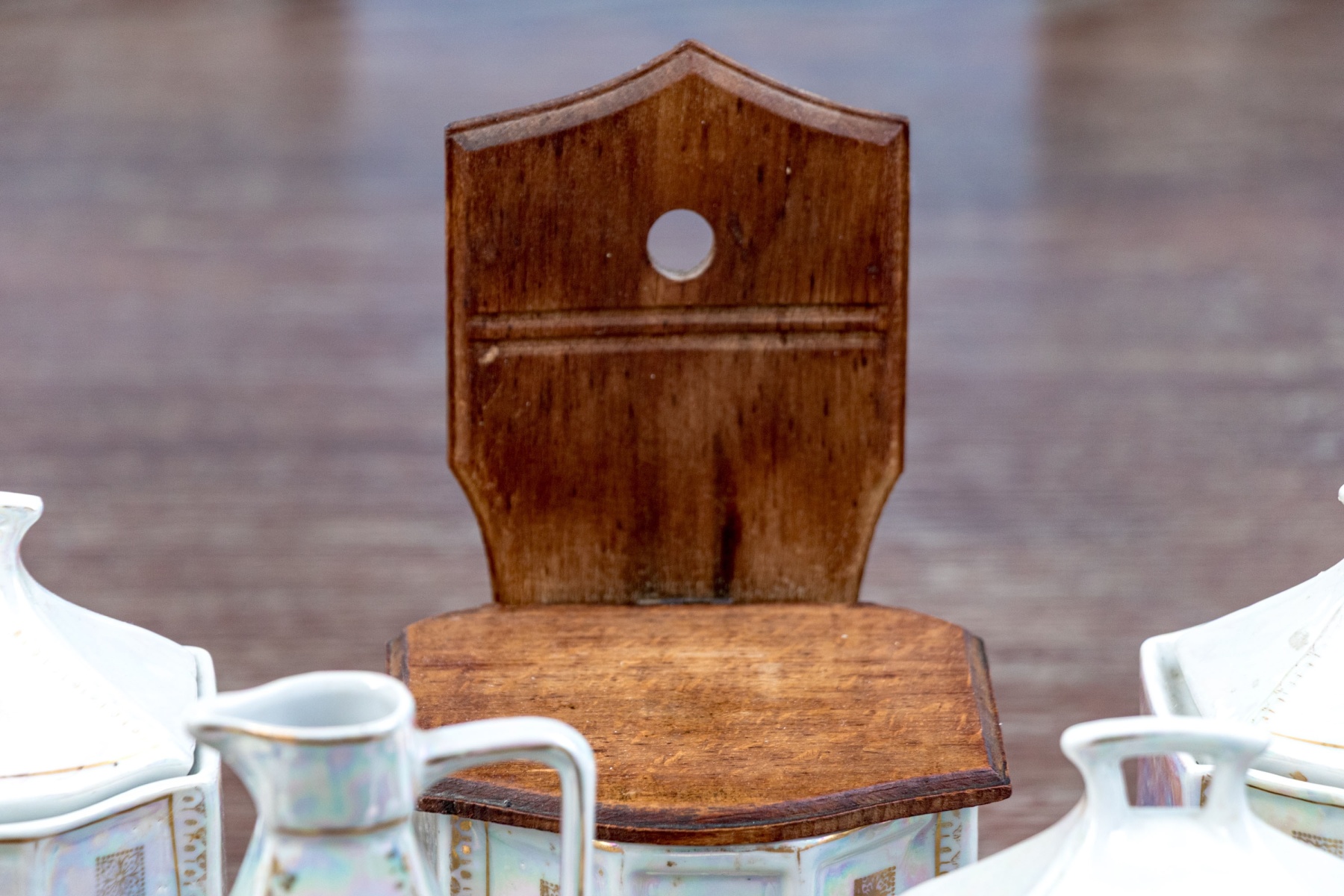 1 Larger vessel with wooden hinged lid and back board for wall mounting: 11” H x 5 “ W
