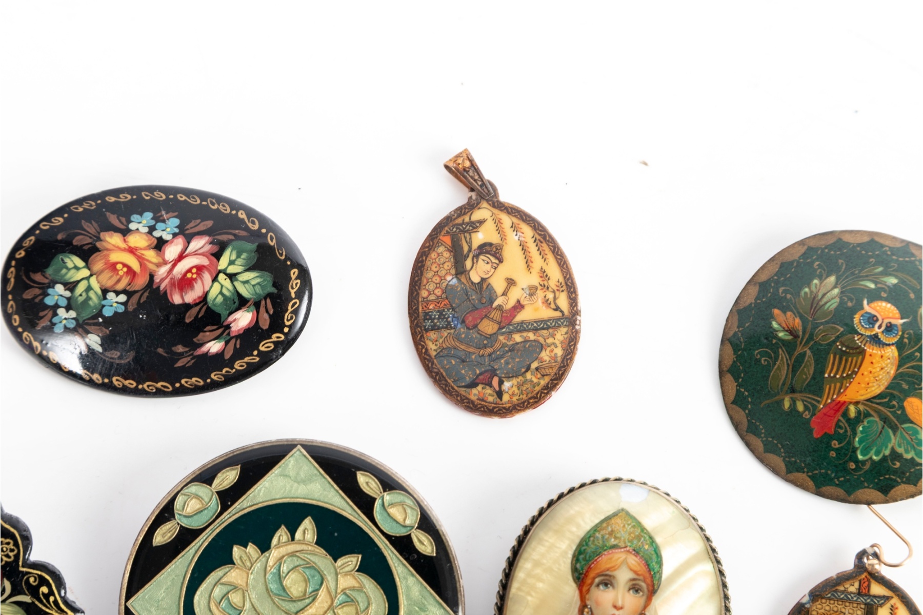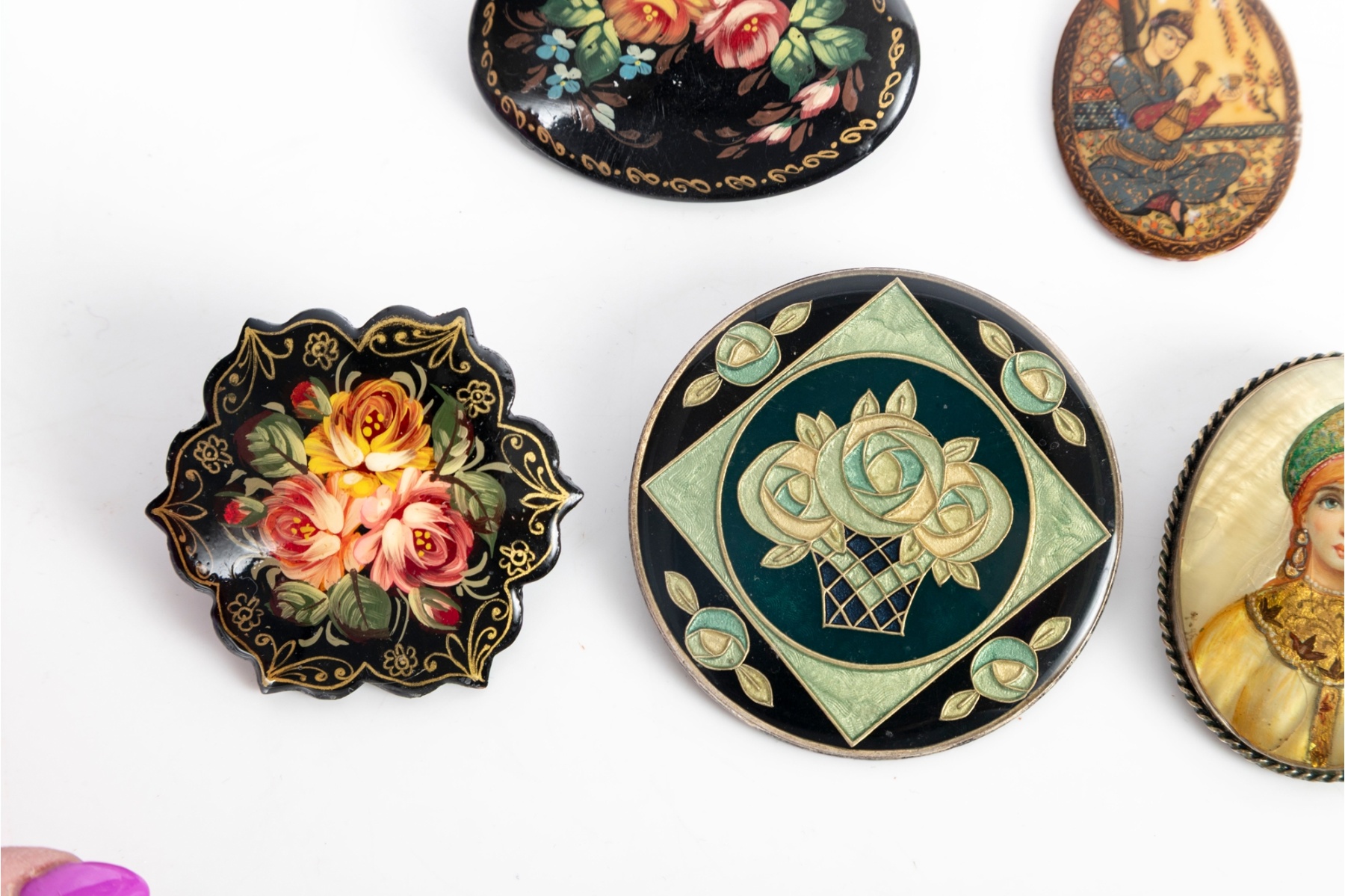 Beautiful assortment of vintage hand-painted brooches and pendants featuring floral motifs, figural scenes, and traditional portraiture. Includes Russian-style lacquer brooches with vibrant floral designs, Middle Eastern or Persian-inspired oval pendants earrings, a large mother-of-pearl portrait brooch, and additional decorative enamel pieces.