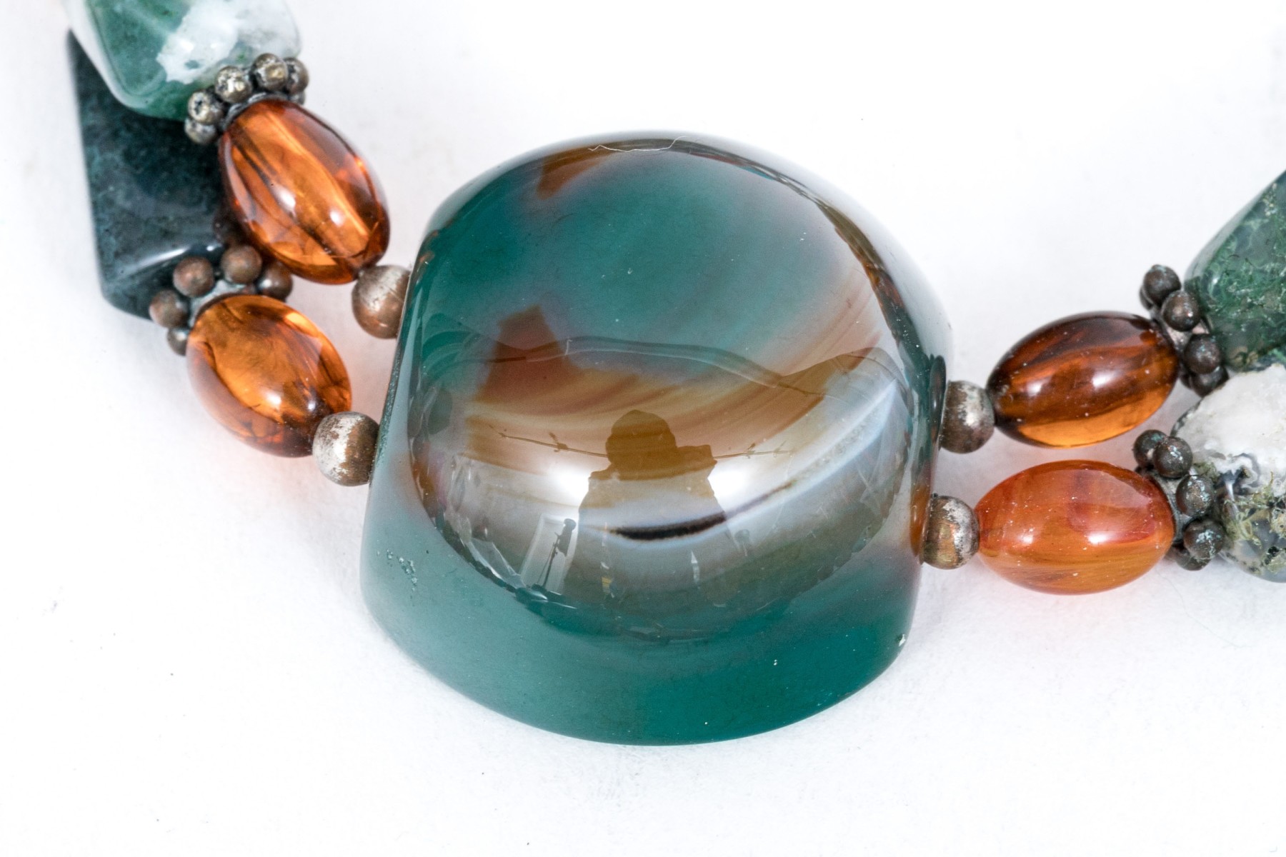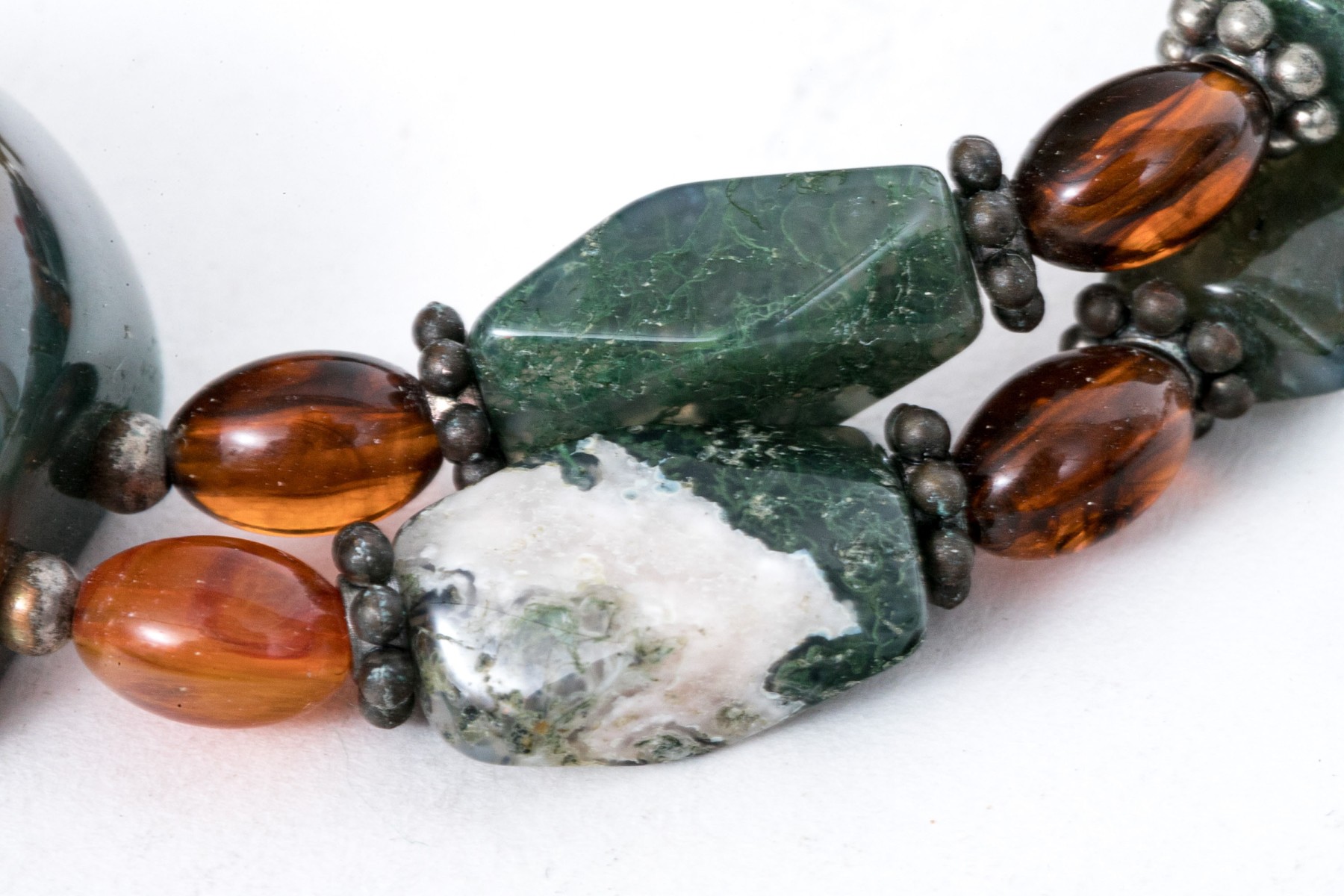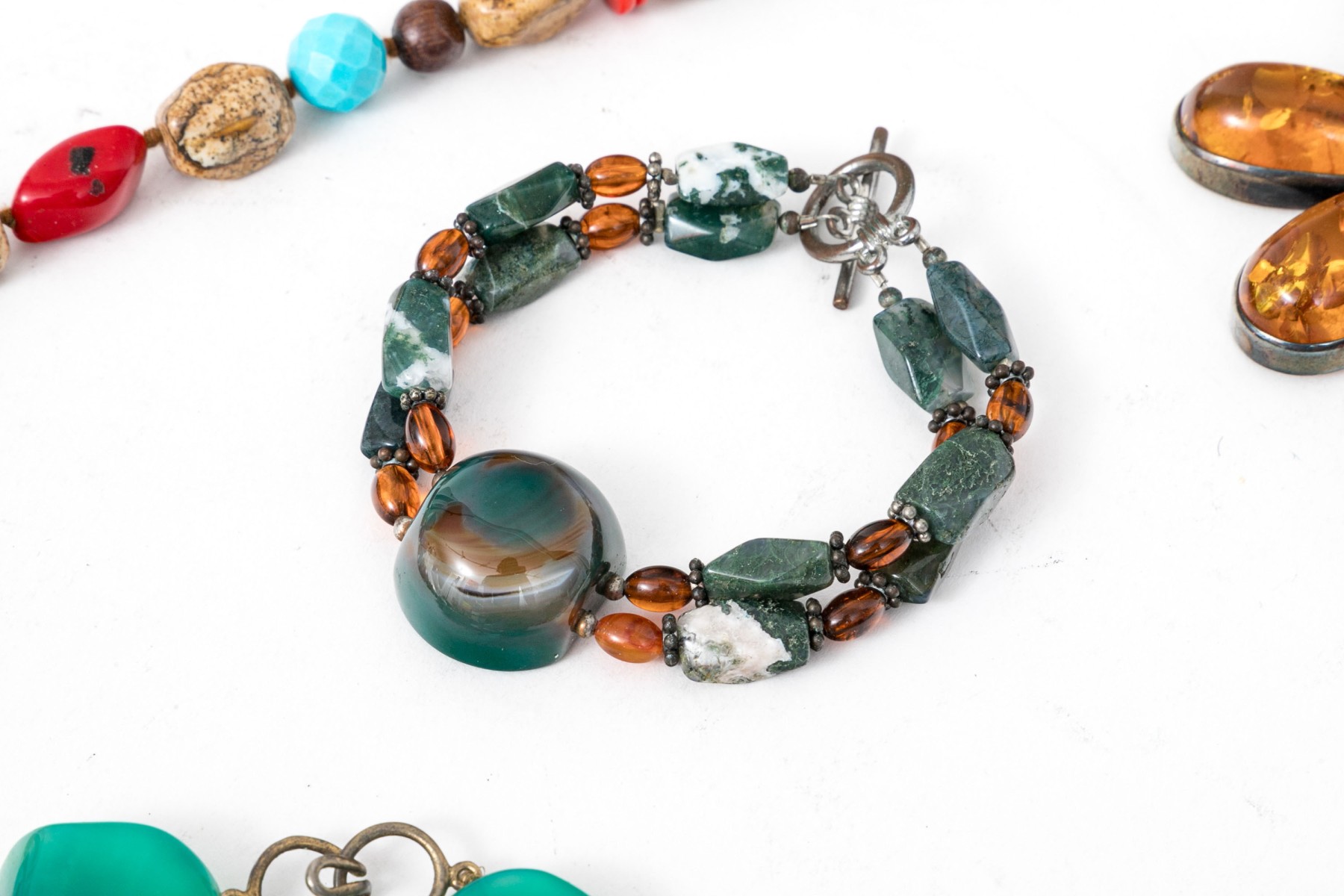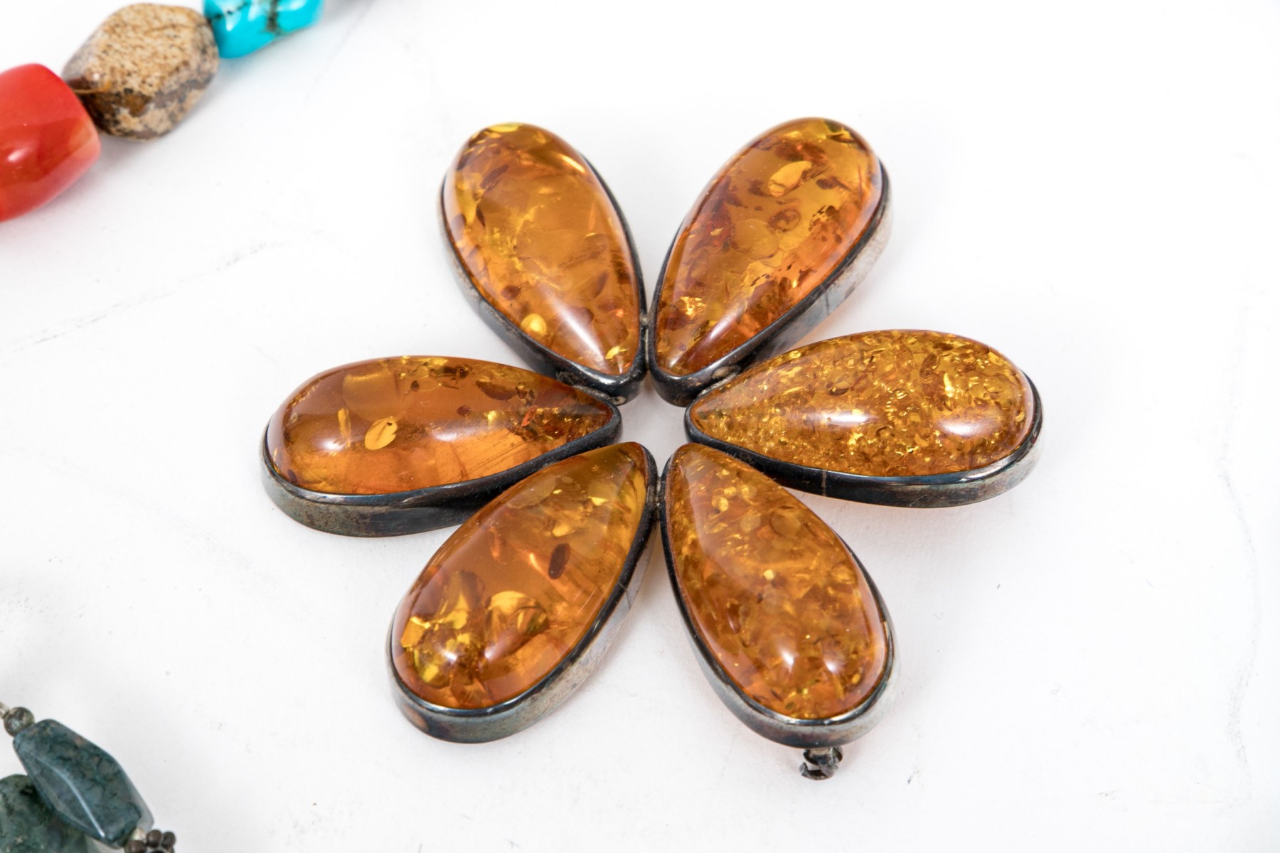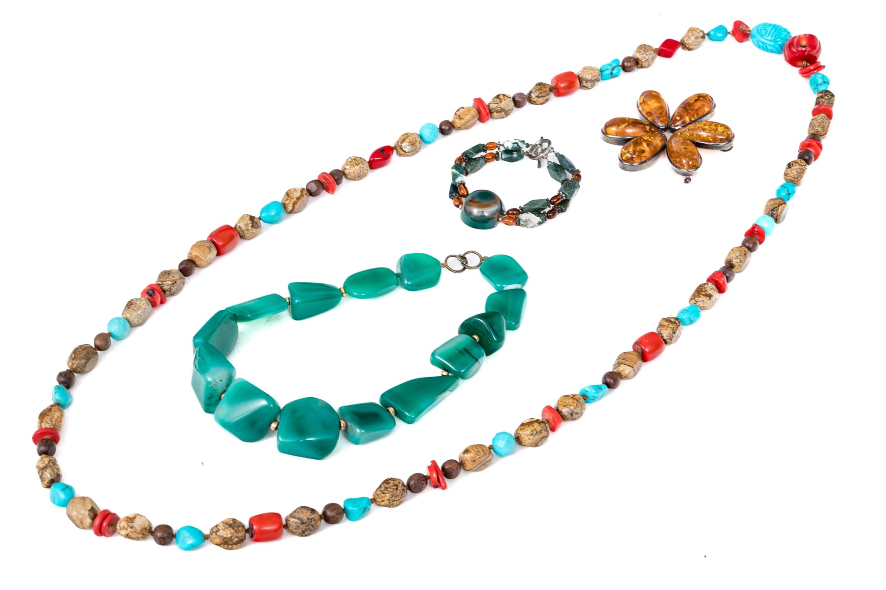 Collection of hard stone beaded necklaces and bracelet with amber brooch. Necklace of large green tumbled chalcedony stones with sterling hook clasp. Wrap necklace of jasper, wood and howlite beads, no clasp. Agate strung bracelet with toggle clasp and floral designed amber and sterling brooch.