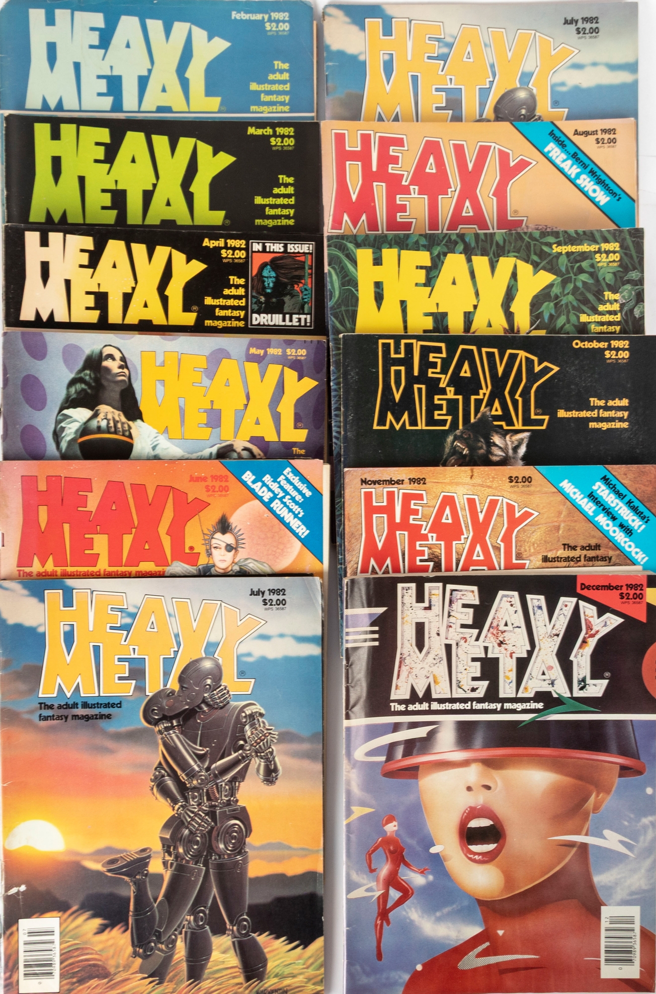 Cover features include classic Heavy Metal themes—robots, alien landscapes, fantasy heroines, and psychedelic surrealism. Several issues also highlight notable artists such as H.R. Giger, Druillet, Moebius, and others (as indicated on various covers).