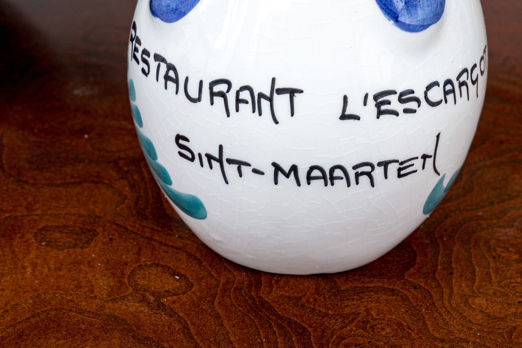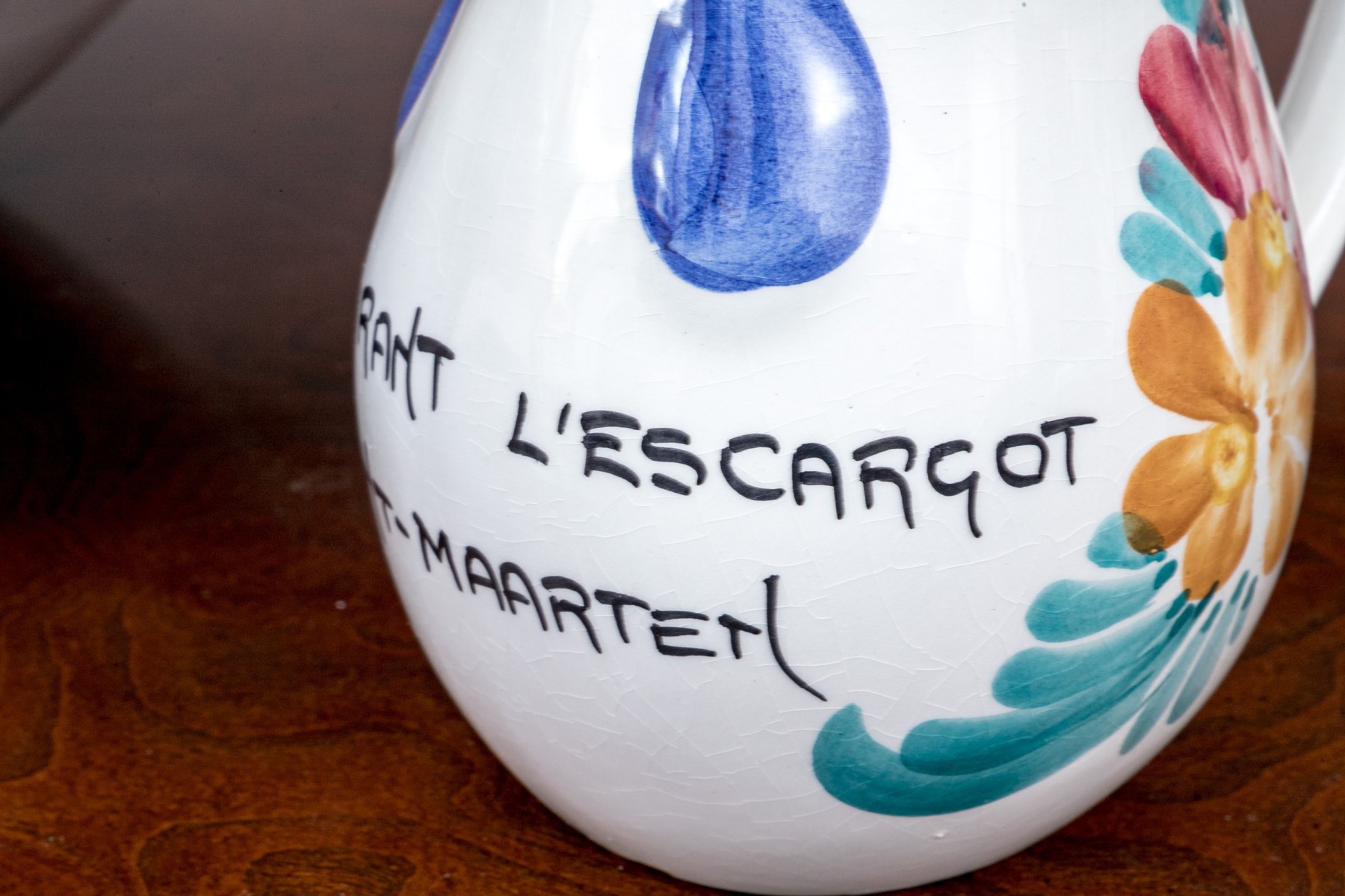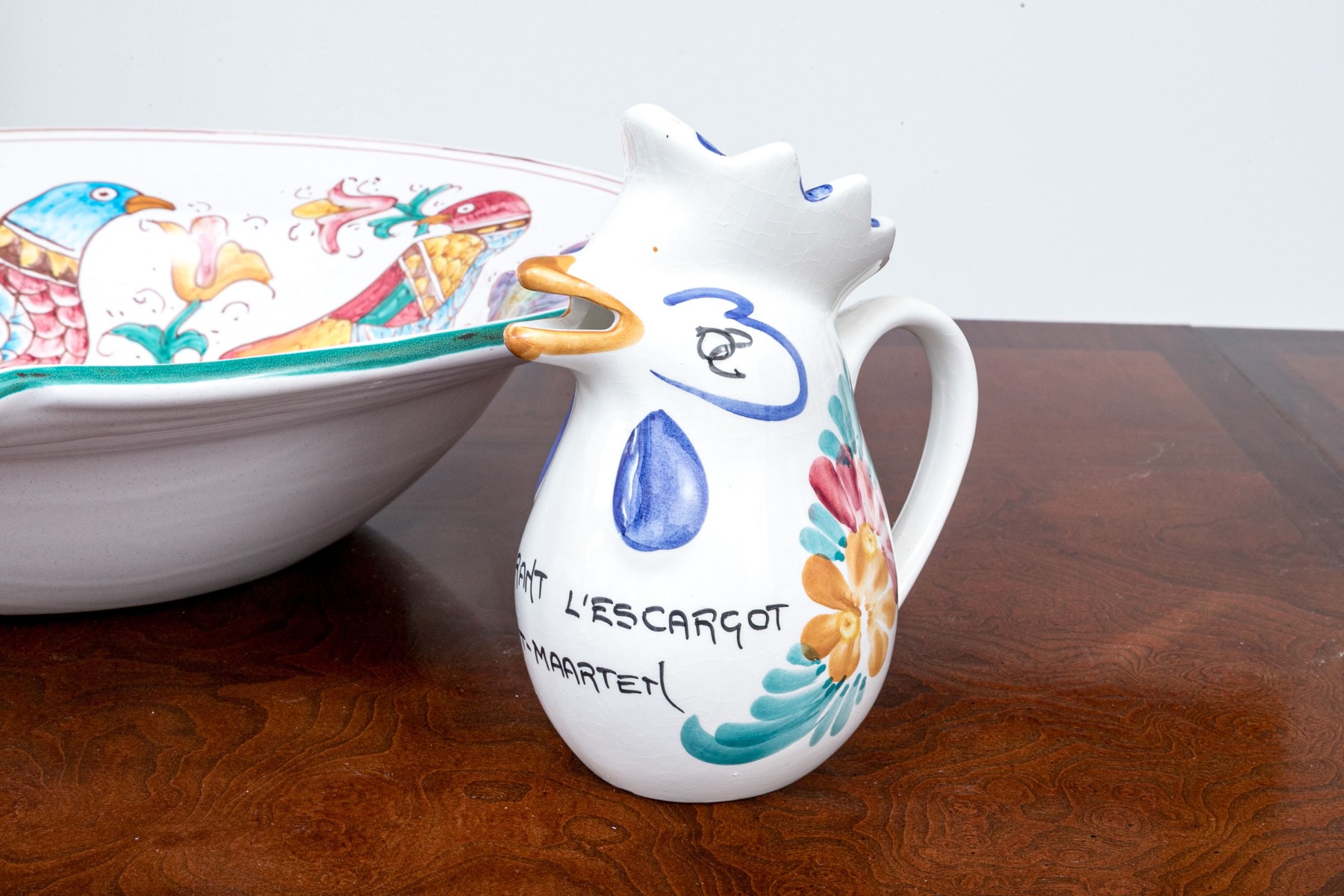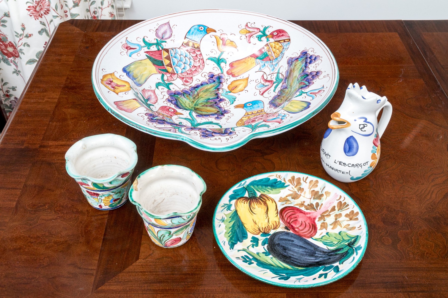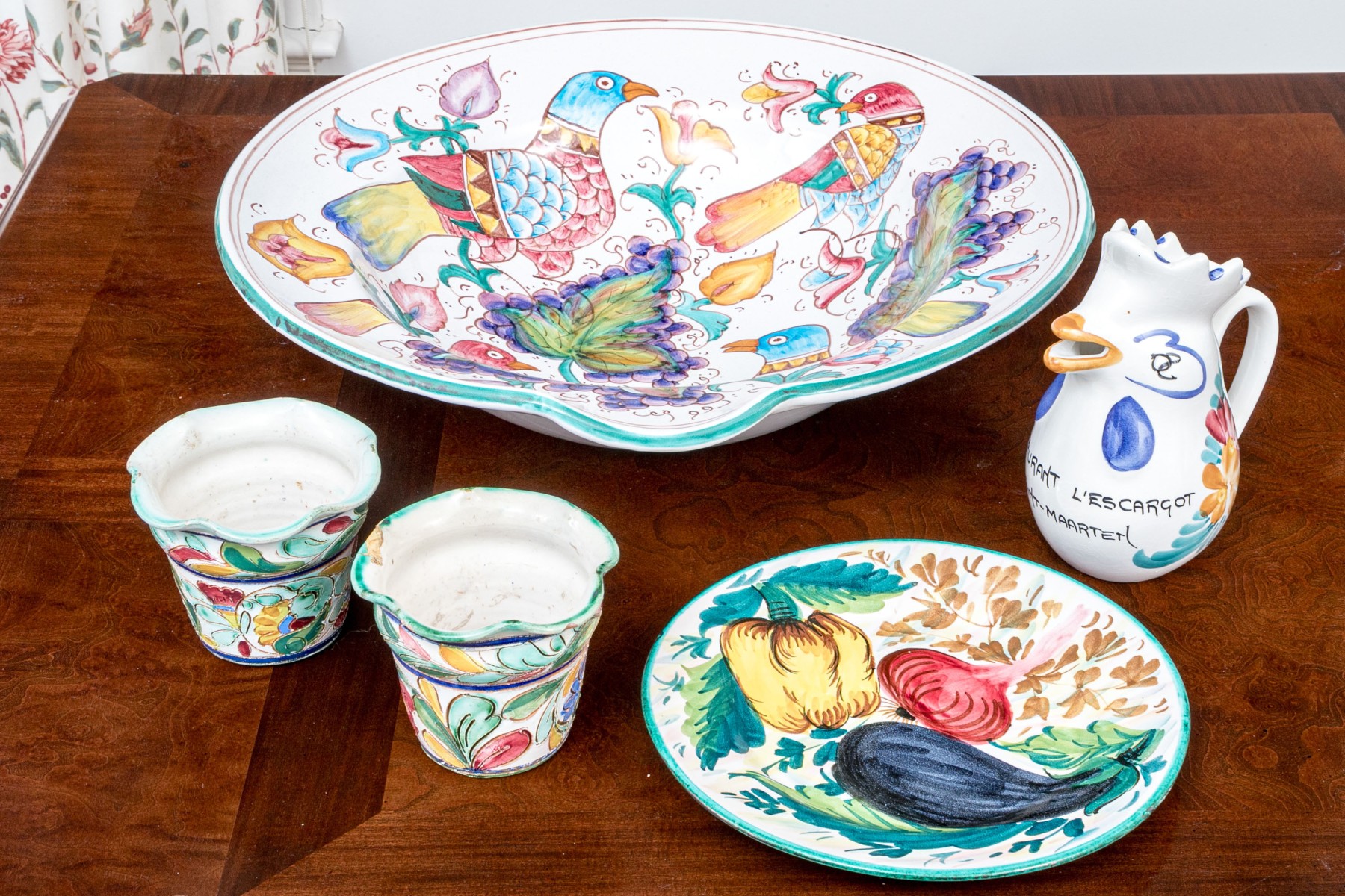 Comprised of hand painted duck form ewer, marked “Restaurant L’Ecargot / Sint-Maarten”, together with a pair of painted and carved jardinieres, with a dish and serving bowl.