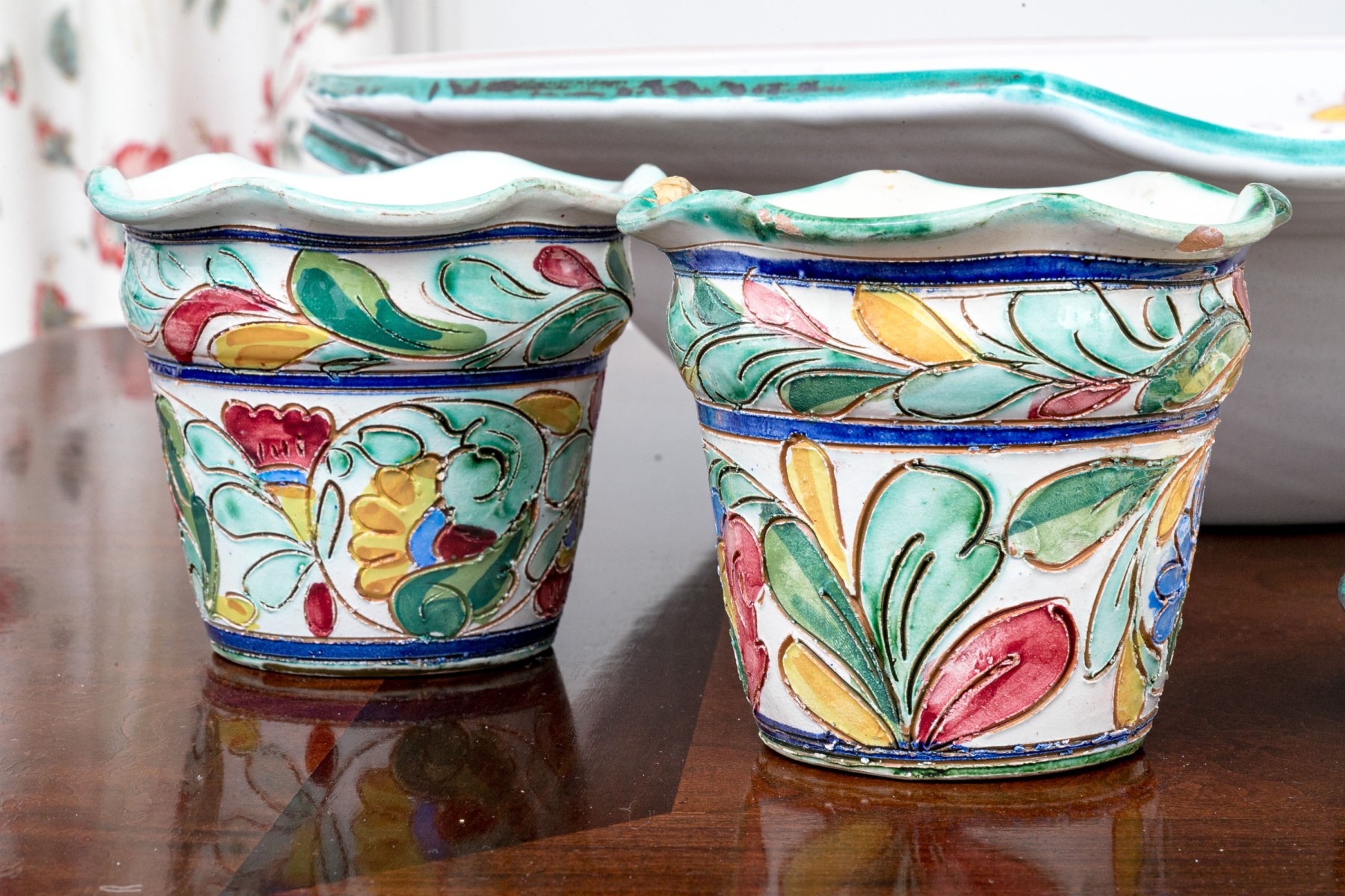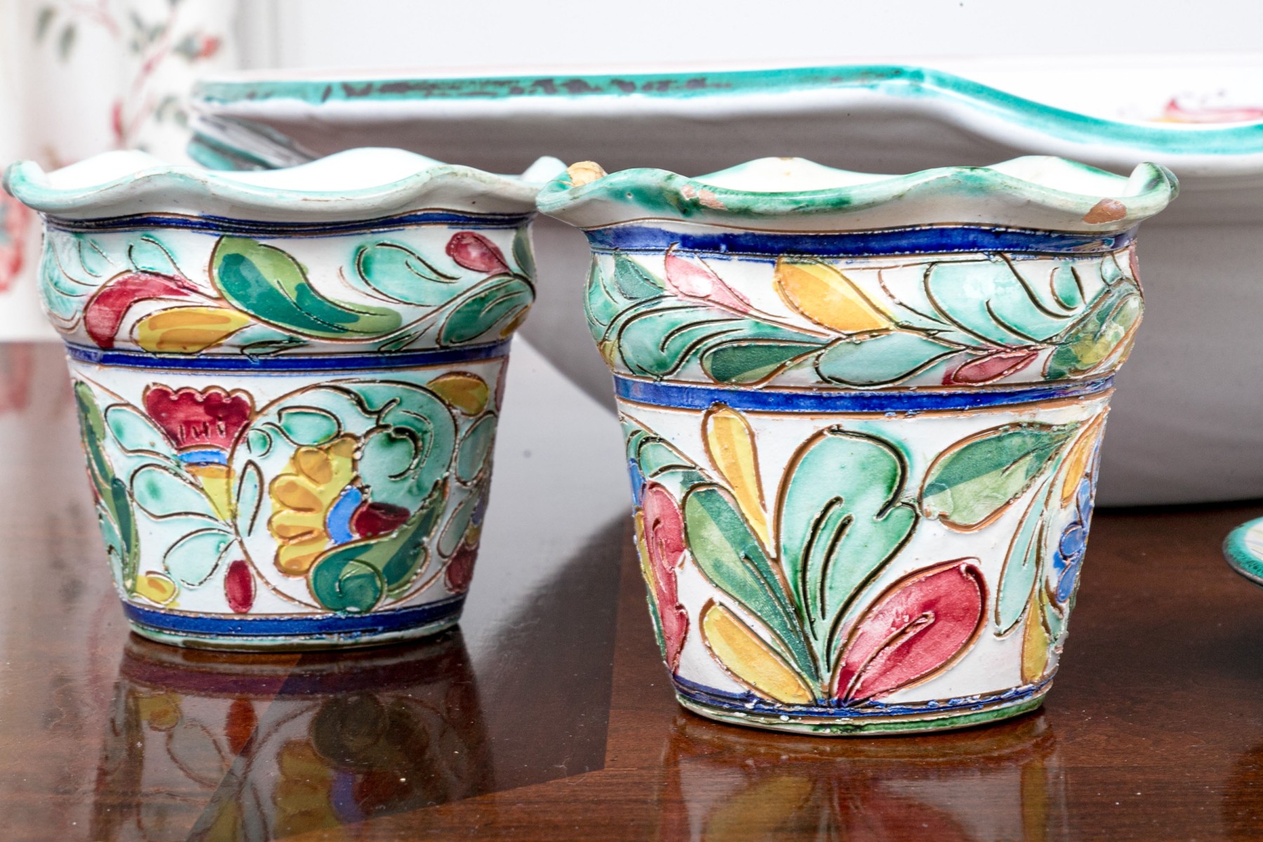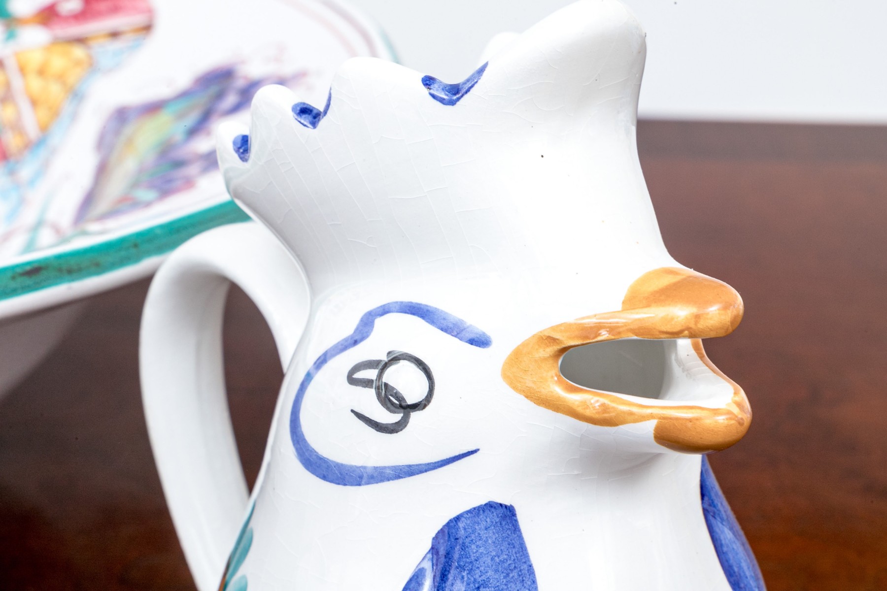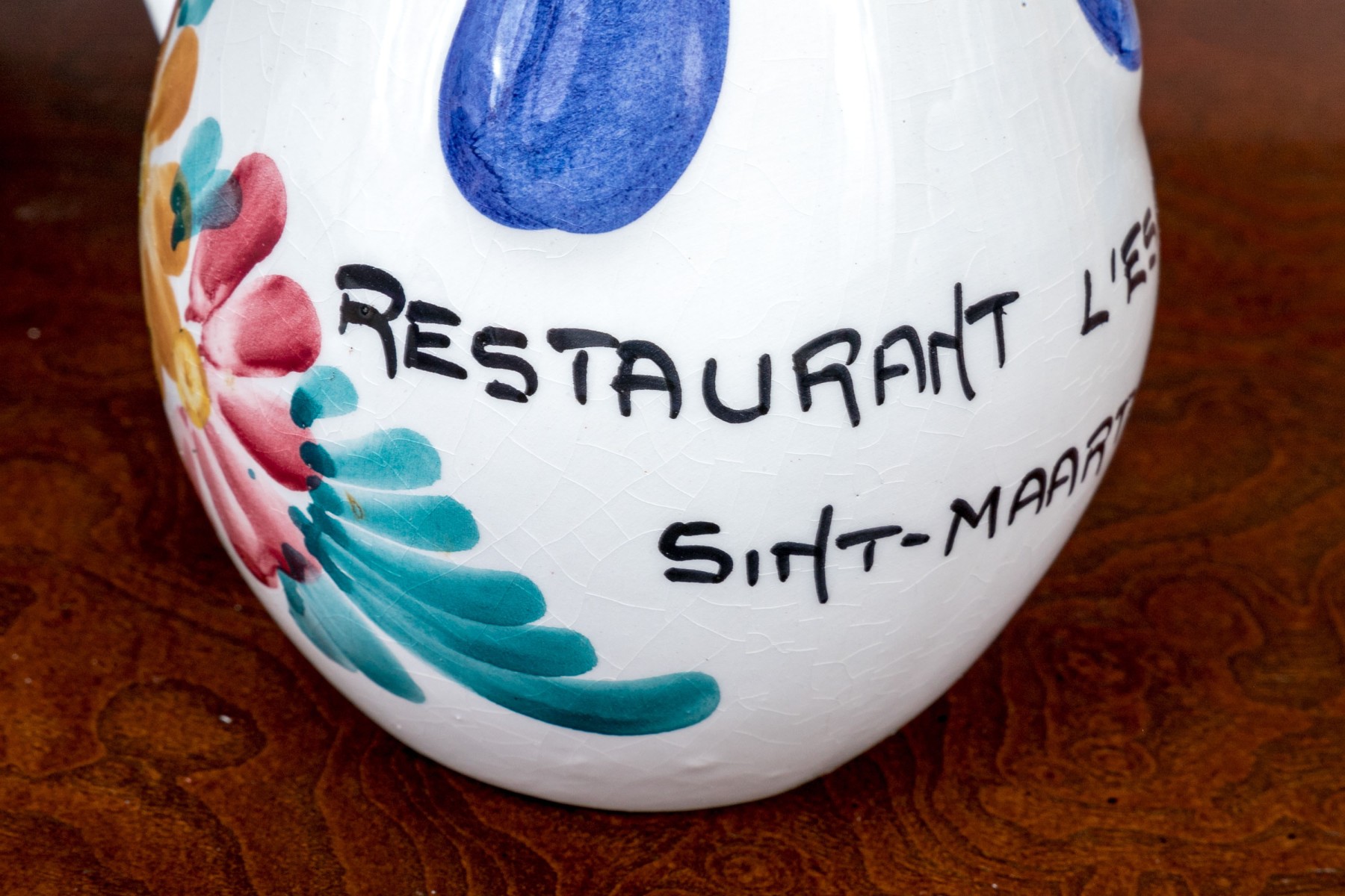Comprised of hand painted duck form ewer, marked “Restaurant L’Ecargot / Sint-Maarten”, together with a pair of painted and carved jardinieres, with a dish and serving bowl.