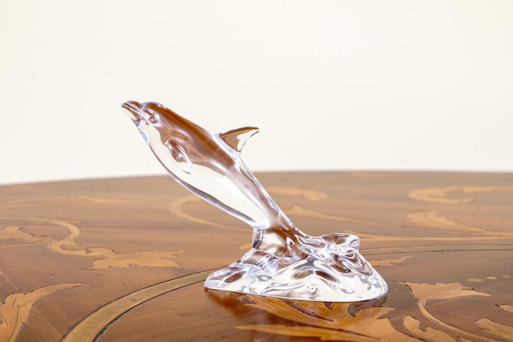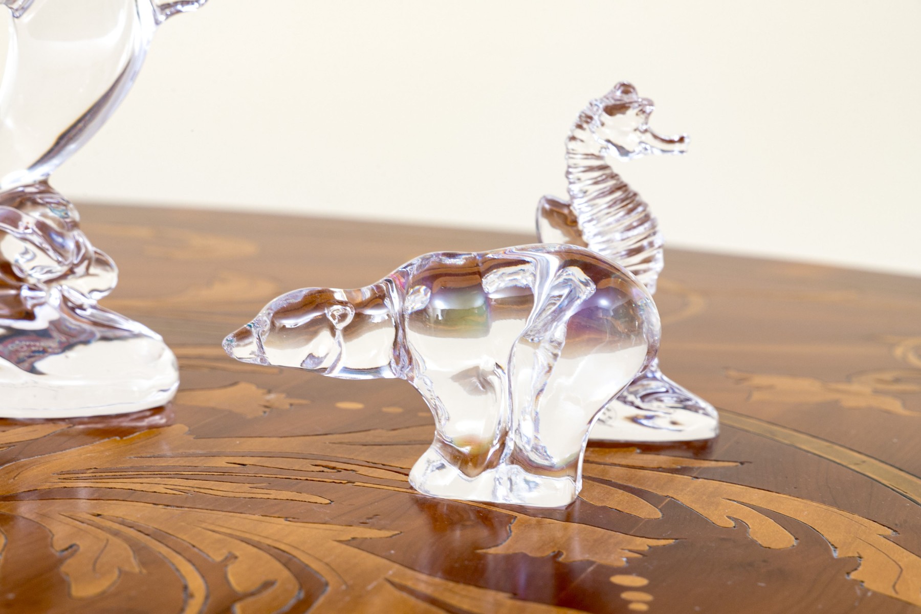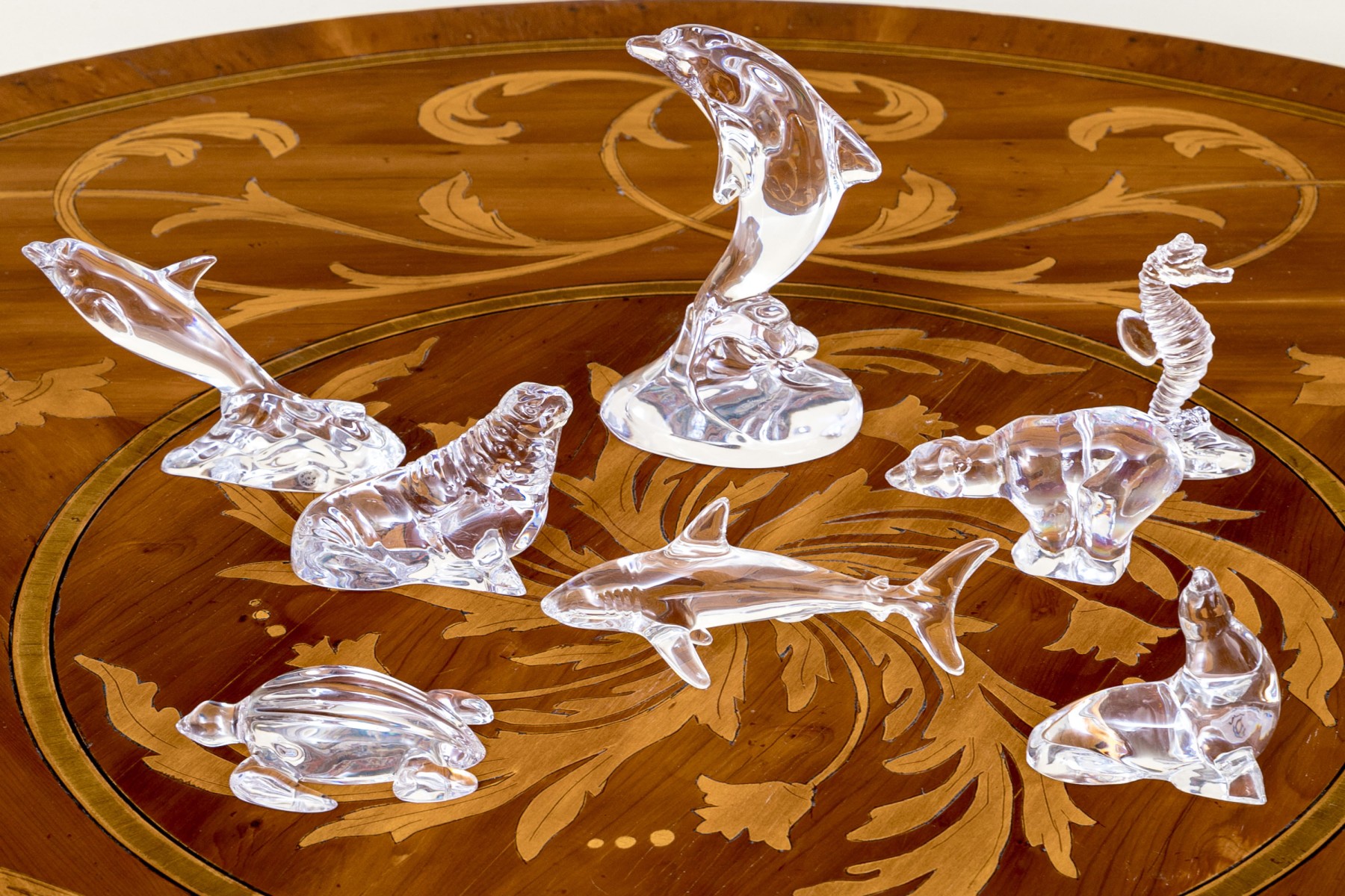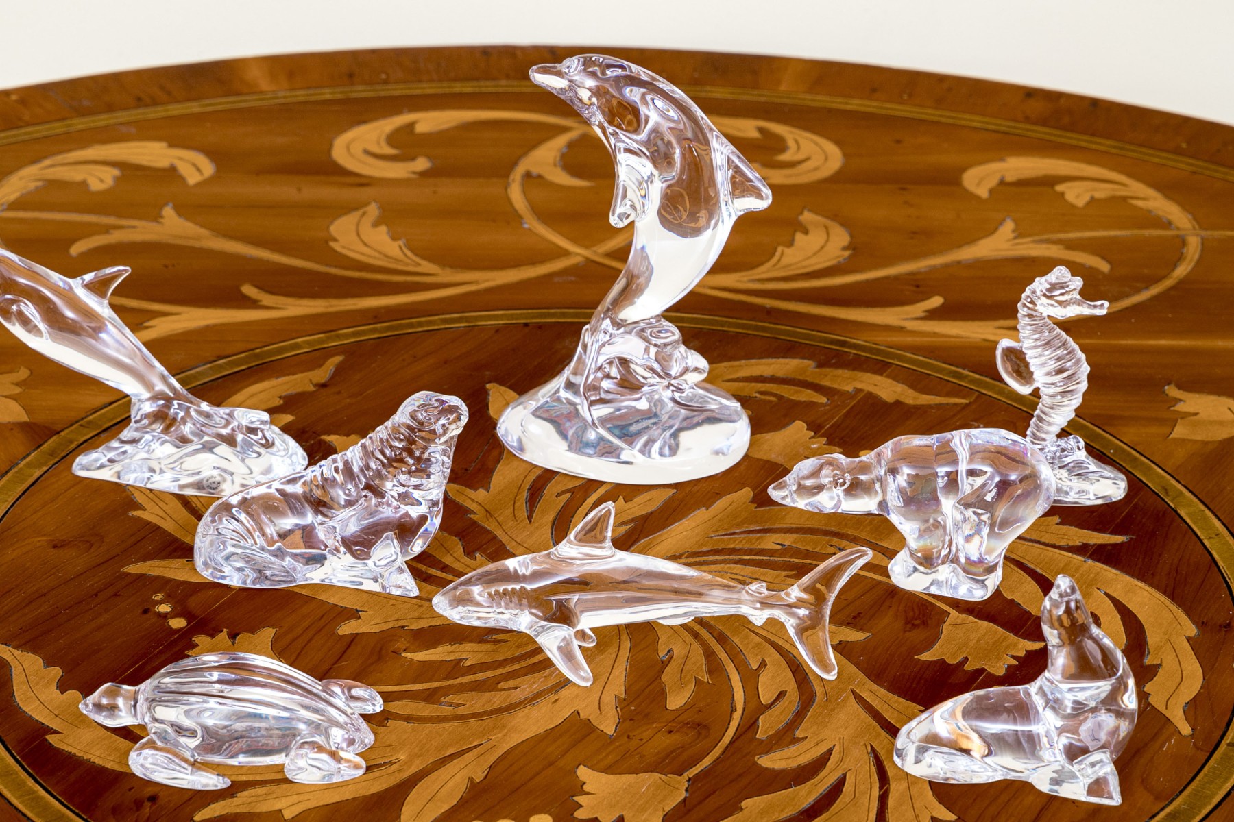 A wonderful assortment of eight crystal figurines depicting various marine animals including dolphins, seahorses, seals, sharks, and turtles, accompanied by a polar bear. Various pieces marked made in france, with one marked Sevres.
