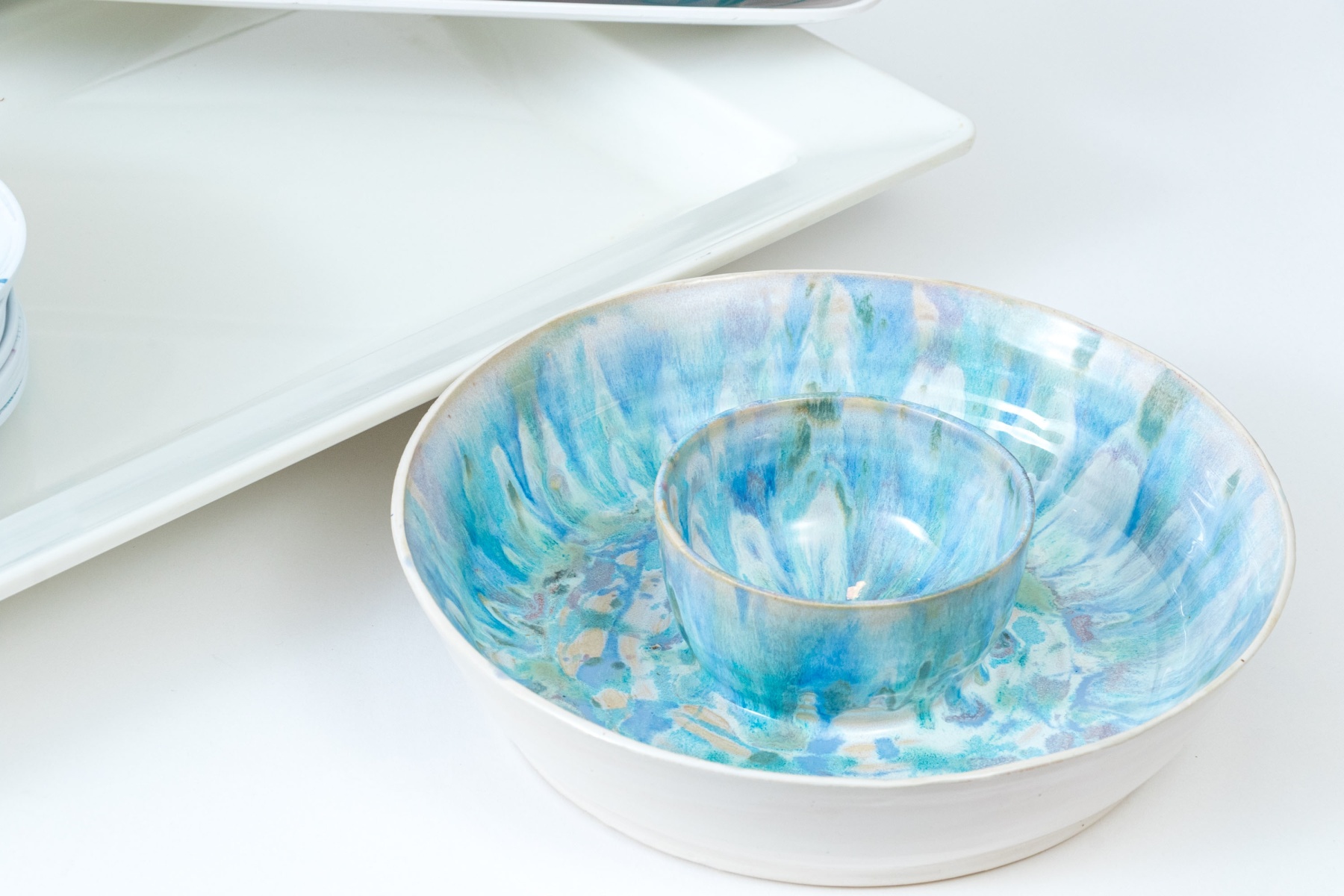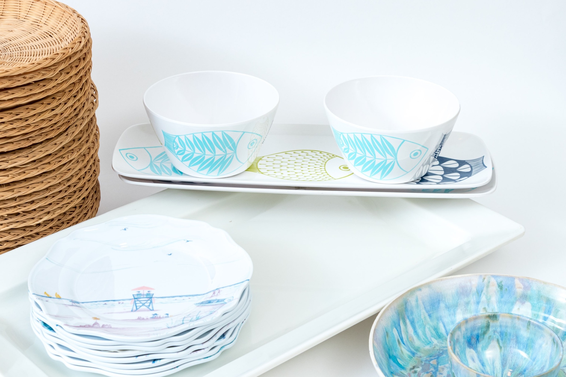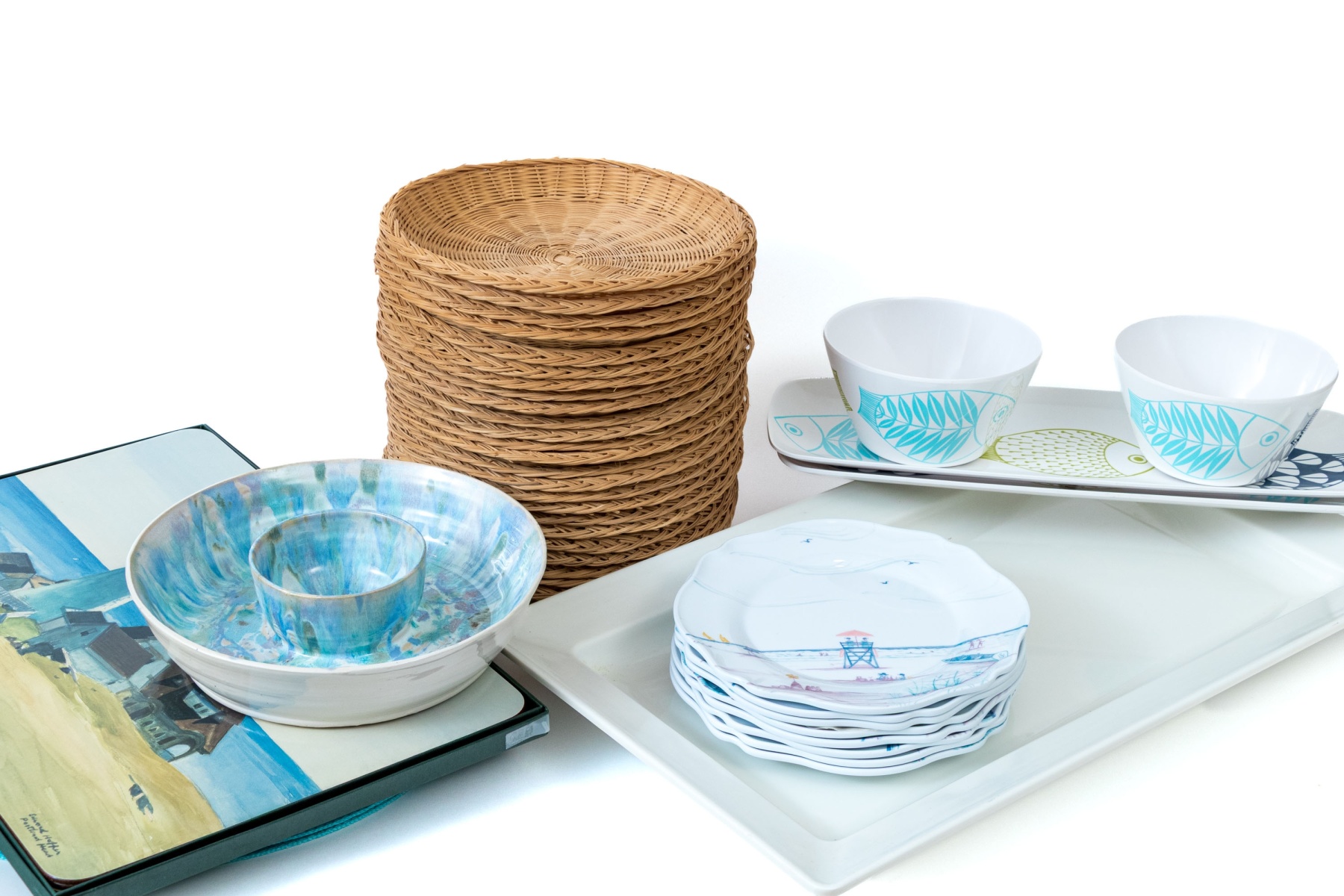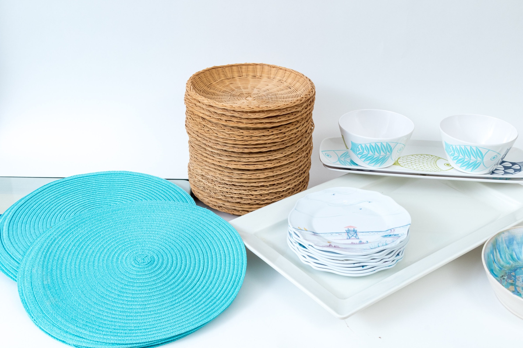A wonderful collection of serving ware including assorted trays, melamine bowls and plates, twenty-four woven chargers, and a ceramic chip and dip server.